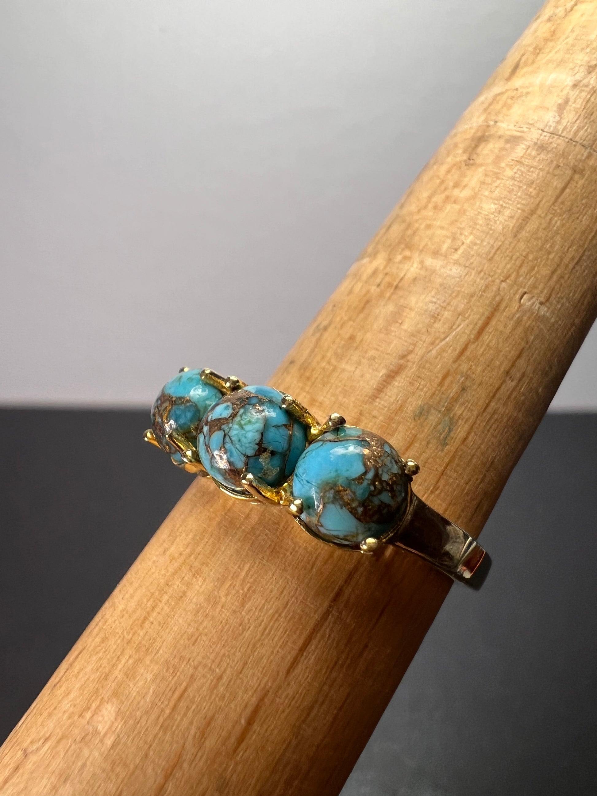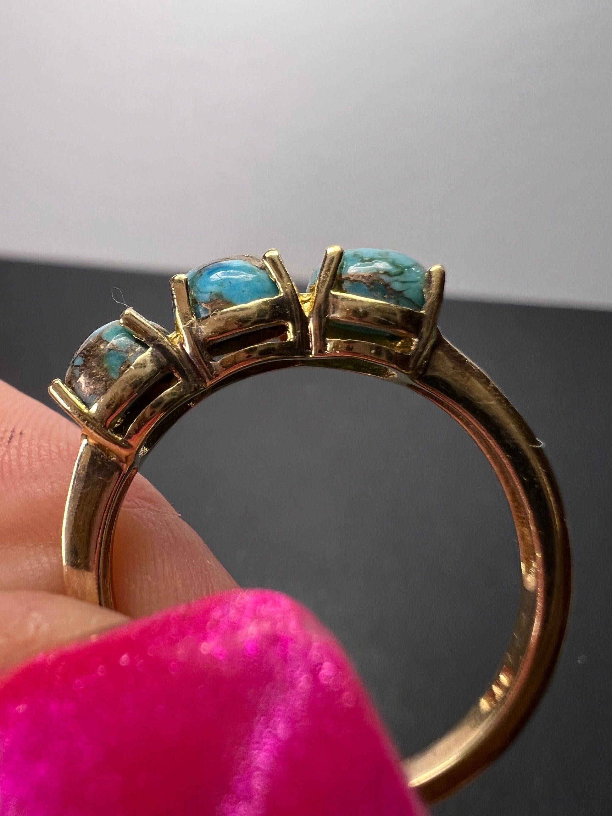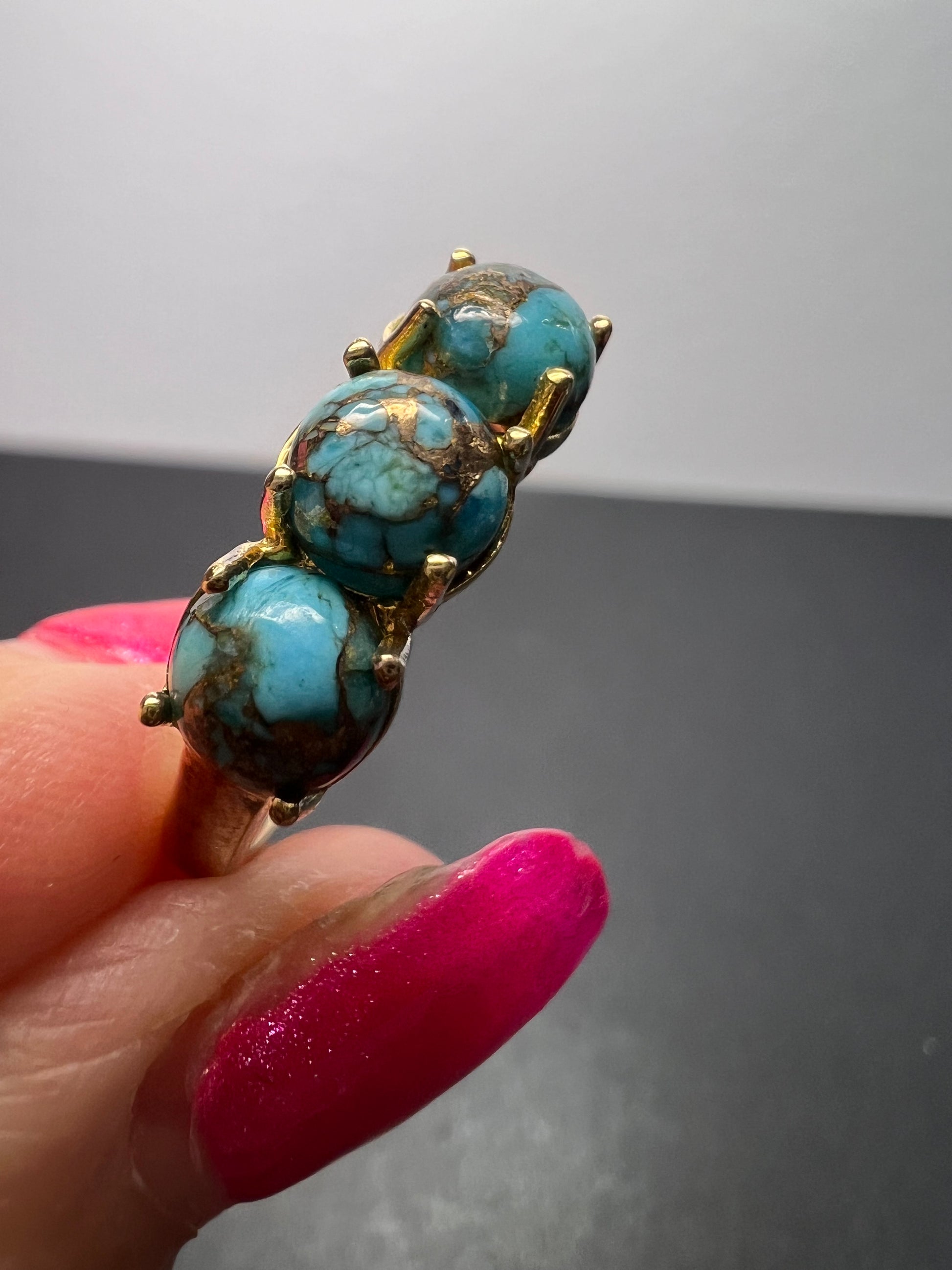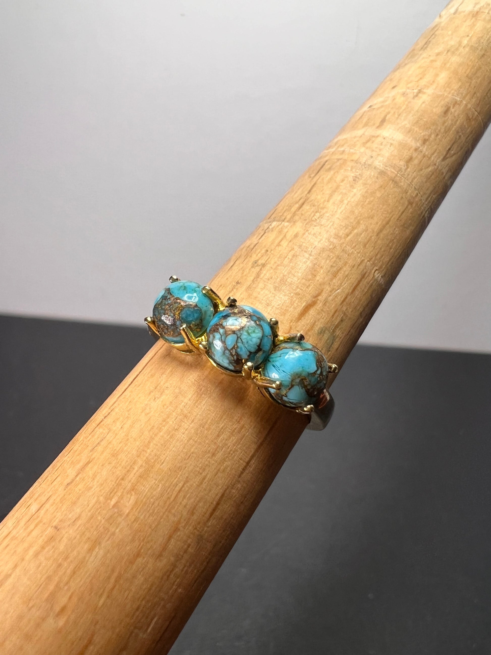 Three turquoise stones prong set in a gold over sterling silver ring. Size 9. Turquoise has been stabilized , treated and made from composite