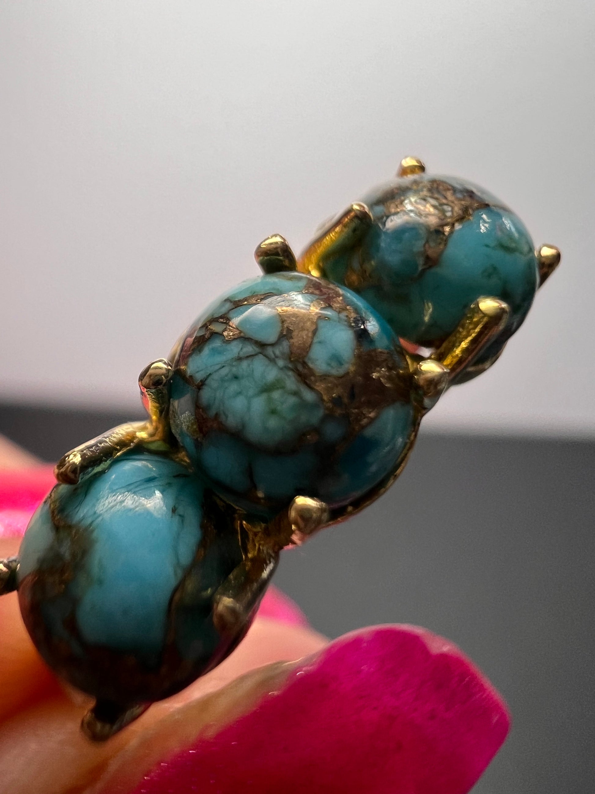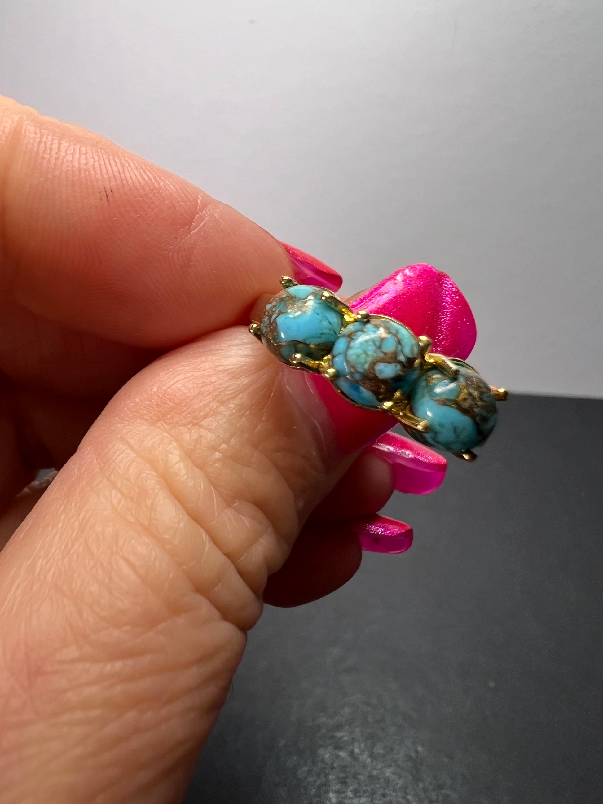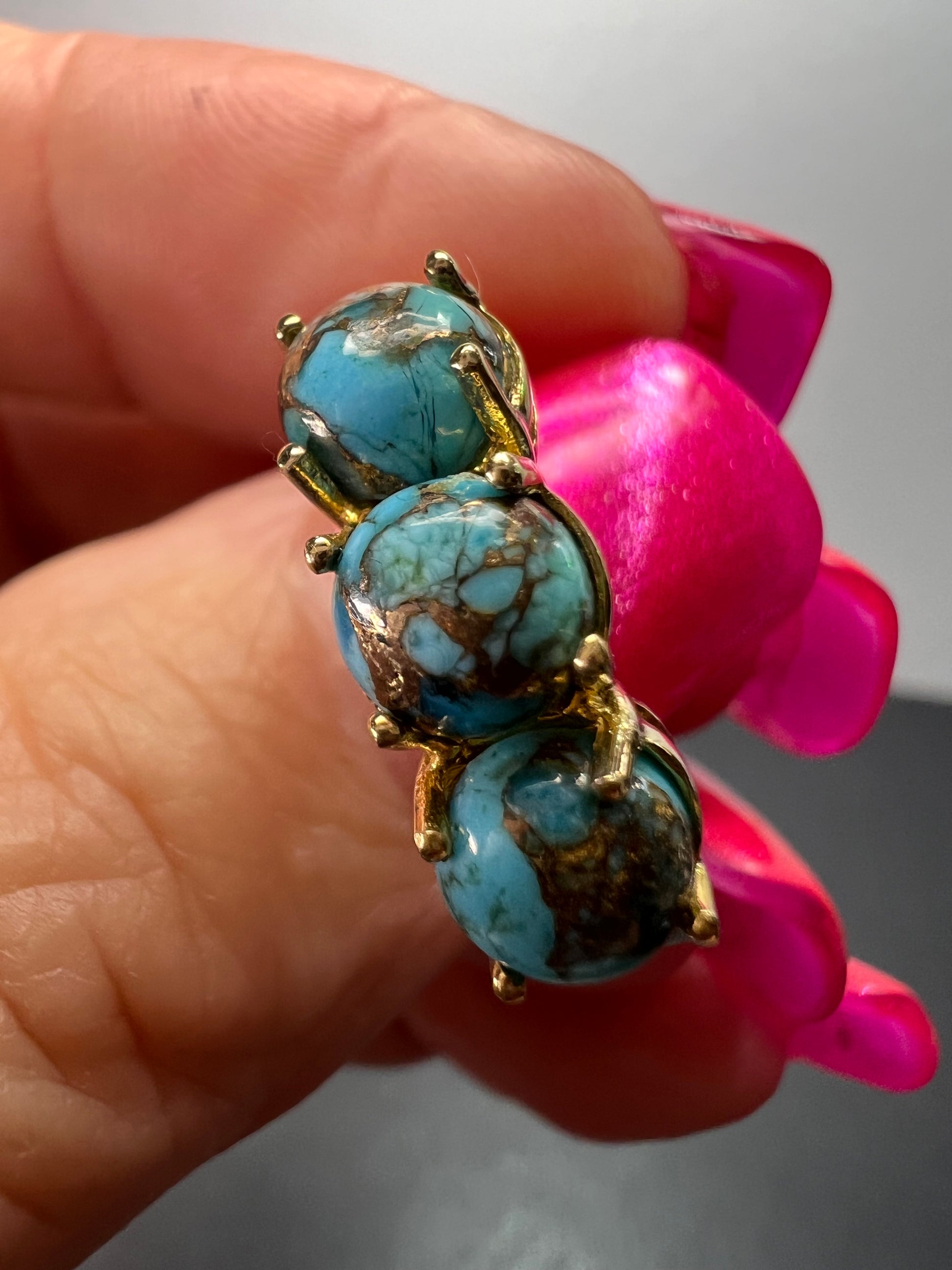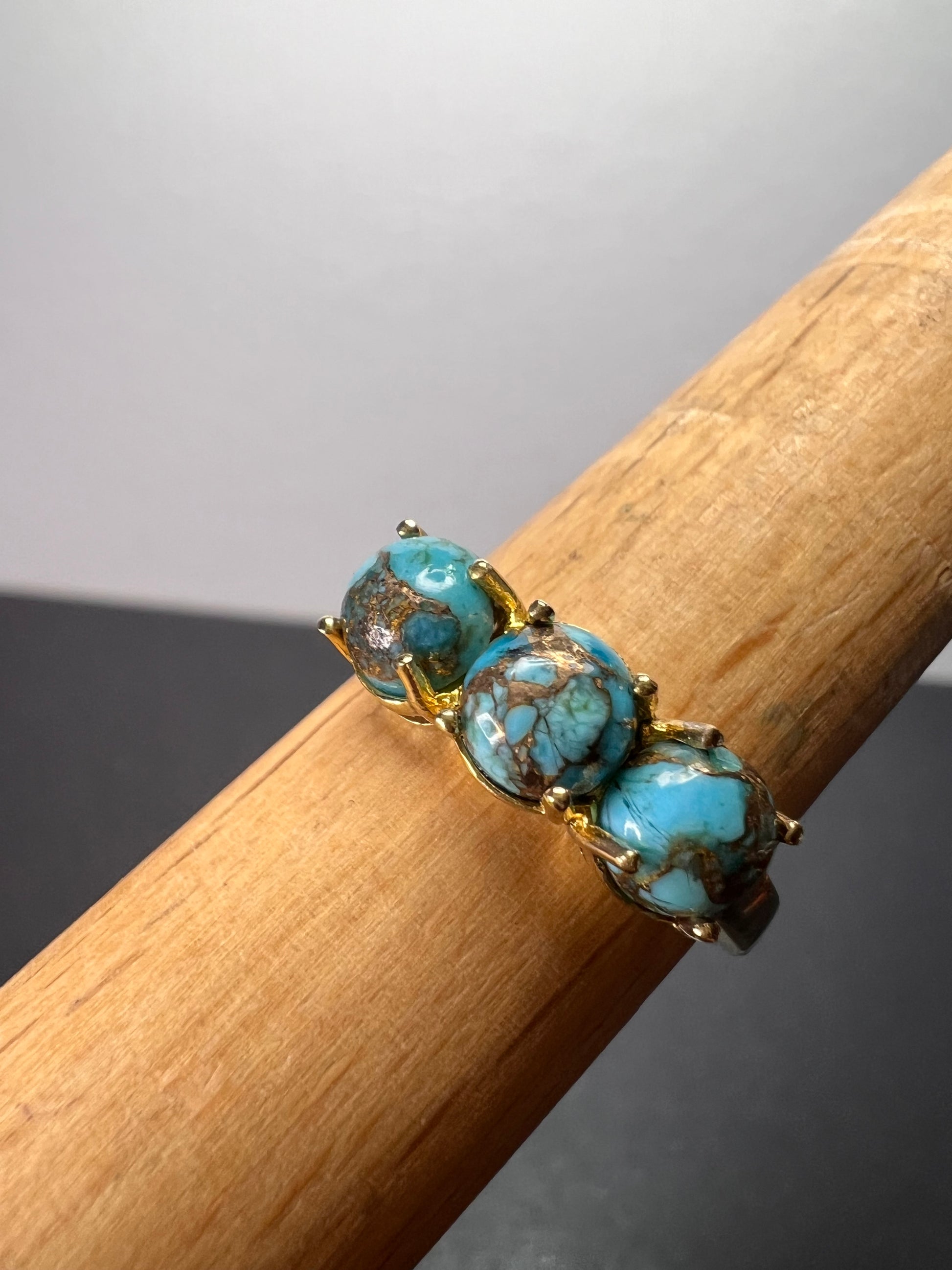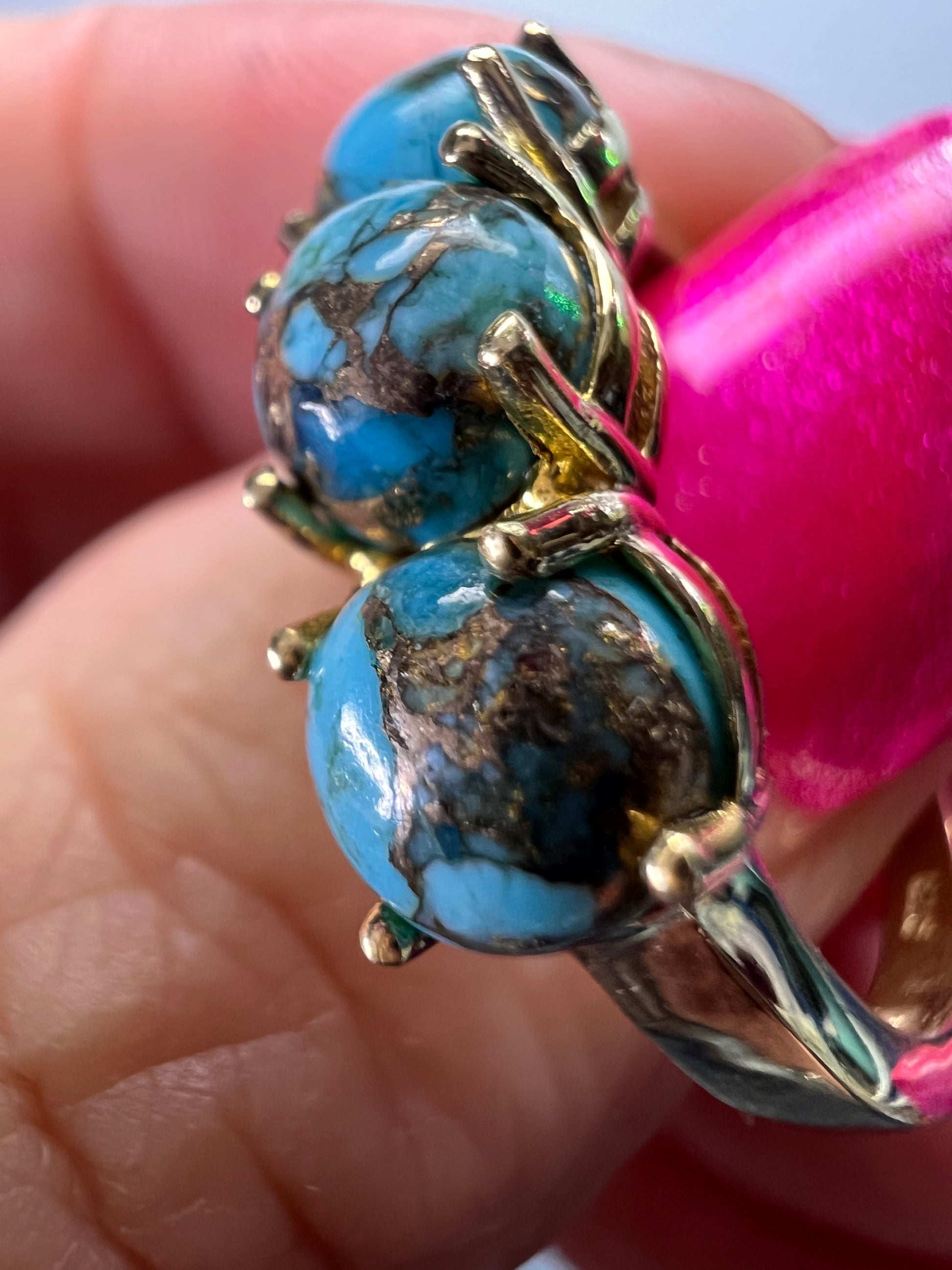 Three turquoise stones prong set in a gold over sterling silver ring. Size 9. Turquoise has been stabilized , treated and made from composite