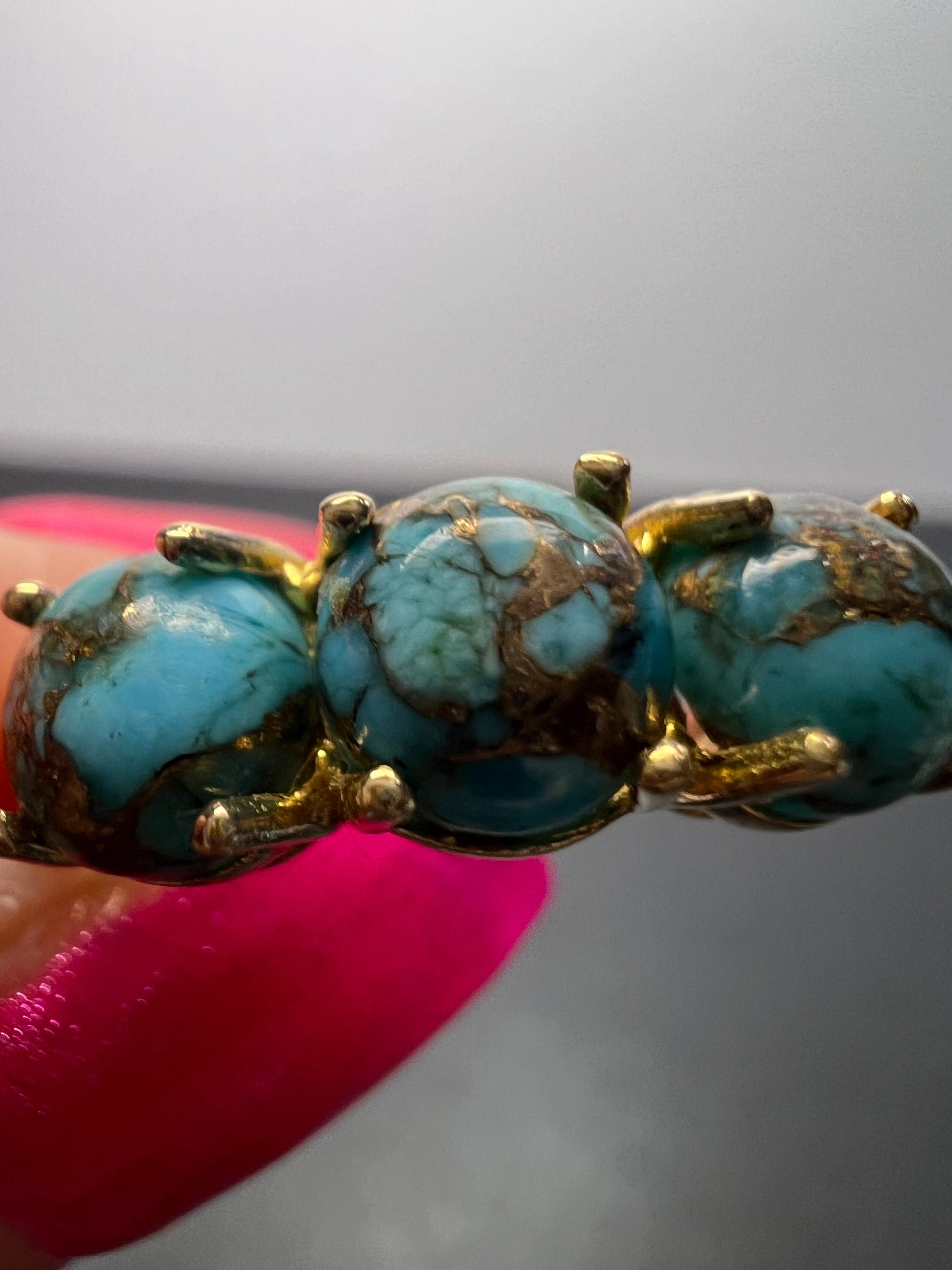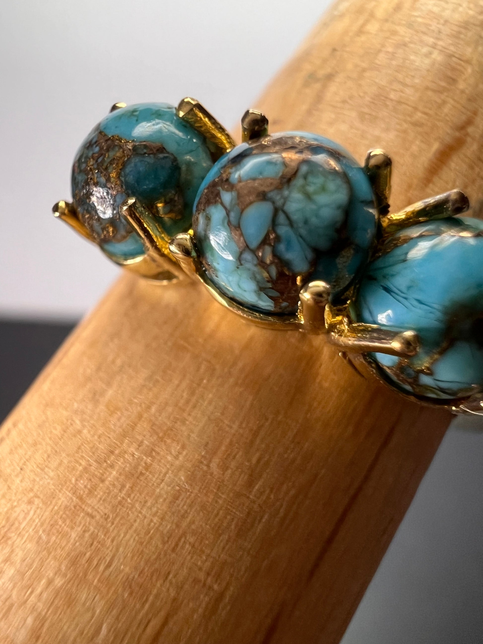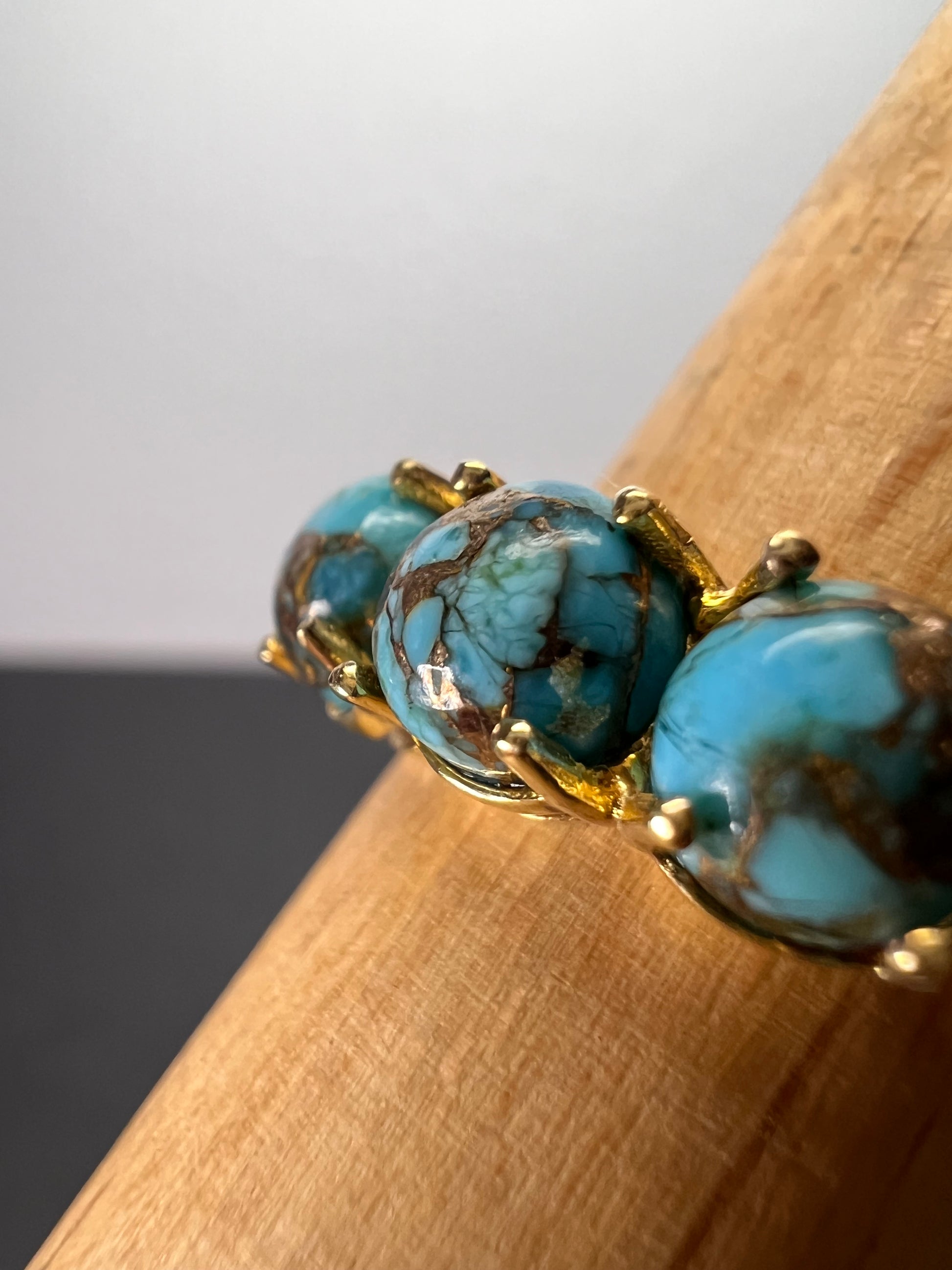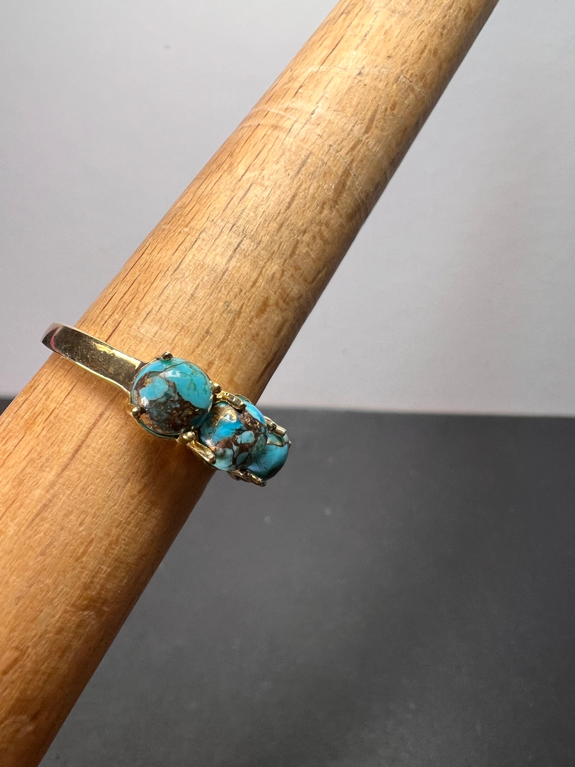 Three turquoise stones prong set in a gold over sterling silver ring. Size 9. Turquoise has been stabilized , treated and made from composite