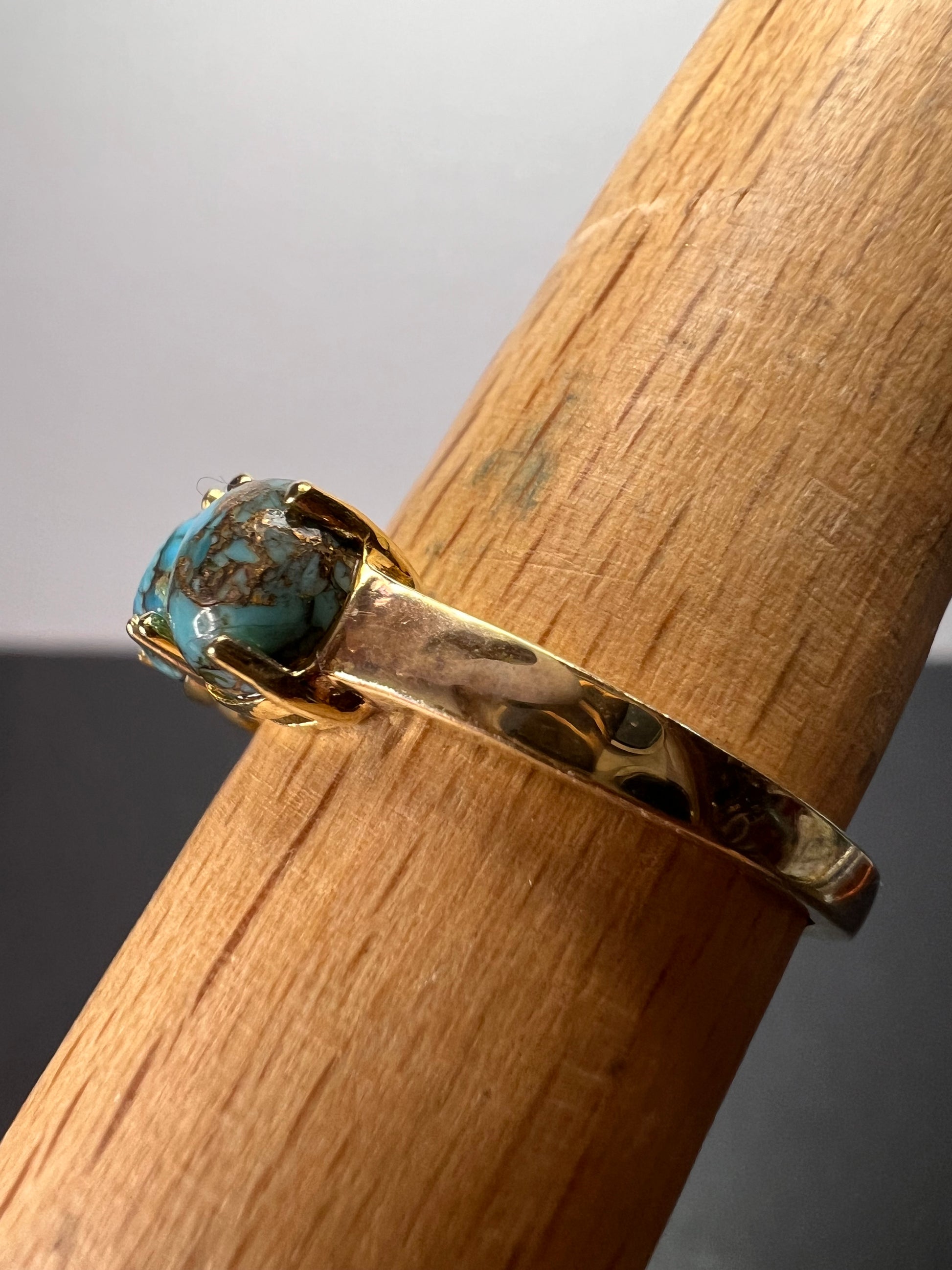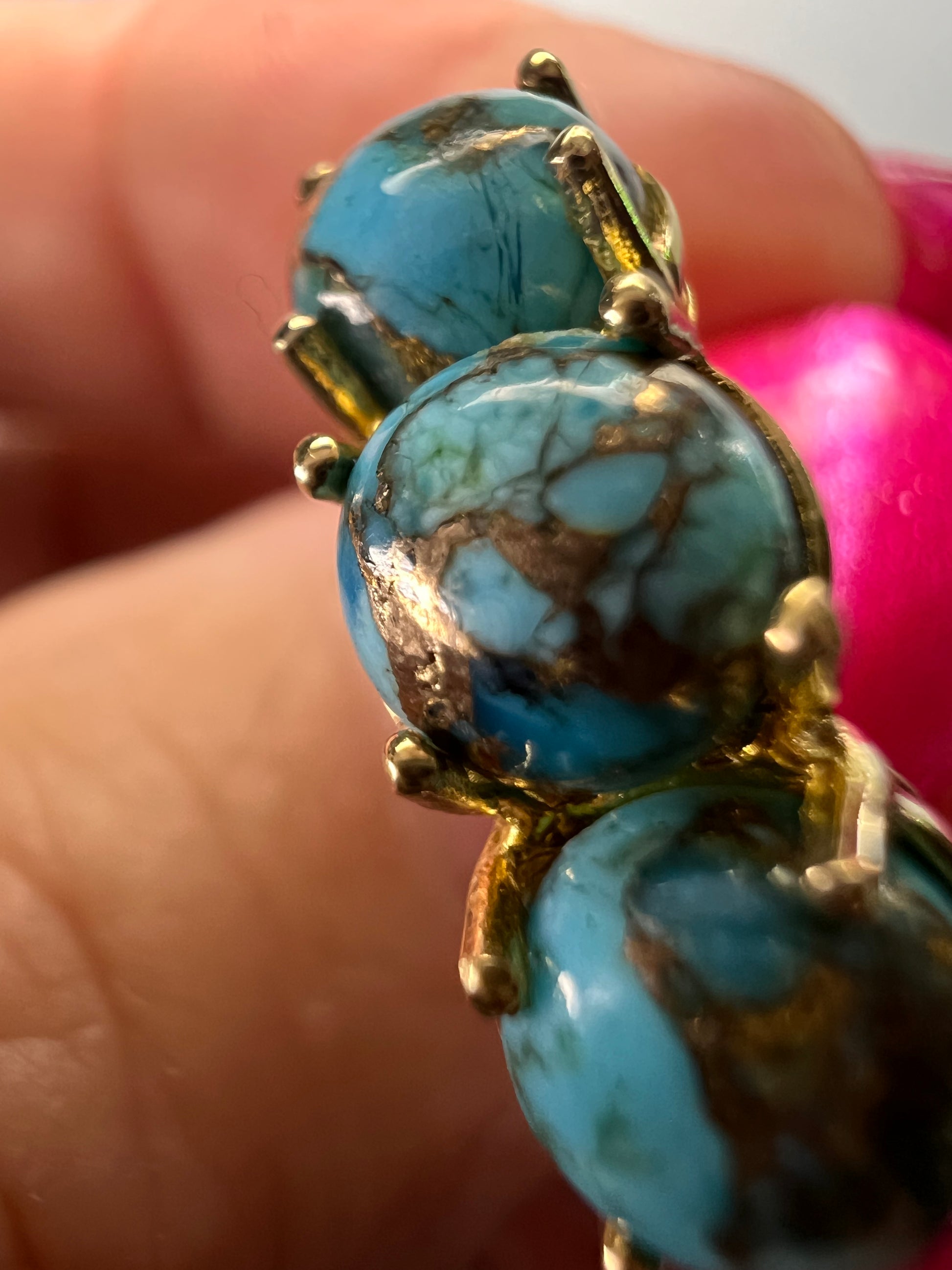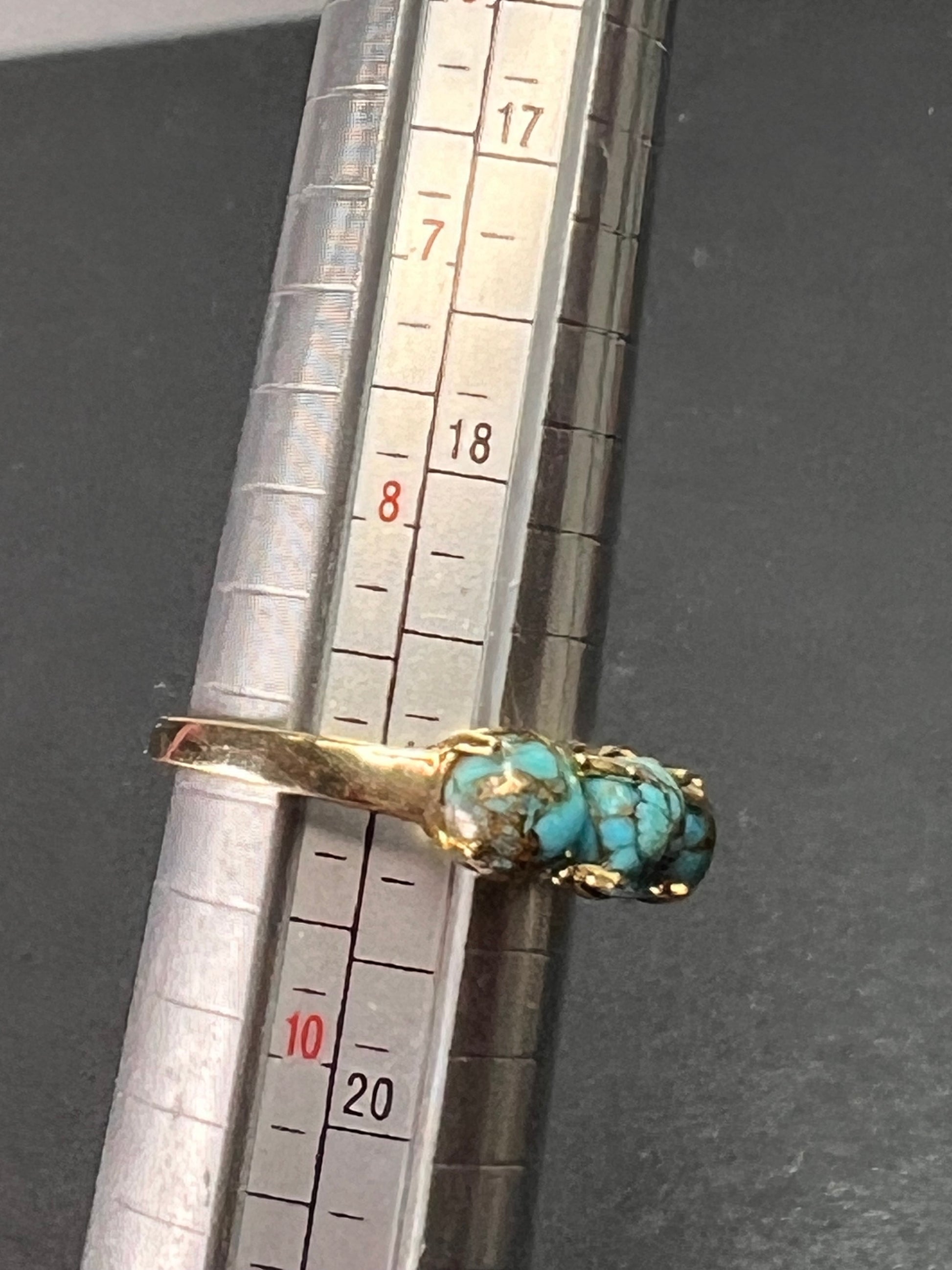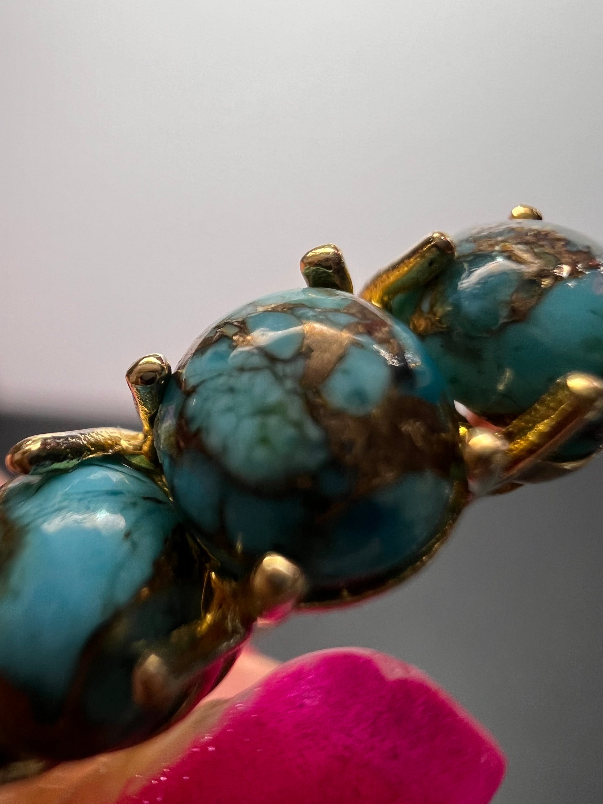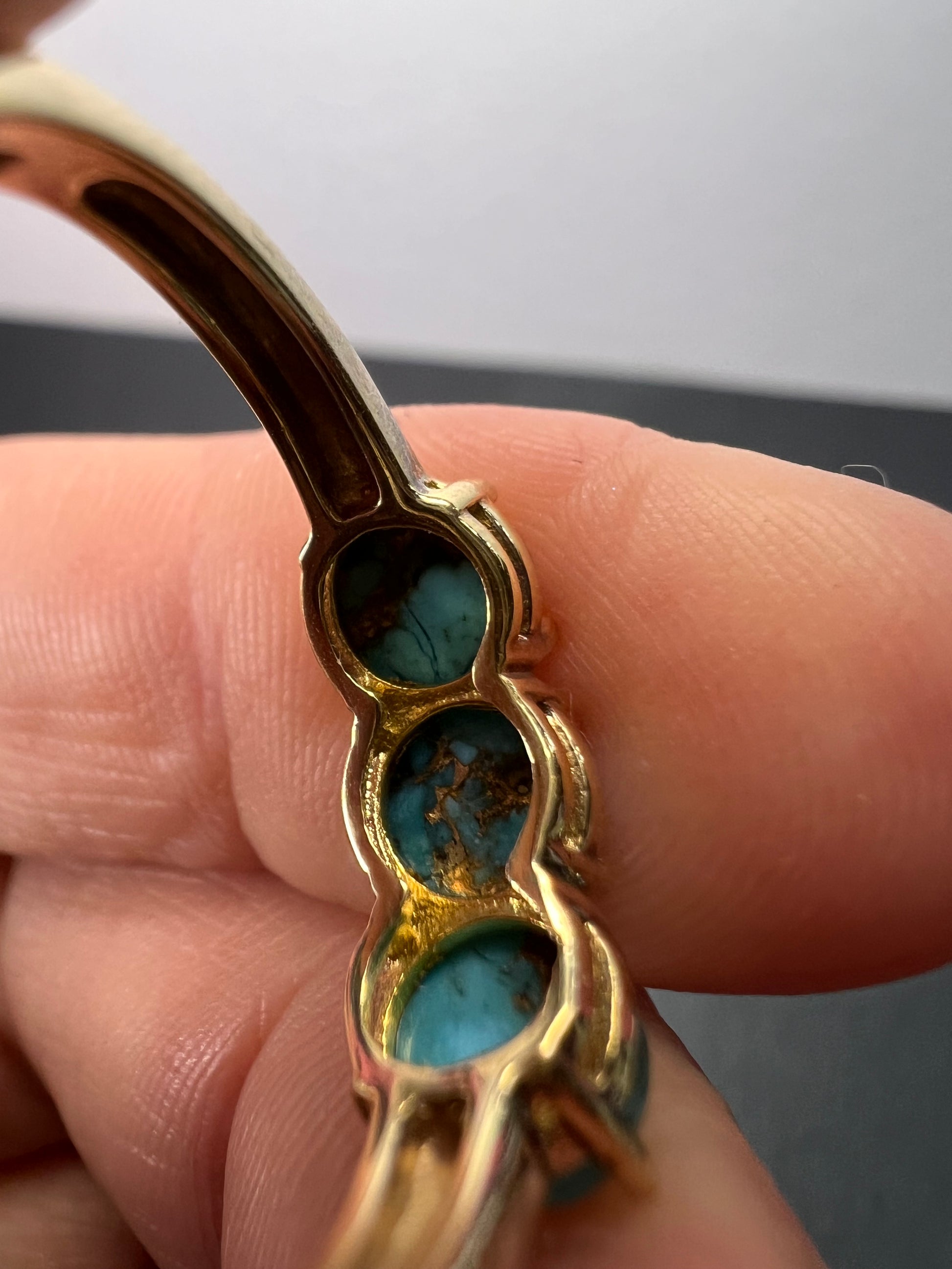 Three turquoise stones prong set in a gold over sterling silver ring. Size 9. Turquoise has been stabilized , treated and made from composite