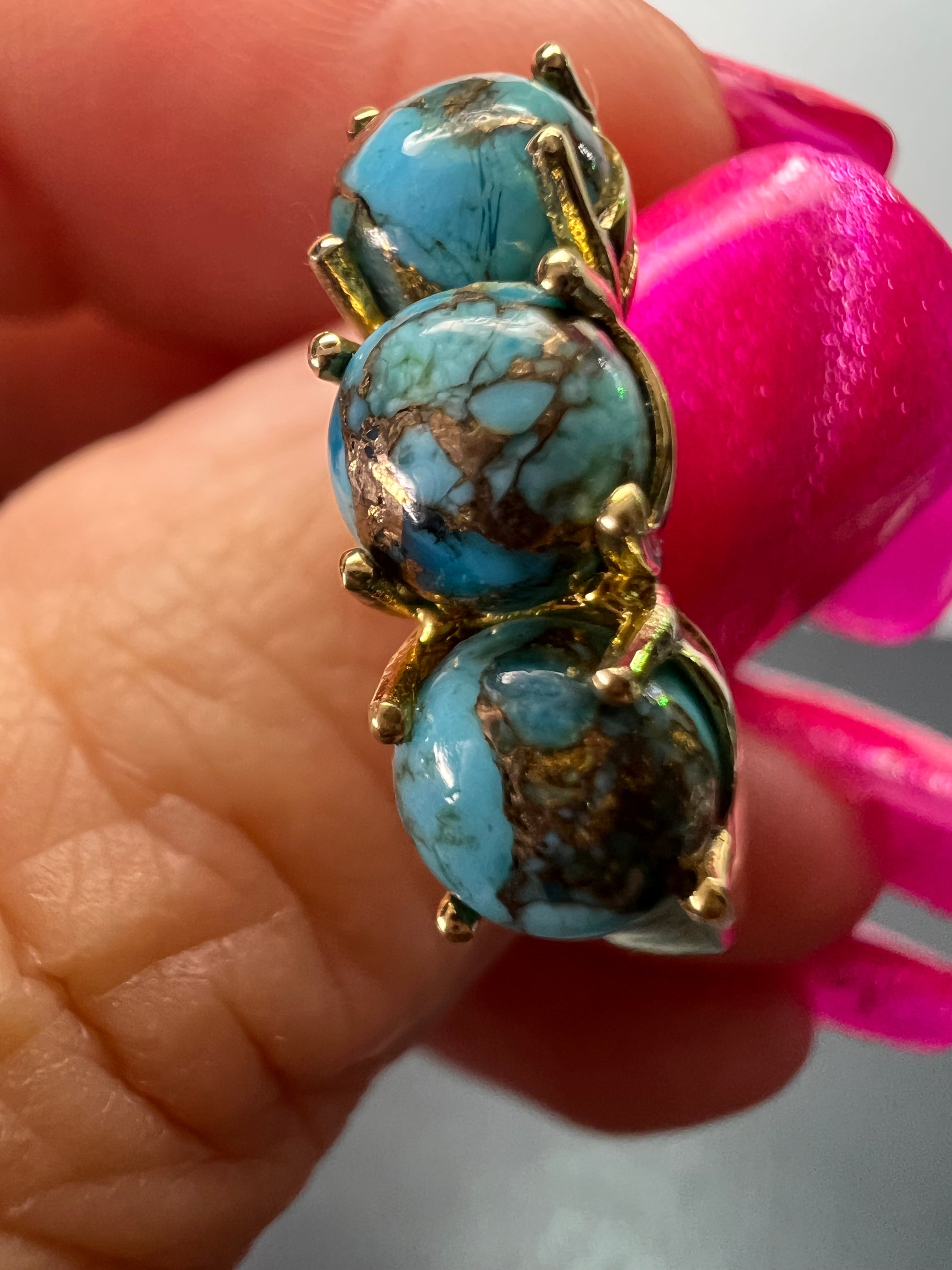 Blue composite turquoise trilogy ring in gold over sterling silver size 9