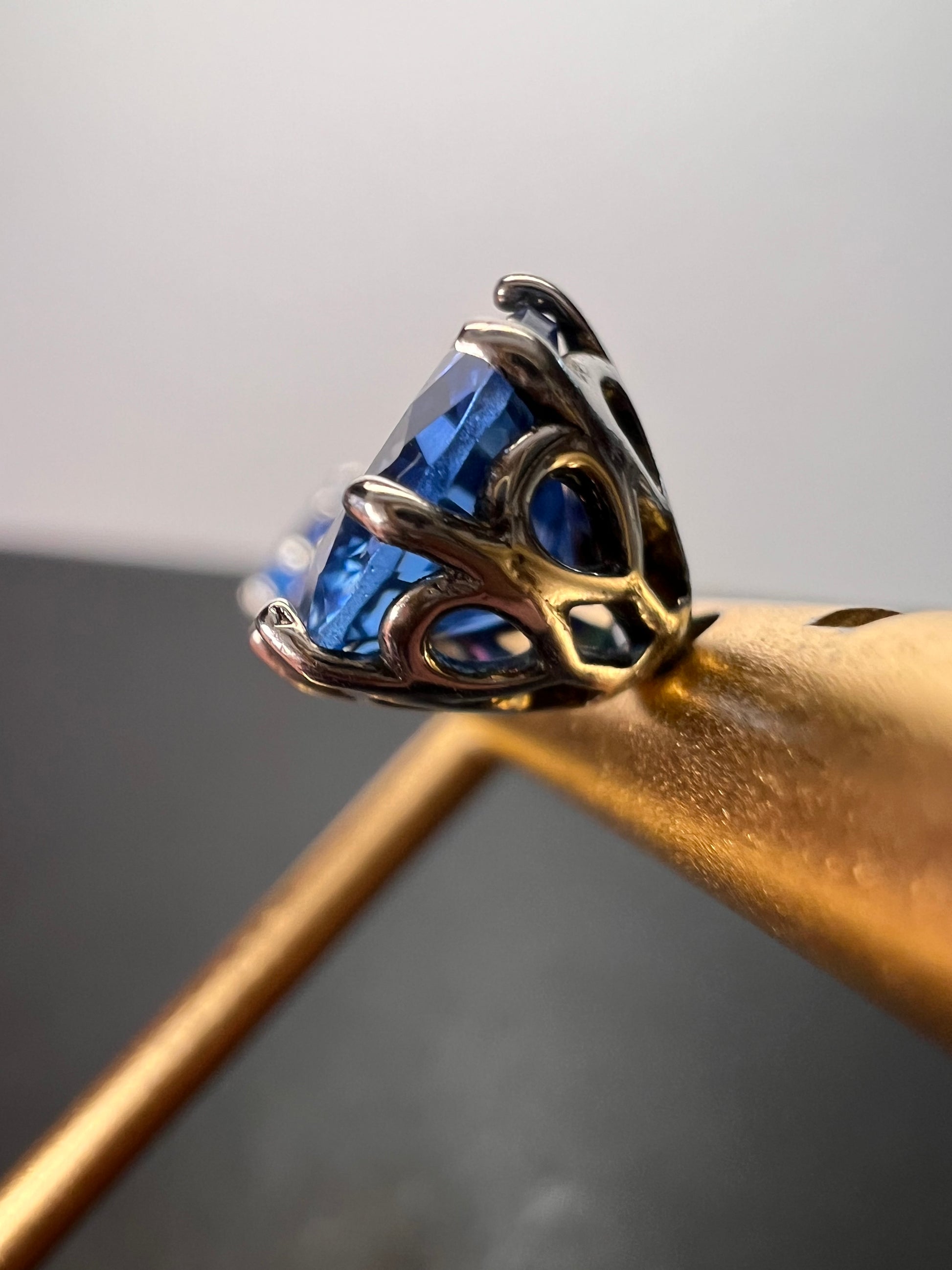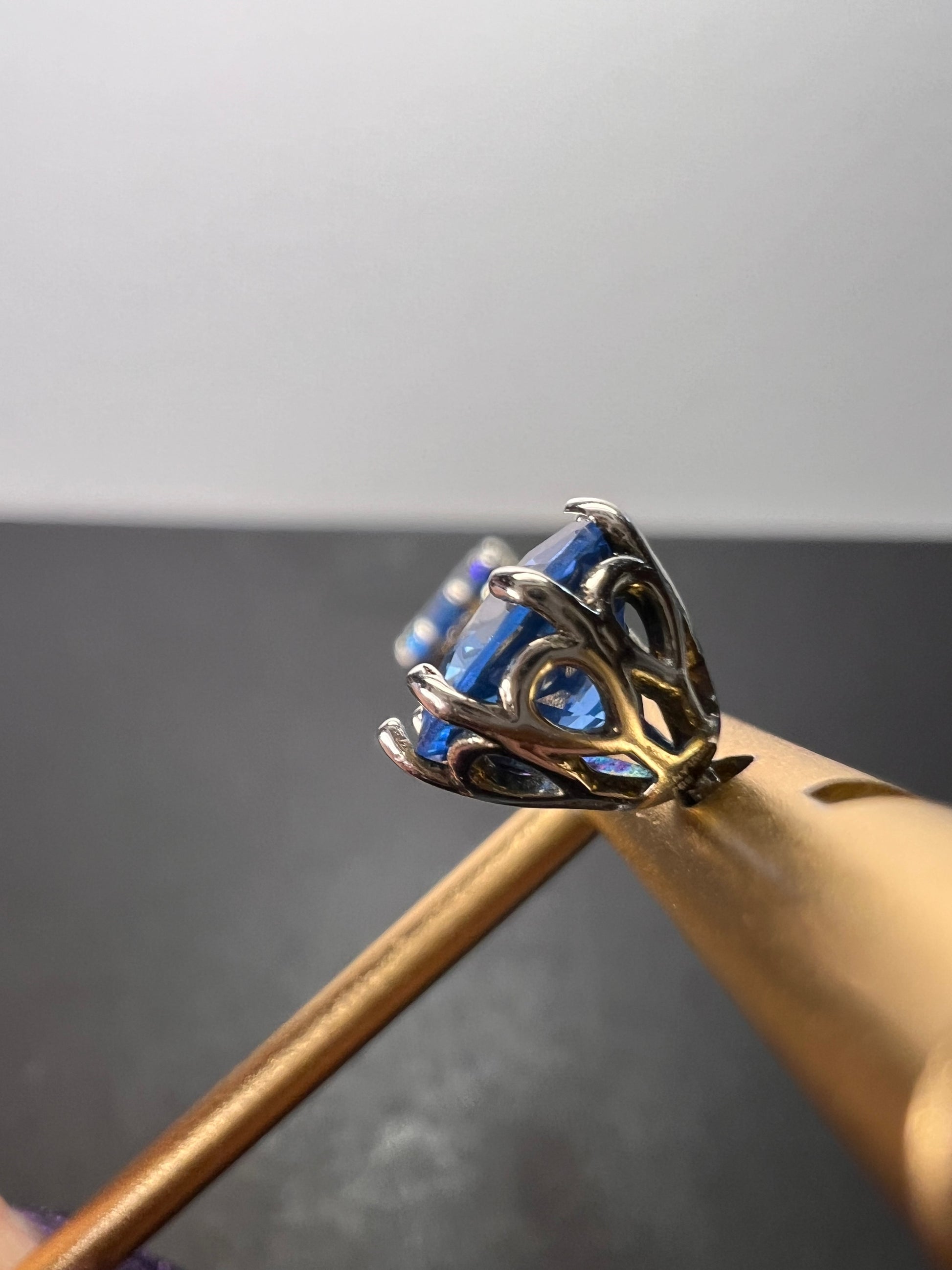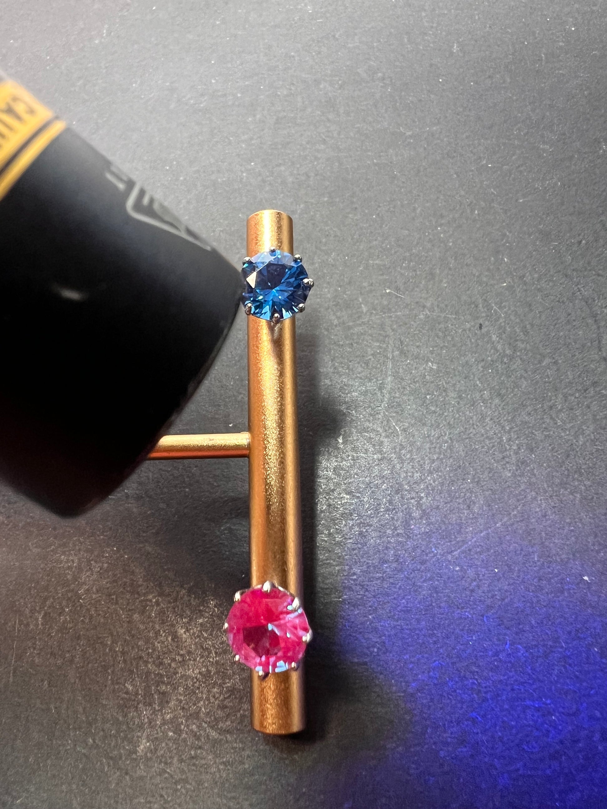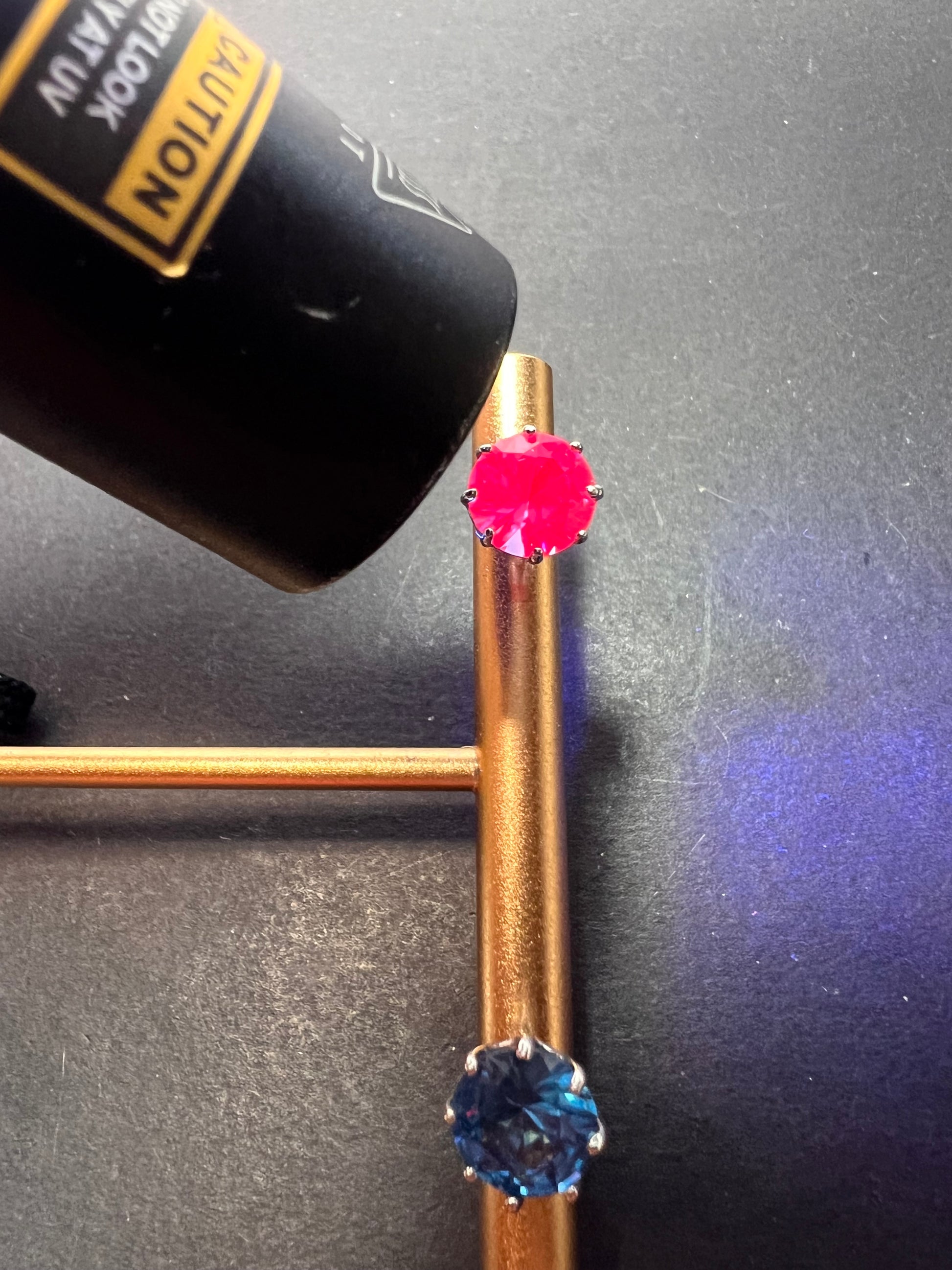 Stones test as spinel. Lab created. Set in rhodium plated over sterling silver. Stones glow red under UV light.