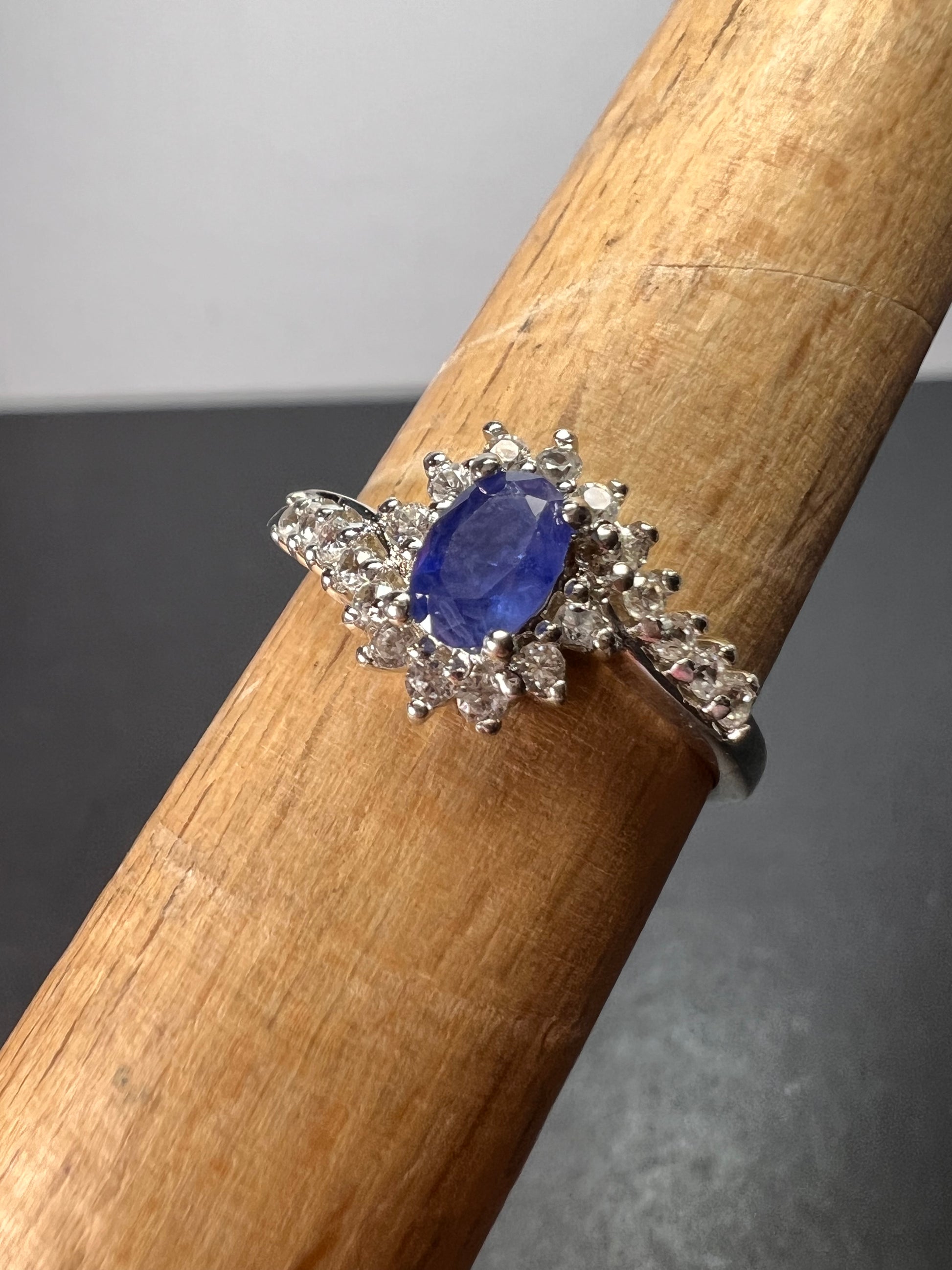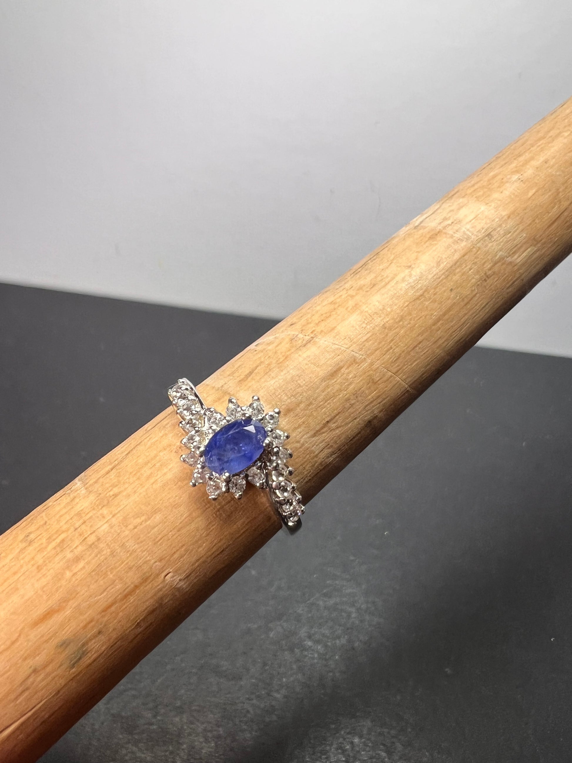 Blue kanchanaburi sapphire with white zircon accent stones prong set in platinum plated over sterling silver. Size 7. 925 Djoy. Total ctw 1.10 . Sapphire has been heat treated.