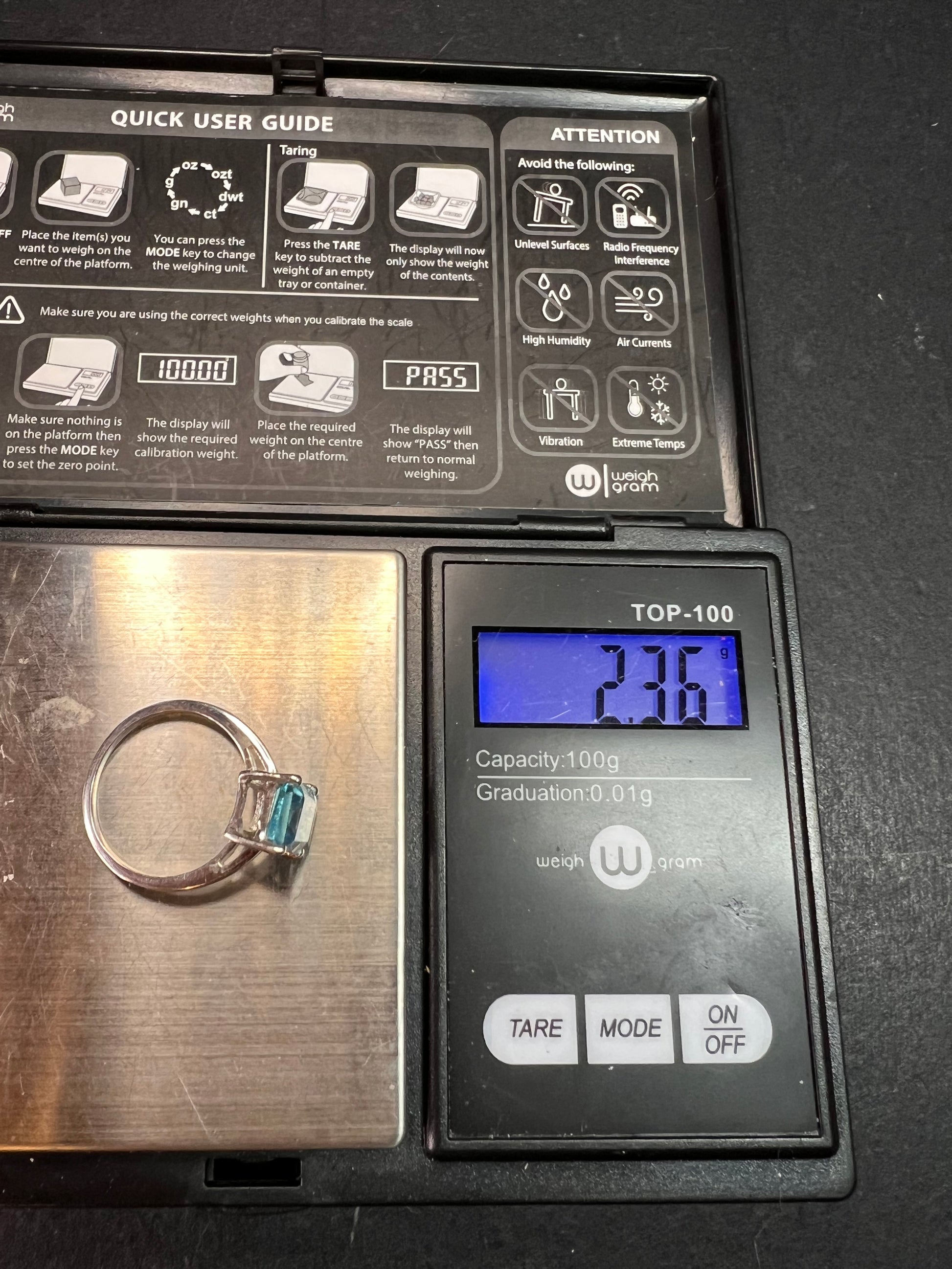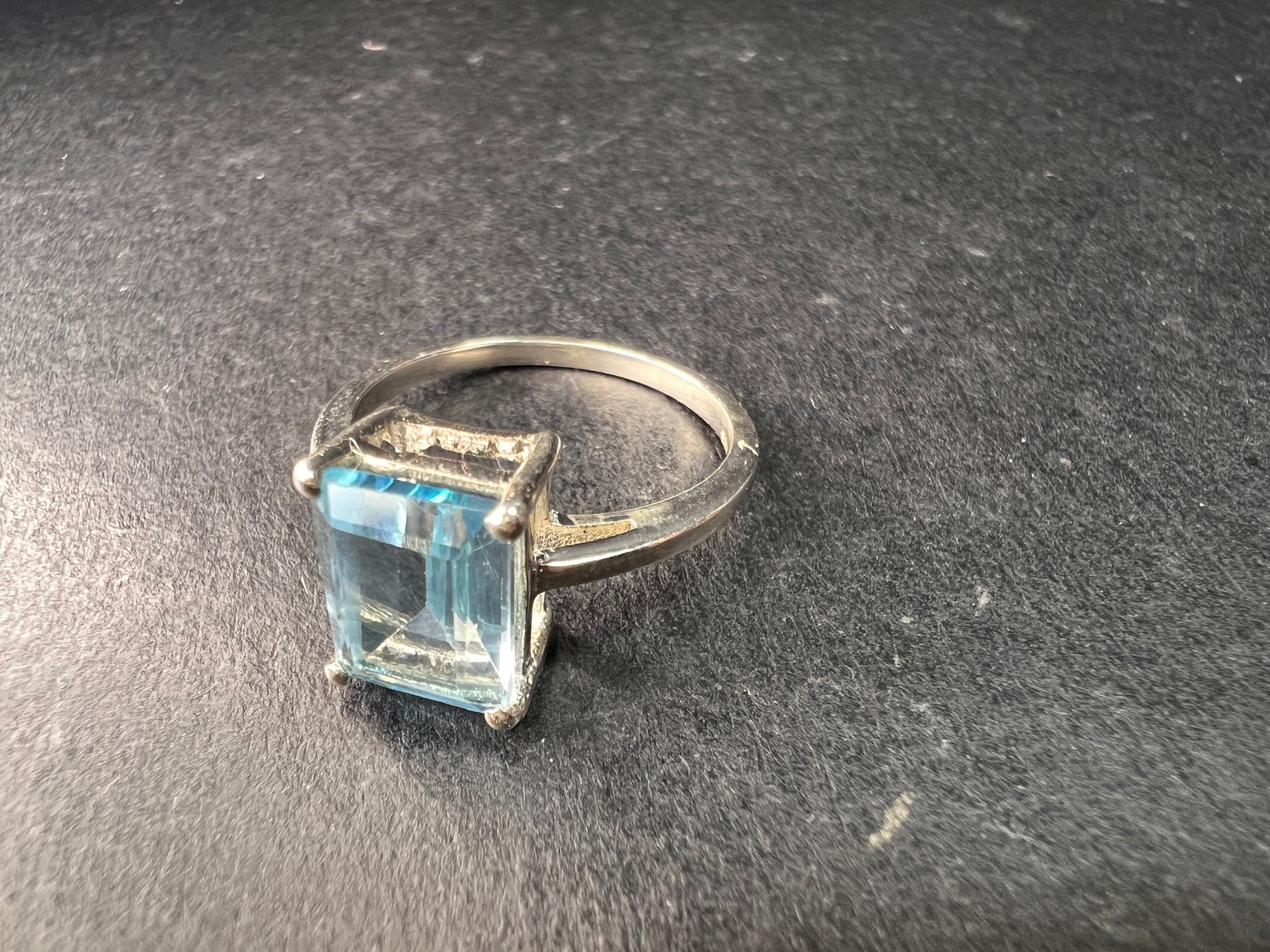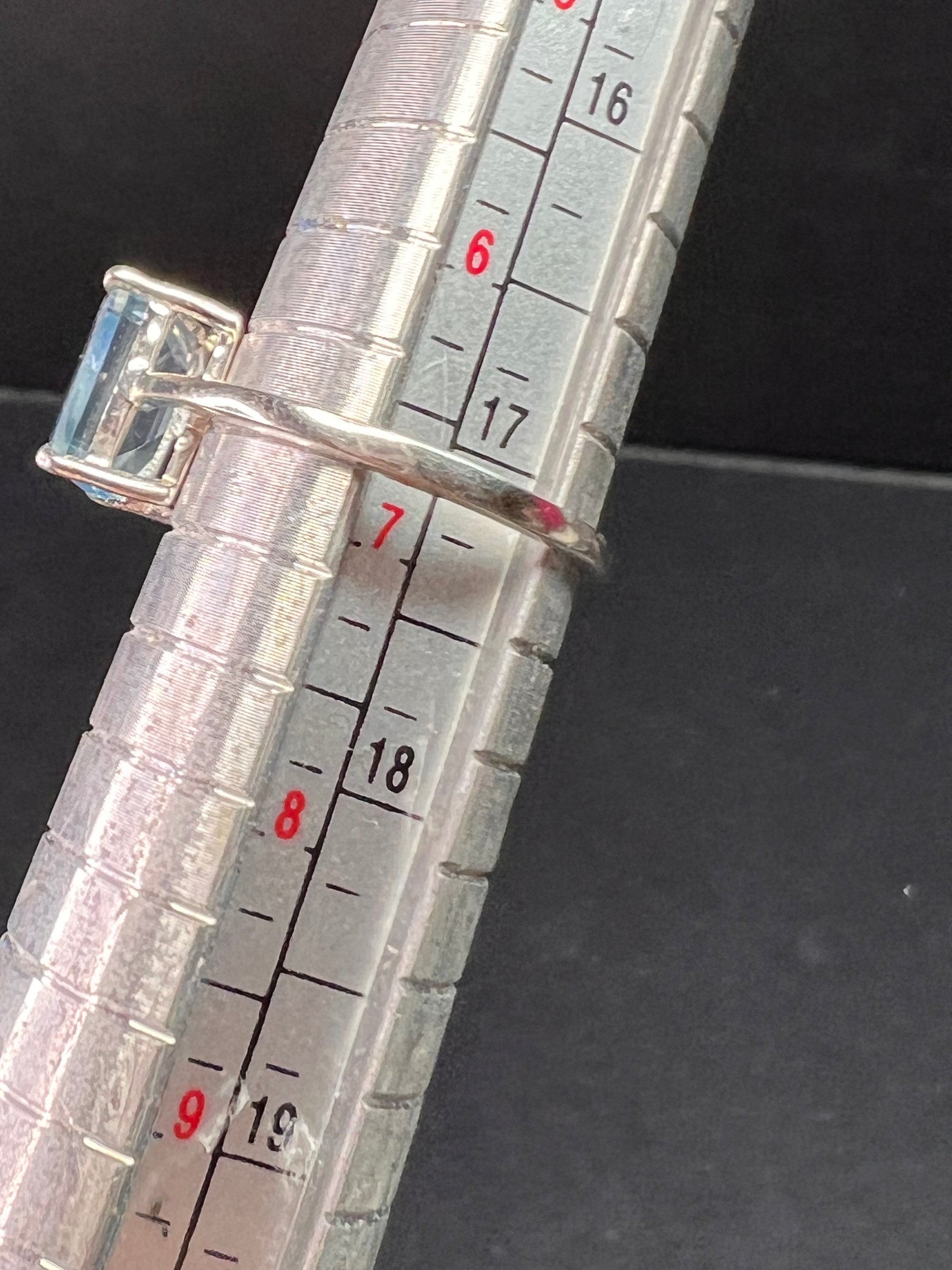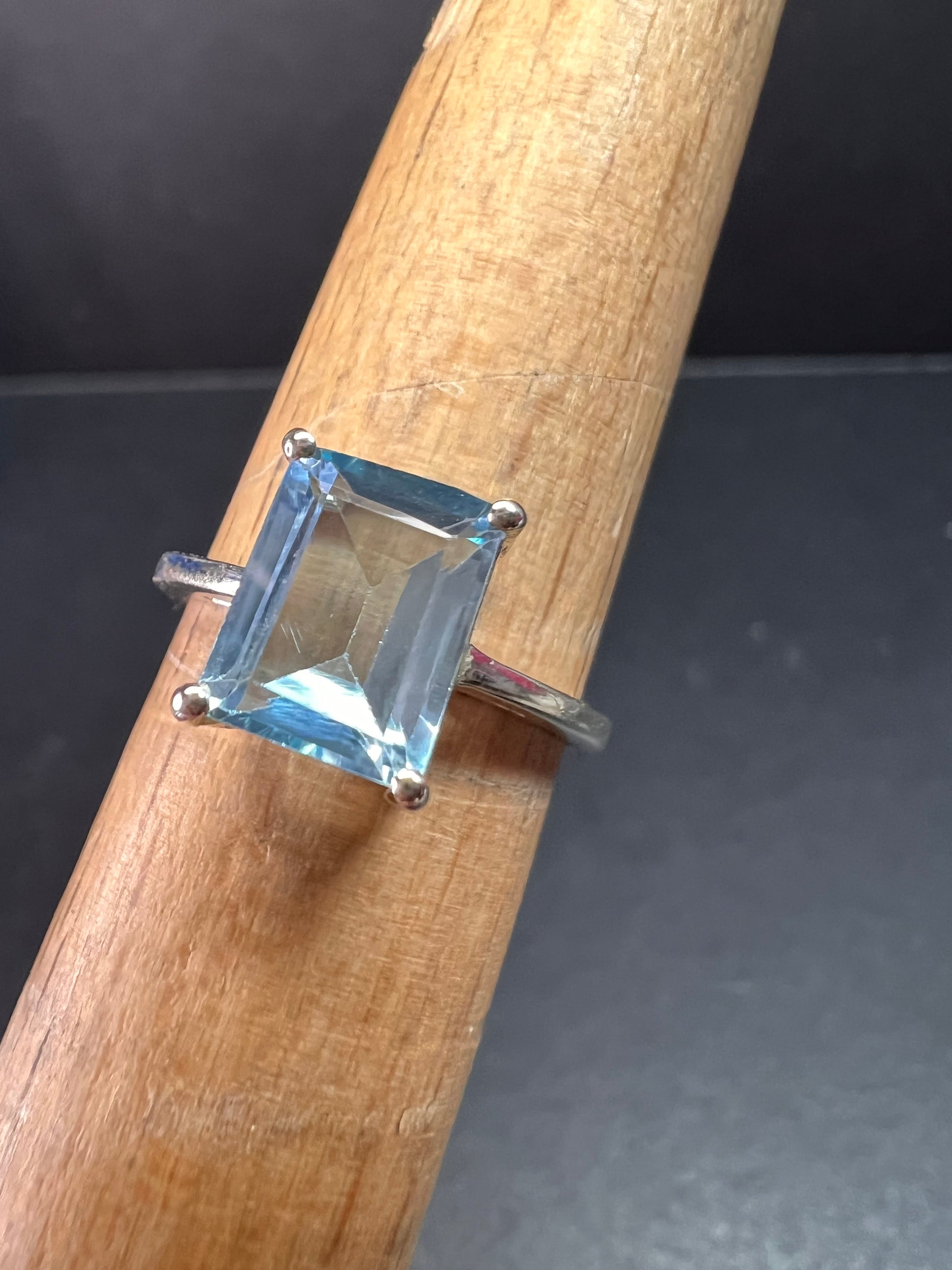 This lovely ring features a clear sky-blue topaz cut in a classic emerald shape that catches the light beautifully. The stone measures about 9.7 x 8 mm and sits in a sturdy four-prong sterling silver setting, giving it a clean, timeless look. The ring is stamped 925 and weighs 2.36 grams. Size 7. Stone is roughly 3.5-4.0 ctw.