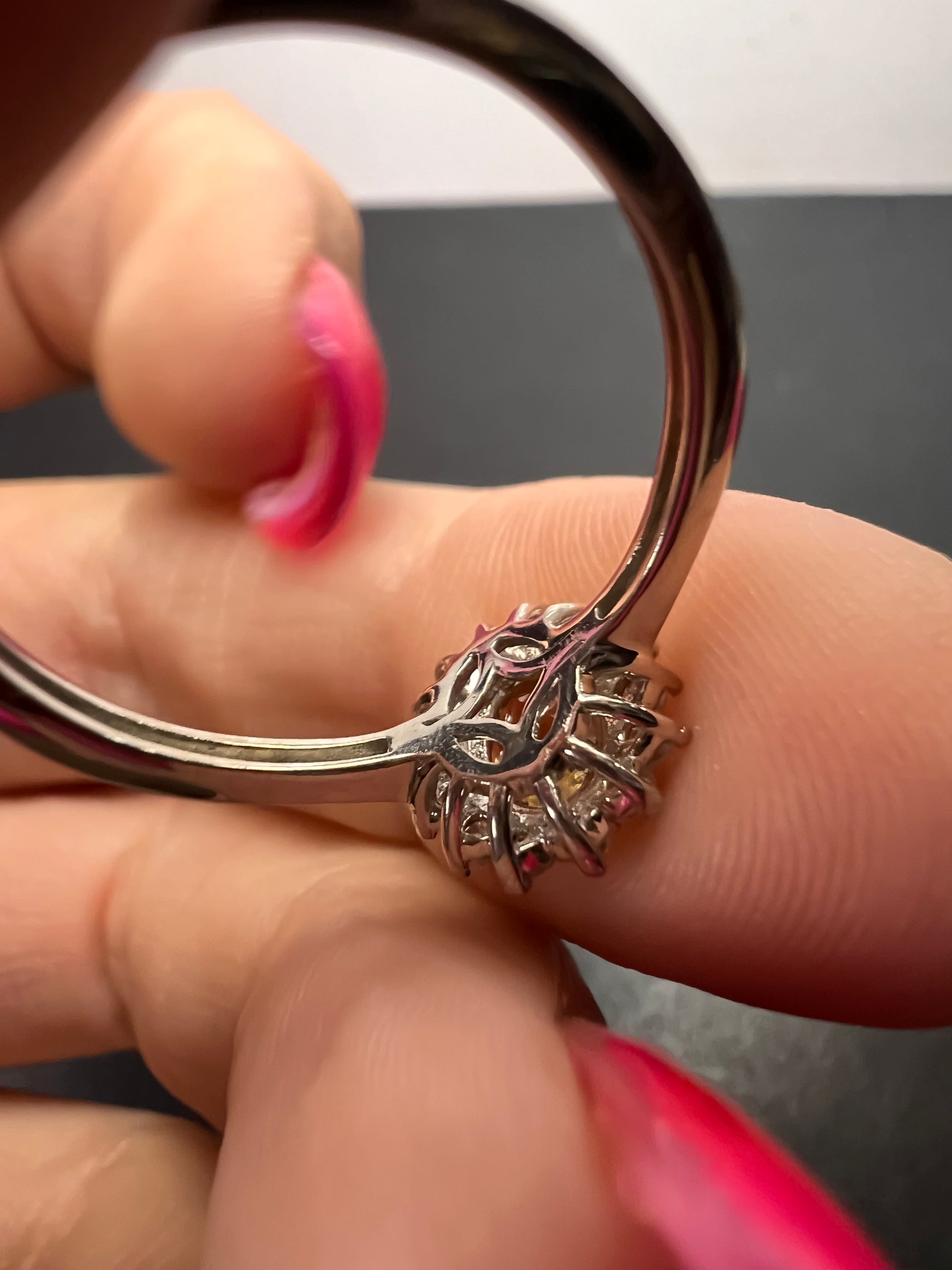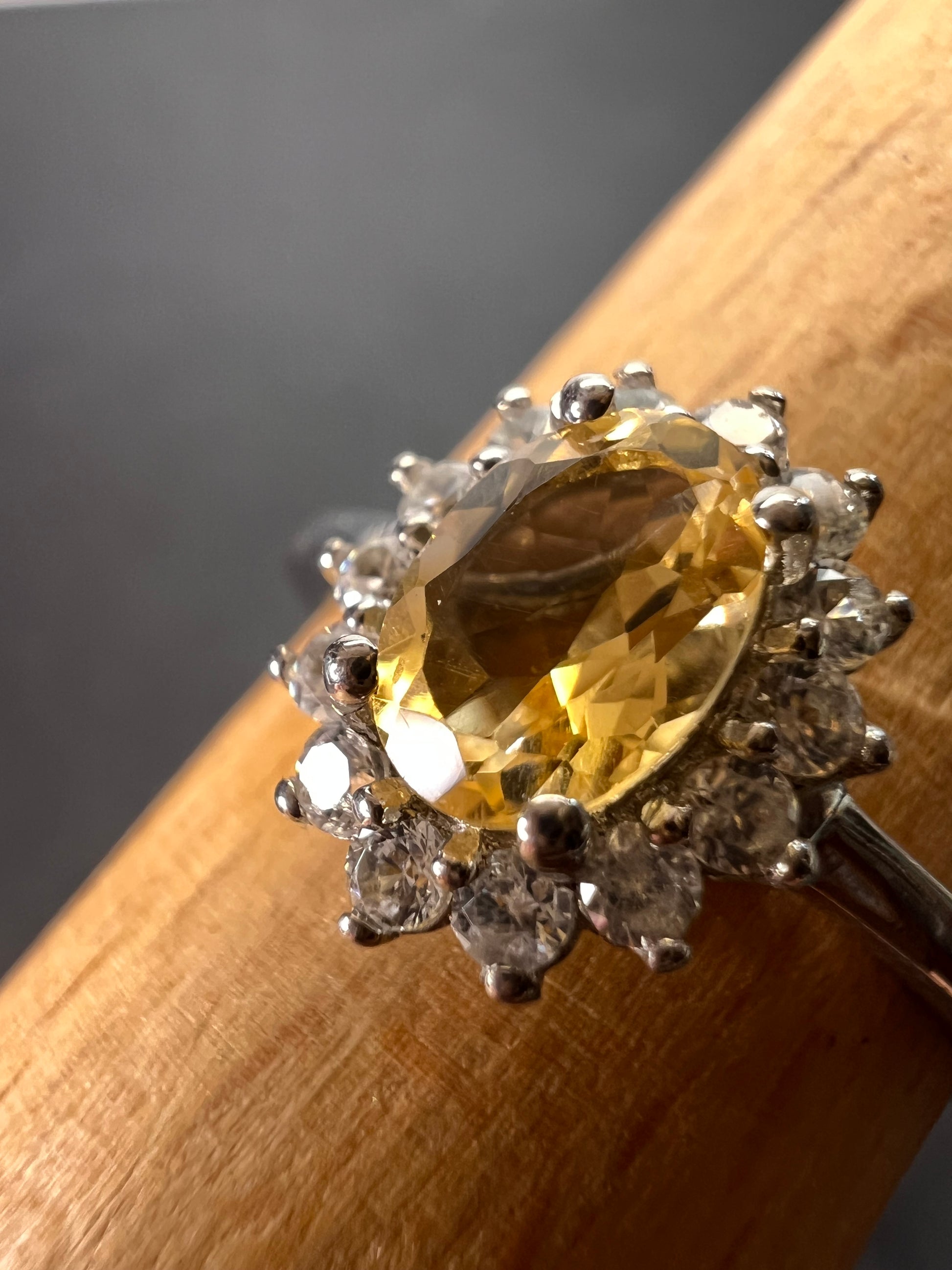 Brazilian citrine gemstone with white zircon accent stones in a prong halo setting . Platinum plated over sterling silver . Size 9 . 1.25 total ctw . 925 Djoy