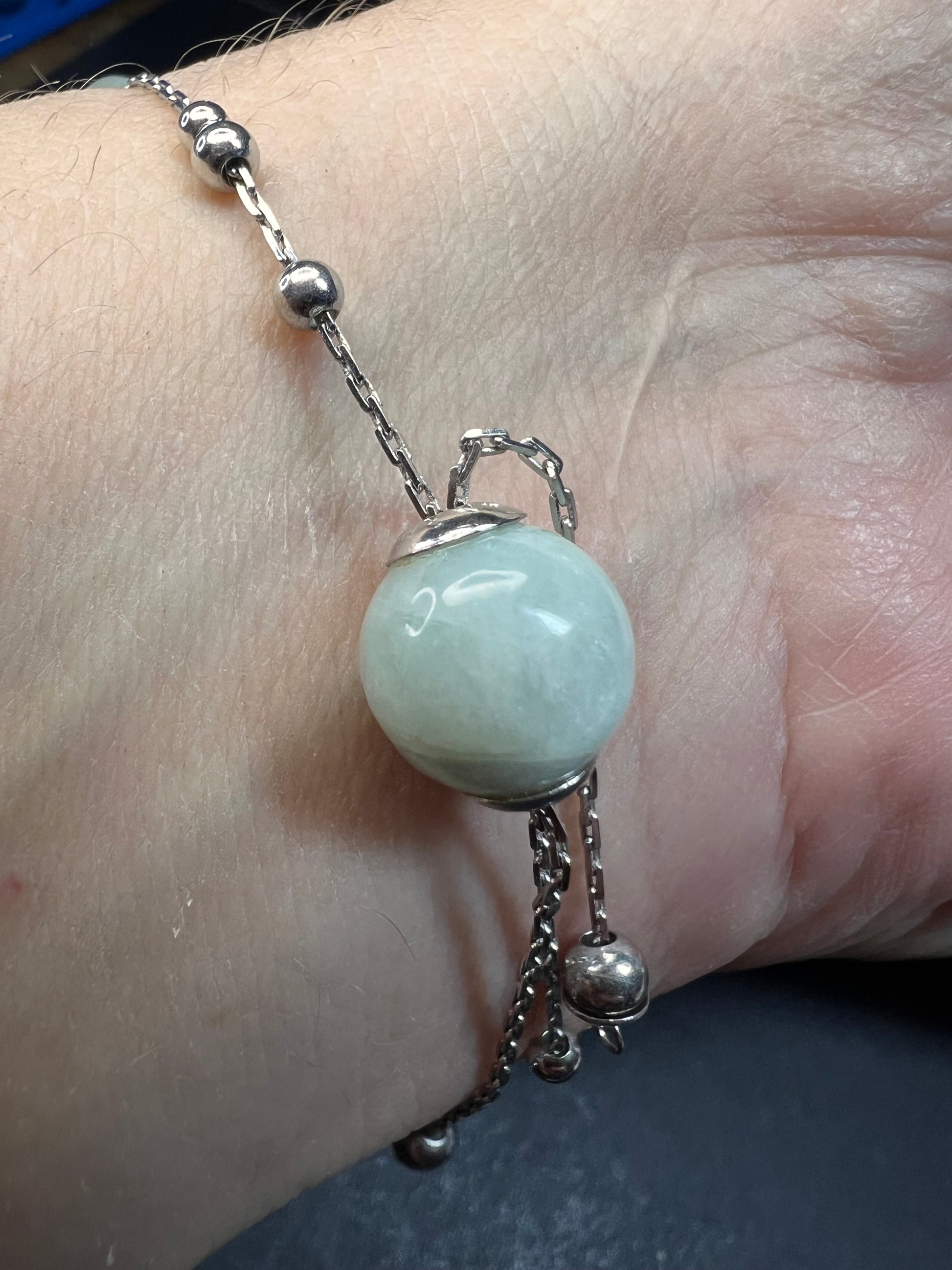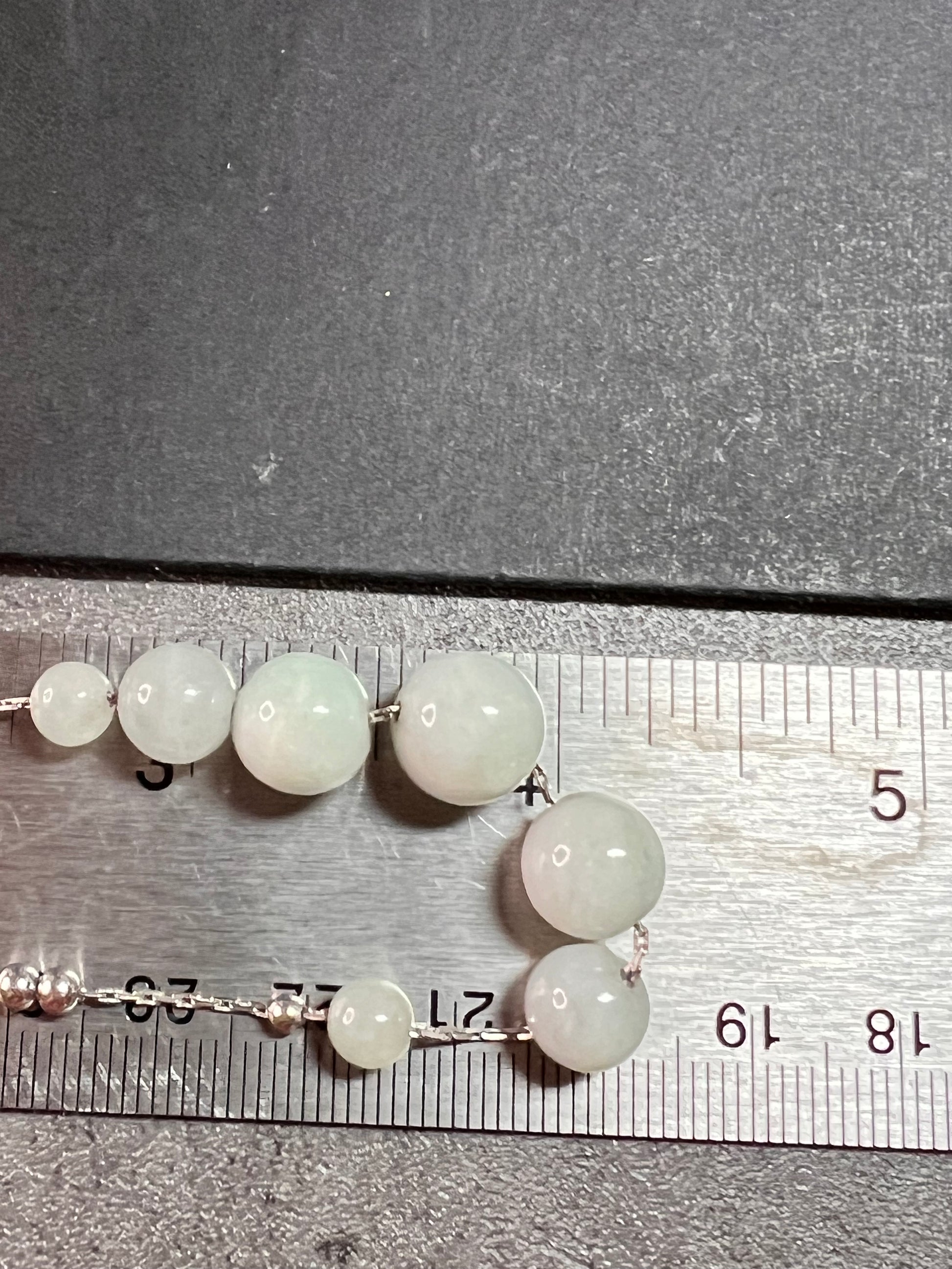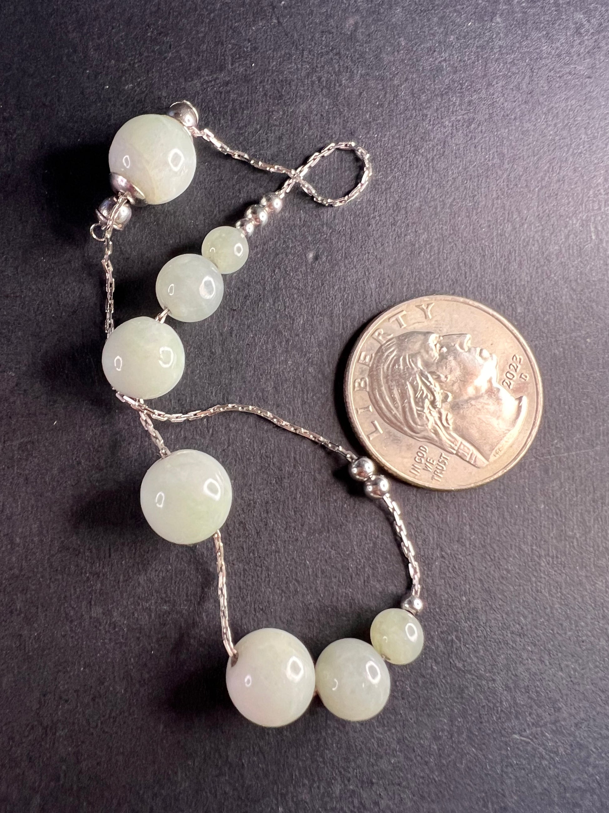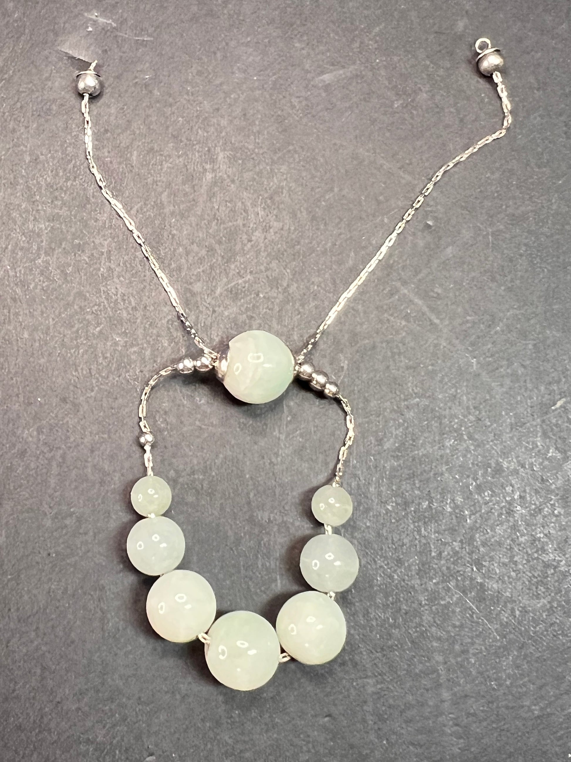 Genuine graduated Burmese light green jade beads on an authentic 925 sterling silver slide chain bolo bracelet. Bracelet roughly measures close to 9 inches if I’m correct but can be adjusted smaller as little as maybe 5 inches. 925