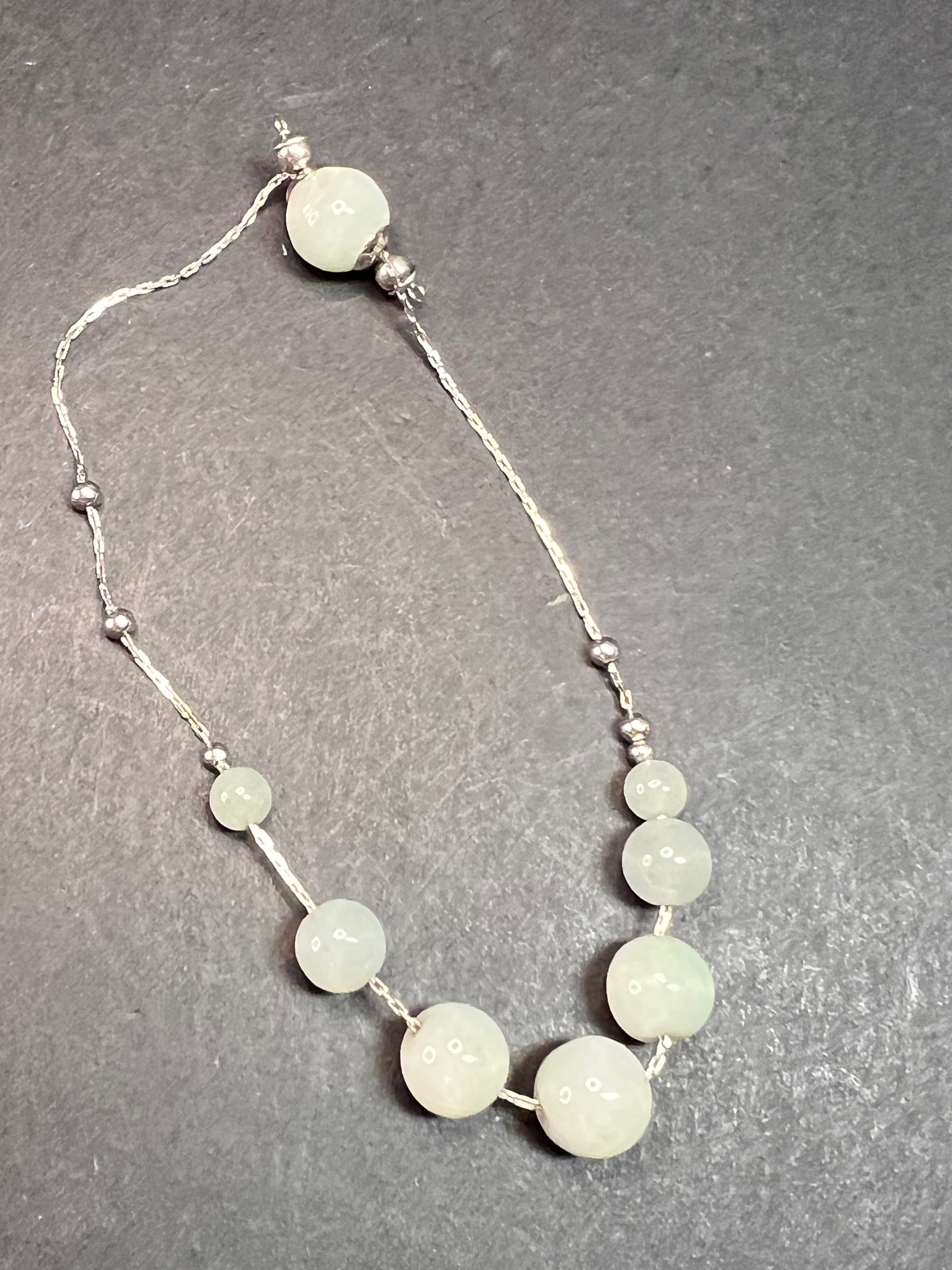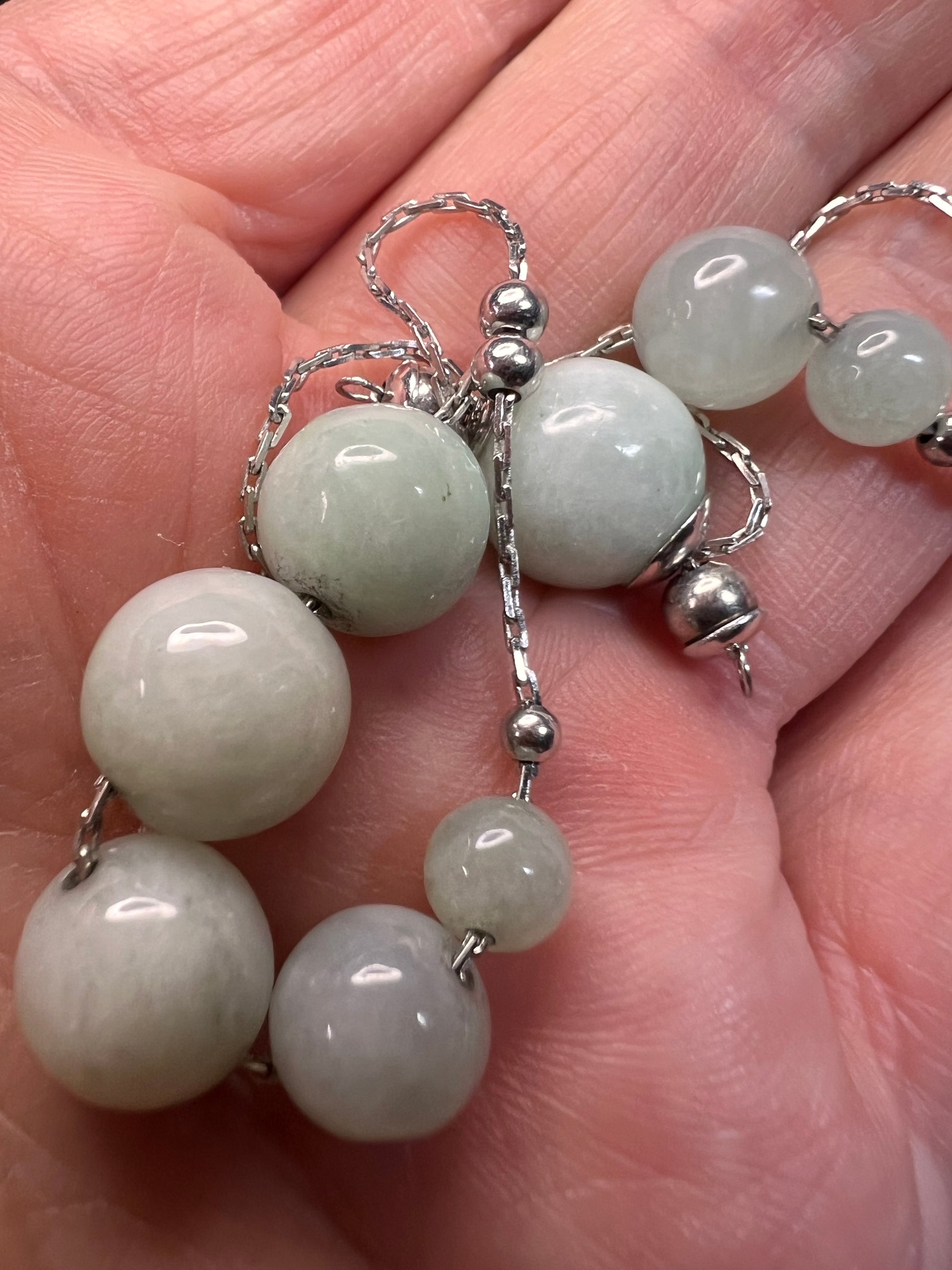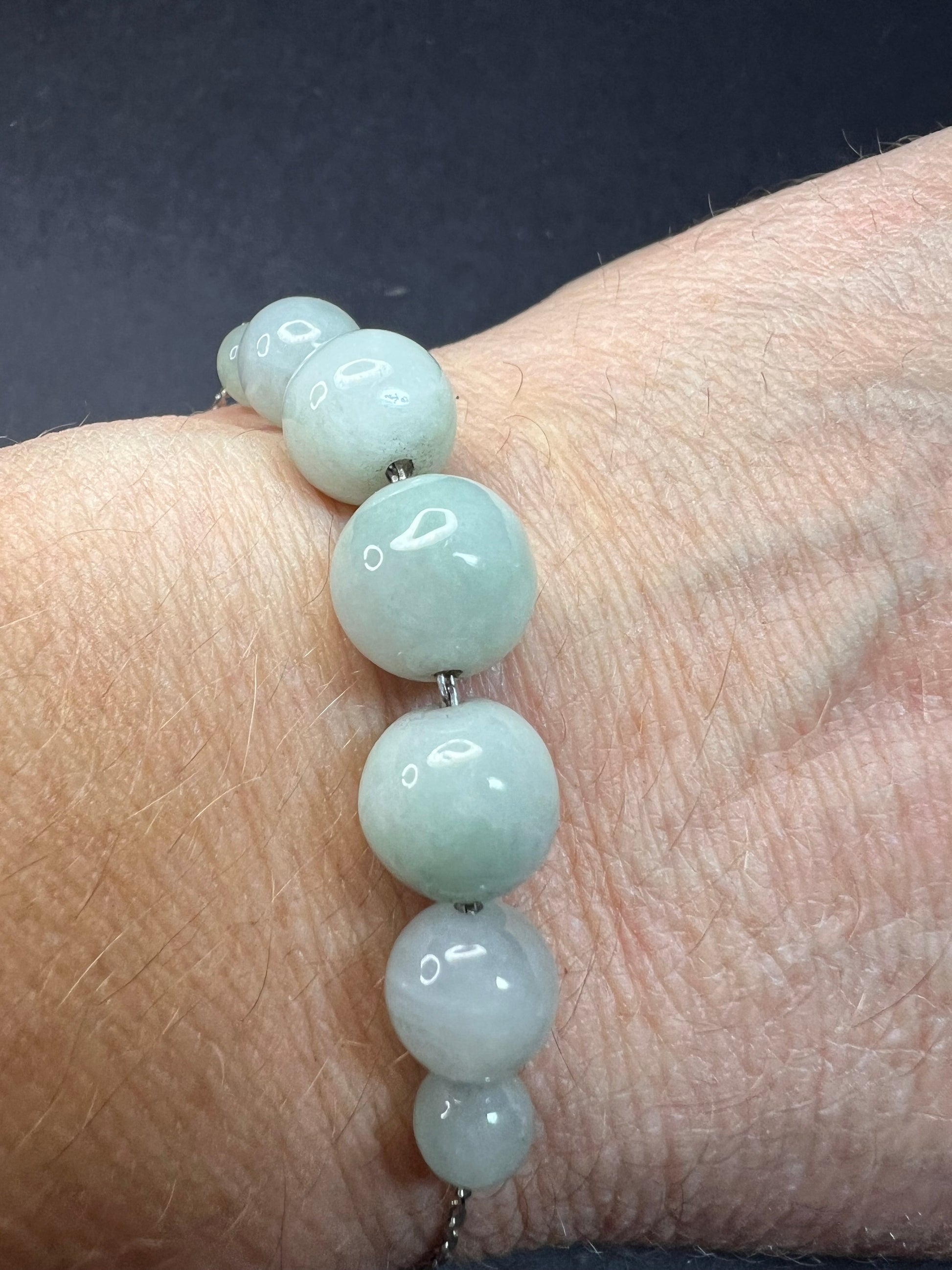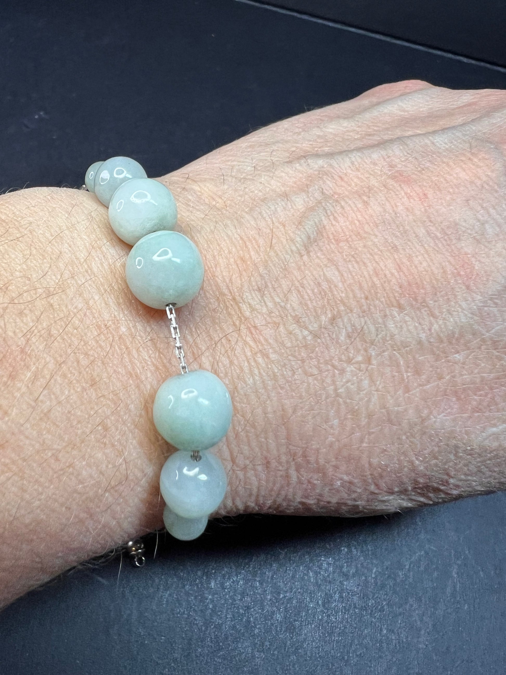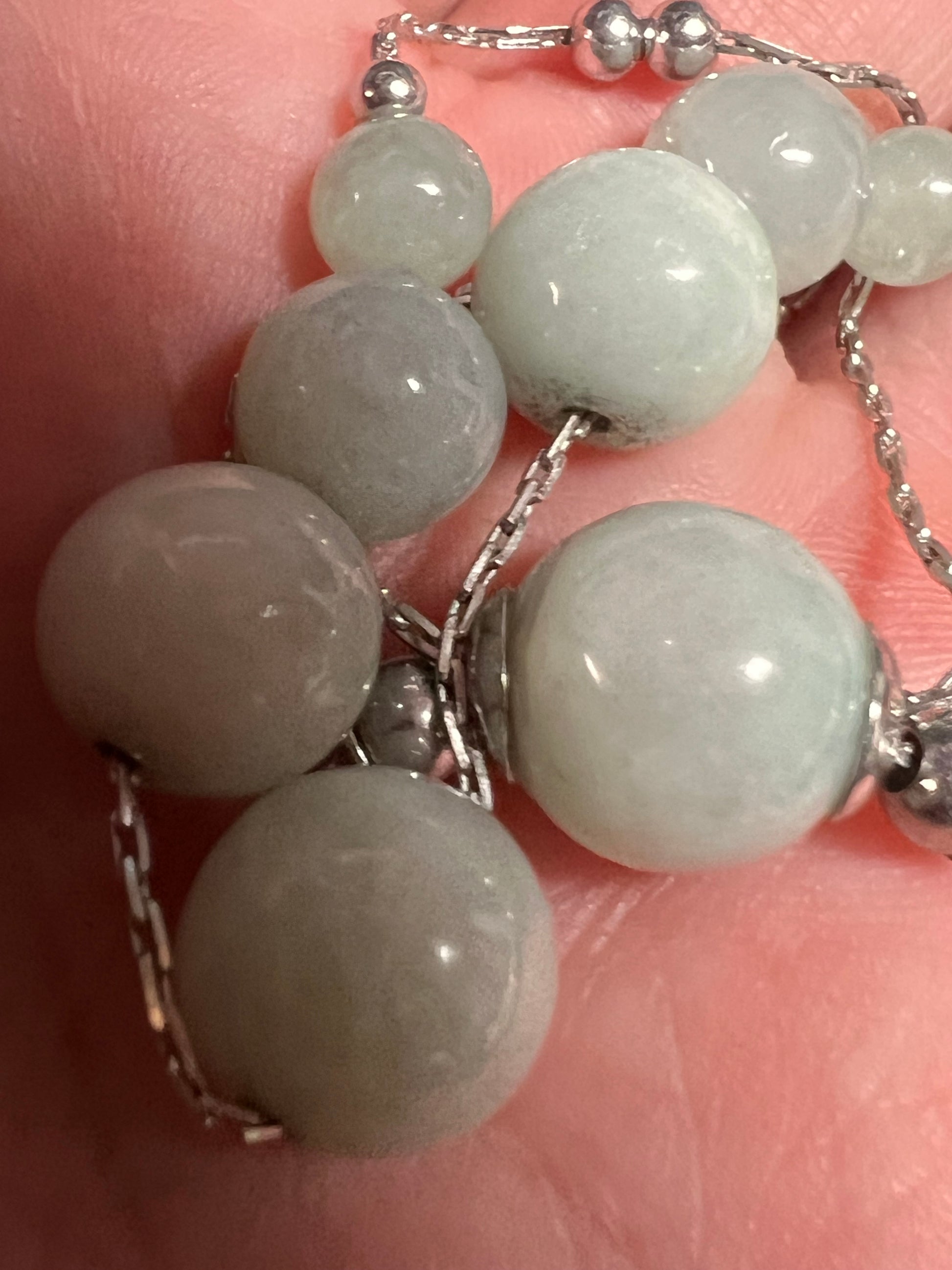 Genuine graduated Burmese light green jade beads on an authentic 925 sterling silver slide chain bolo bracelet. Bracelet roughly measures close to 9 inches if I’m correct but can be adjusted smaller as little as maybe 5 inches. 925