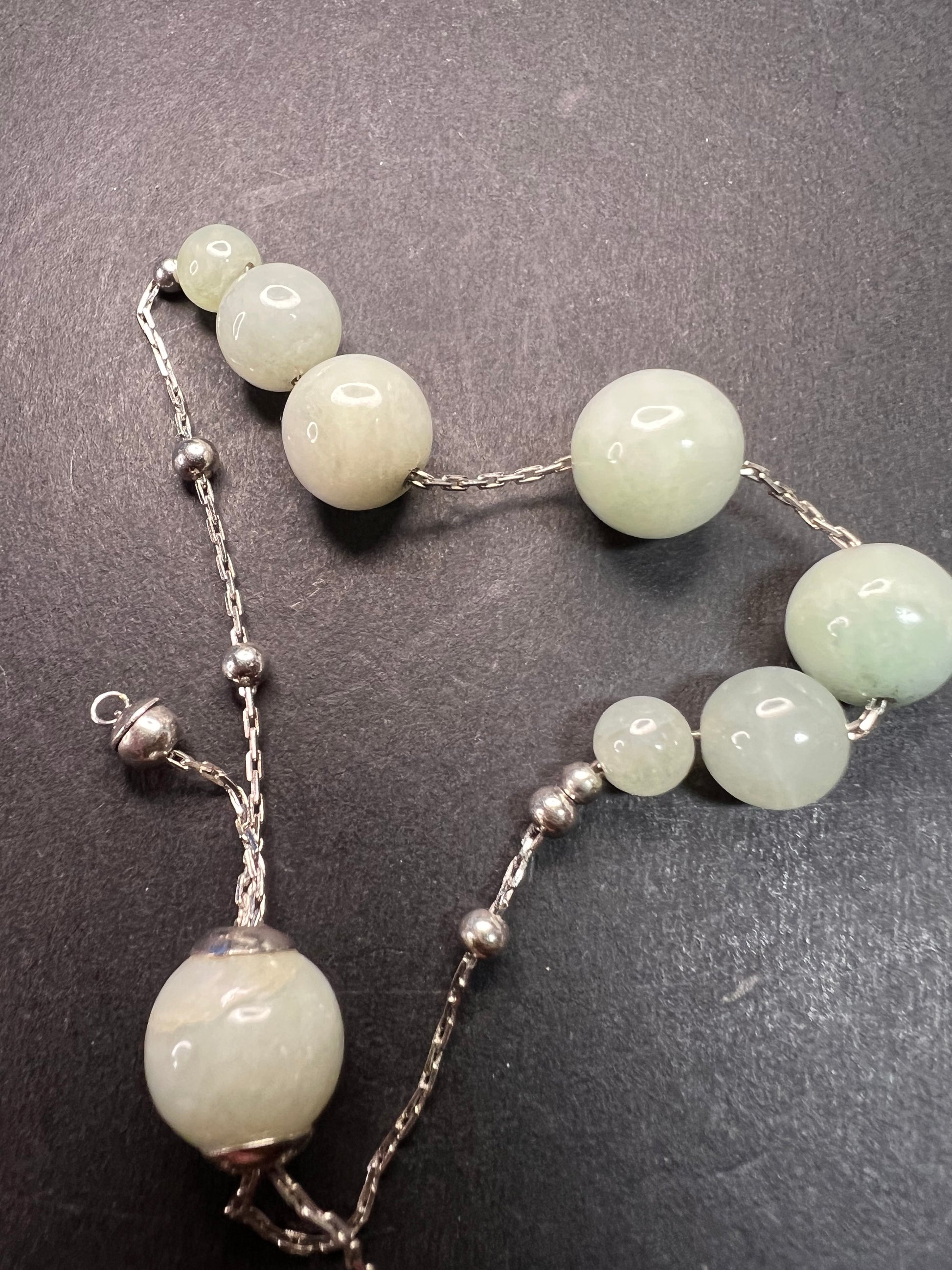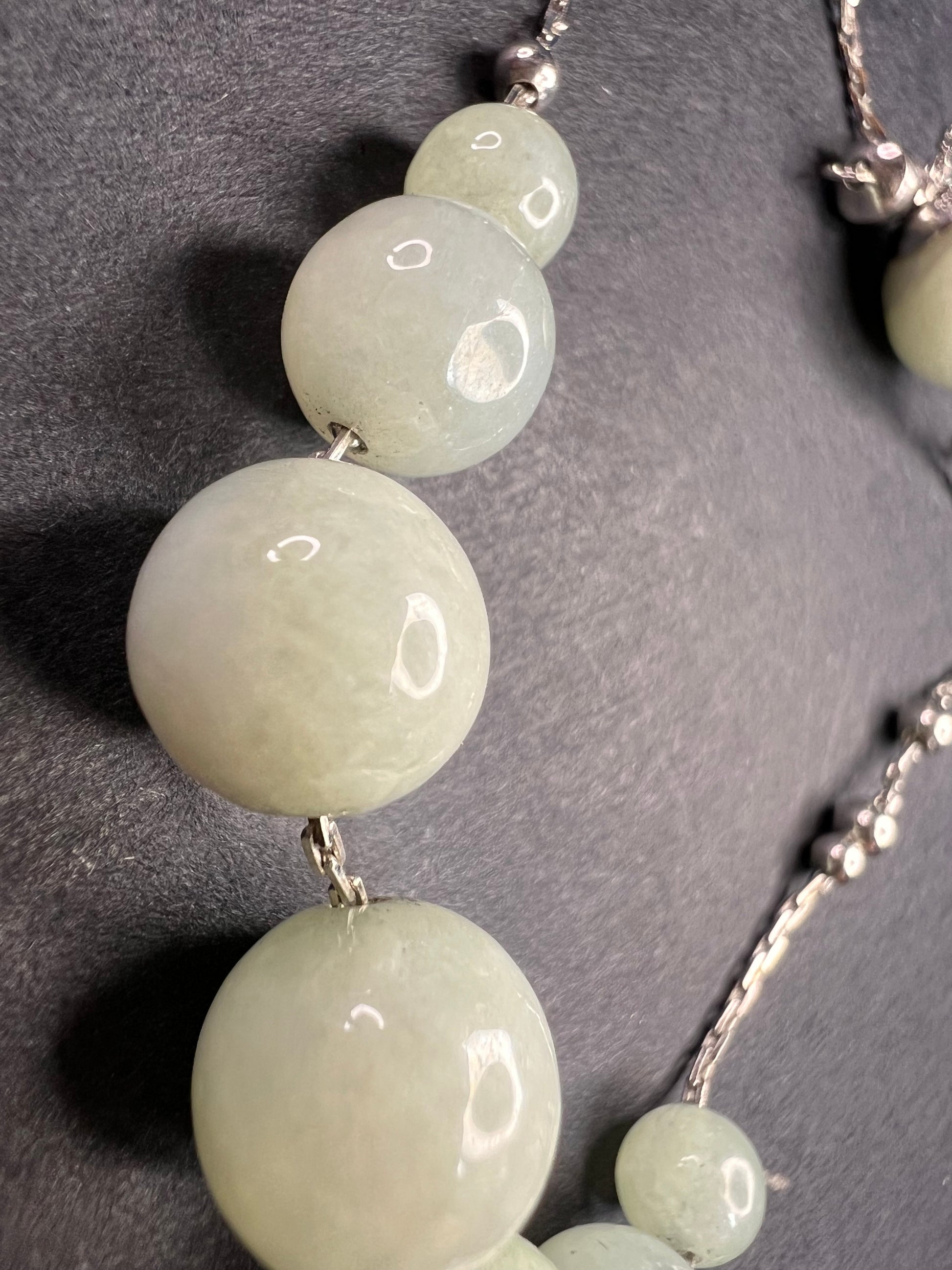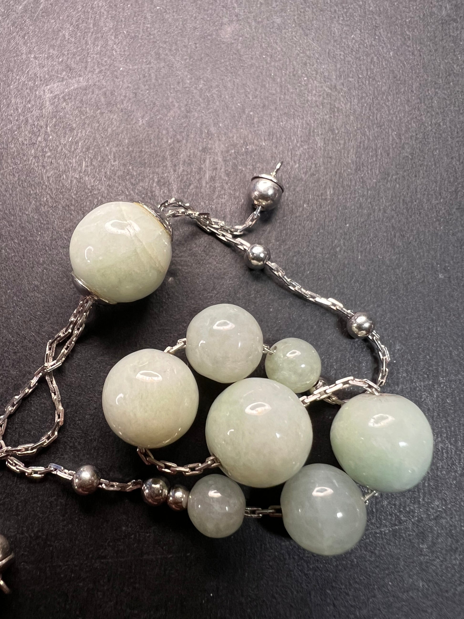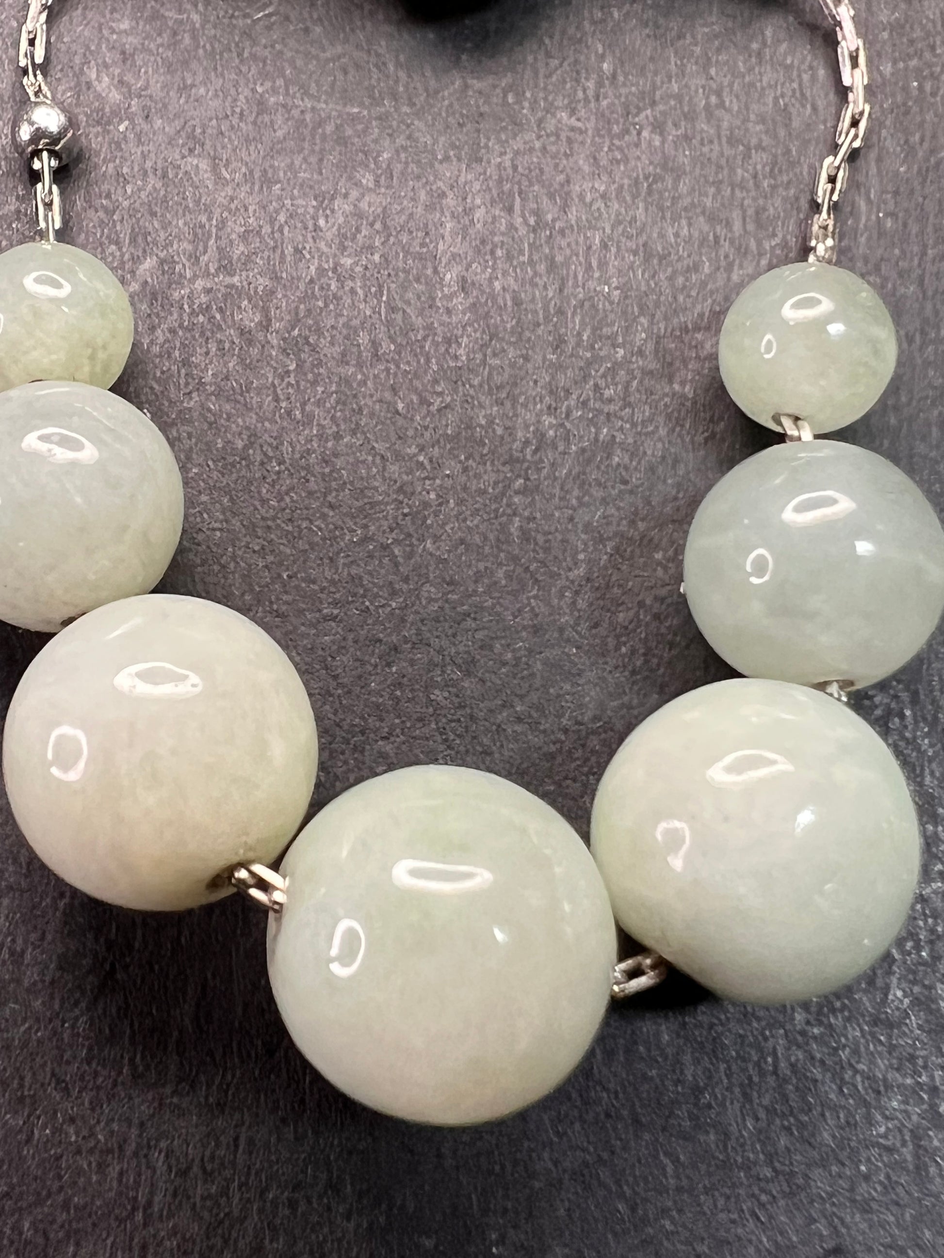Genuine graduated Burmese light green jade beads on an authentic 925 sterling silver slide chain bolo bracelet. Bracelet roughly measures close to 9 inches if I’m correct but can be adjusted smaller as little as maybe 5 inches. 925