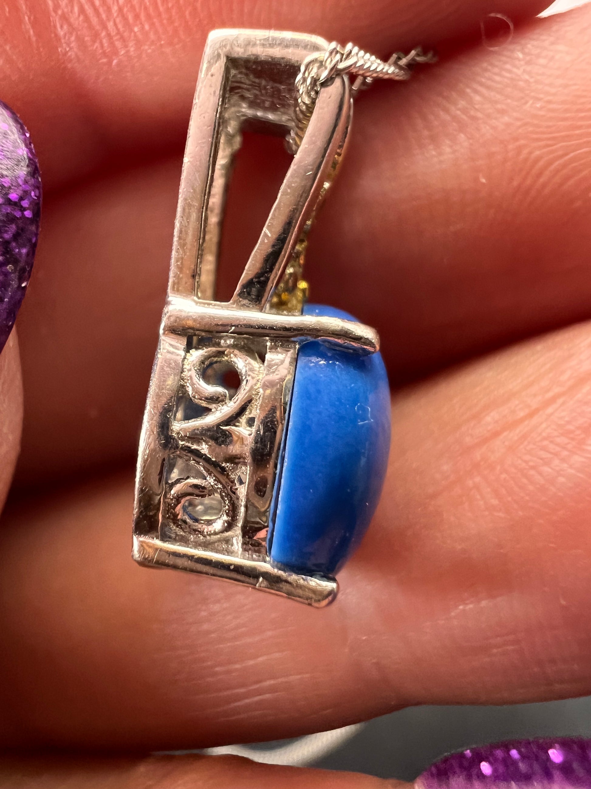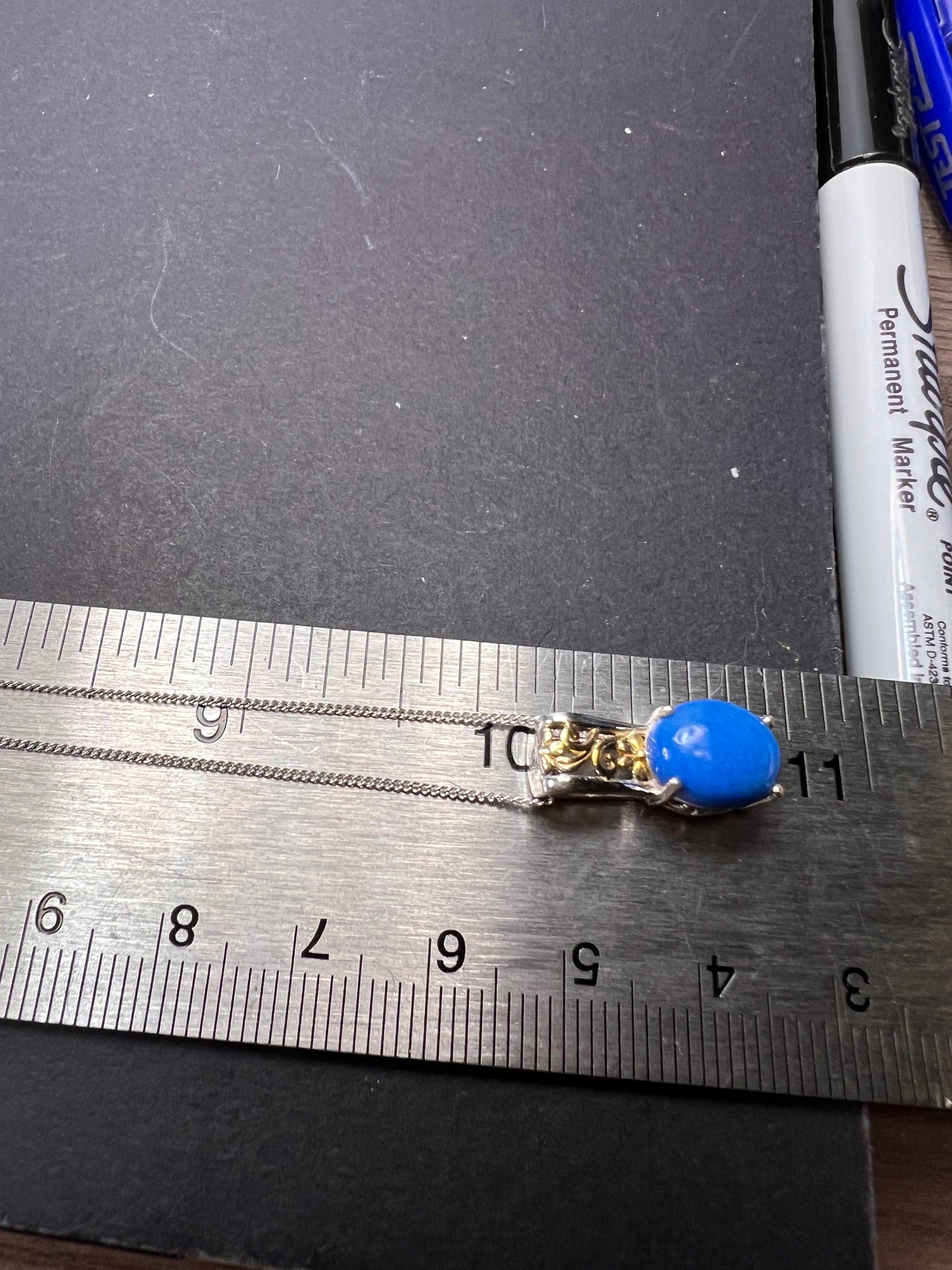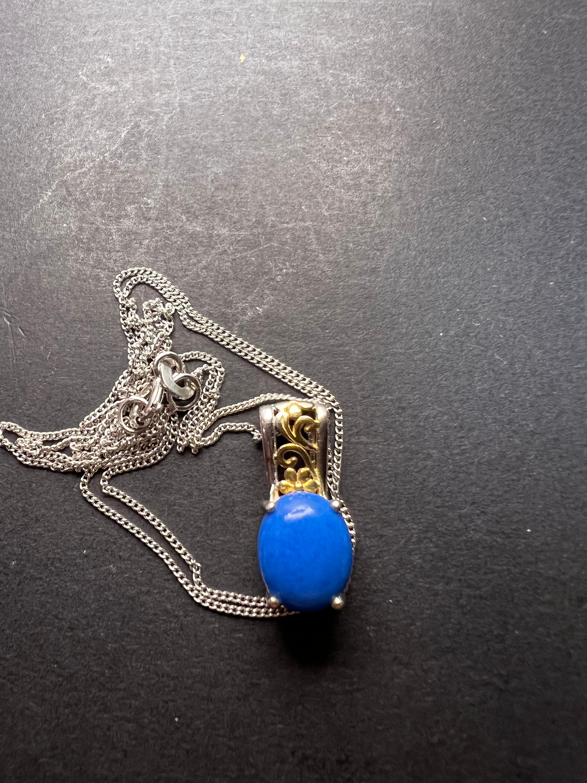 Blue stone is Ceruleite , a rare hard to find stone. Set in rhodium and 18k gold plated over sterling silver. Chain measures 18 inches.