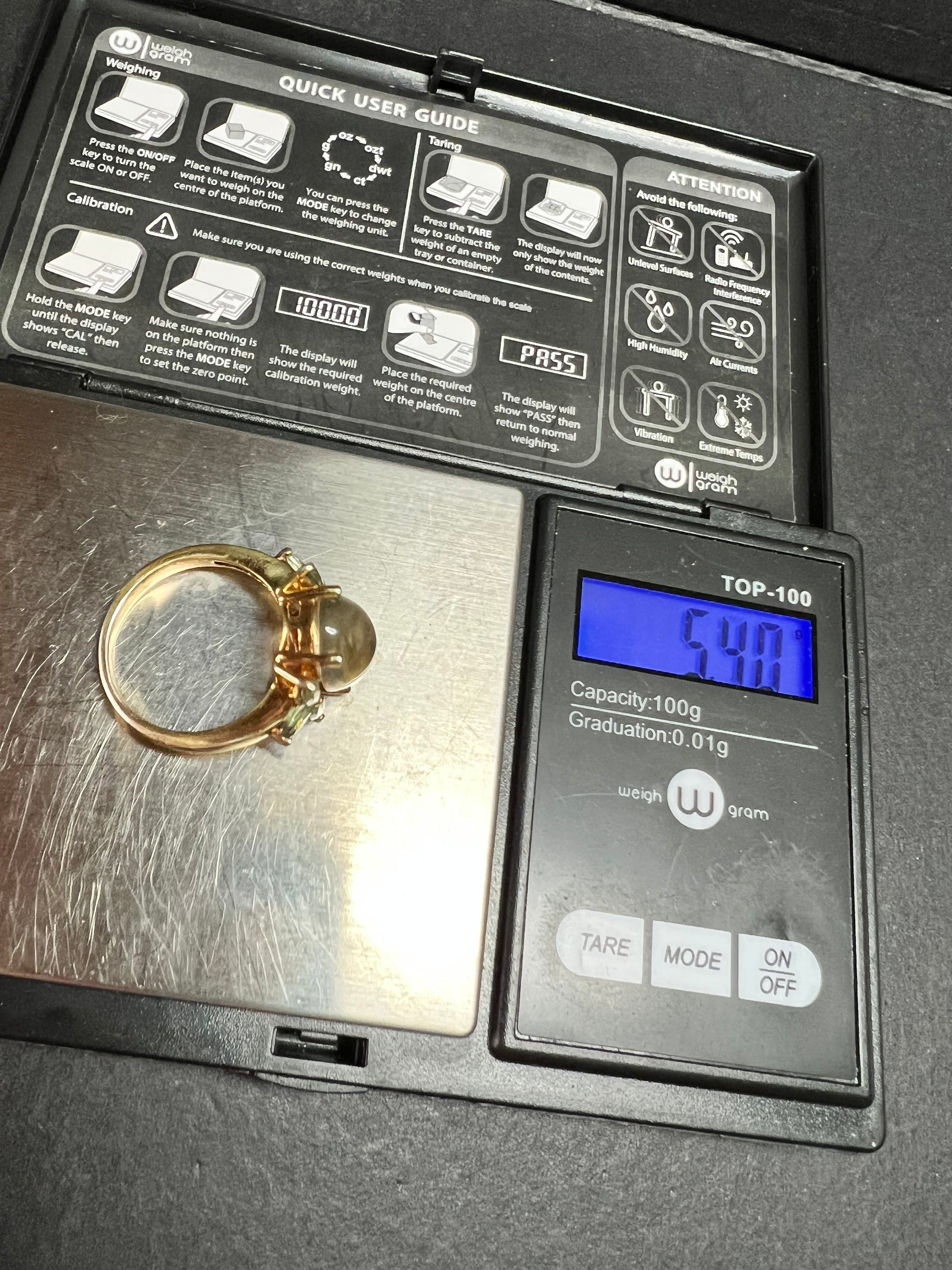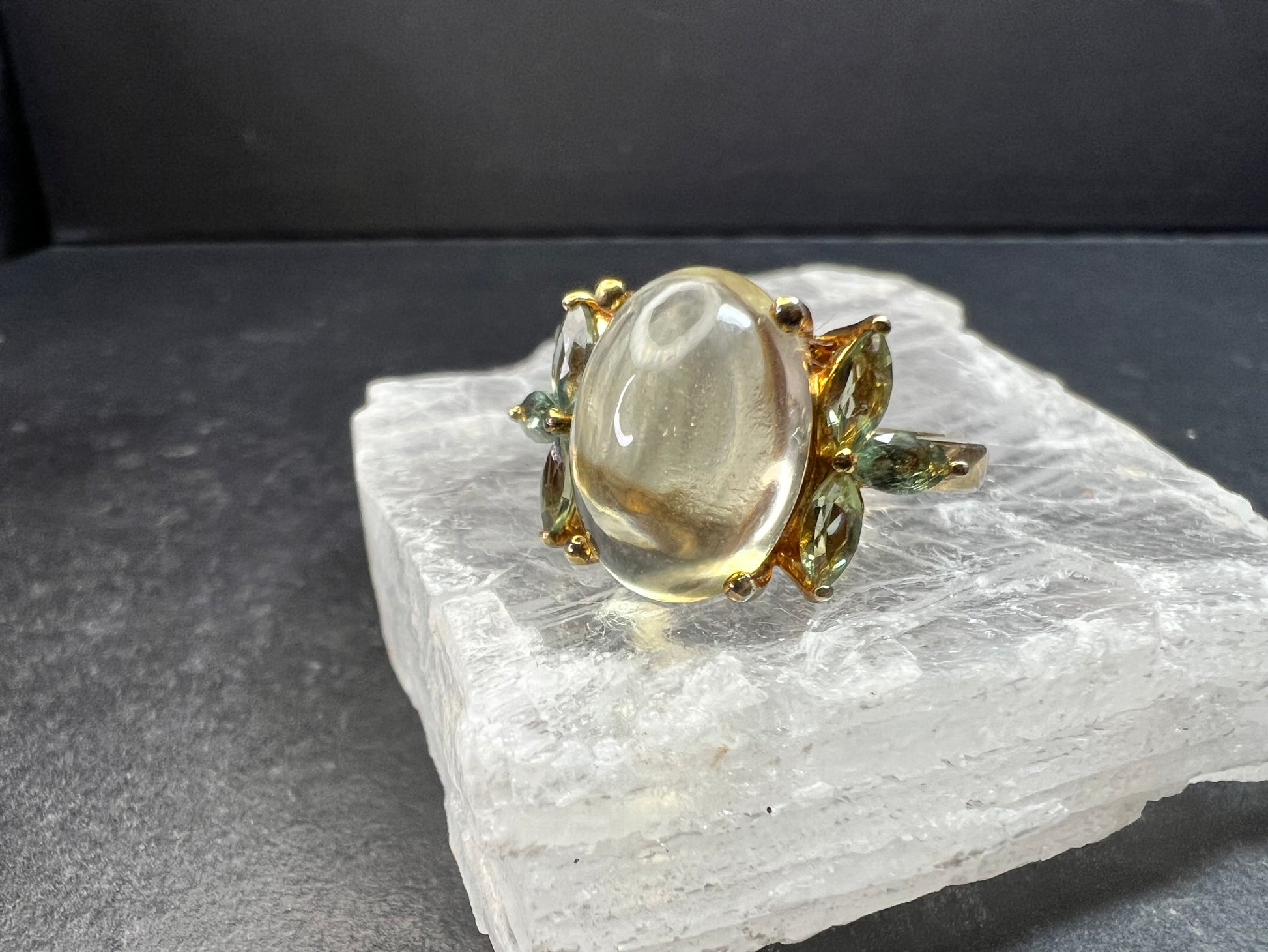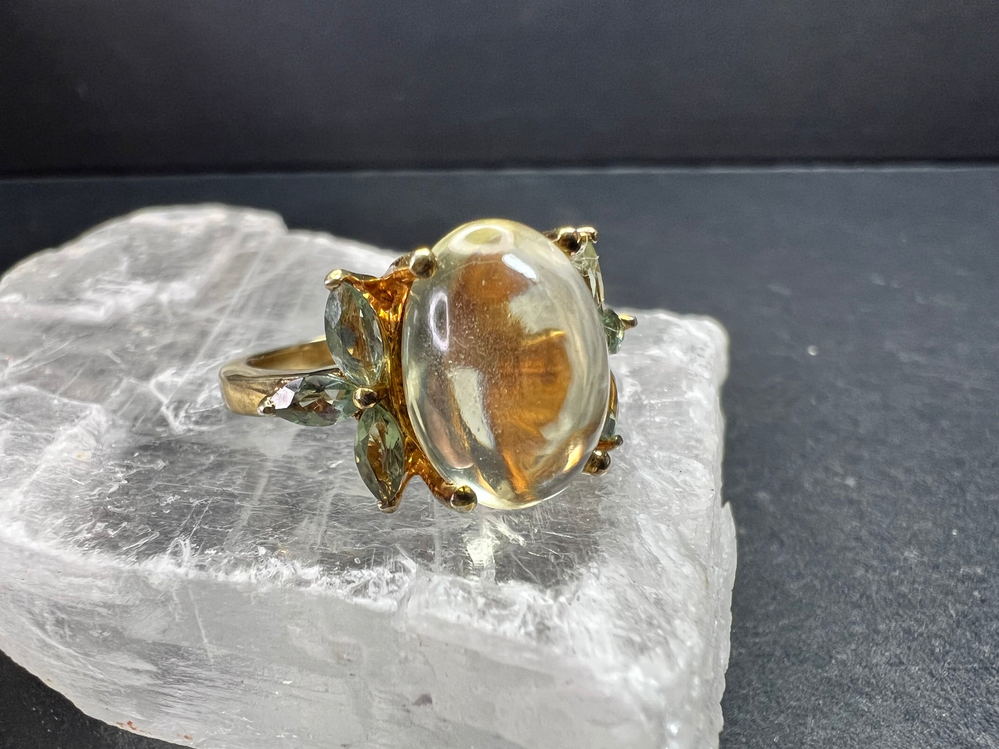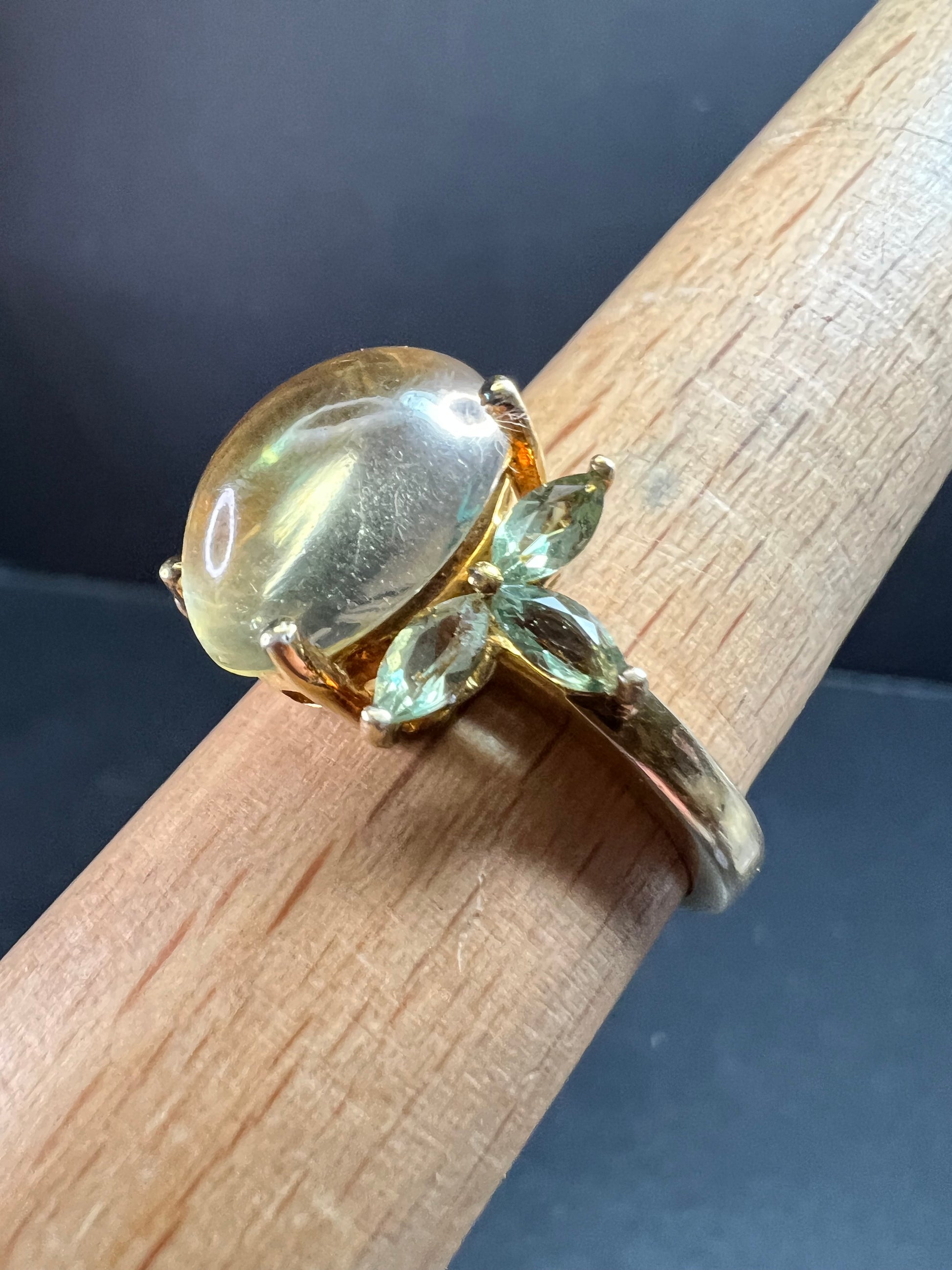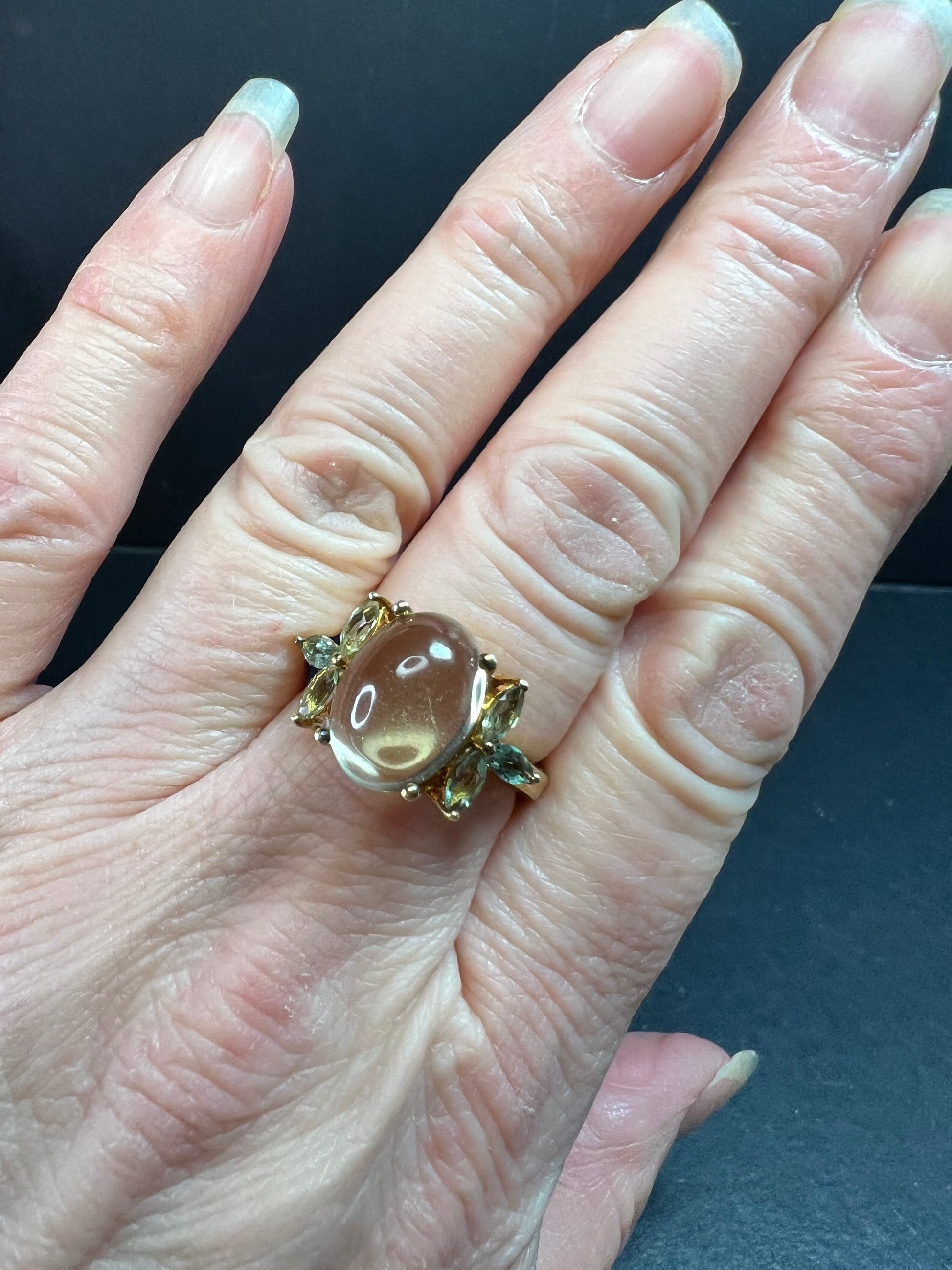 Pre owned size 9 ring crafted in 925 sterling silver with a rich yellow gold plated (vermeil style) finish. Features a large oval champagne quartz cabochon with a soft honey glow and natural internal inclusions typical of quartz, giving it depth and character in changing light. Accented with marquise cut green apatite stones in a leaf motif. Stamped 925 inside the band. Weight is approximately 5.40 grams. Substantial yet comfortable statement piece. Light surface wear consistent with normal wear. Beautiful warm tones with fresh green contrast.
