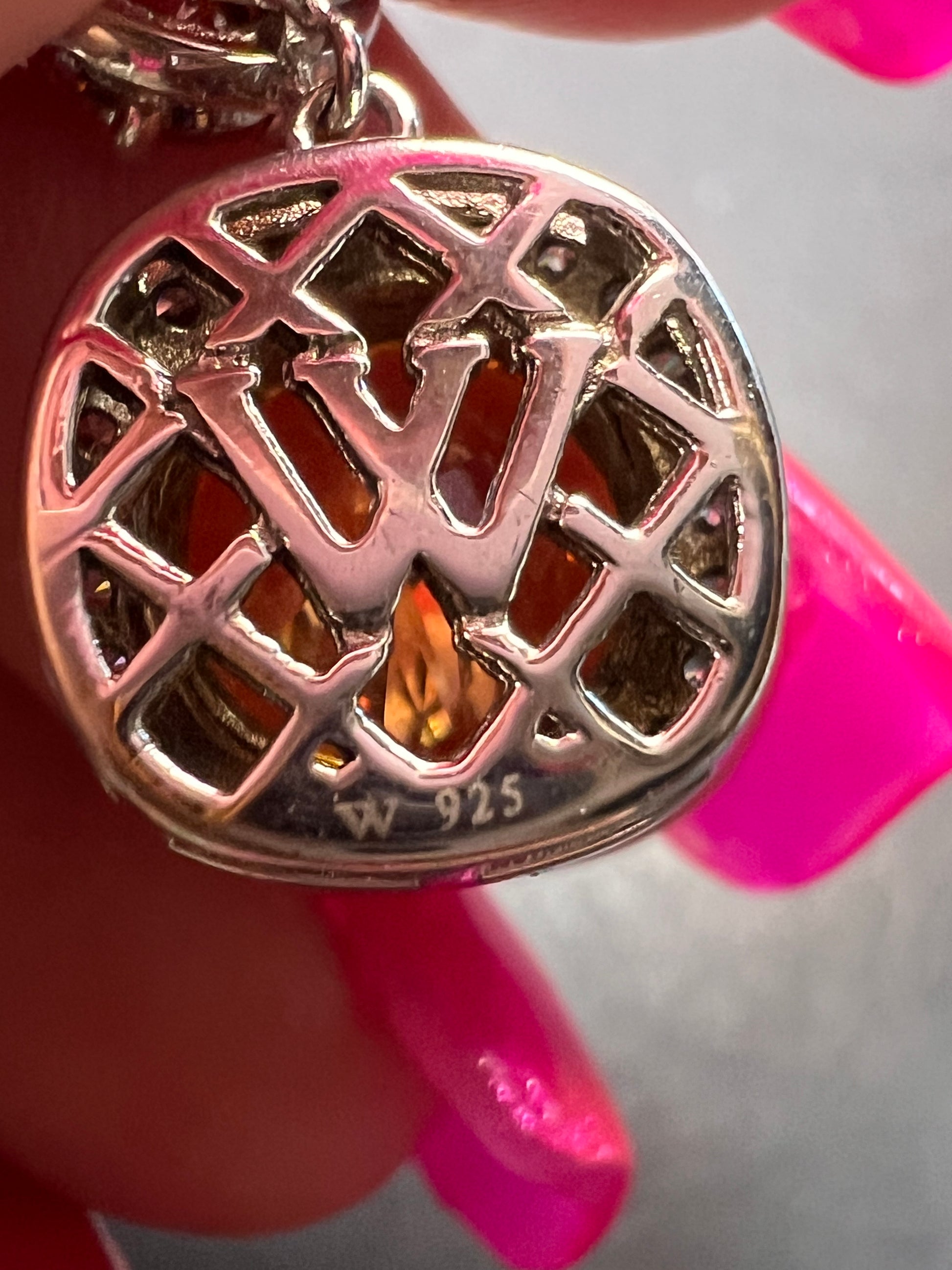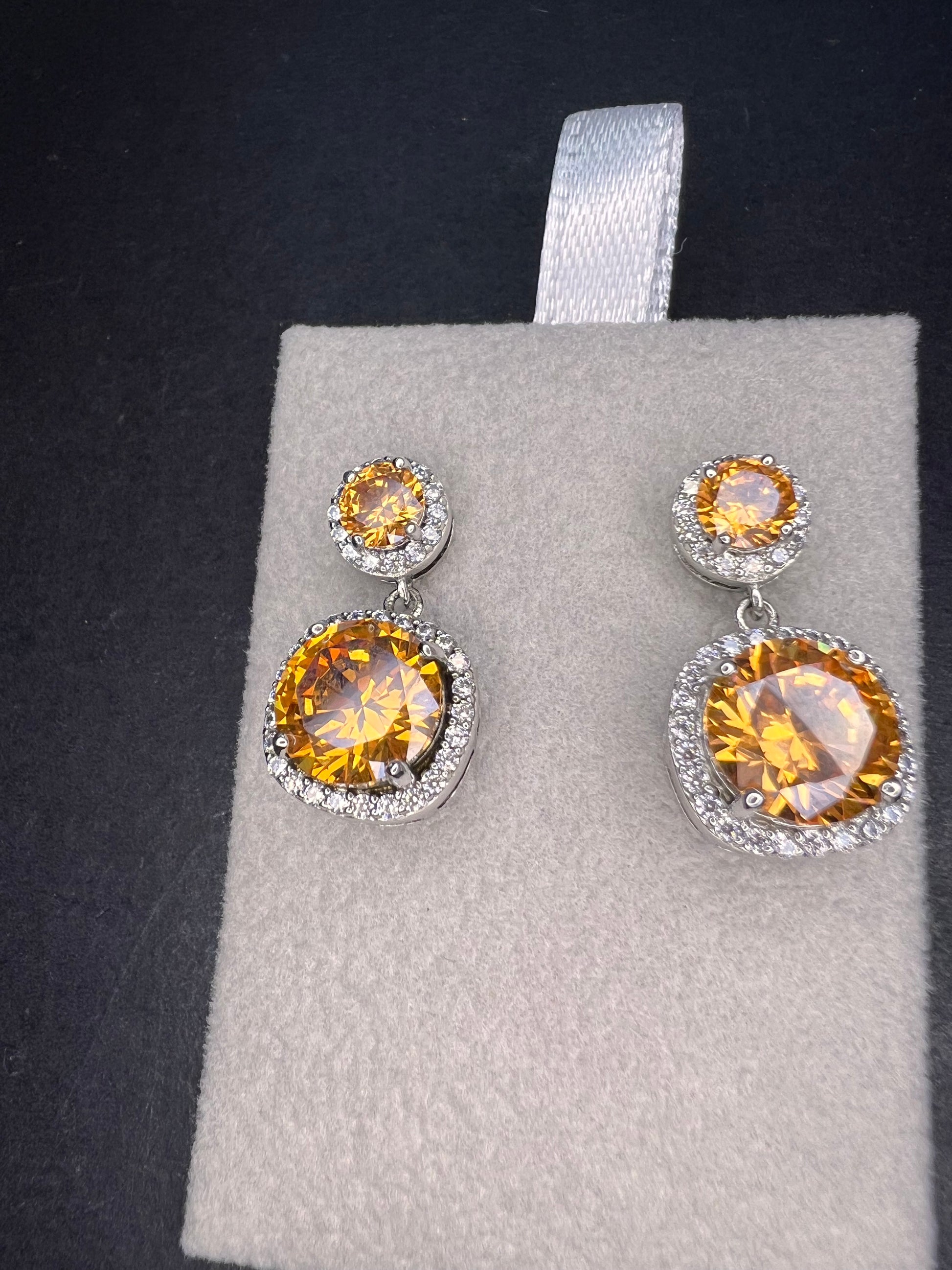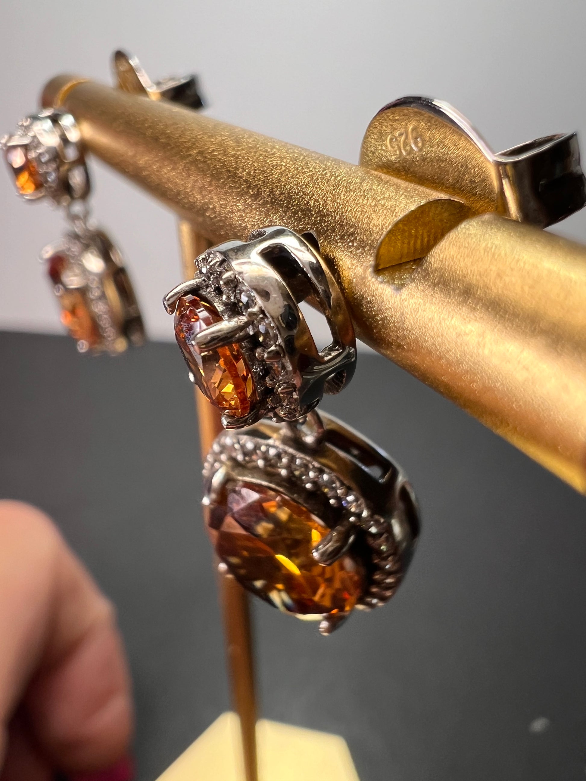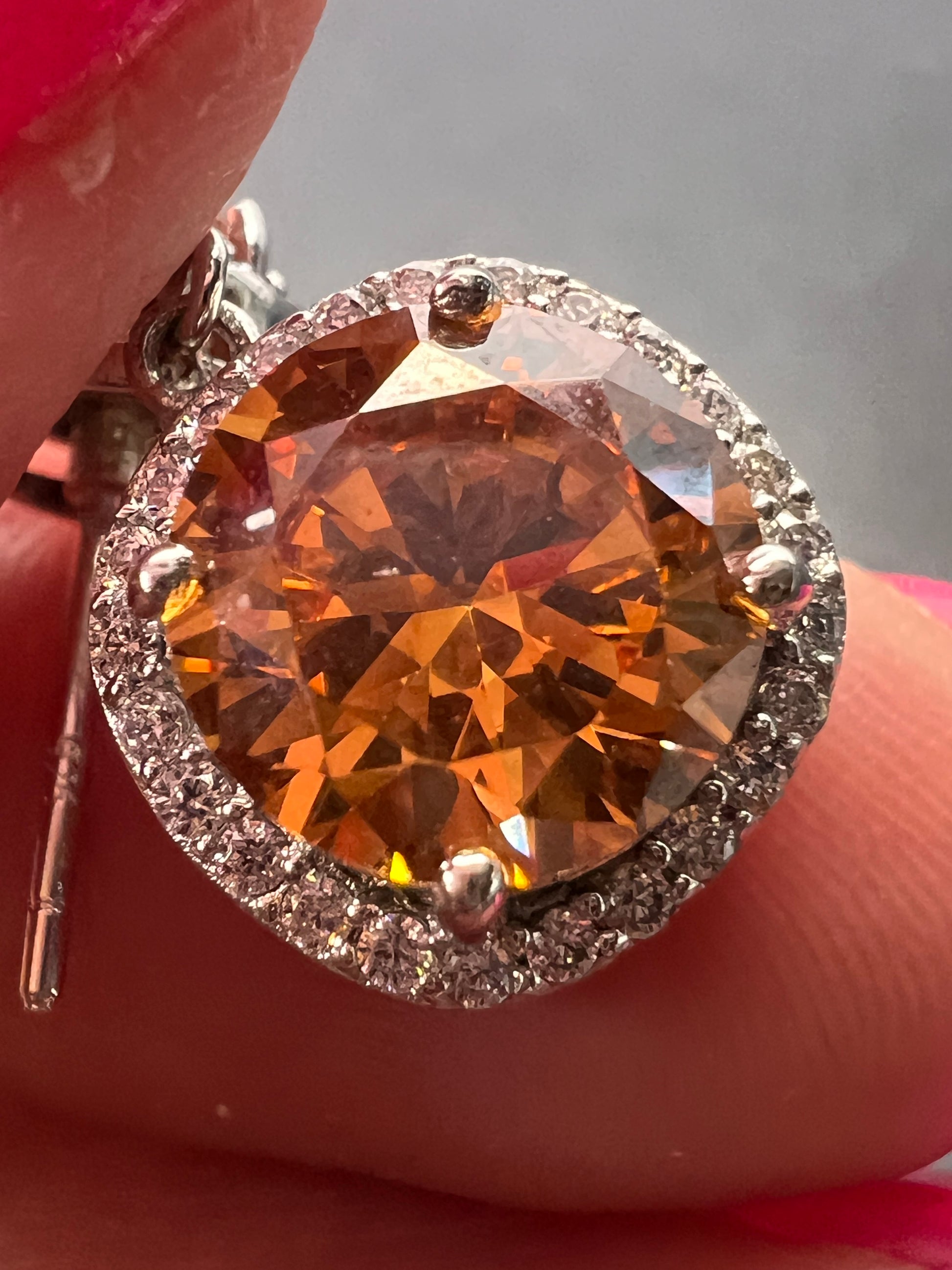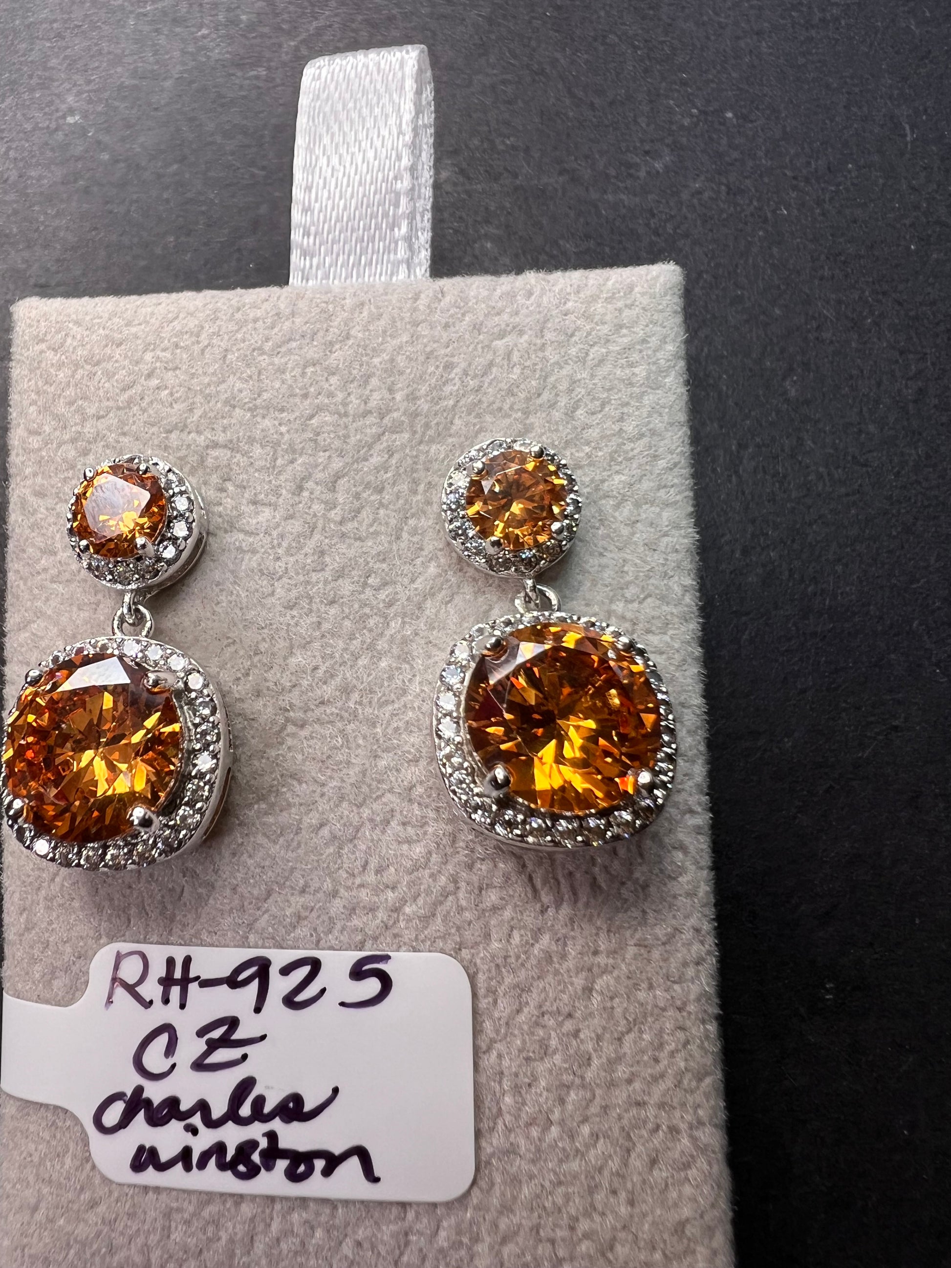 Charles Winston for Bella Luce designer cubic zirconia stones in a orangish champagne color. Set in rhodium plated over sterling silver. Posts with jumbo 925 backs