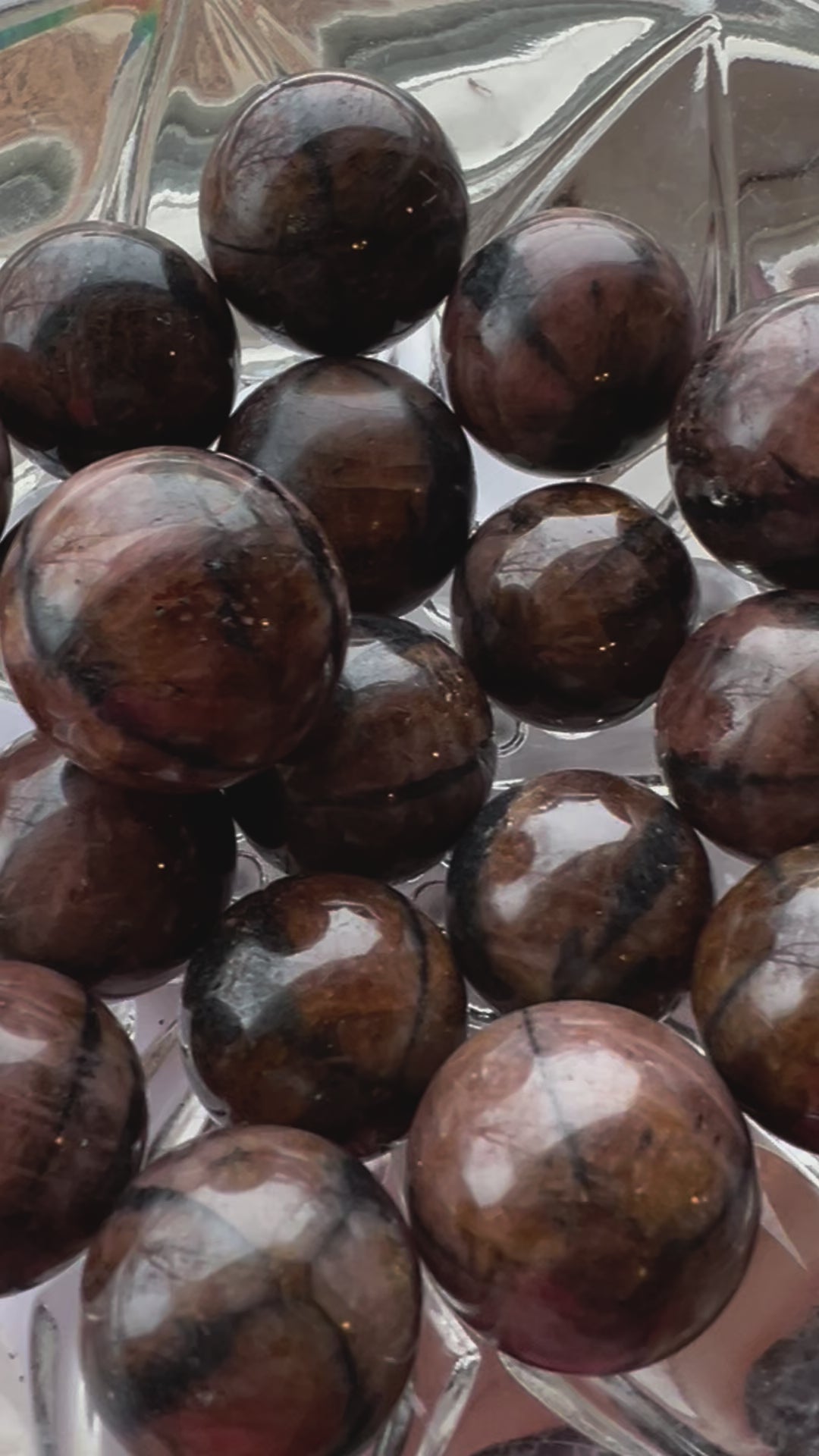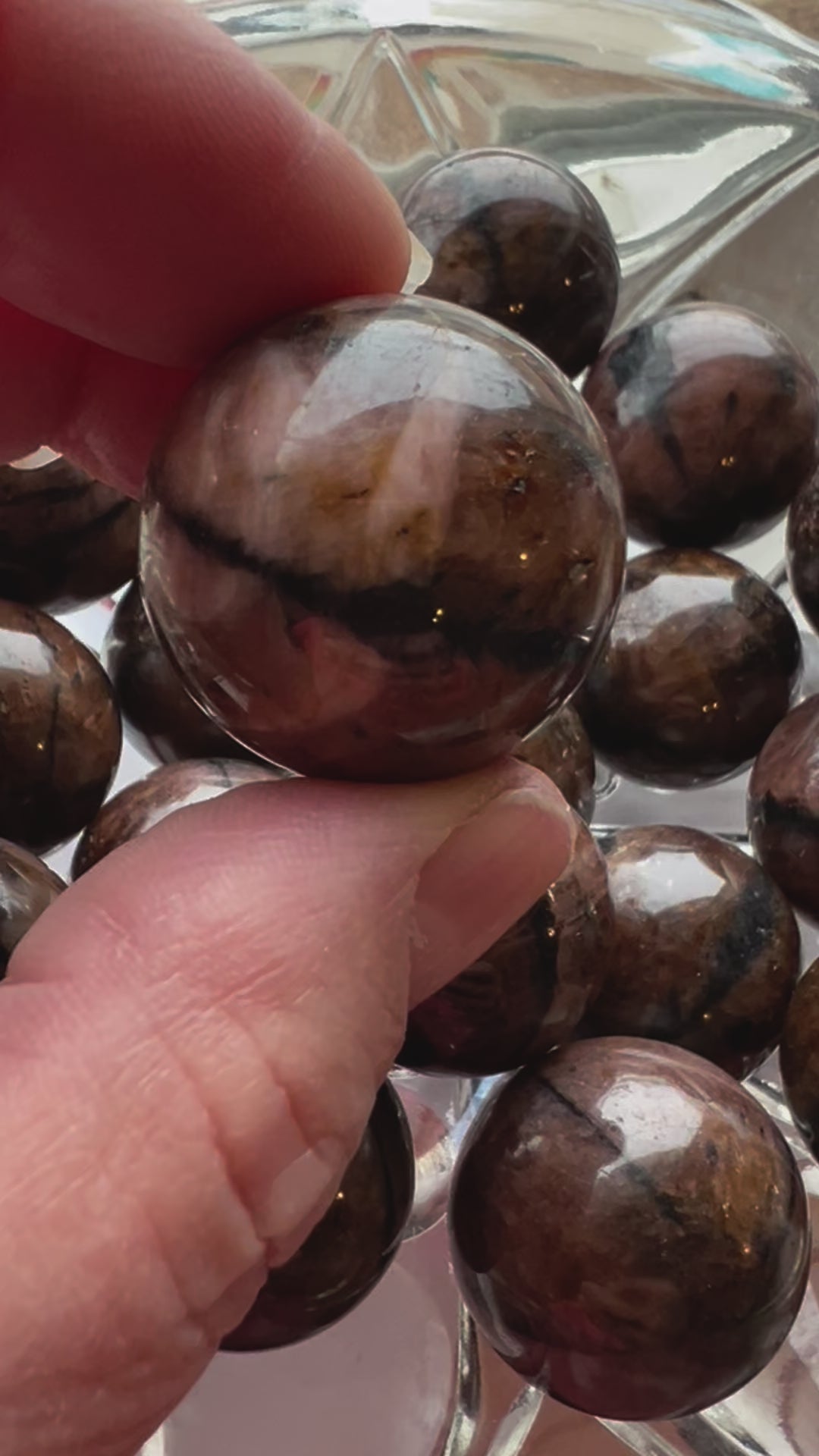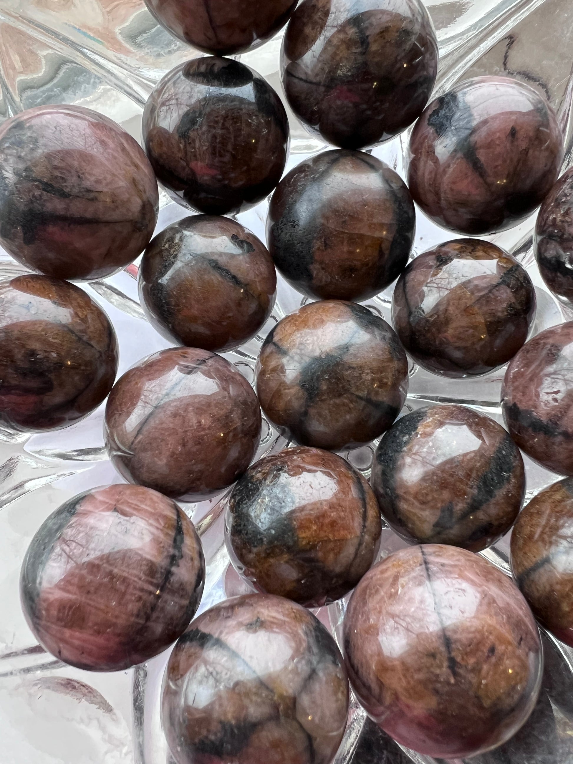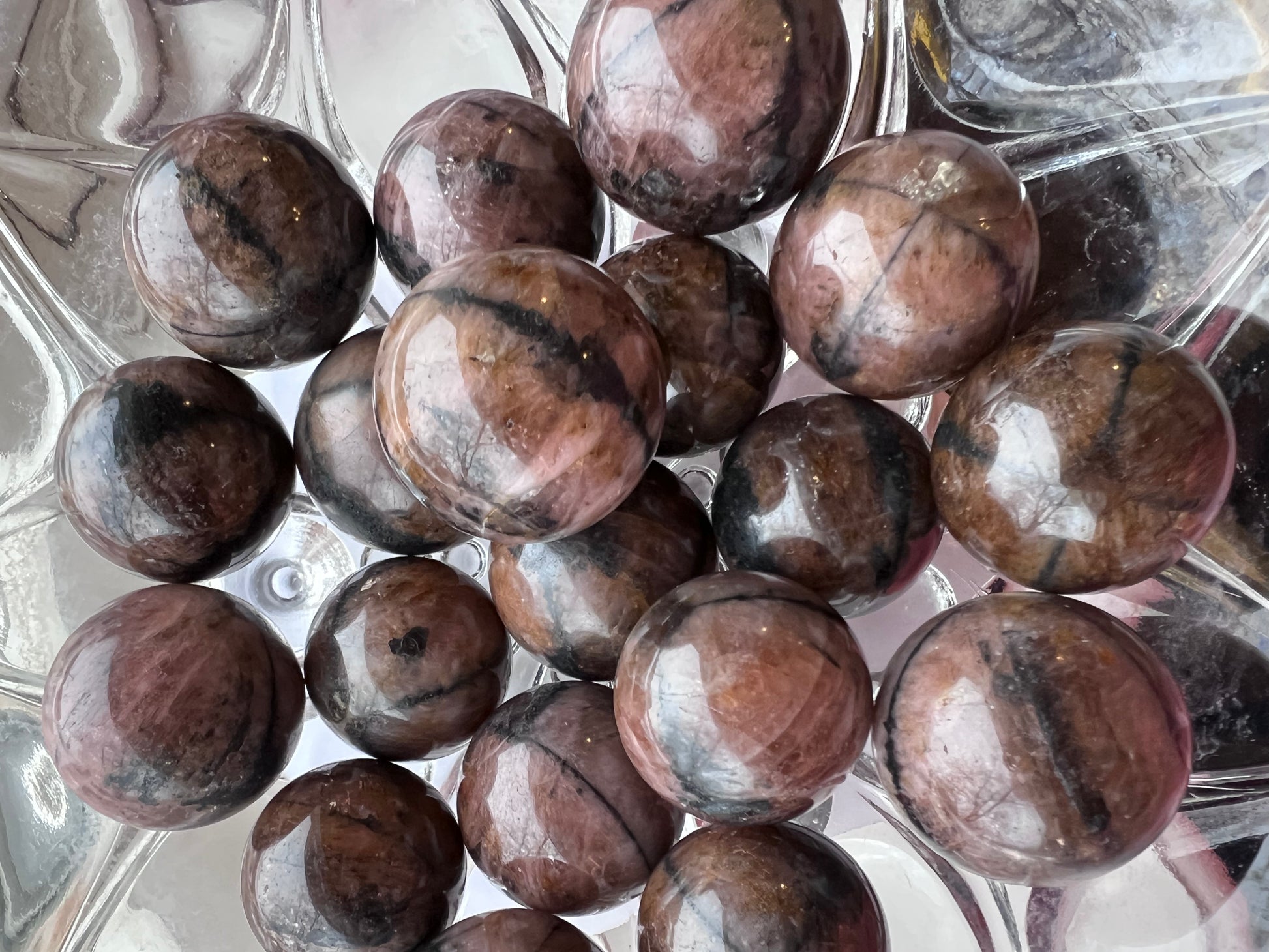 These beautiful chiastolite spheres vary in sizes that are bigger than a marble , maybe about the size of a large gumball.