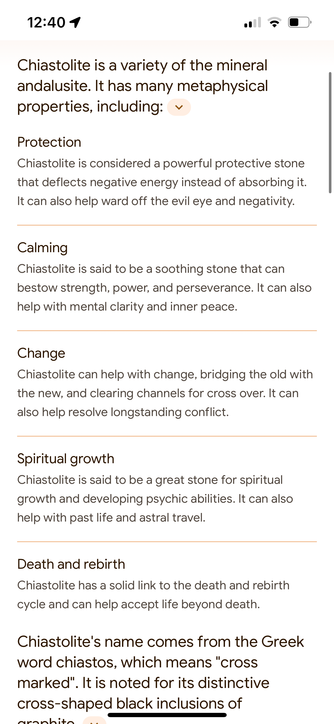chiastolite can help with protection, change , calmness, spiritual growth, death and rebirth .