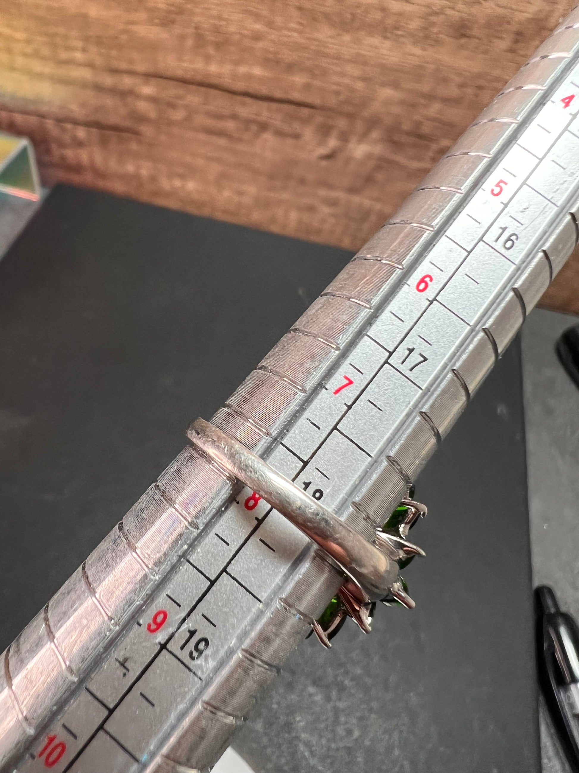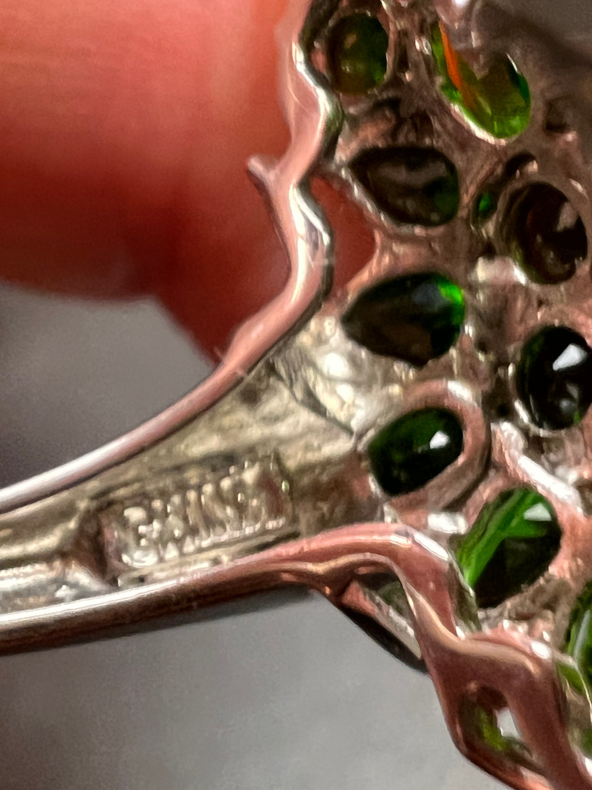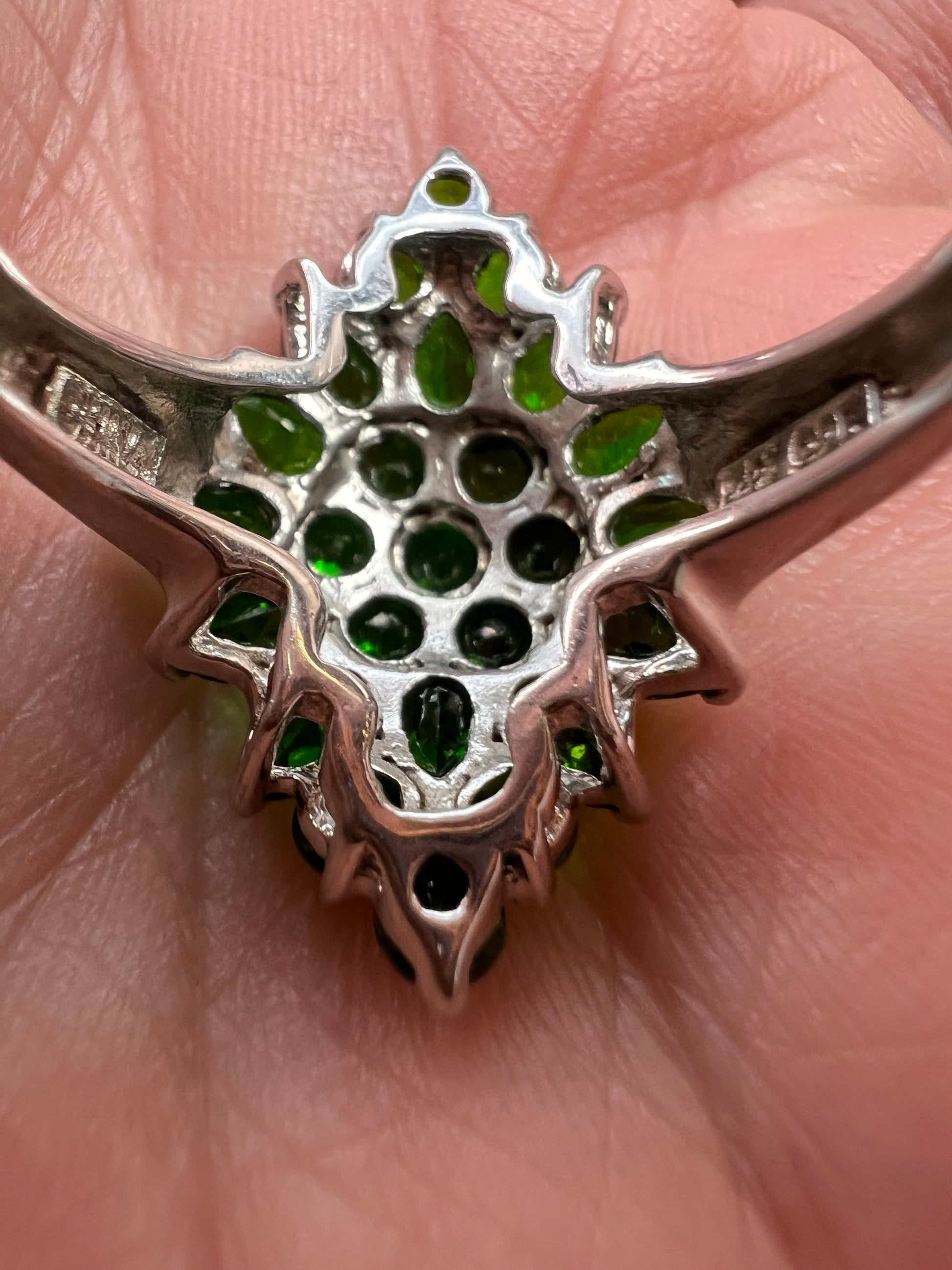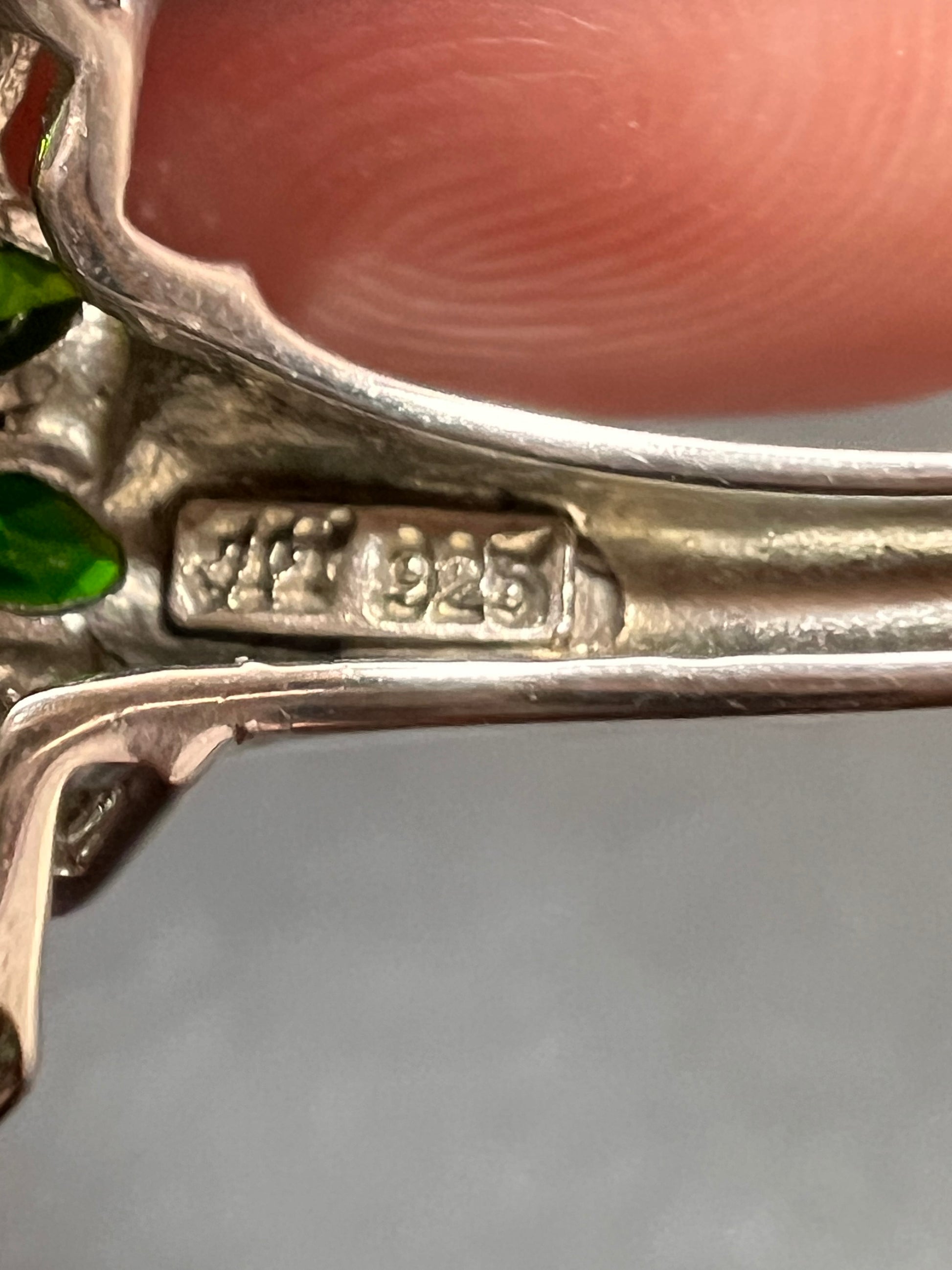 Genuine green chrome diopside gemstones prong set in authentic 925 sterling silver plated with rhodium or platinum. Unrecognizable hallmark stamp. 925 China. Measures a size 8. Total weight is 5.12 grams