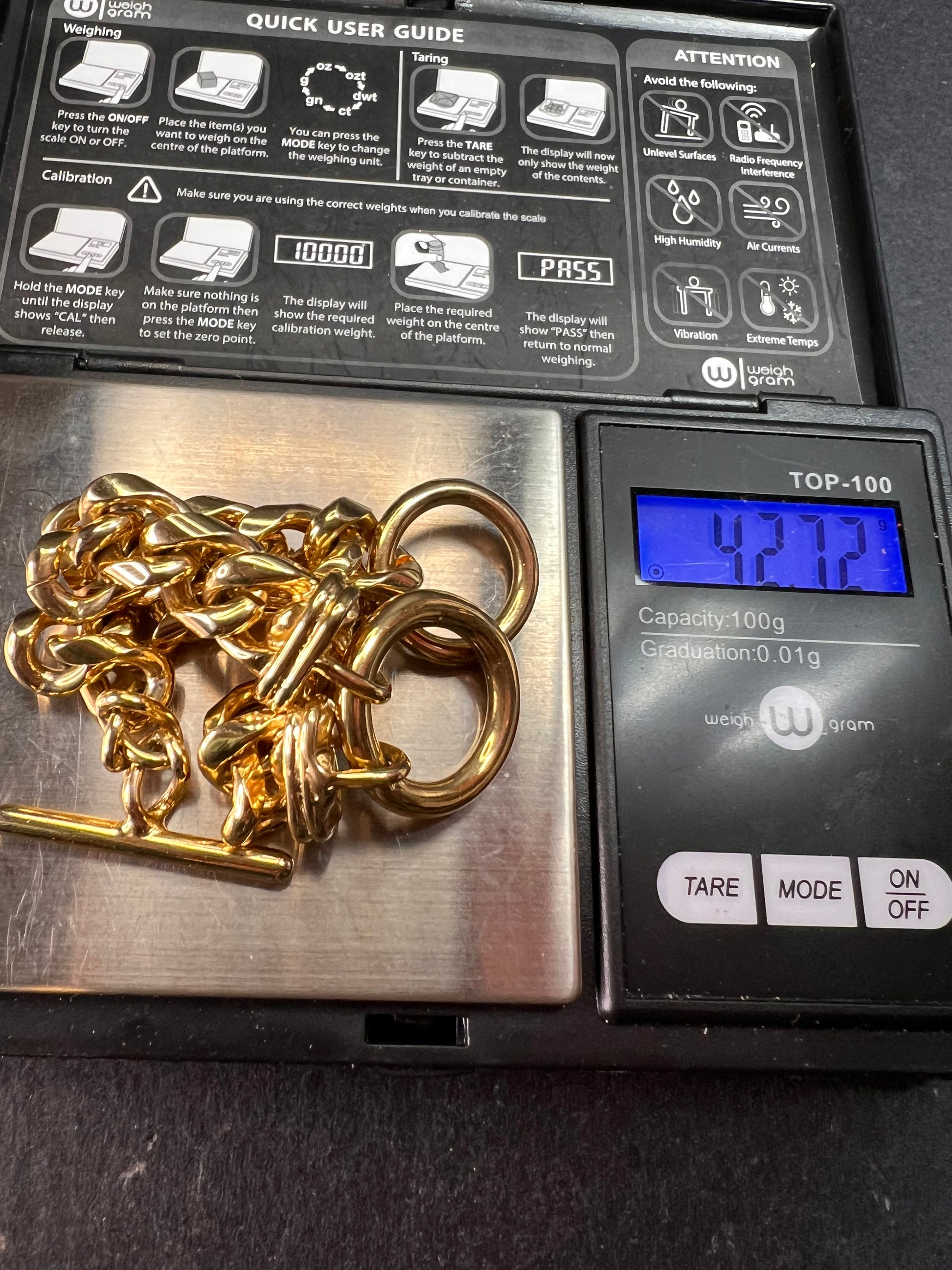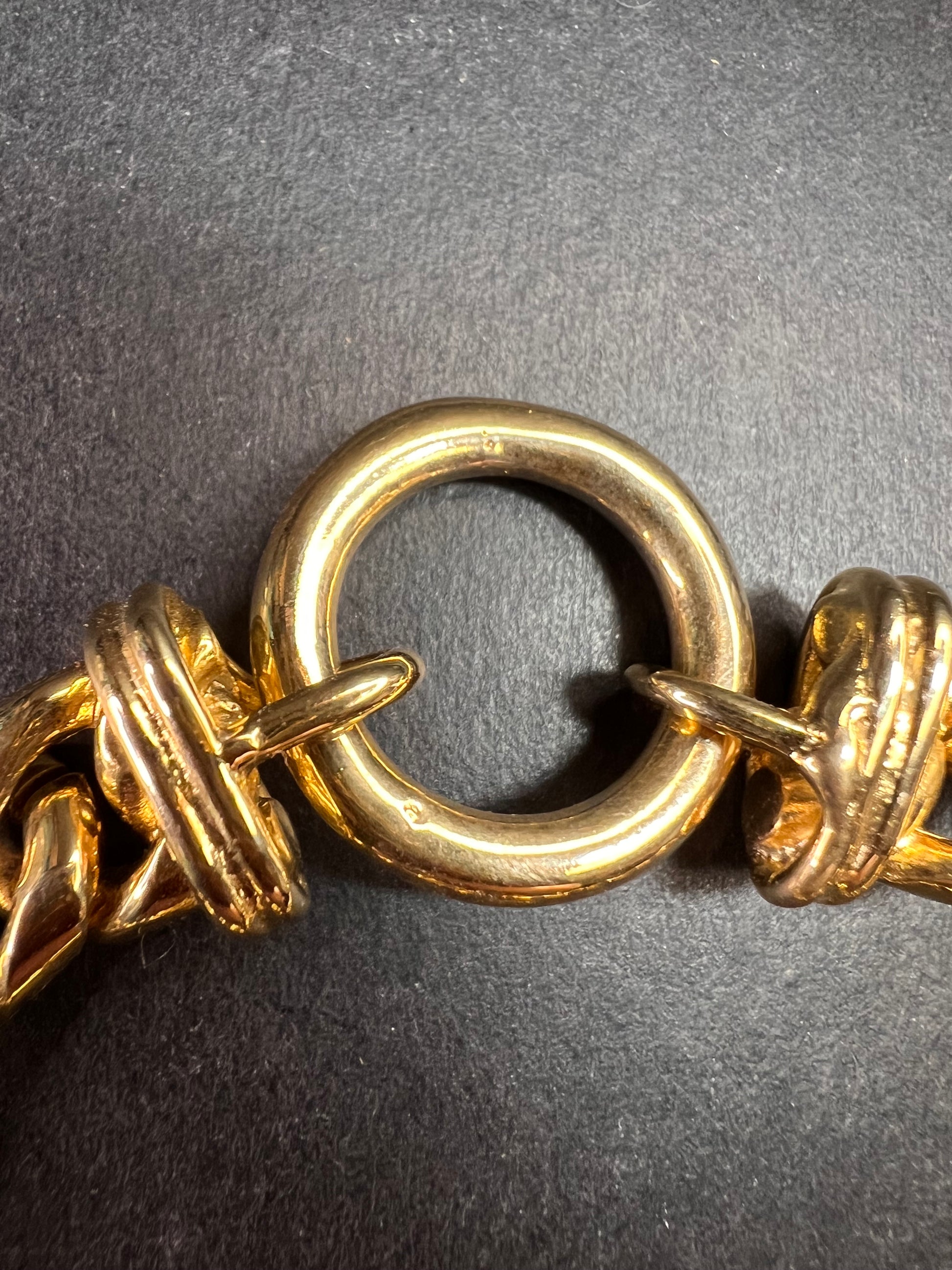 This substantial pre-owned costume bracelet features a bold, chunky curb chain design in a bright gold tone. A prominent O-ring loop acts as a stylish accent next to the secure toggle bar clasp, creating a very modern and versatile look.