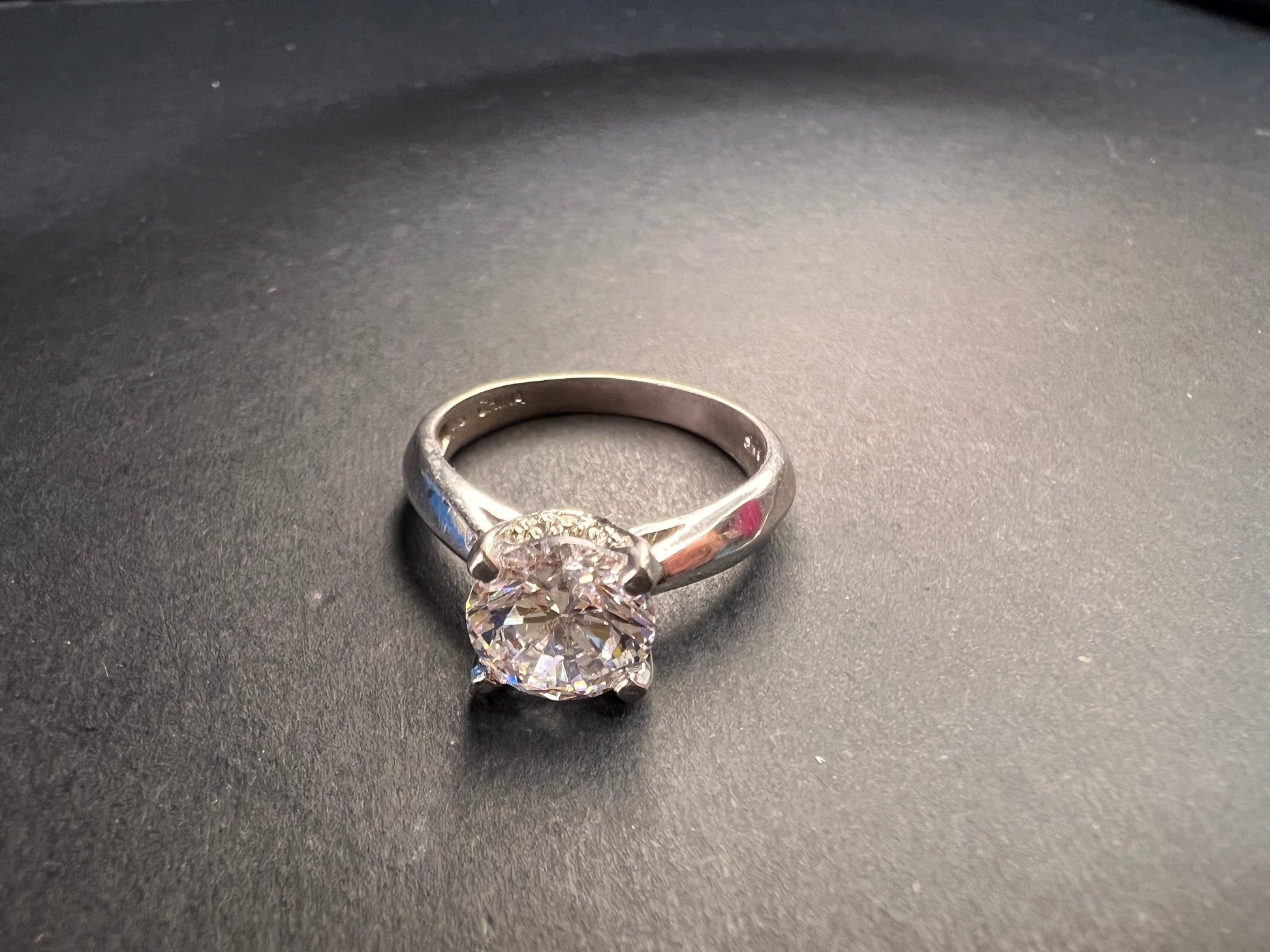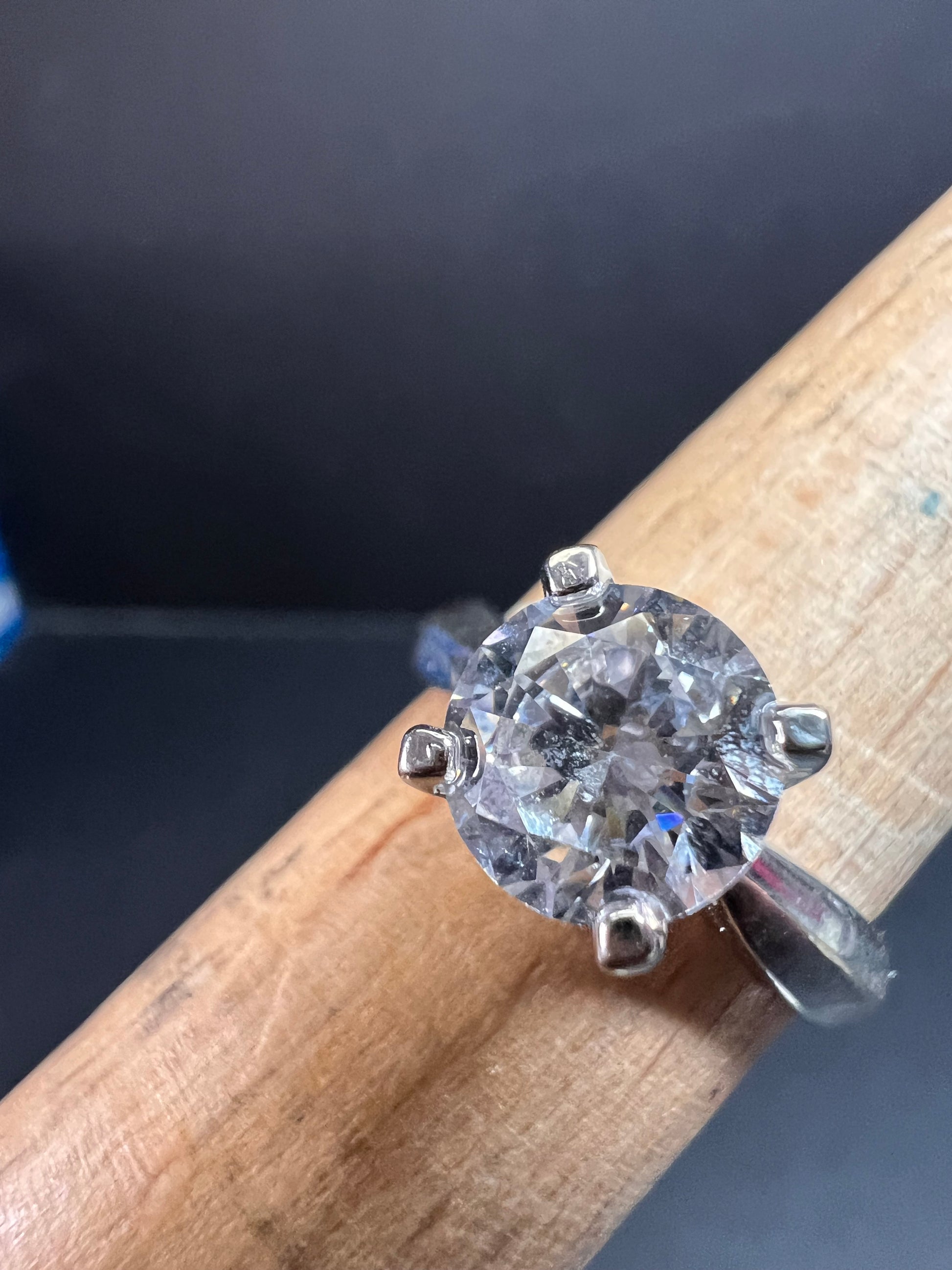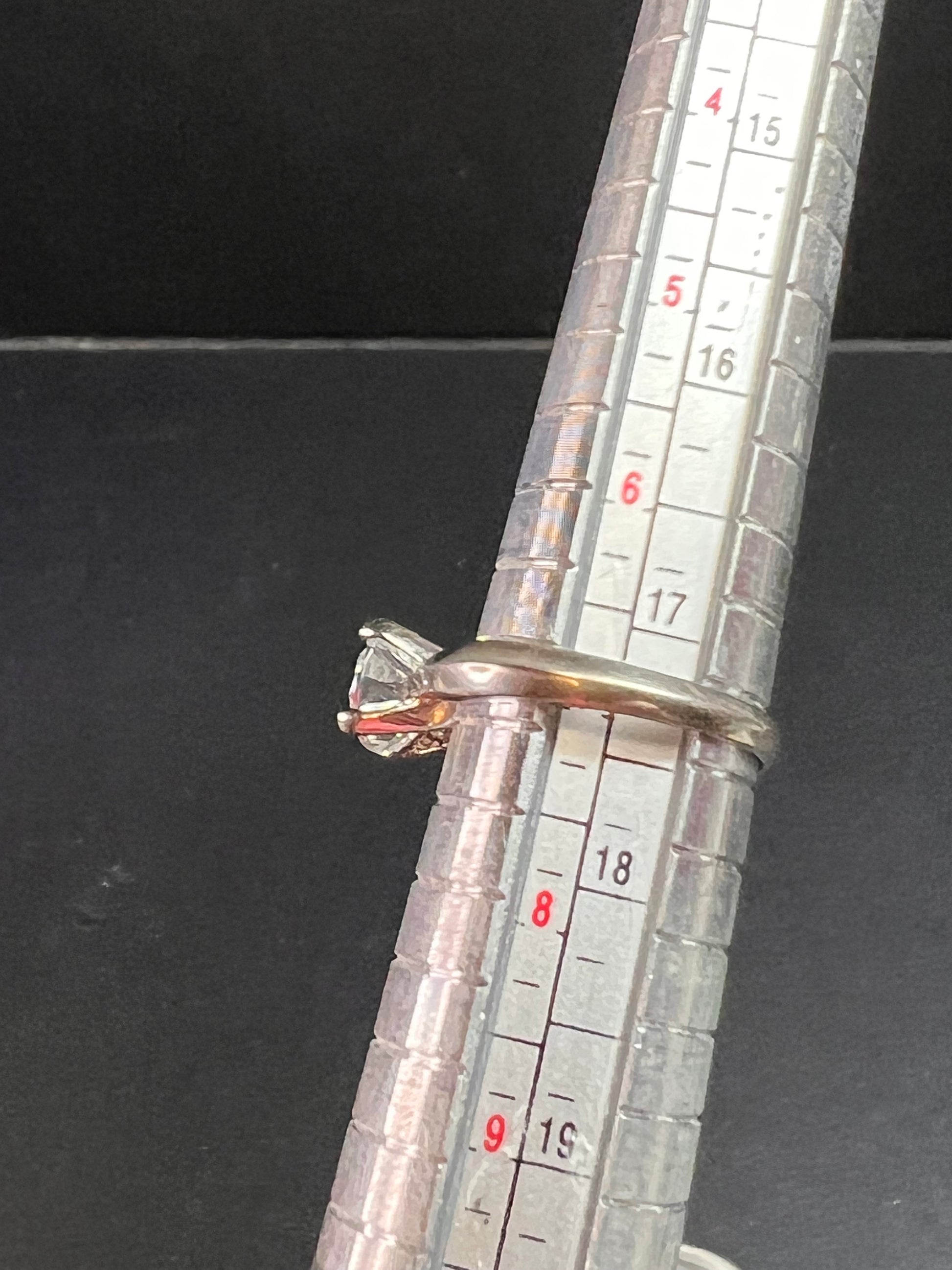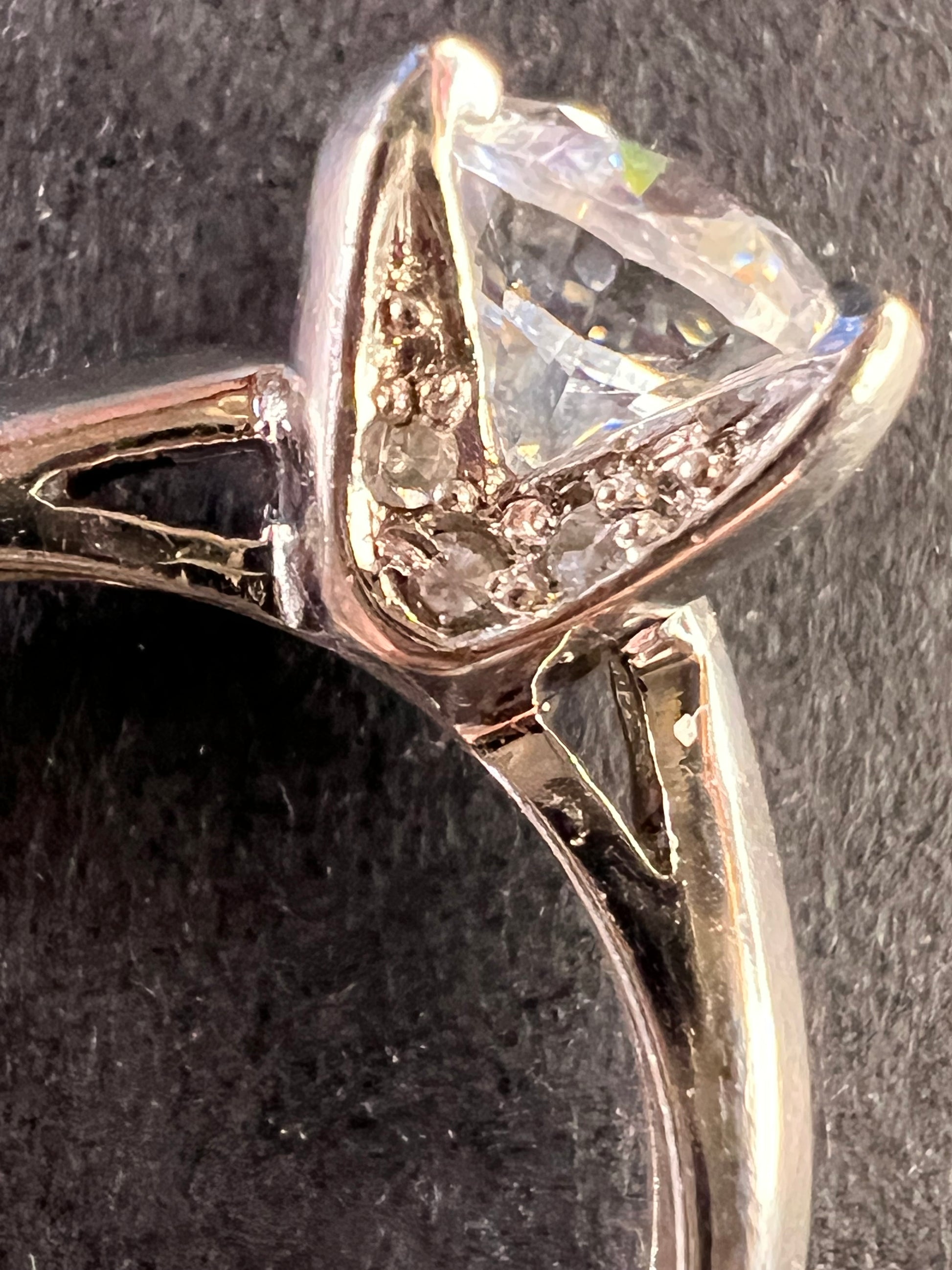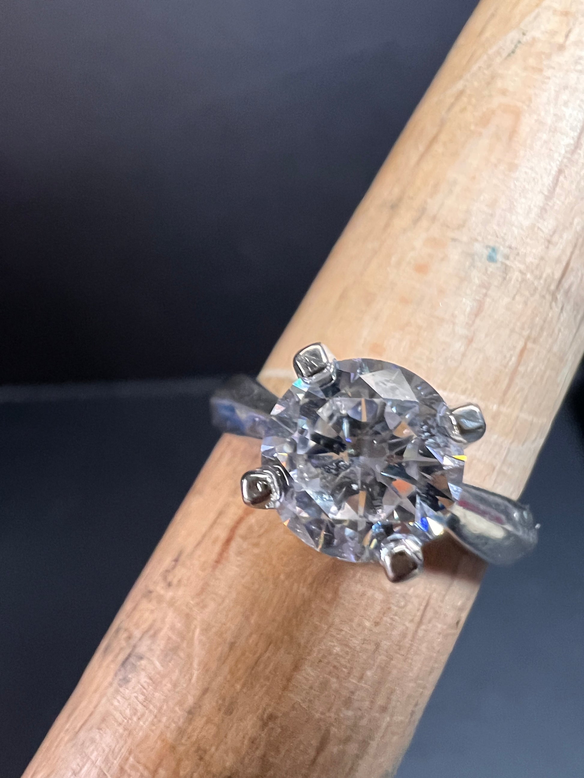 White/ colorless cubic zirconia gemstone prong set in a solitaire sterling silver setting that’s most likely played with rhodium or white gold. Tiny white accent stones at the base test as CZ also. Measures a size 7. 925 RP China. Stone measures about 8 mm in diameter. About 2ctw diamond equivalent