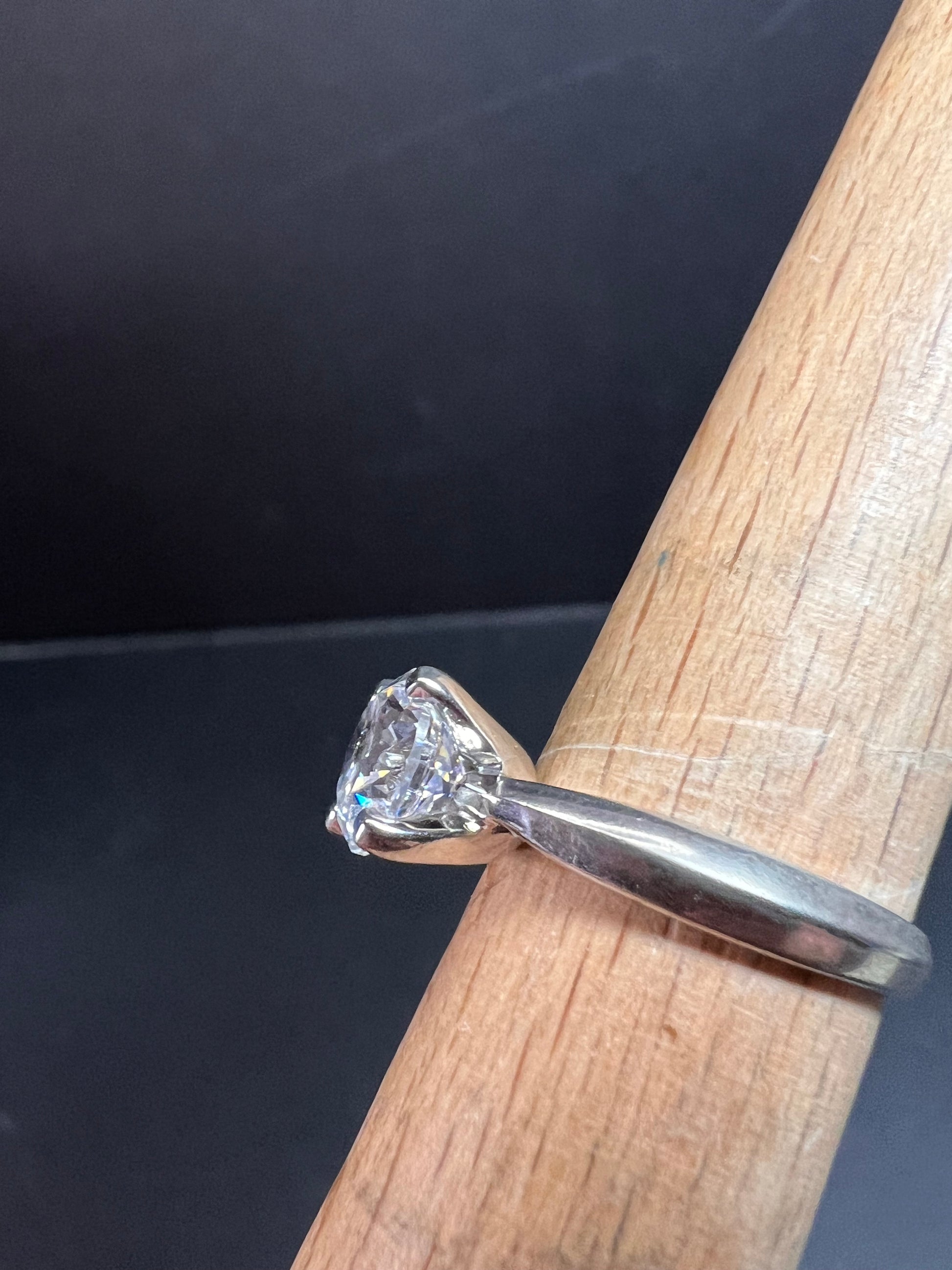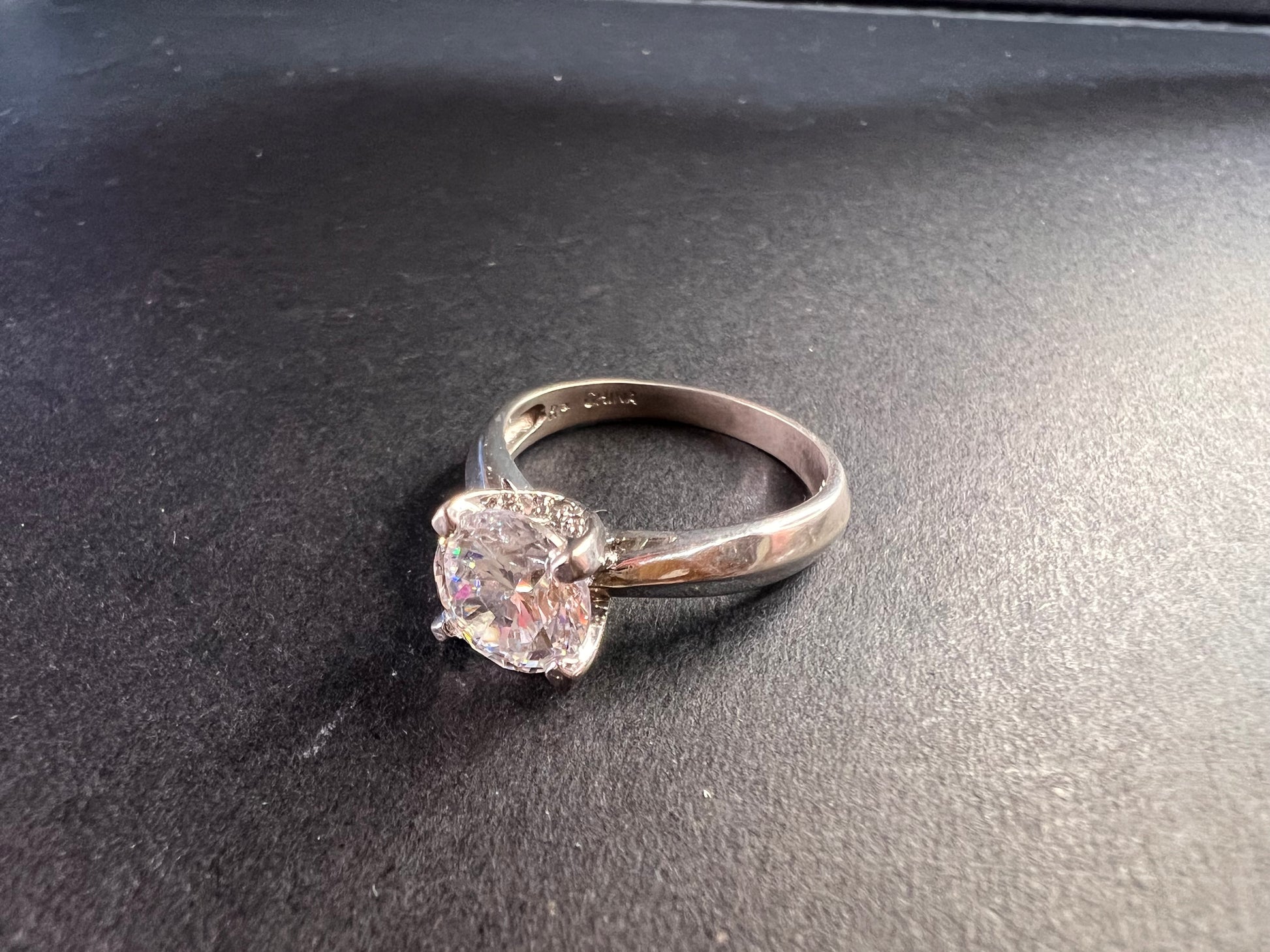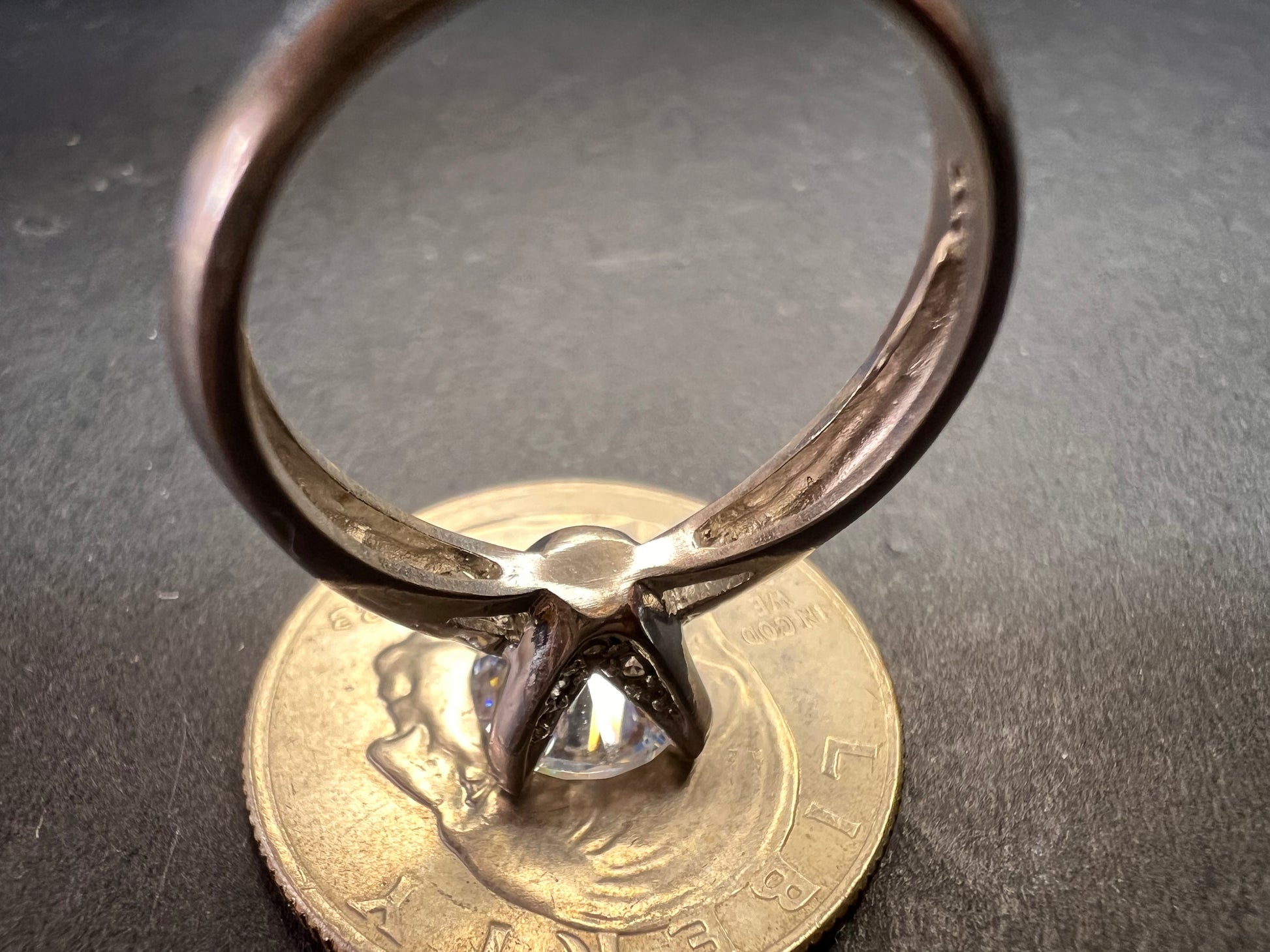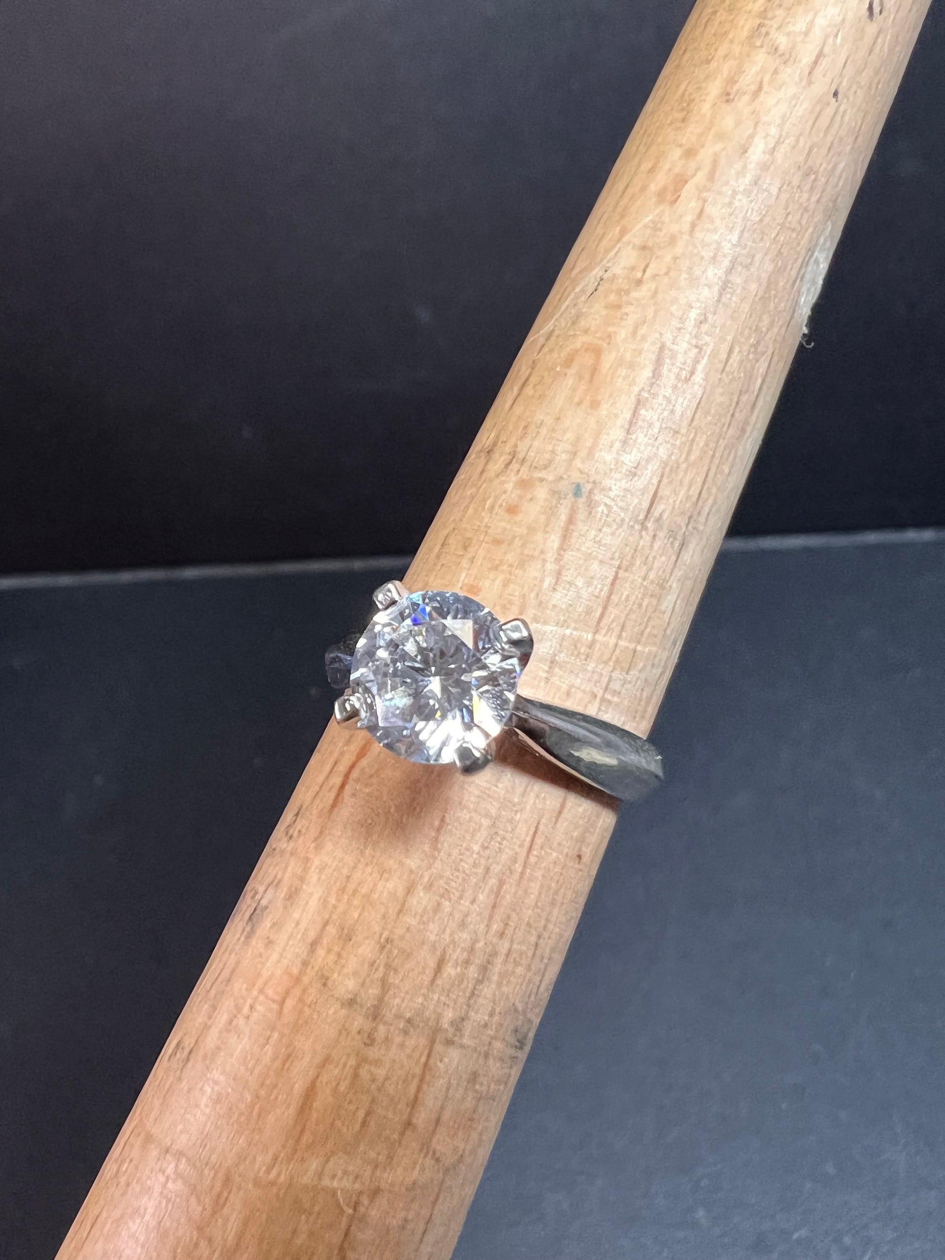 White/ colorless cubic zirconia gemstone prong set in a solitaire sterling silver setting that’s most likely played with rhodium or white gold. Tiny white accent stones at the base test as CZ also. Measures a size 7. 925 RP China. Stone measures about 8 mm in diameter. About 2ctw diamond equivalent