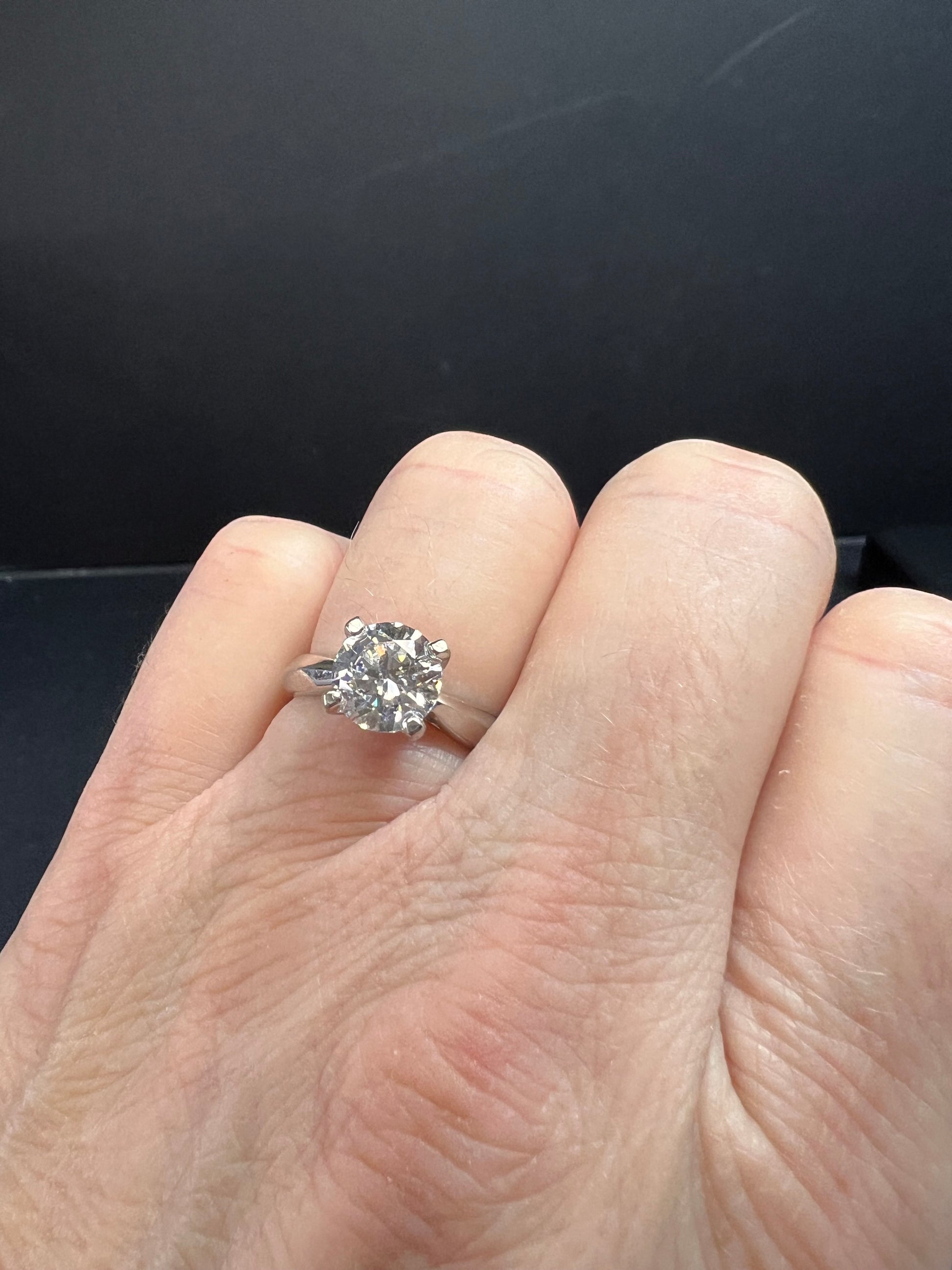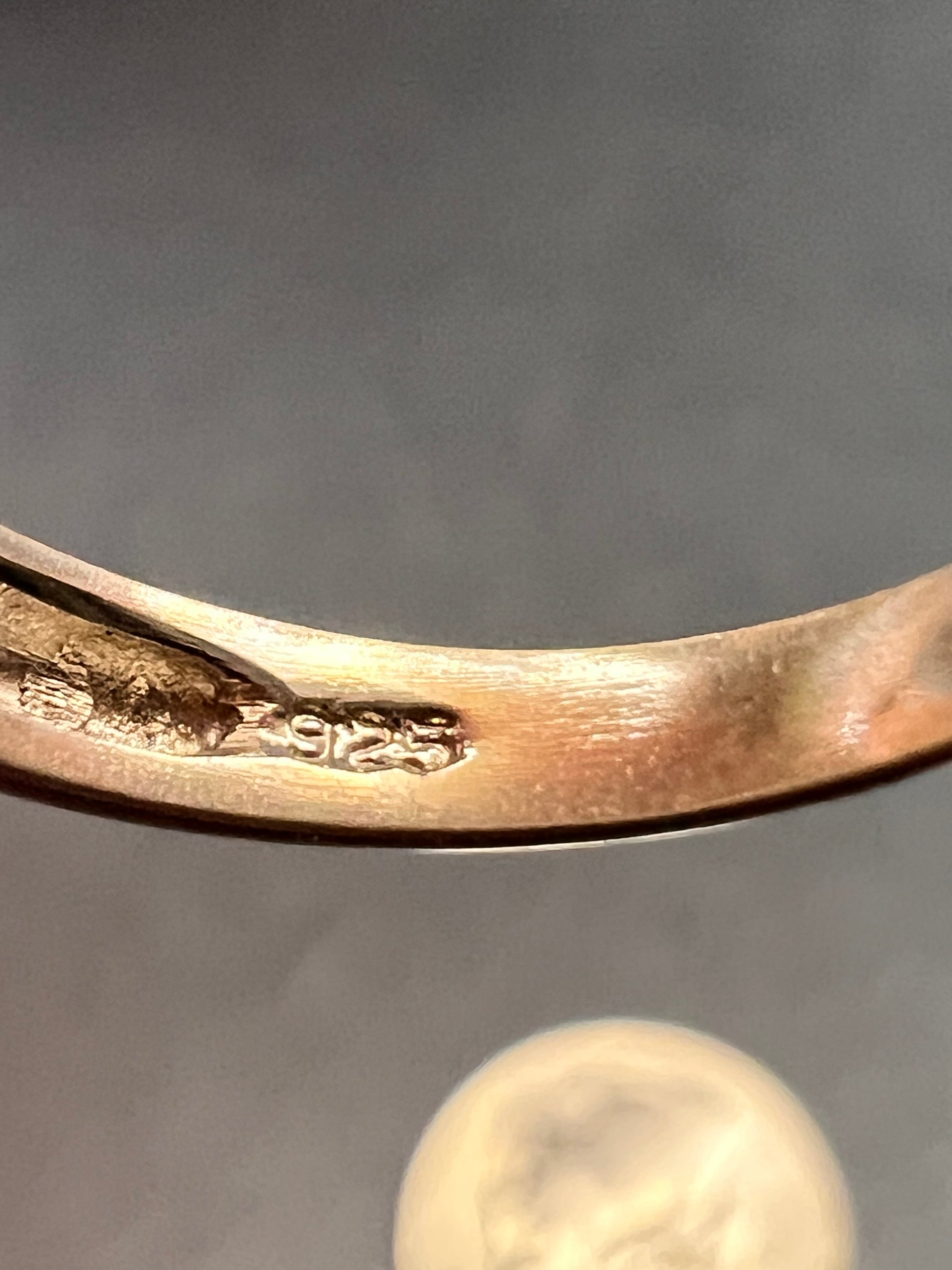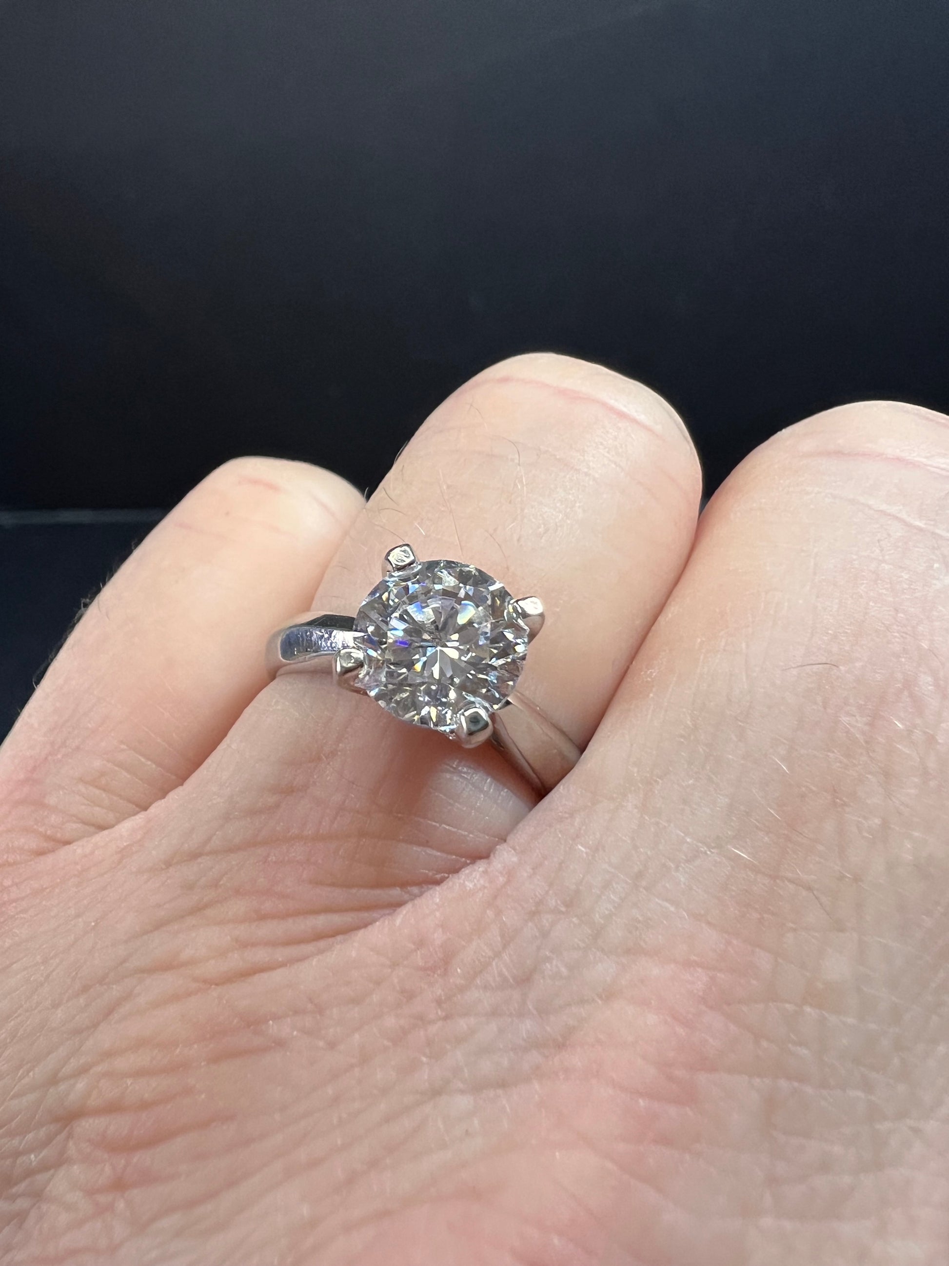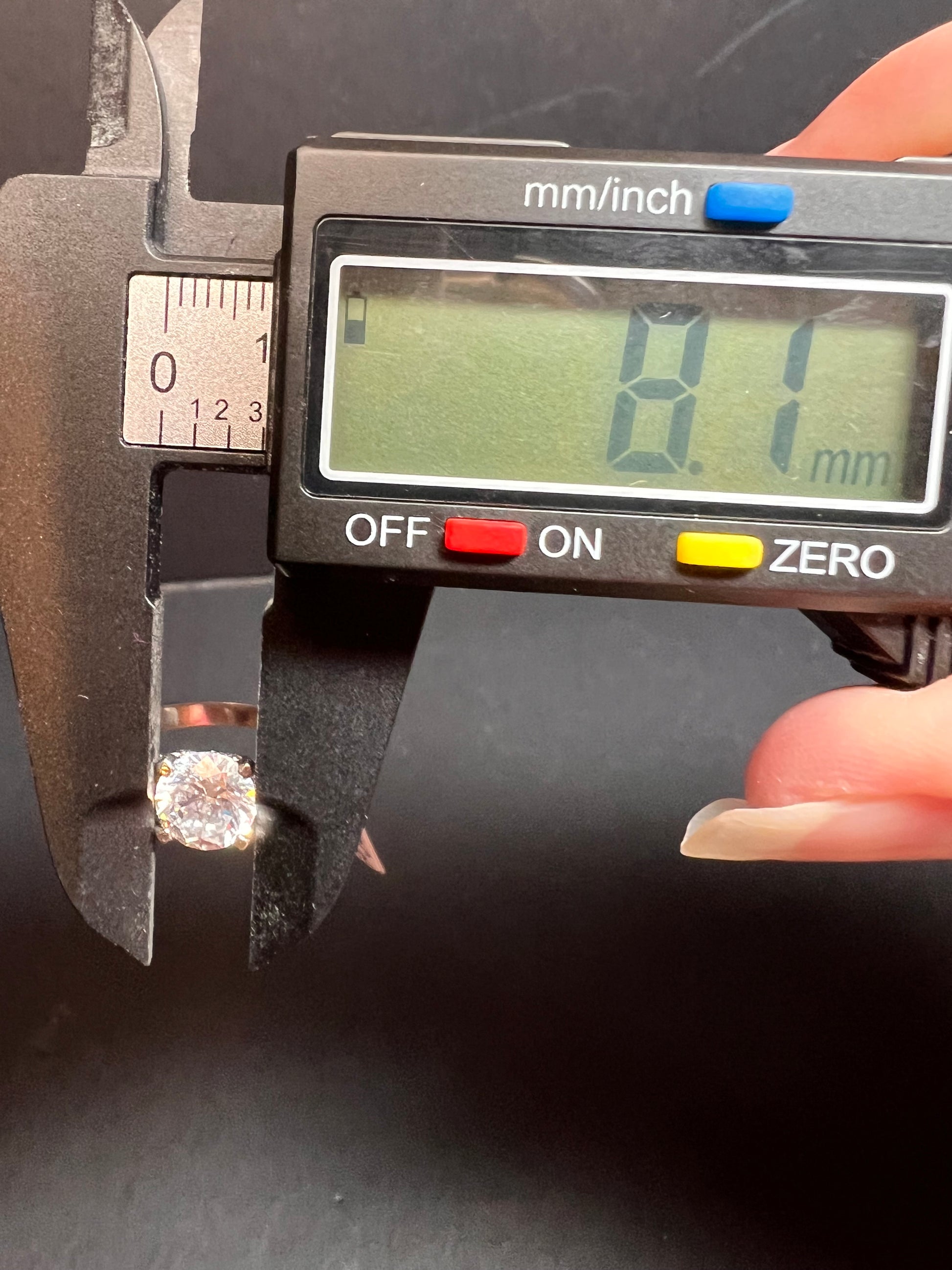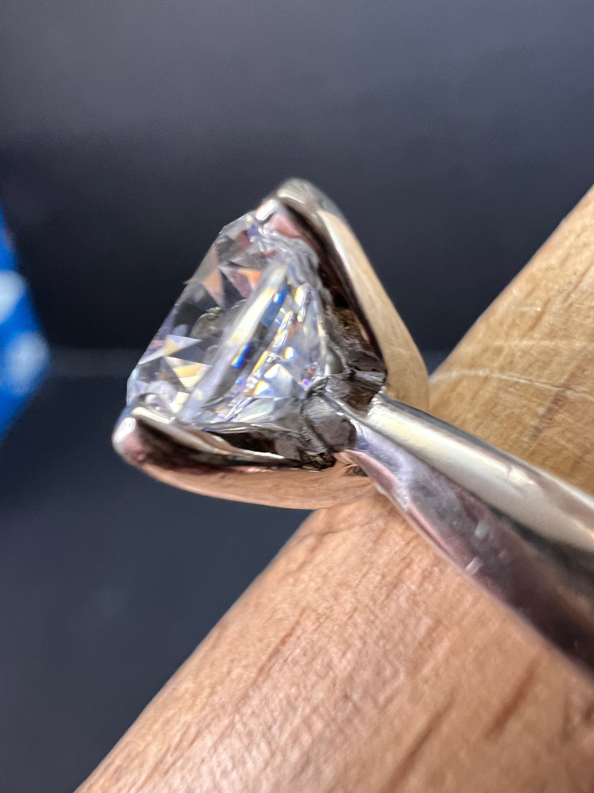 White/ colorless cubic zirconia gemstone prong set in a solitaire sterling silver setting that’s most likely played with rhodium or white gold. Tiny white accent stones at the base test as CZ also. Measures a size 7. 925 RP China. Stone measures about 8 mm in diameter. About 2ctw diamond equivalent