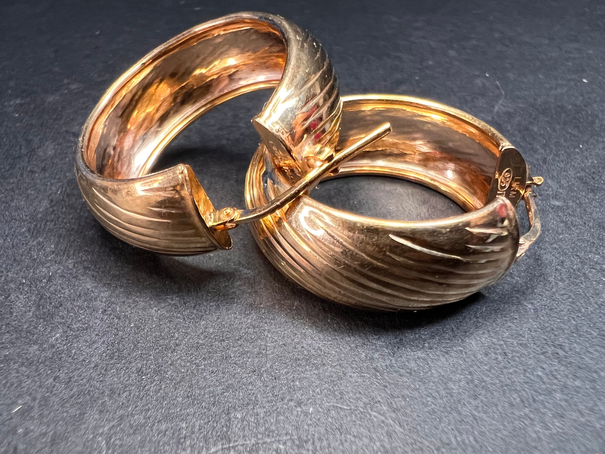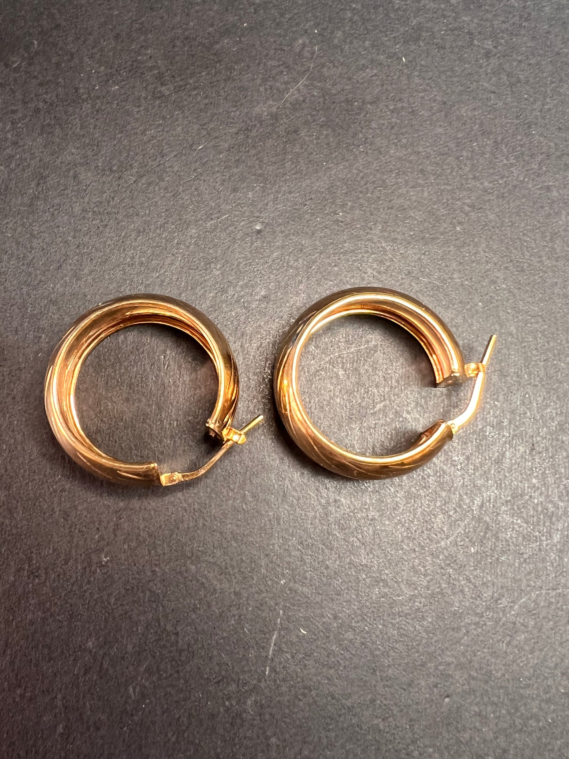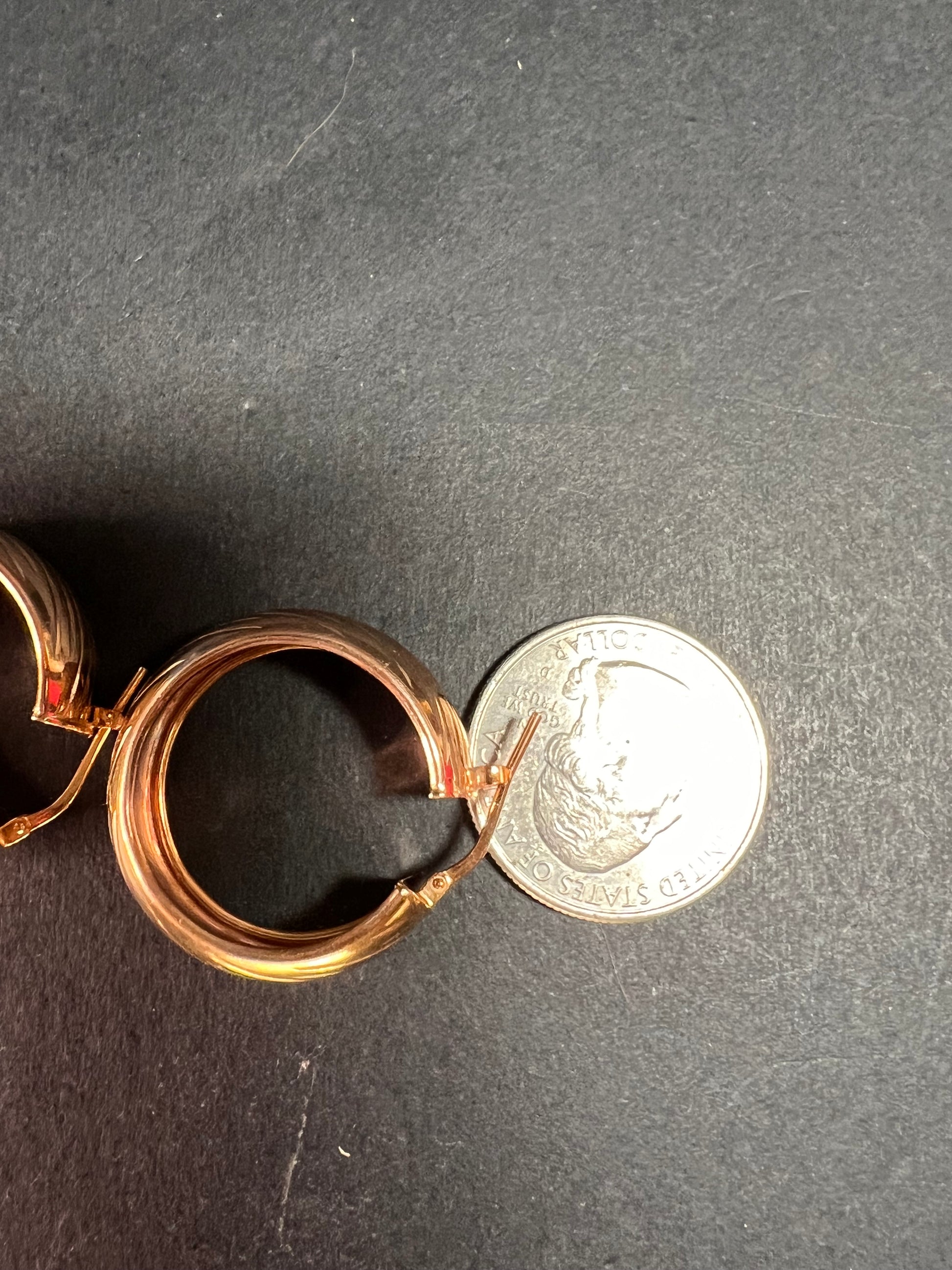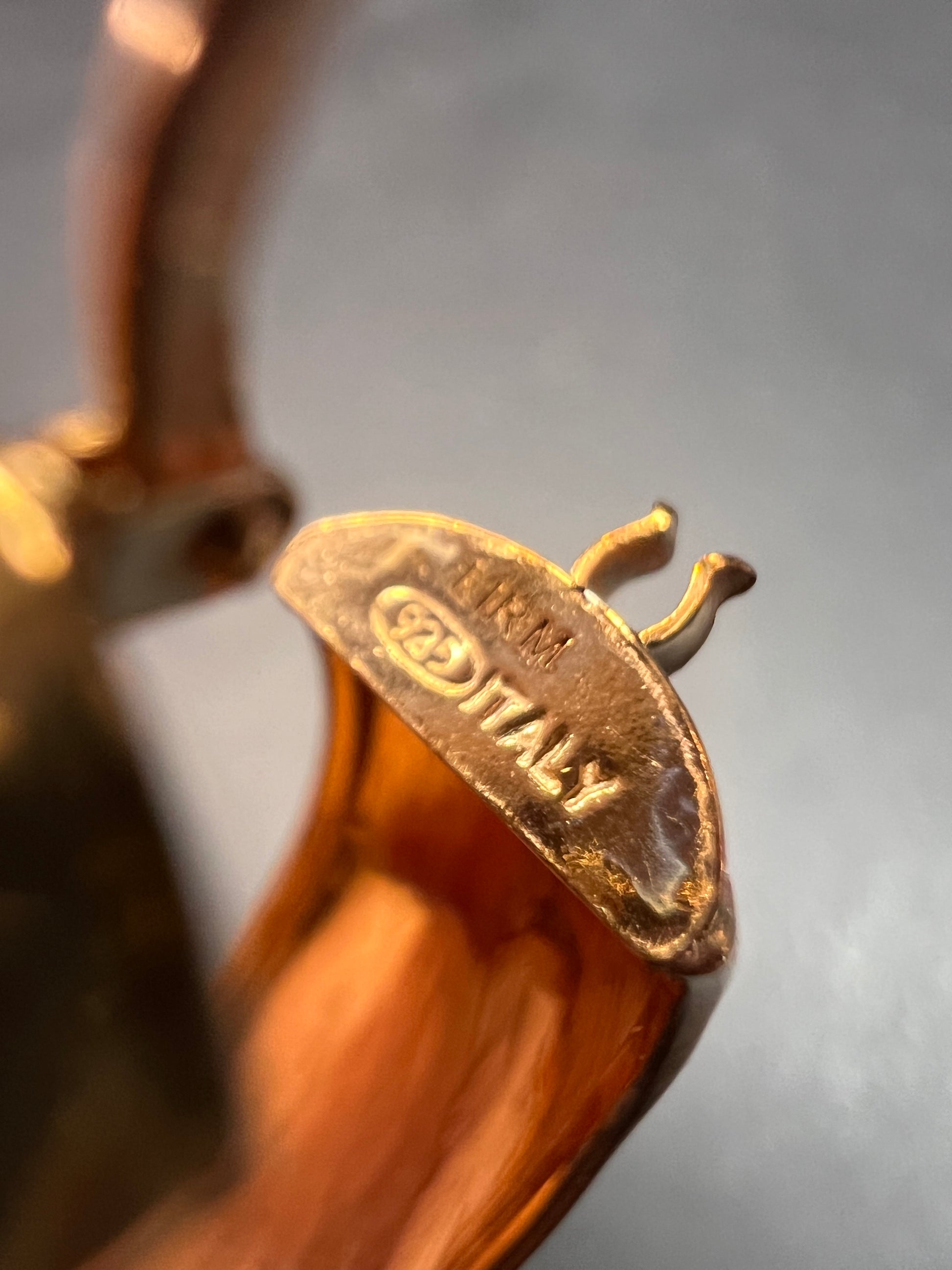 14-18k rose gold over sterling silver. I believe these are vermeil. LIRM Italy. 925. Total weight of 6.44 grams , measuring close to 27mm on outer diameter.