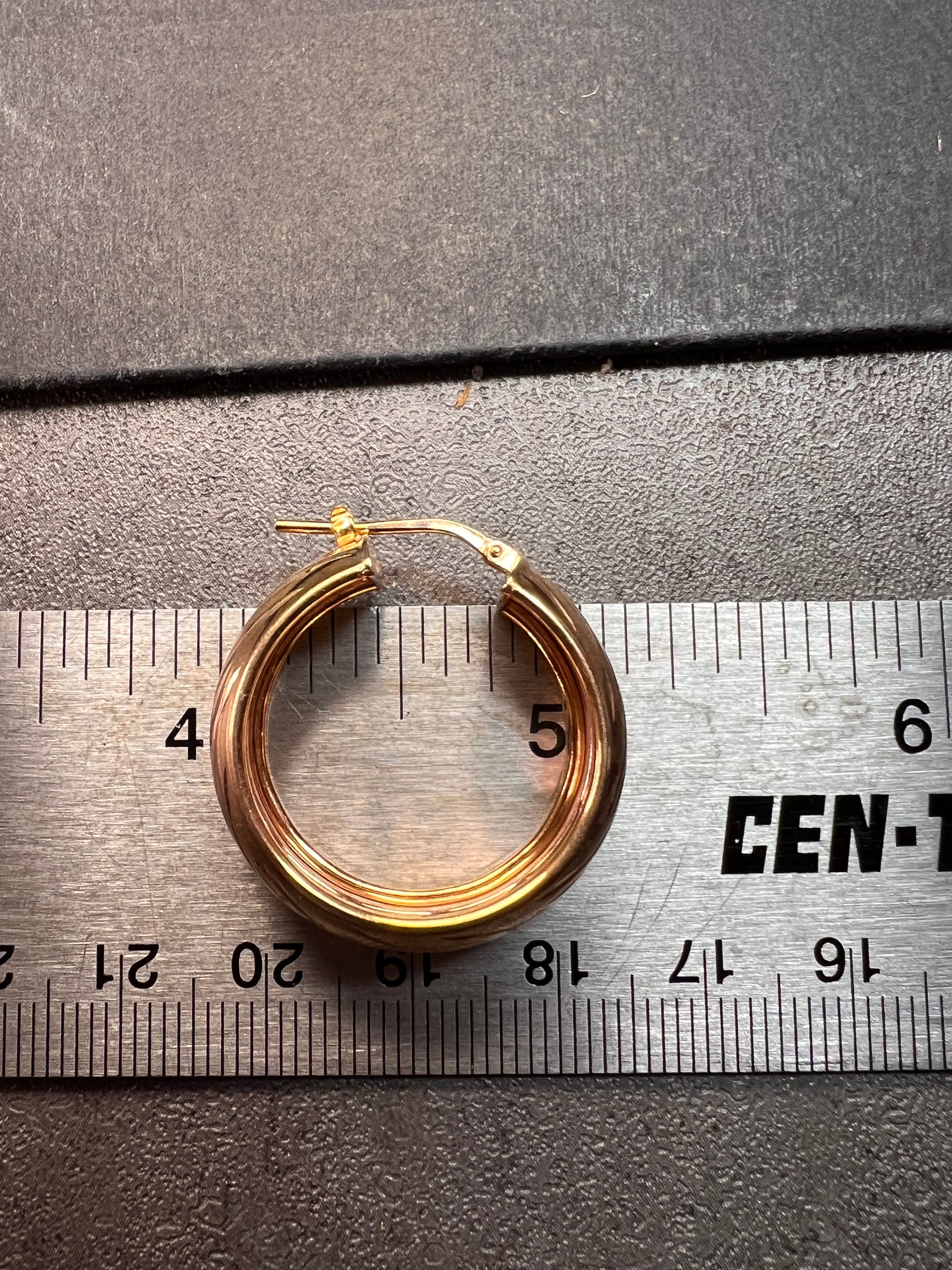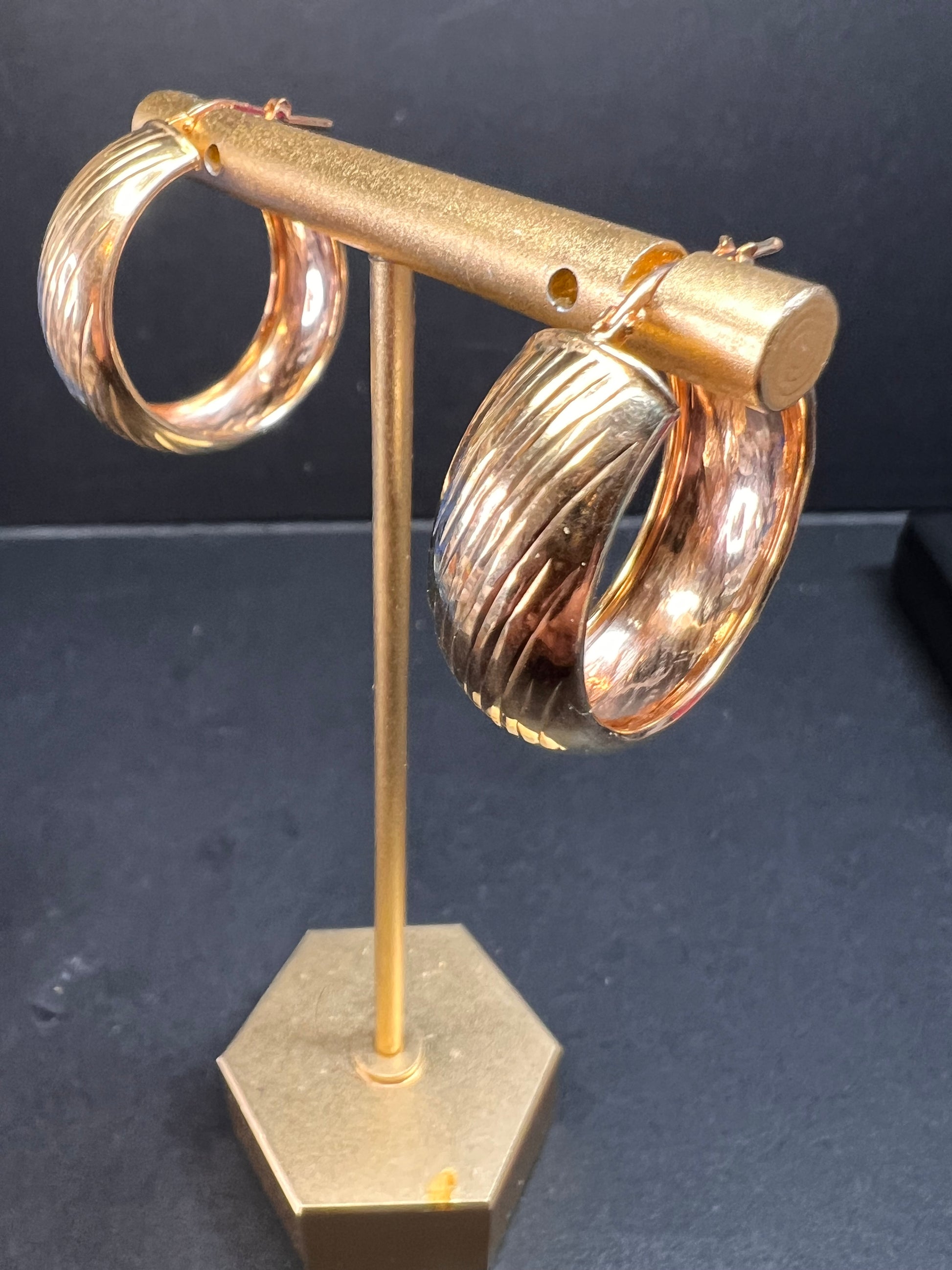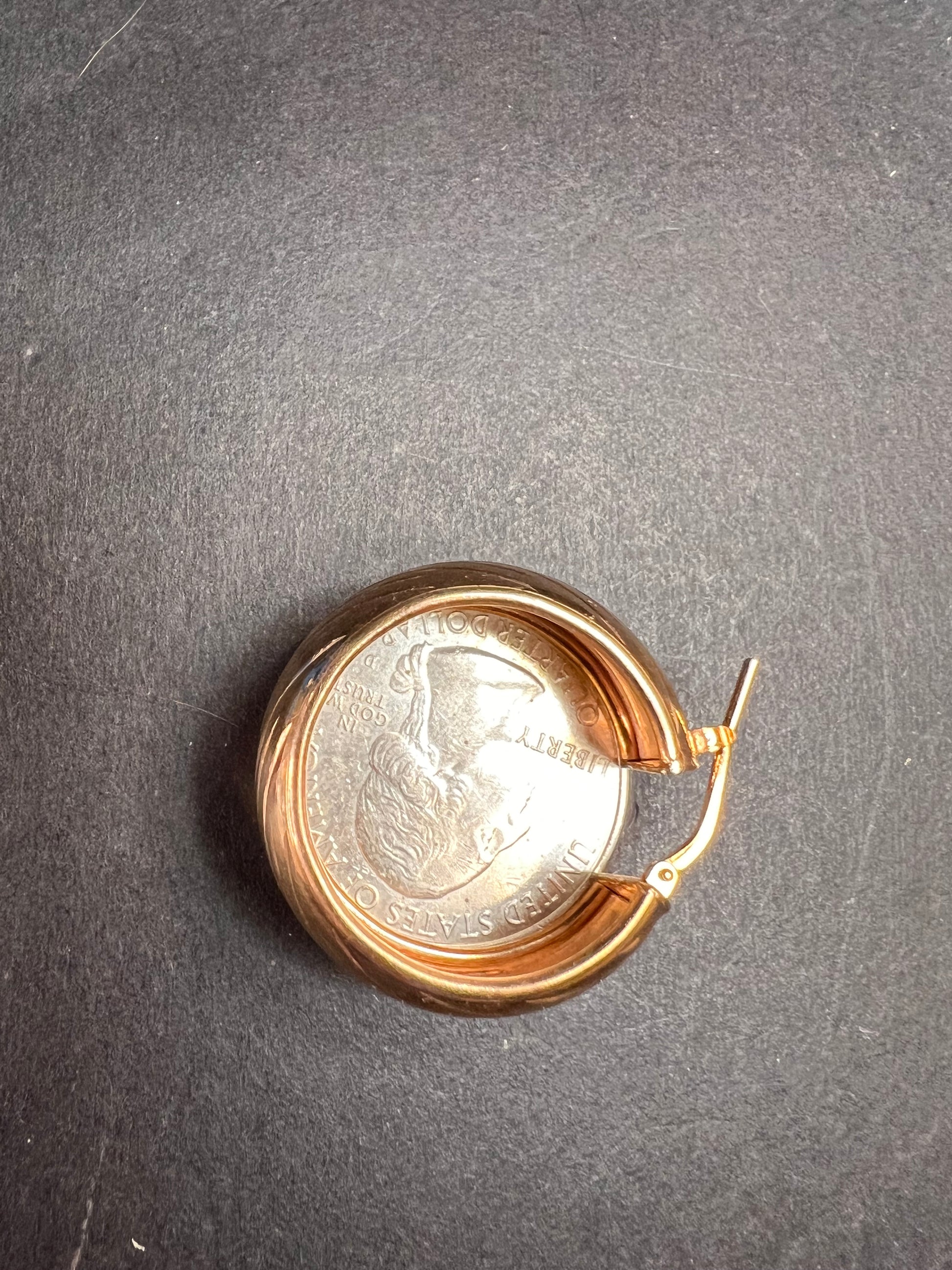 14-18k rose gold over sterling silver. I believe these are vermeil. LIRM Italy. 925. Total weight of 6.44 grams , measuring close to 27mm on outer diameter.