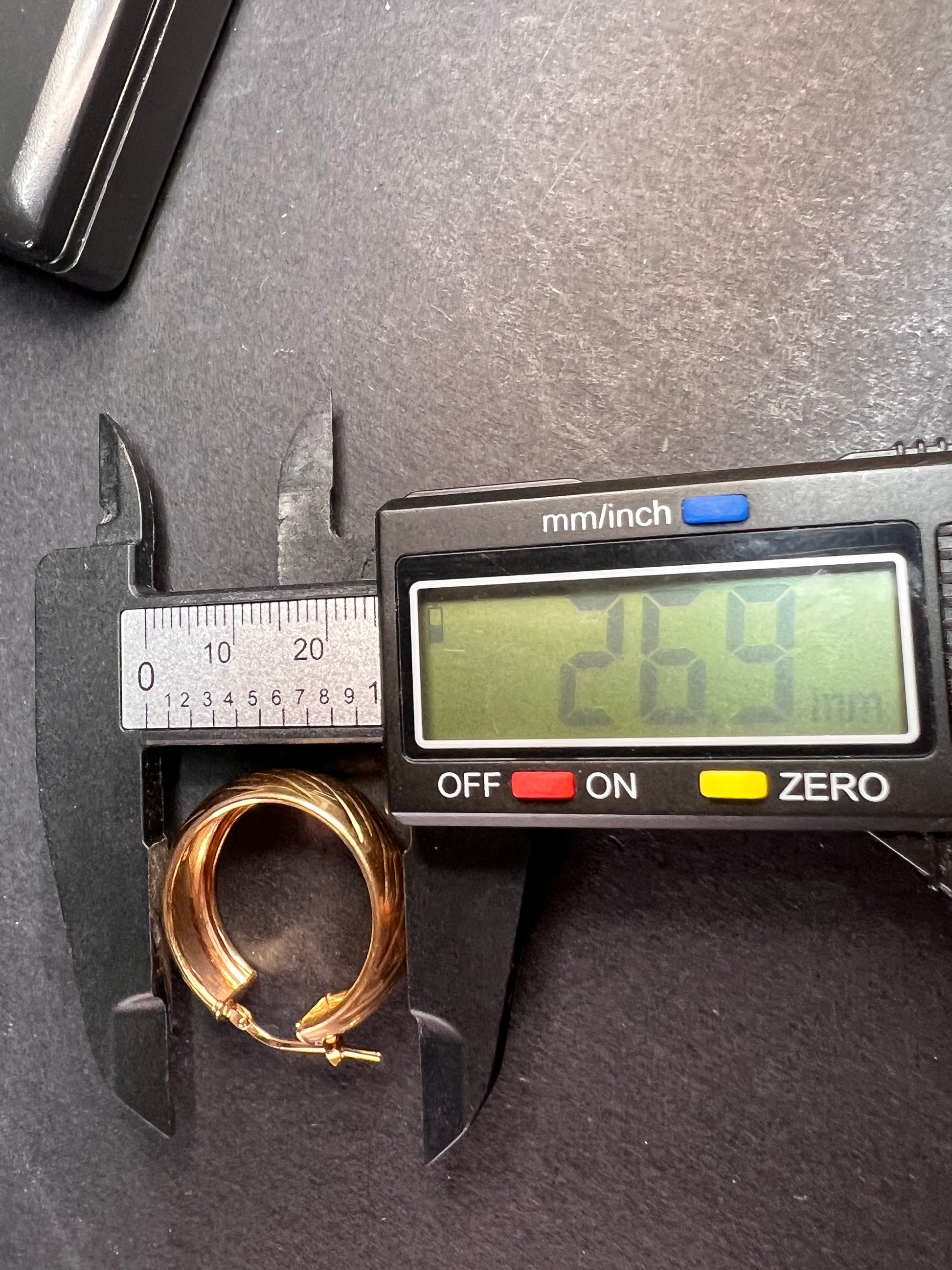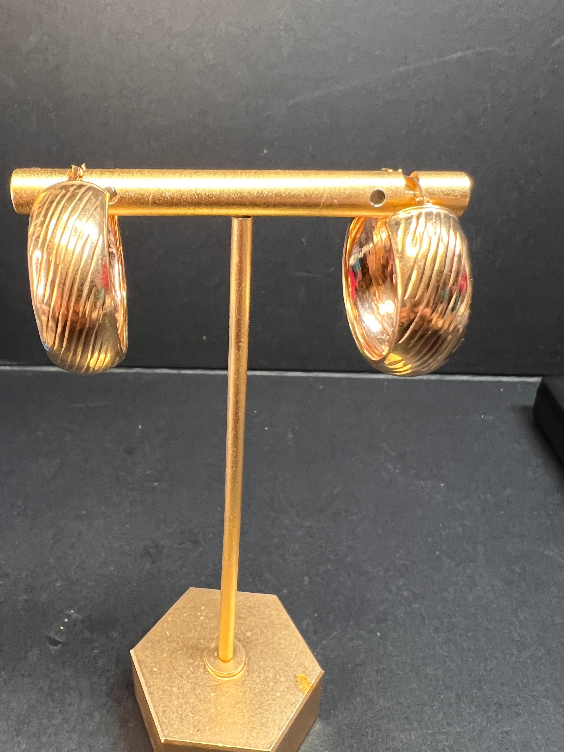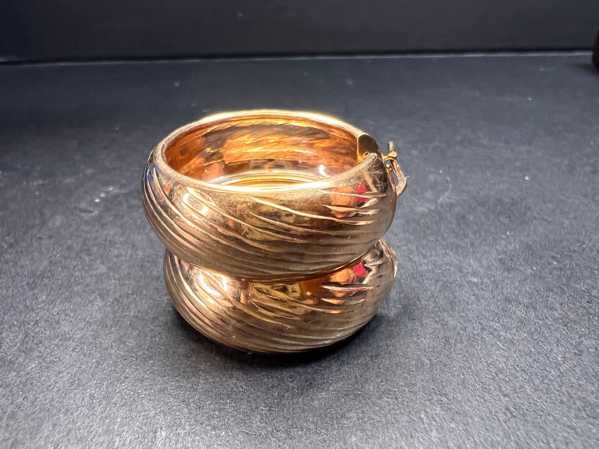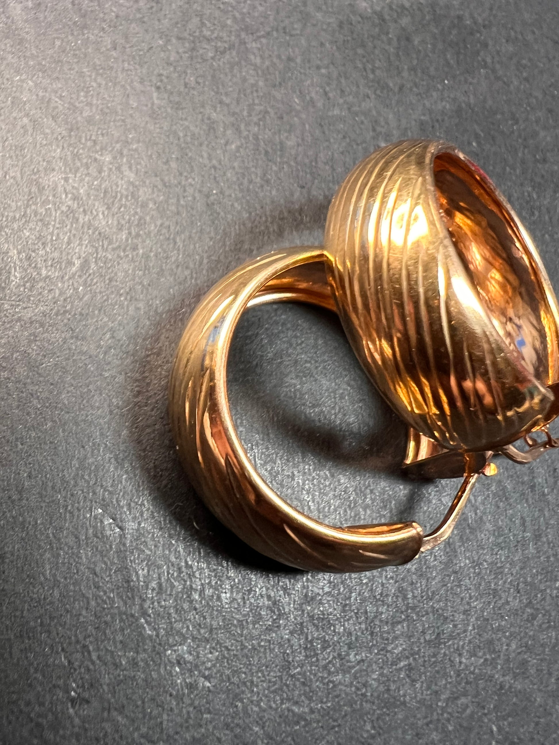 14-18k rose gold over sterling silver. I believe these are vermeil. LIRM Italy. 925. Total weight of 6.44 grams , measuring close to 27mm on outer diameter.