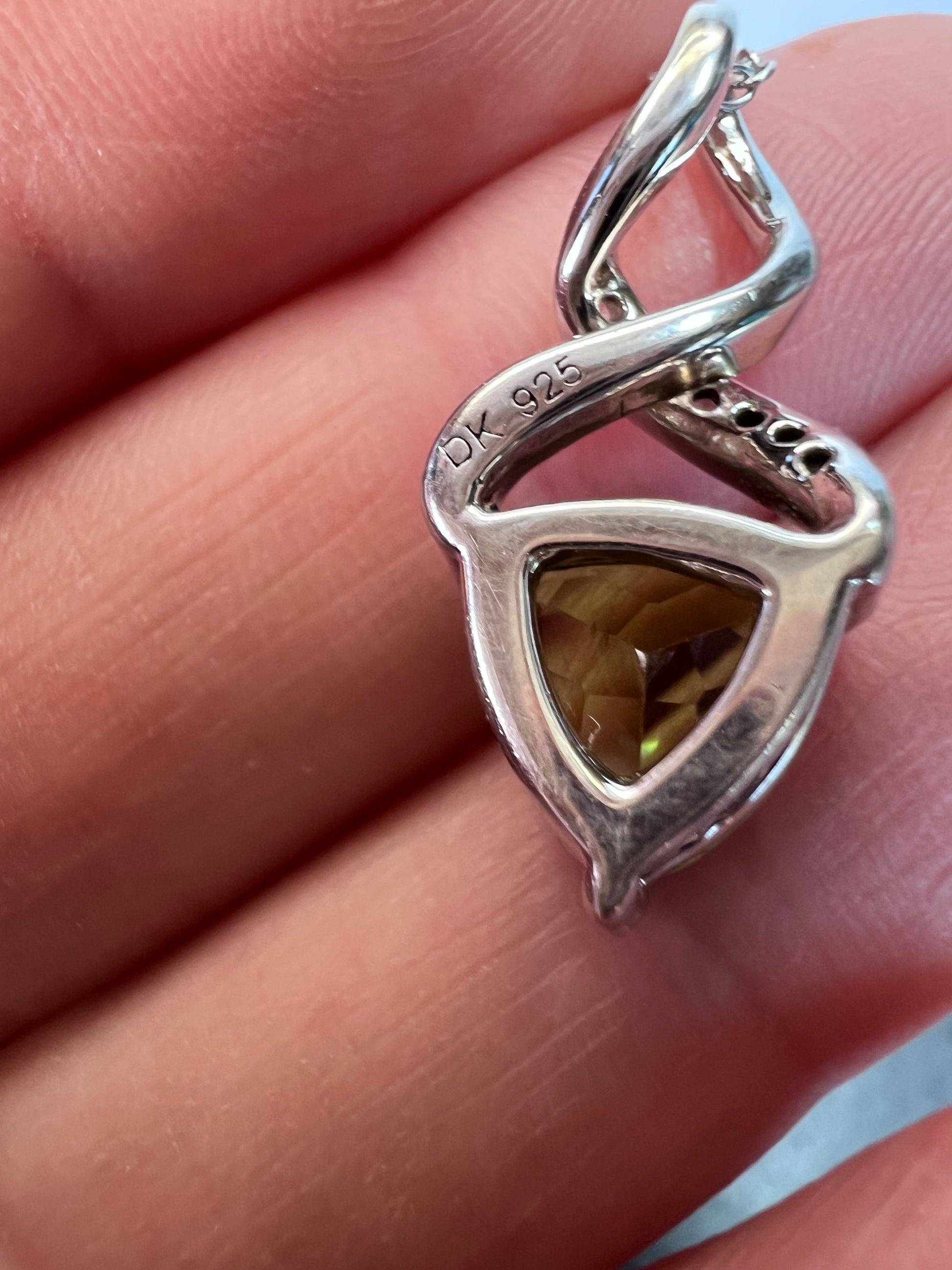 Trilliant cut peridot stone in a rhodium over sterling silver prong setting. White accent stones on the pendant spiral are most likely zircon. 925