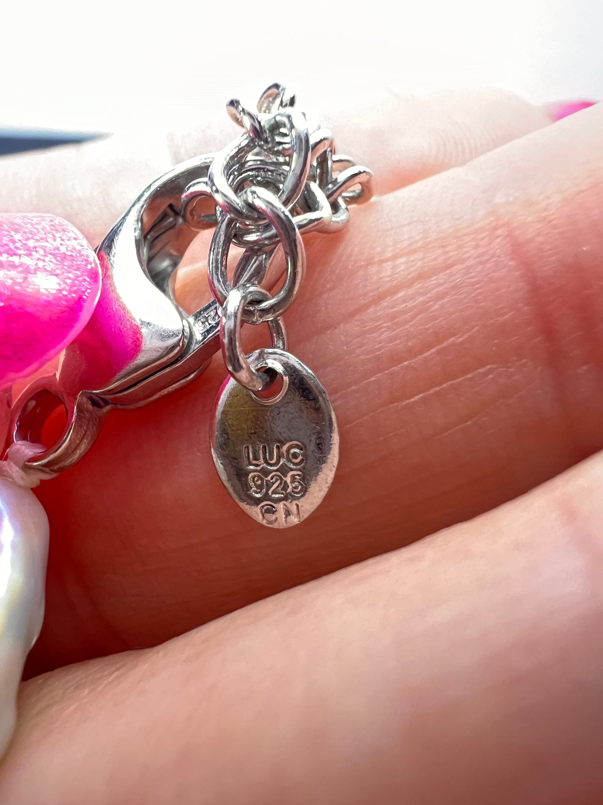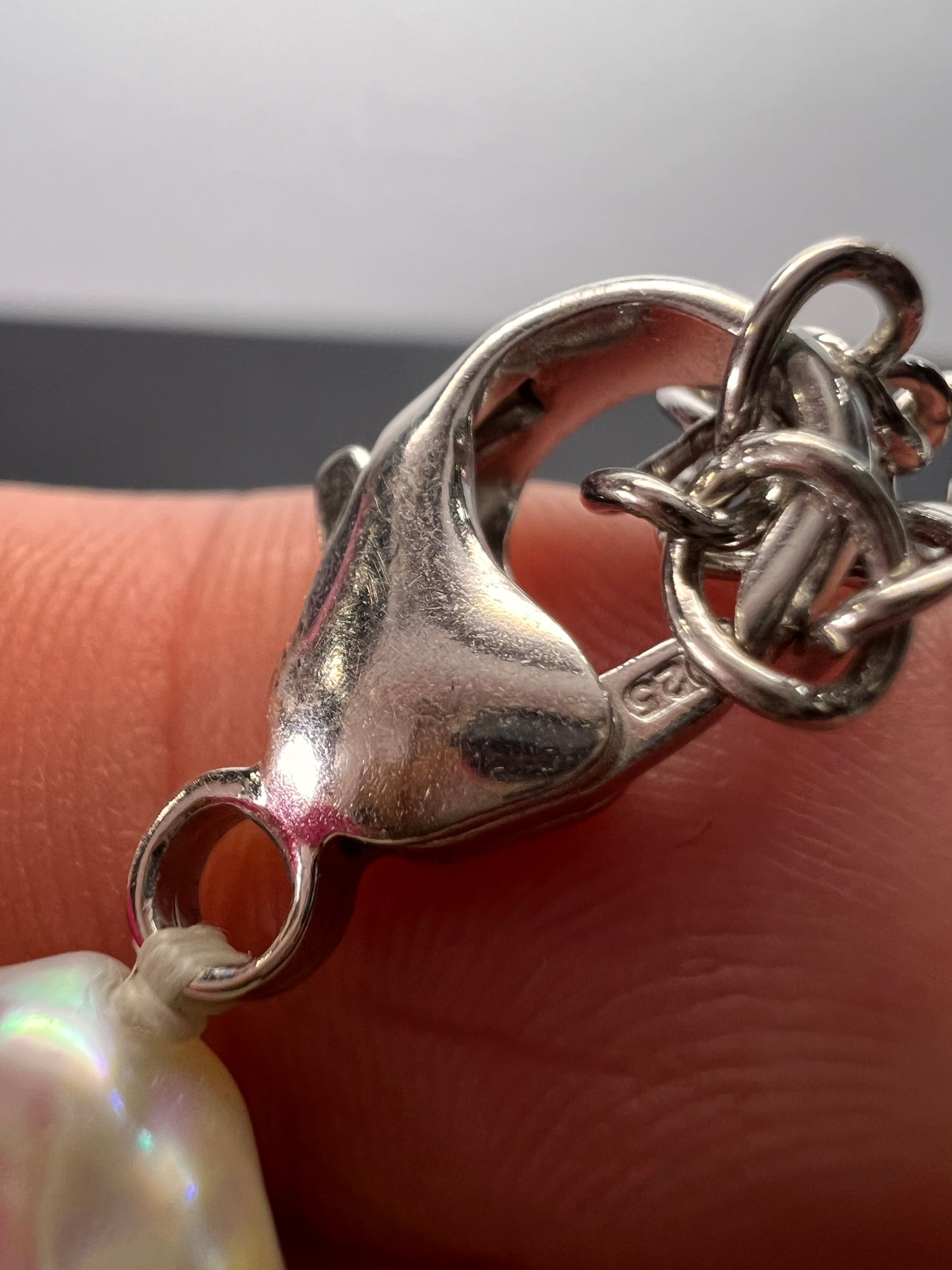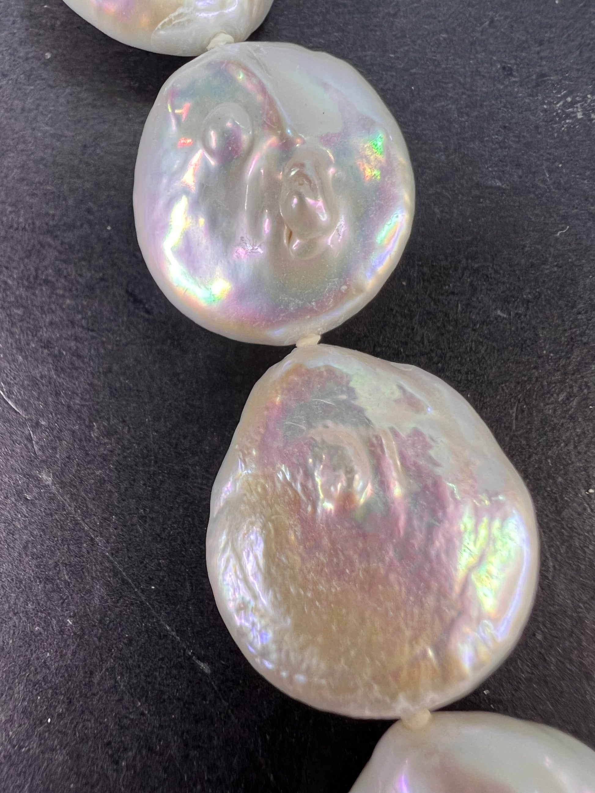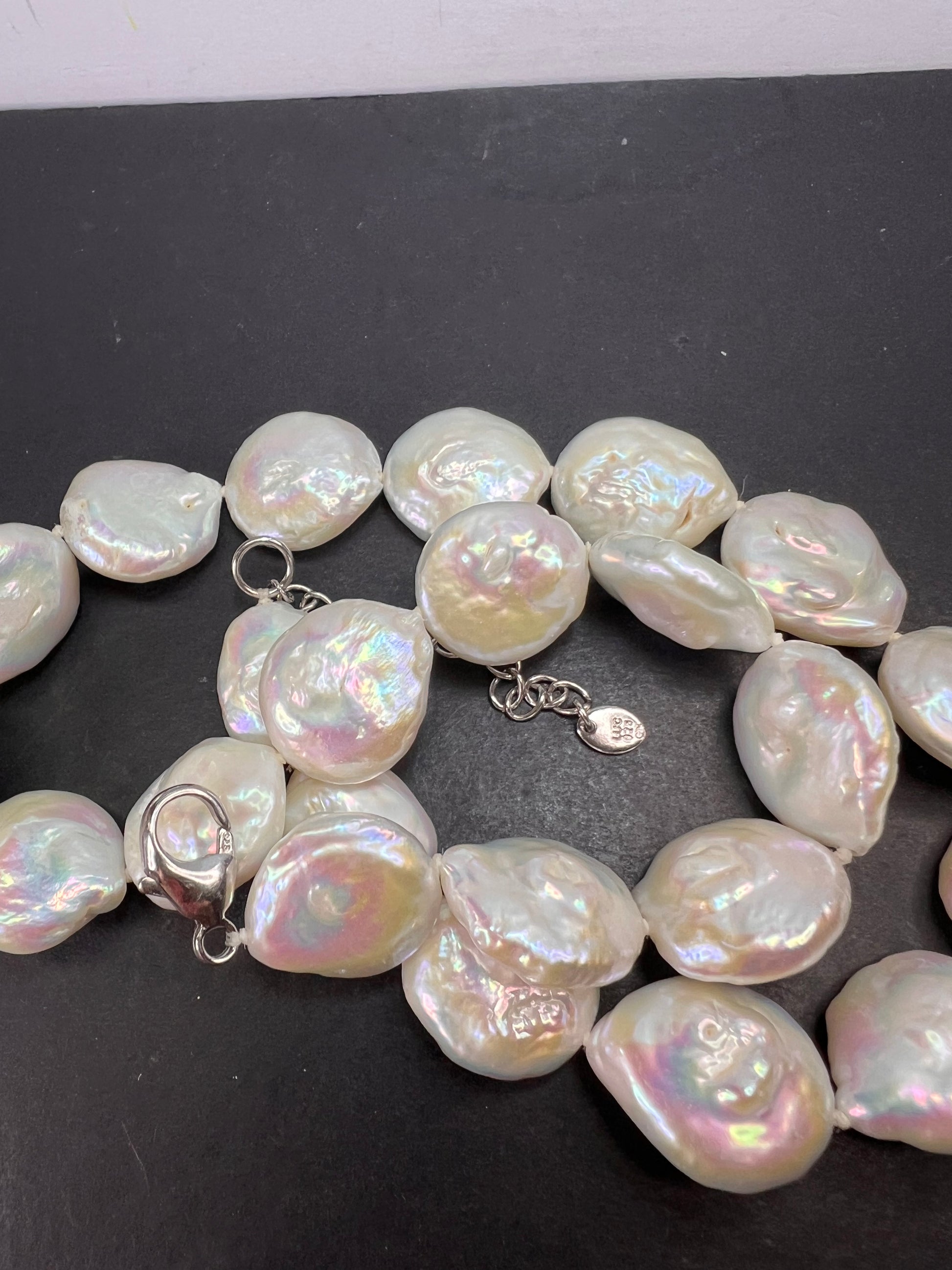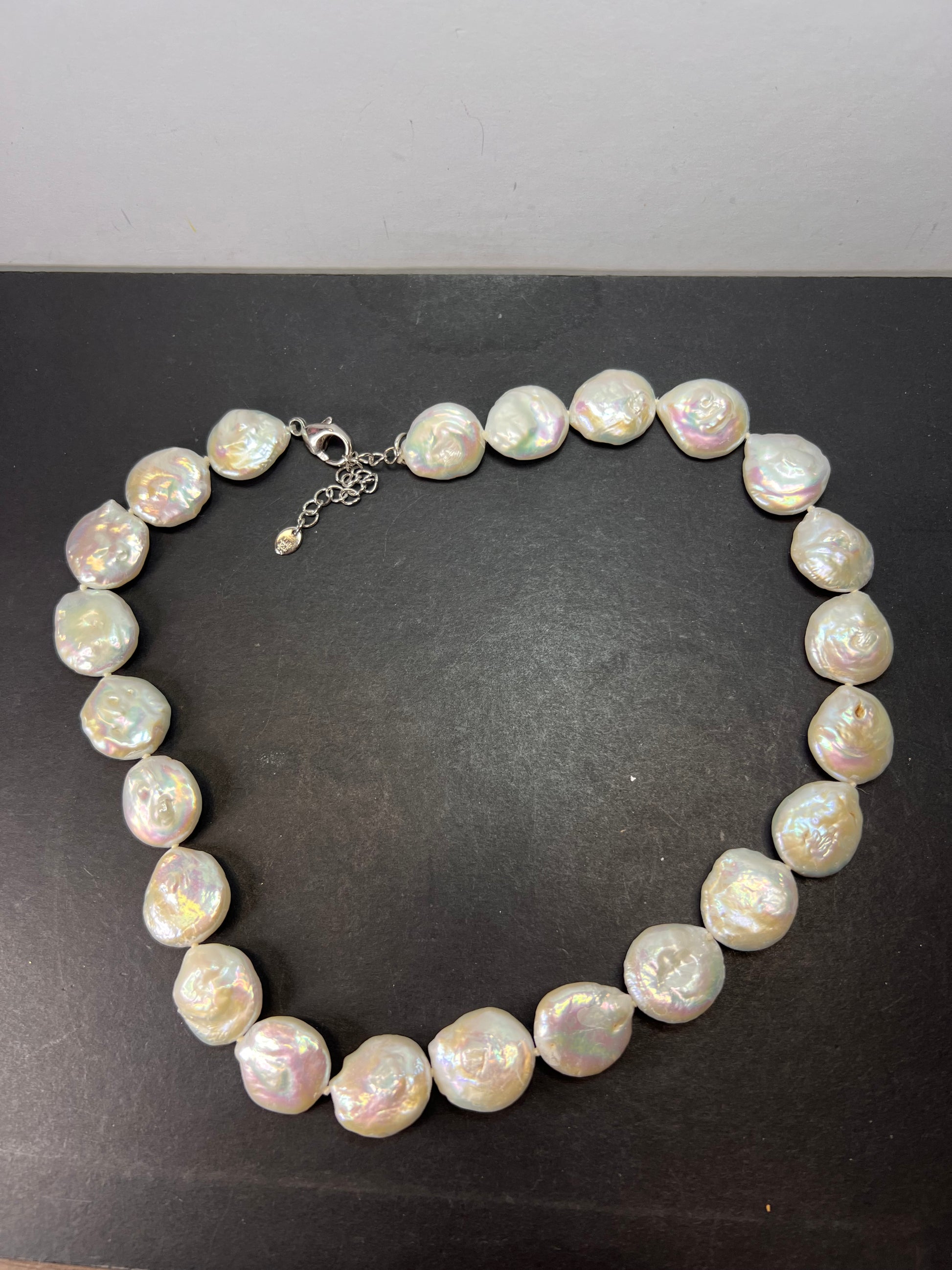 White cultured freshwater coin shaped pearls measuring about 18-19 inches in length. Sterling silver lobster clasp with 2 inch extension. I believe this is a Lucas Lameth design. 925 LUC. I believe the clasp and extension are rhodium plated over sterling