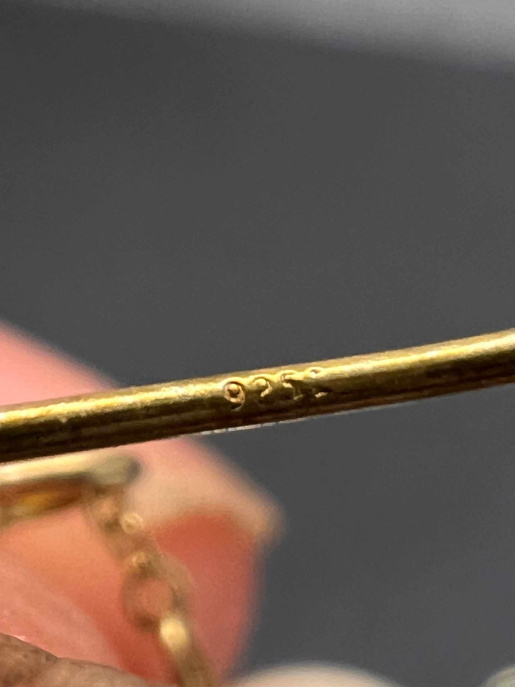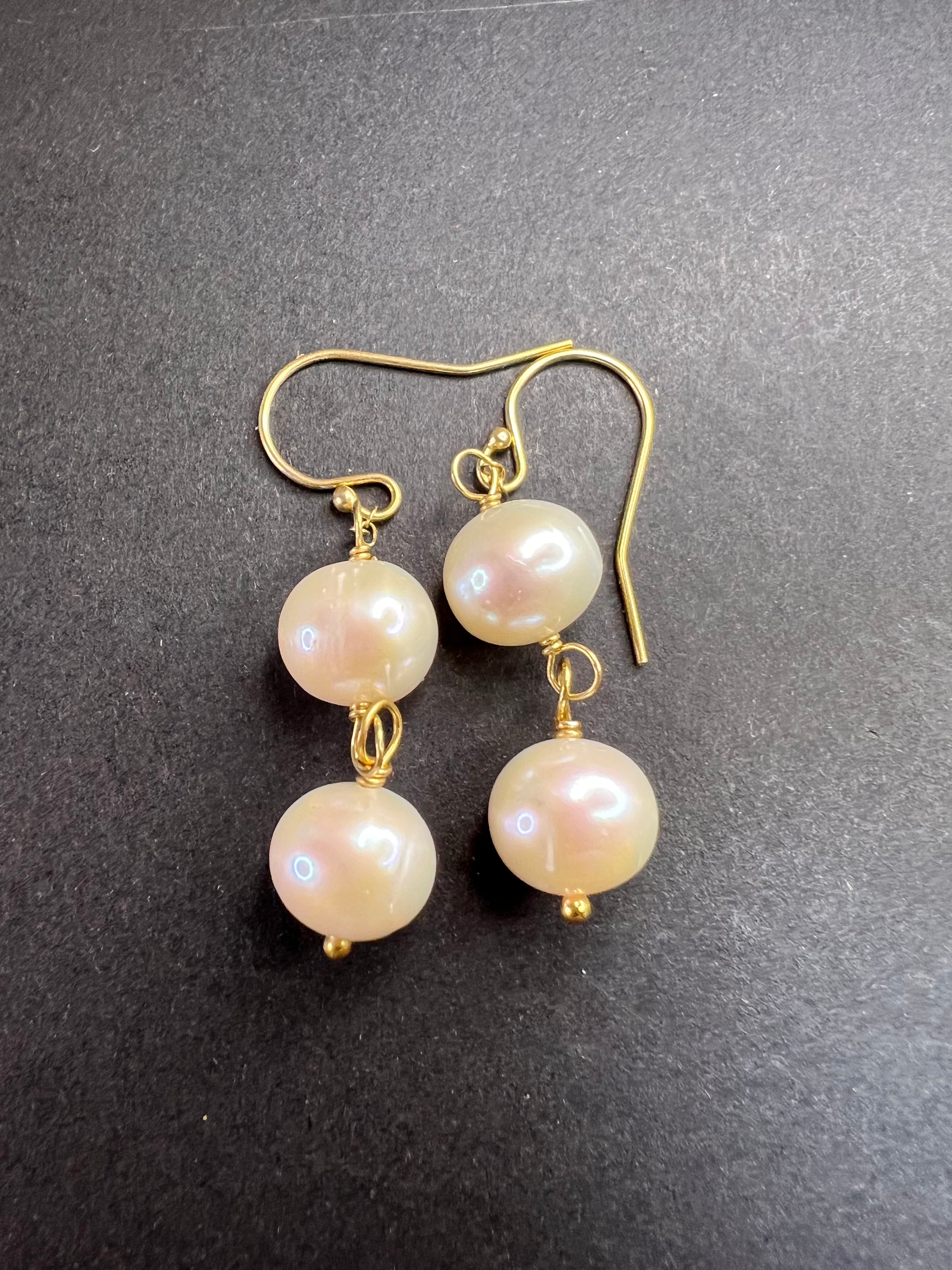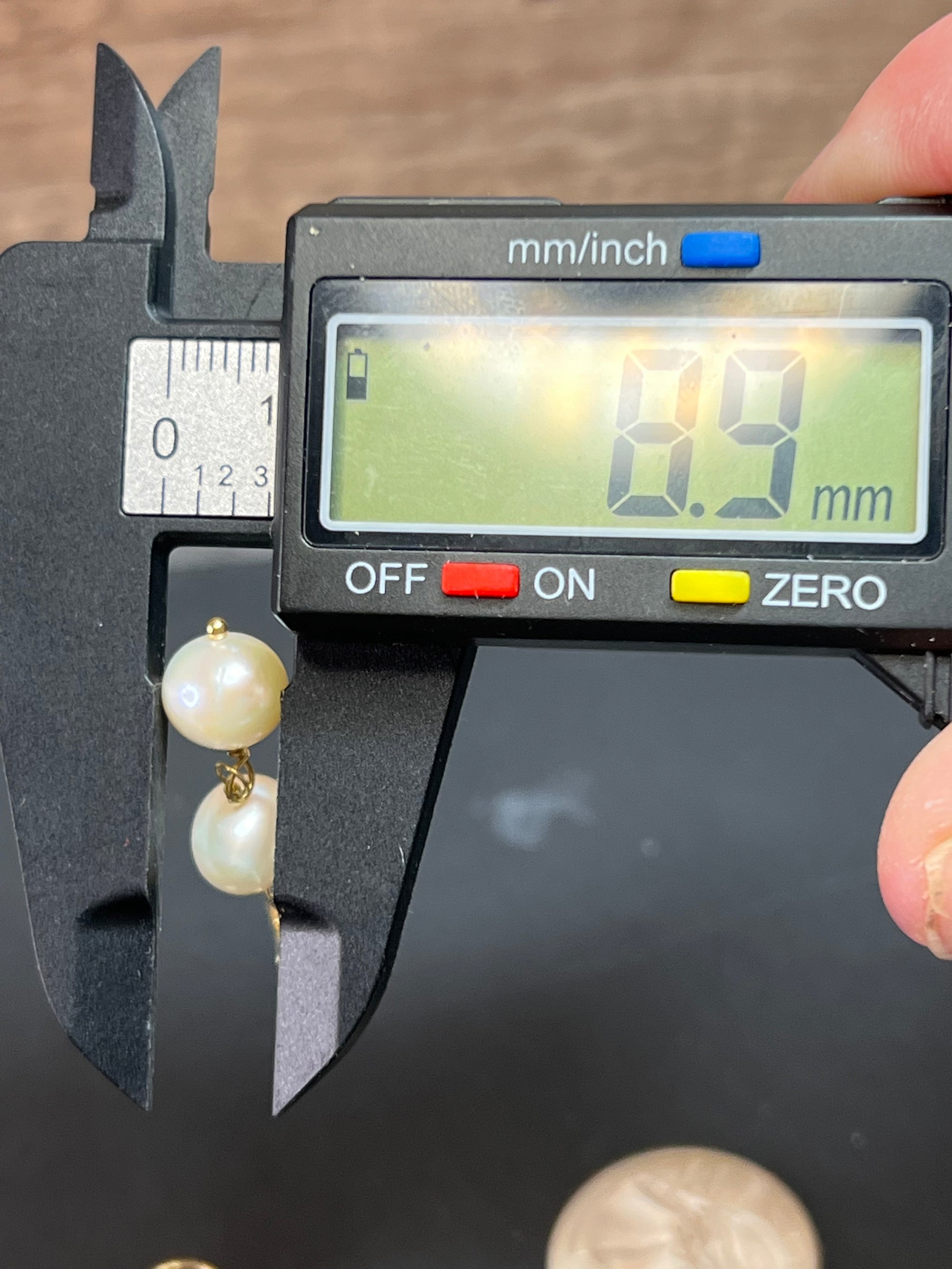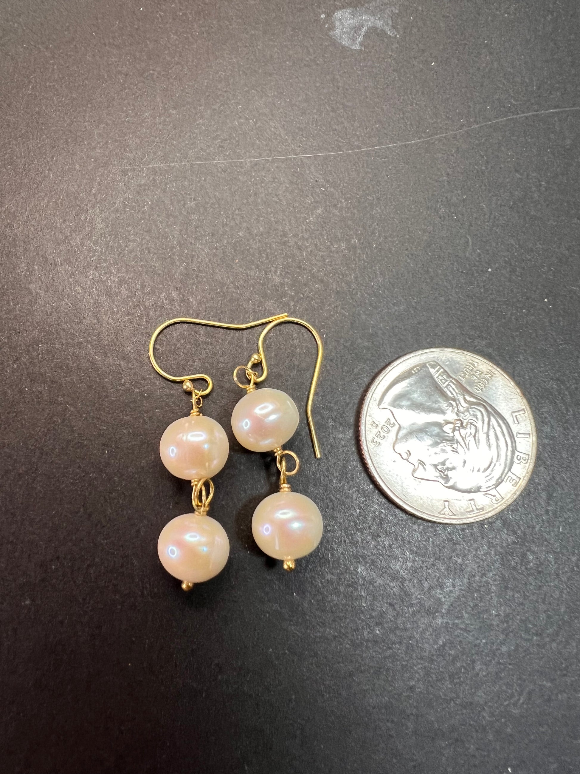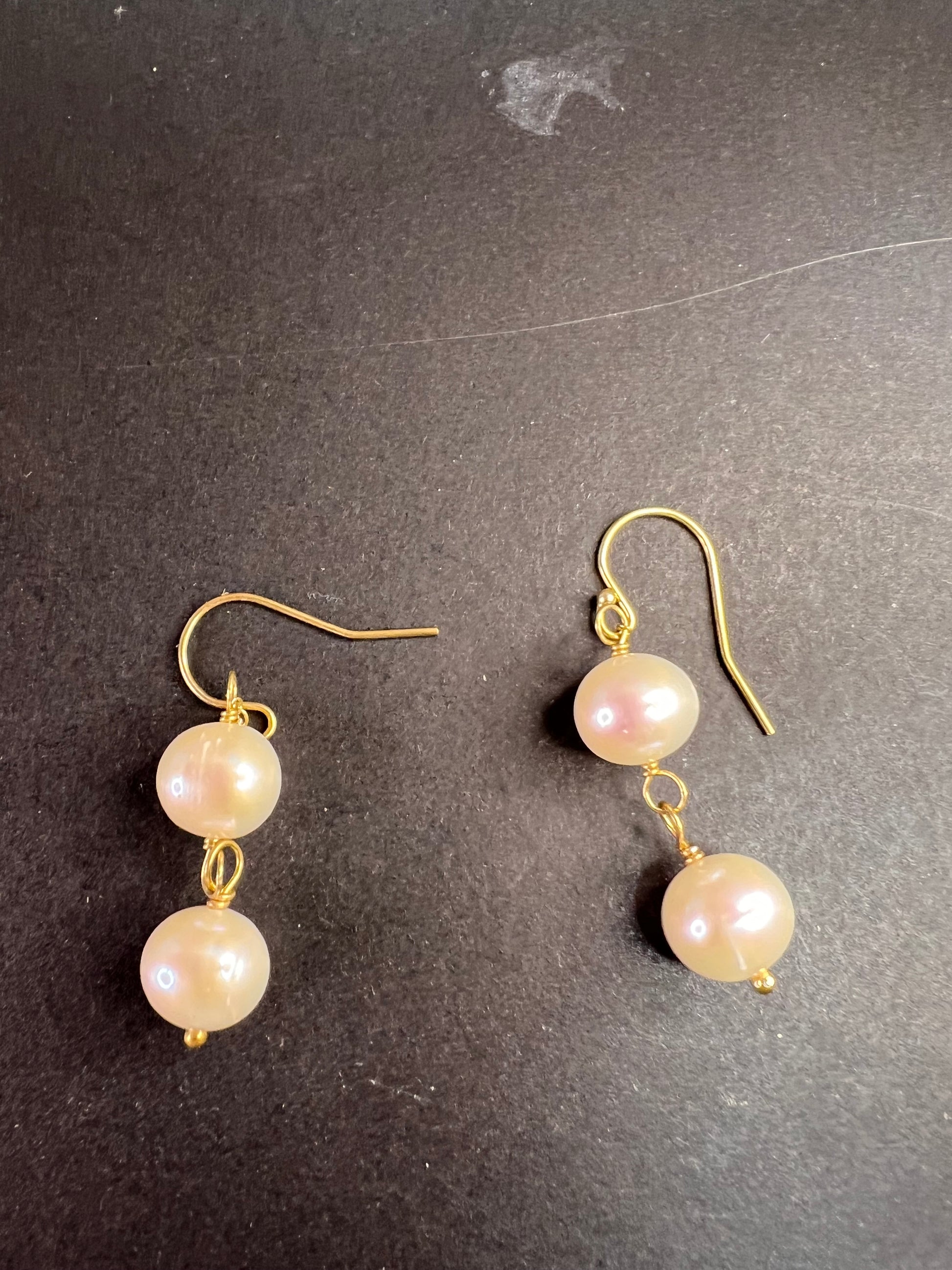 Genuine white cultured pearls hung on yellow gold plated over sterling silver shepherds hooks. Pearls measure about 8.9 mm in diameter, and likely freshwater pearls. Measurements in photos. 925