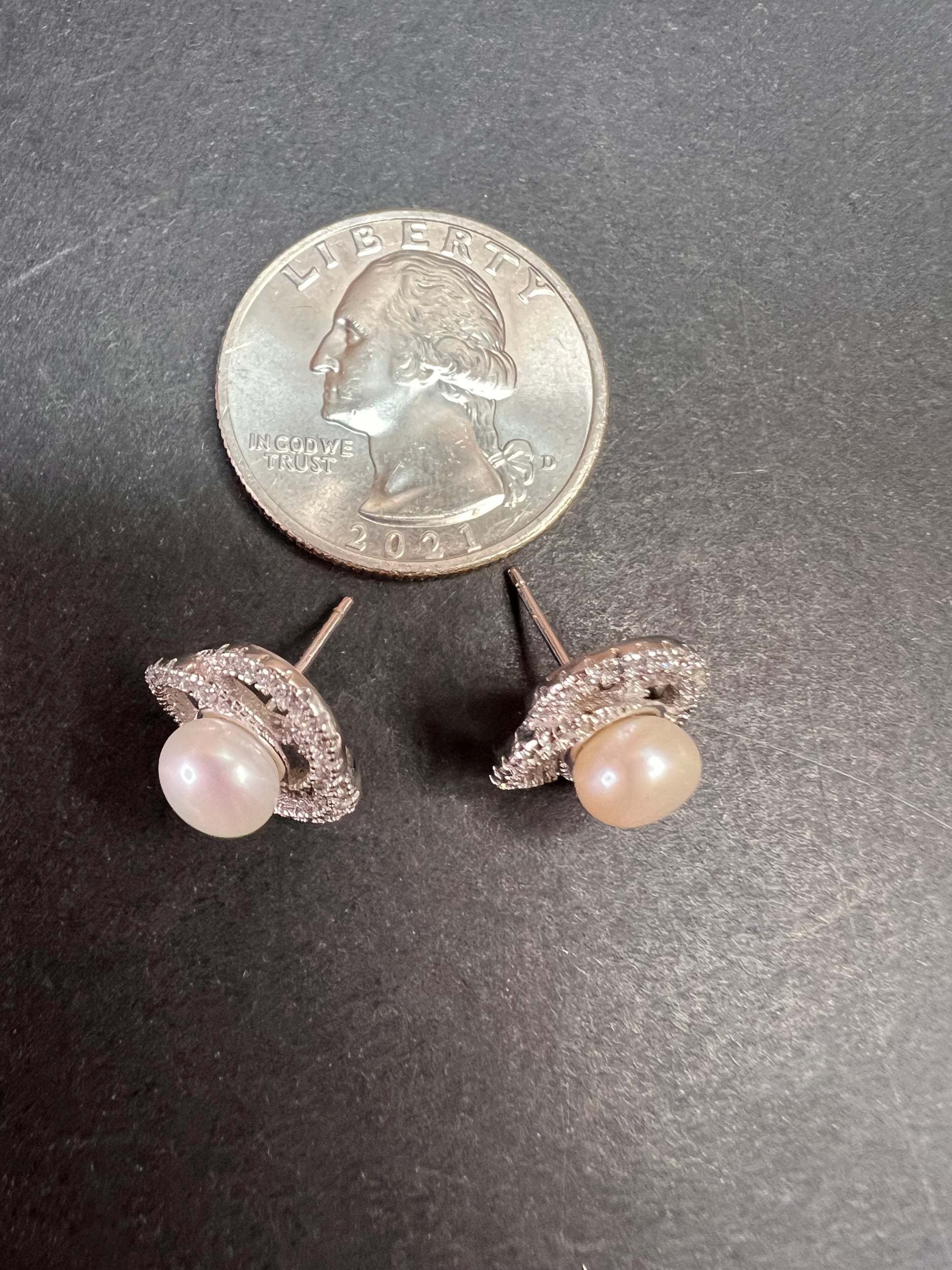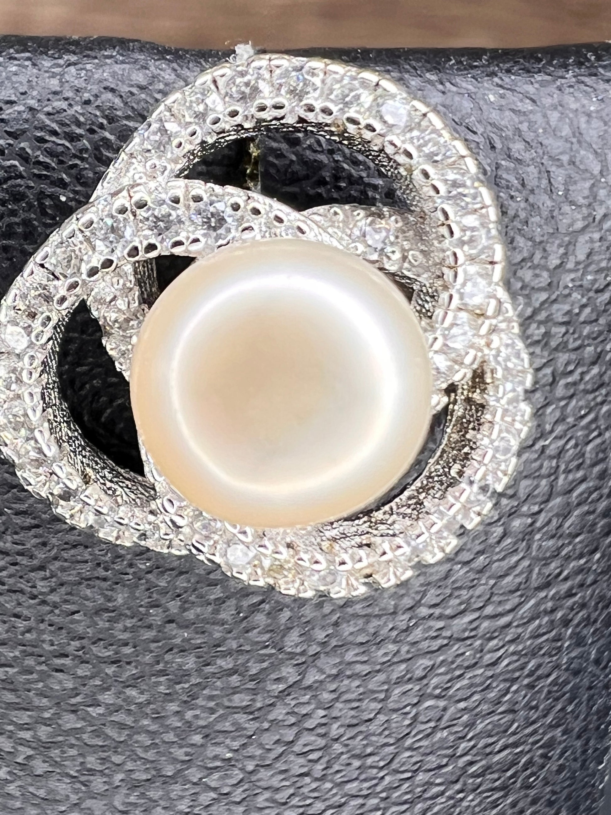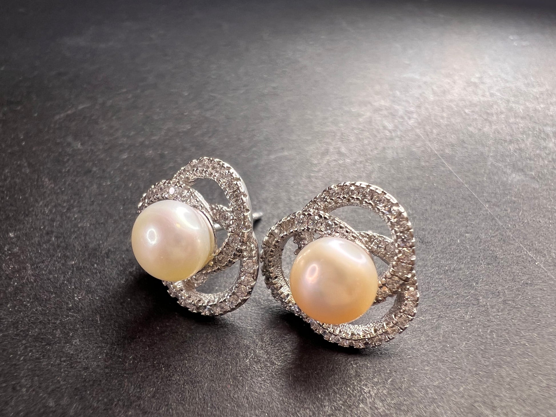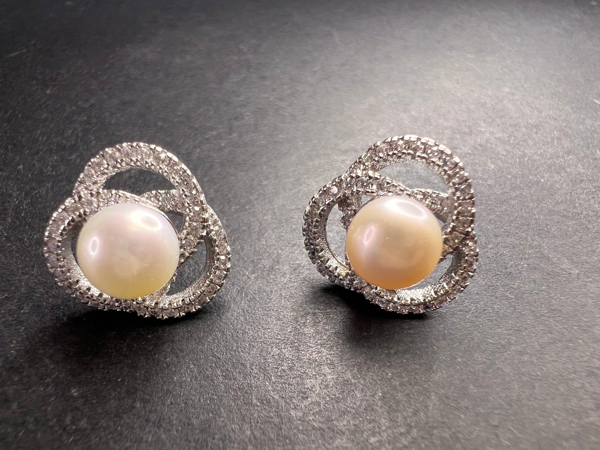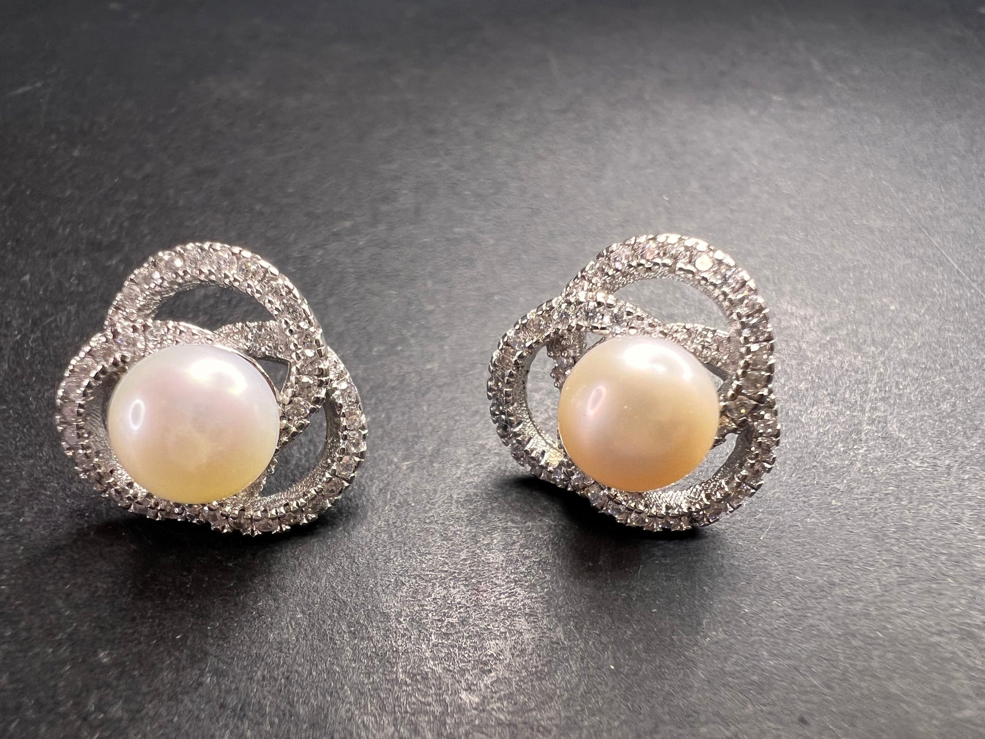 Genuine white cultured pearls set in 925 sterling silver. Please note before making this purchase that both pearls are not exactly the same color as perfectly matched pearls usually fetch higher prices. Colorless/ white accent stones are cubic zirconia. Sterling silver likely is plated with rhodium to slow down tarnishing.