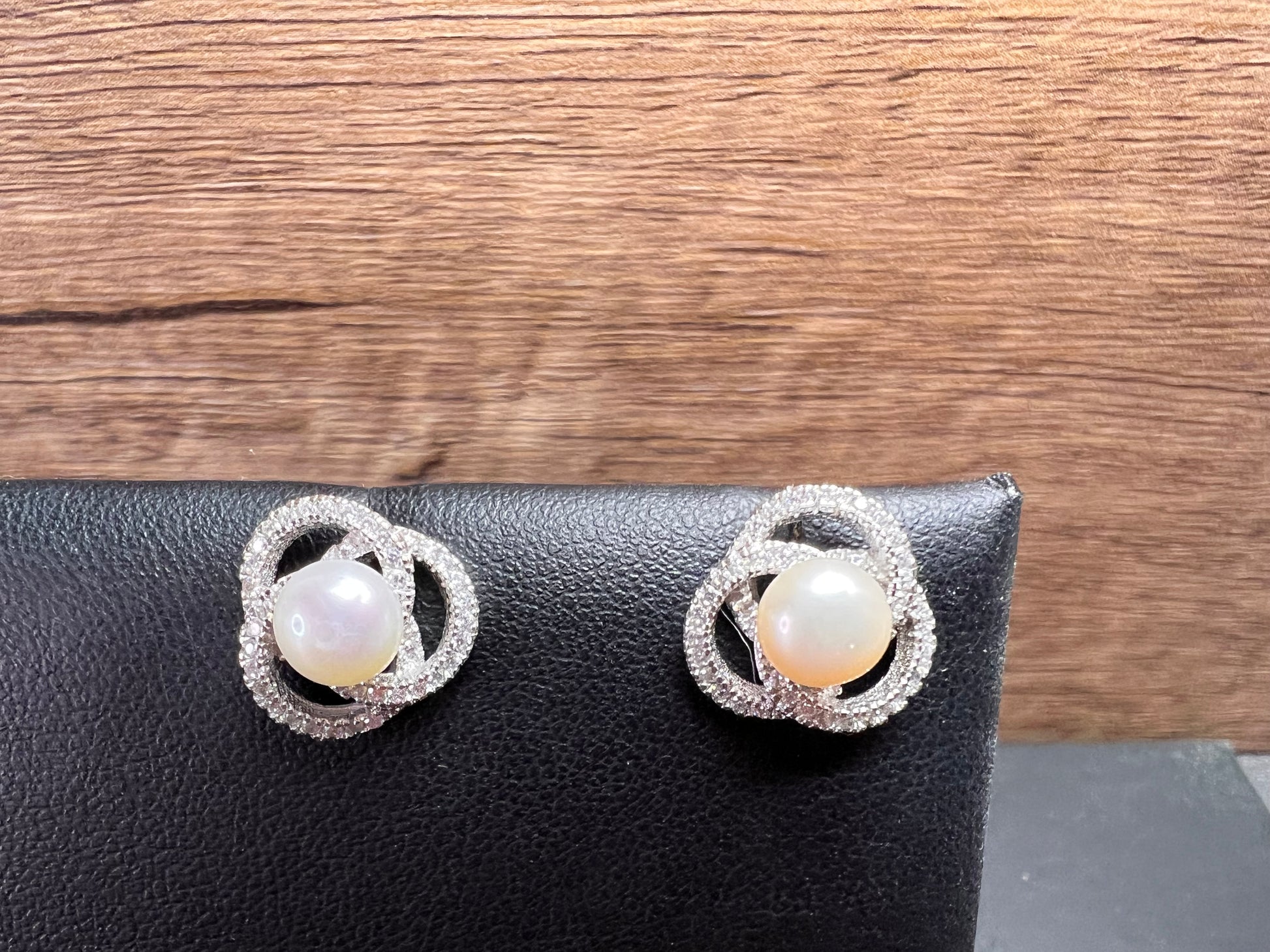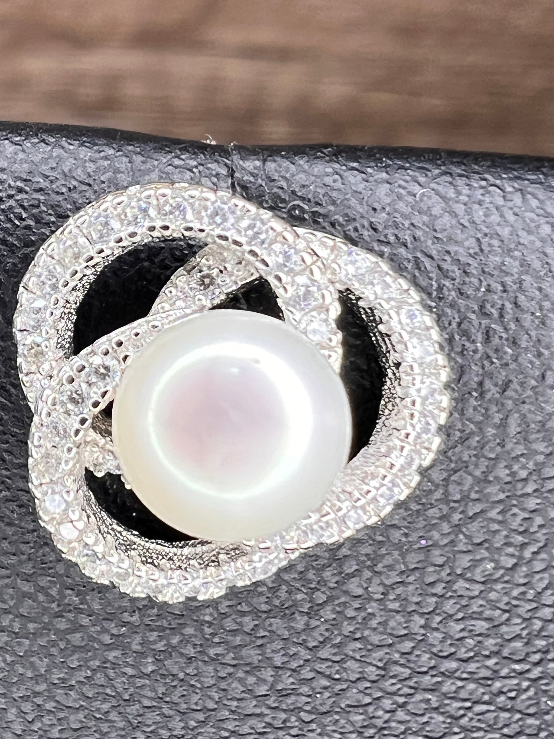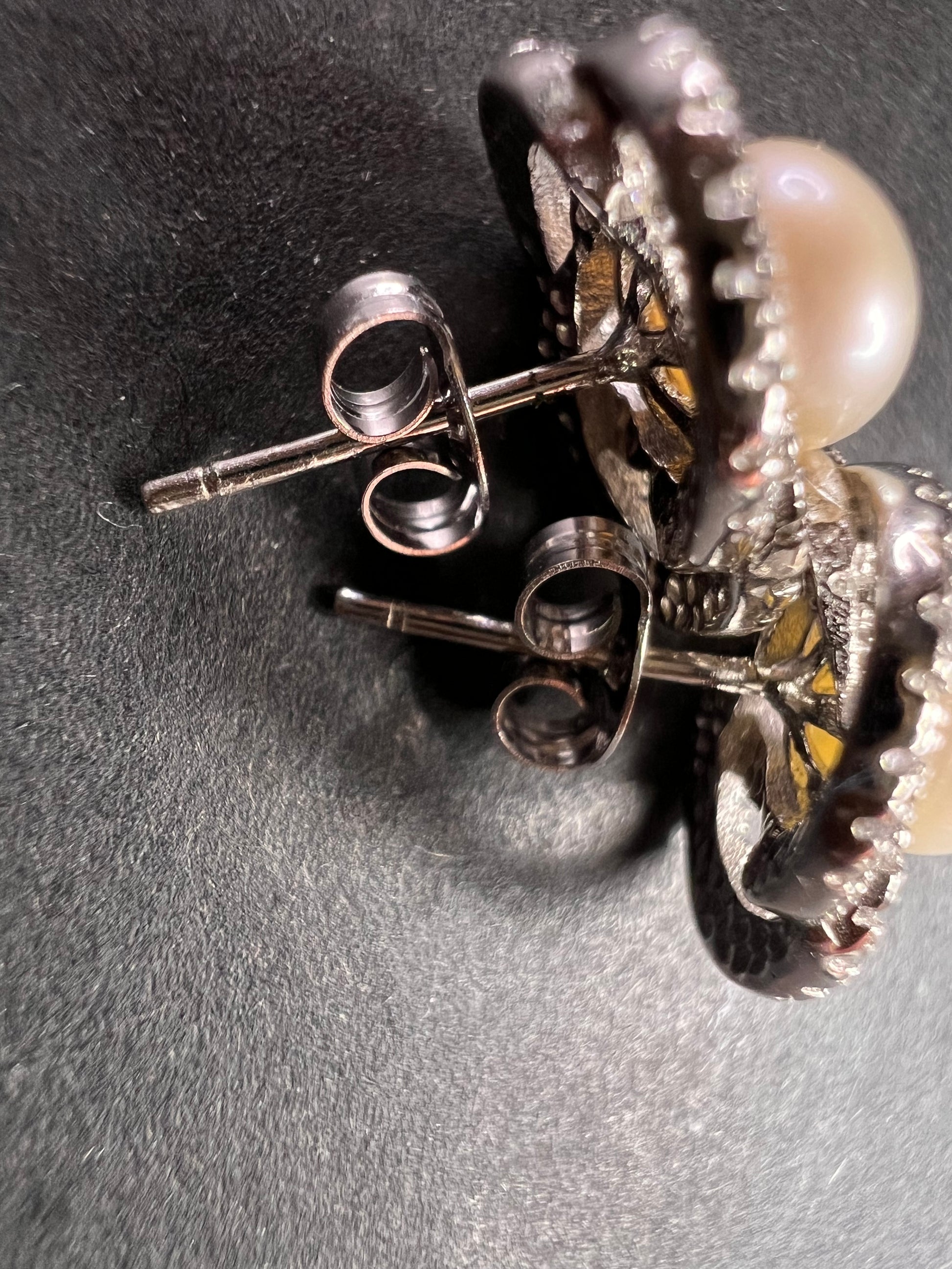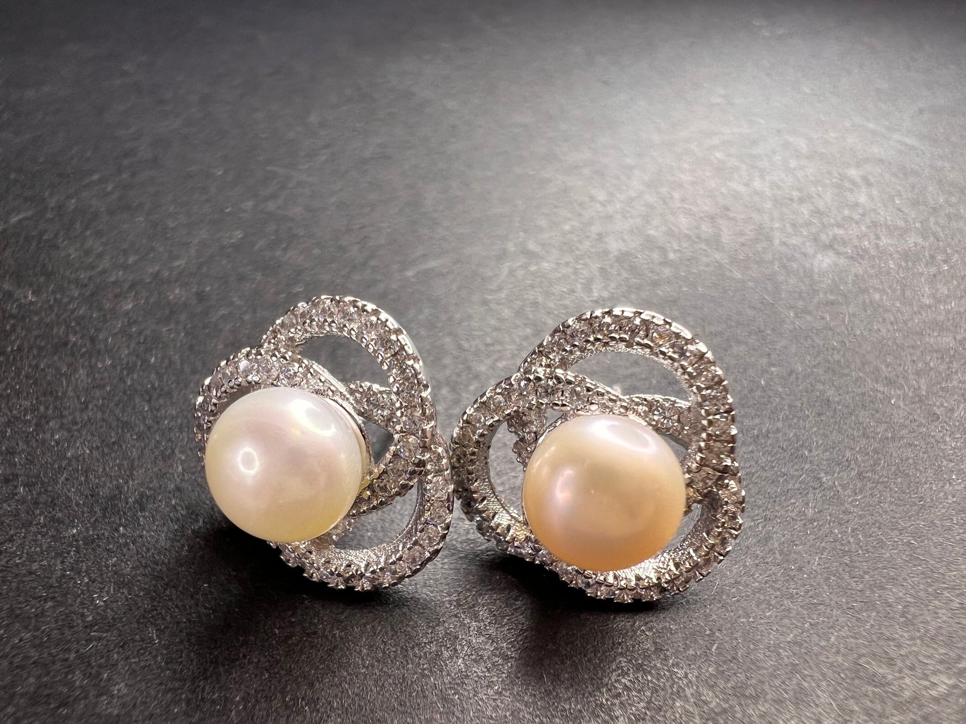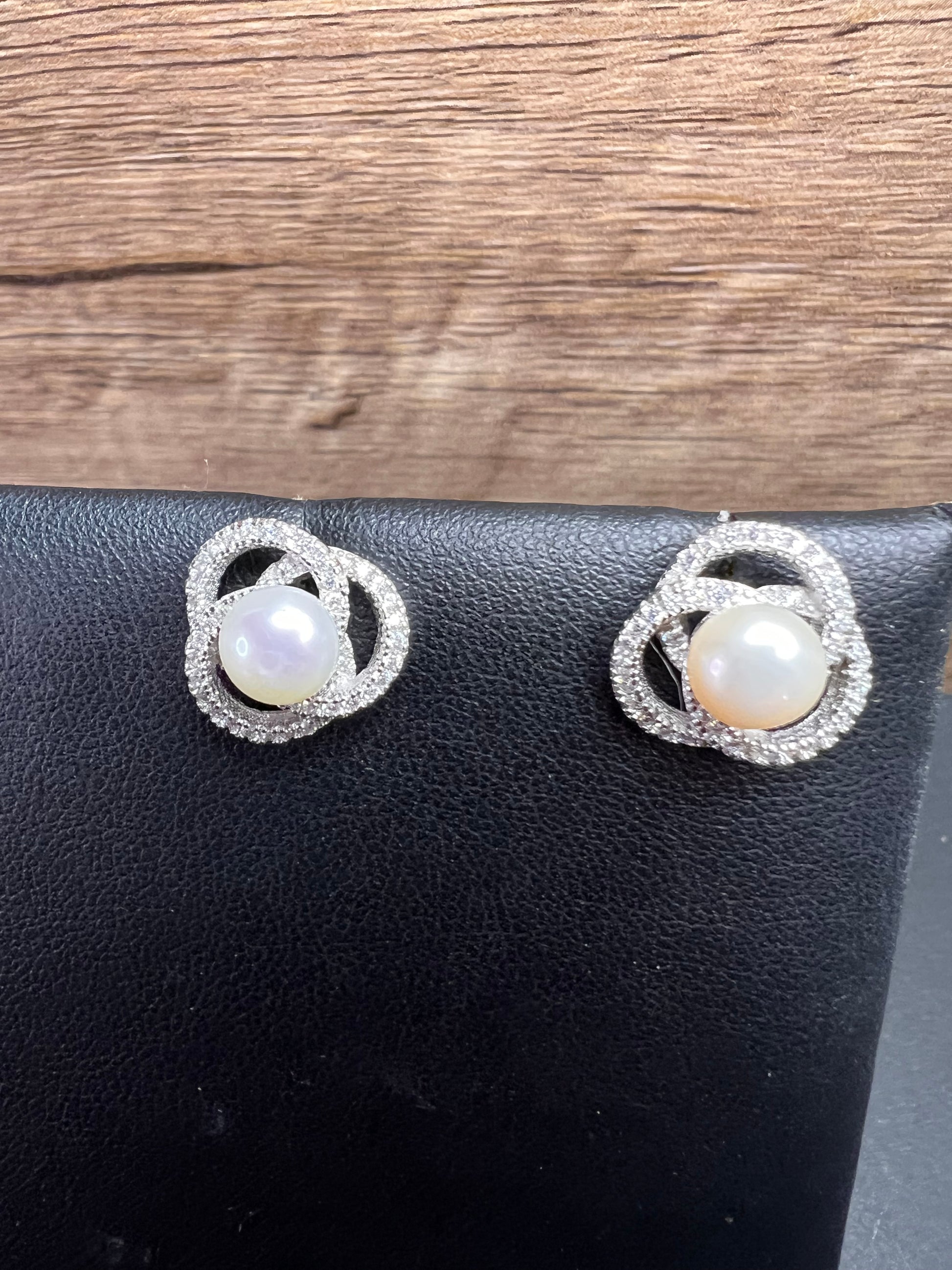 Genuine white cultured pearls set in 925 sterling silver. Please note before making this purchase that both pearls are not exactly the same color as perfectly matched pearls usually fetch higher prices. Colorless/ white accent stones are cubic zirconia. Sterling silver likely is plated with rhodium to slow down tarnishing.