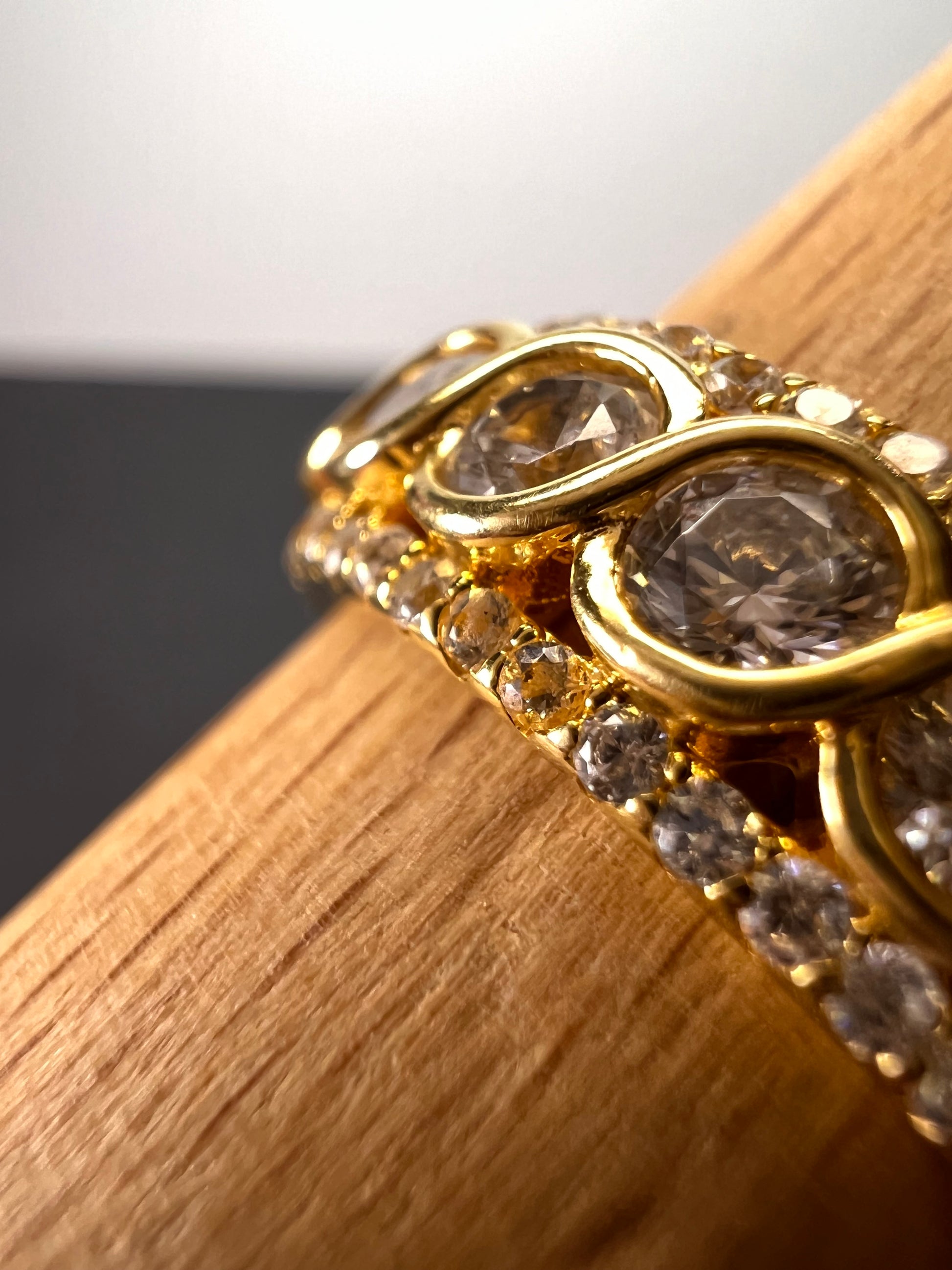 White cubic zirconia stones set in a 14-18k yellow gold plated over sterling silver size 11 ring.