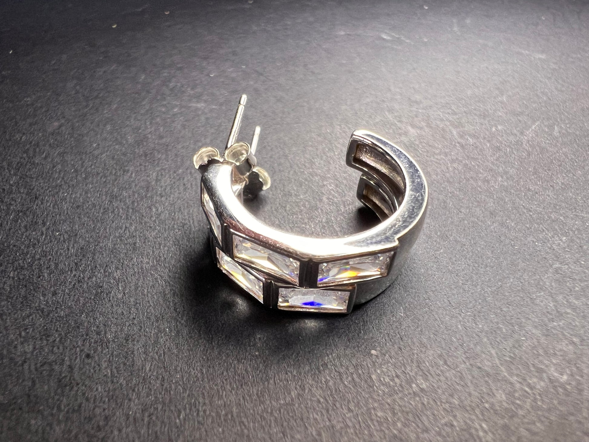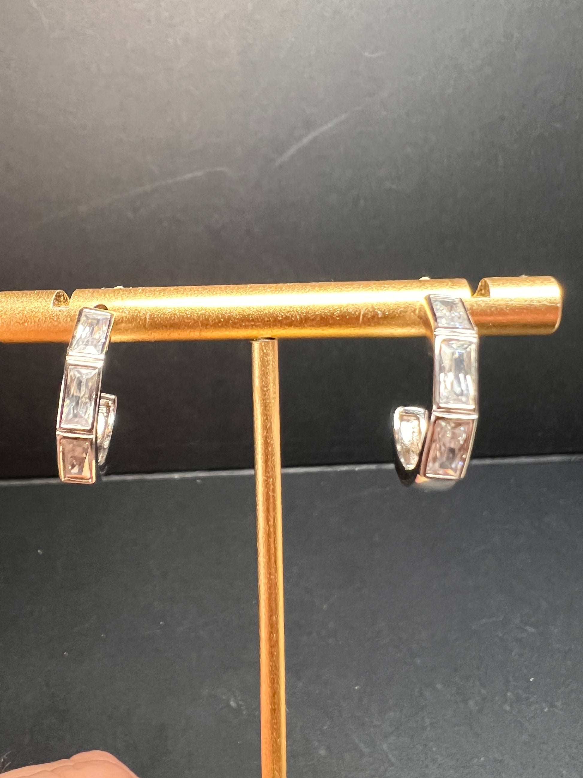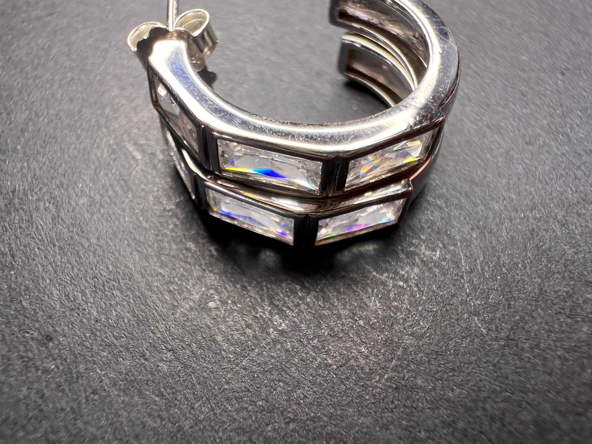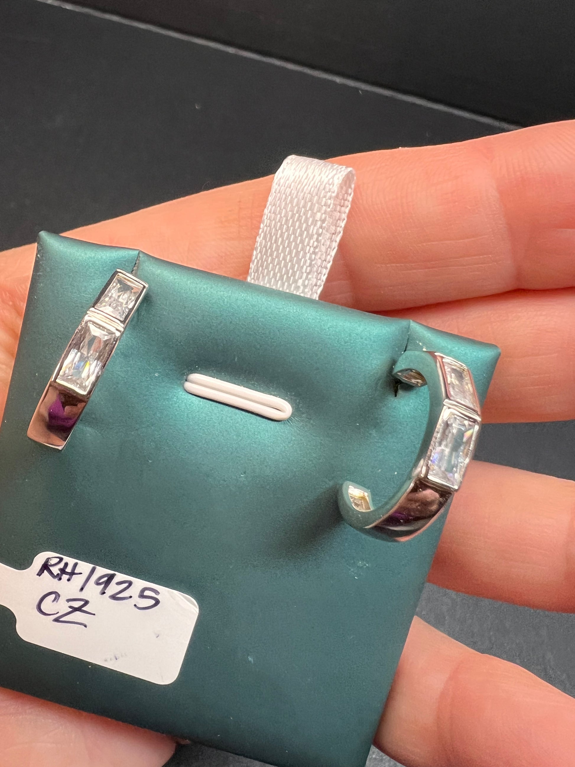 White/ colorless cubic zirconia rectangle cut gemstones x3 in each earring, bezel set. Base metal is 925 sterling silver with plating of either platinum or rhodium. YGI 925 CN