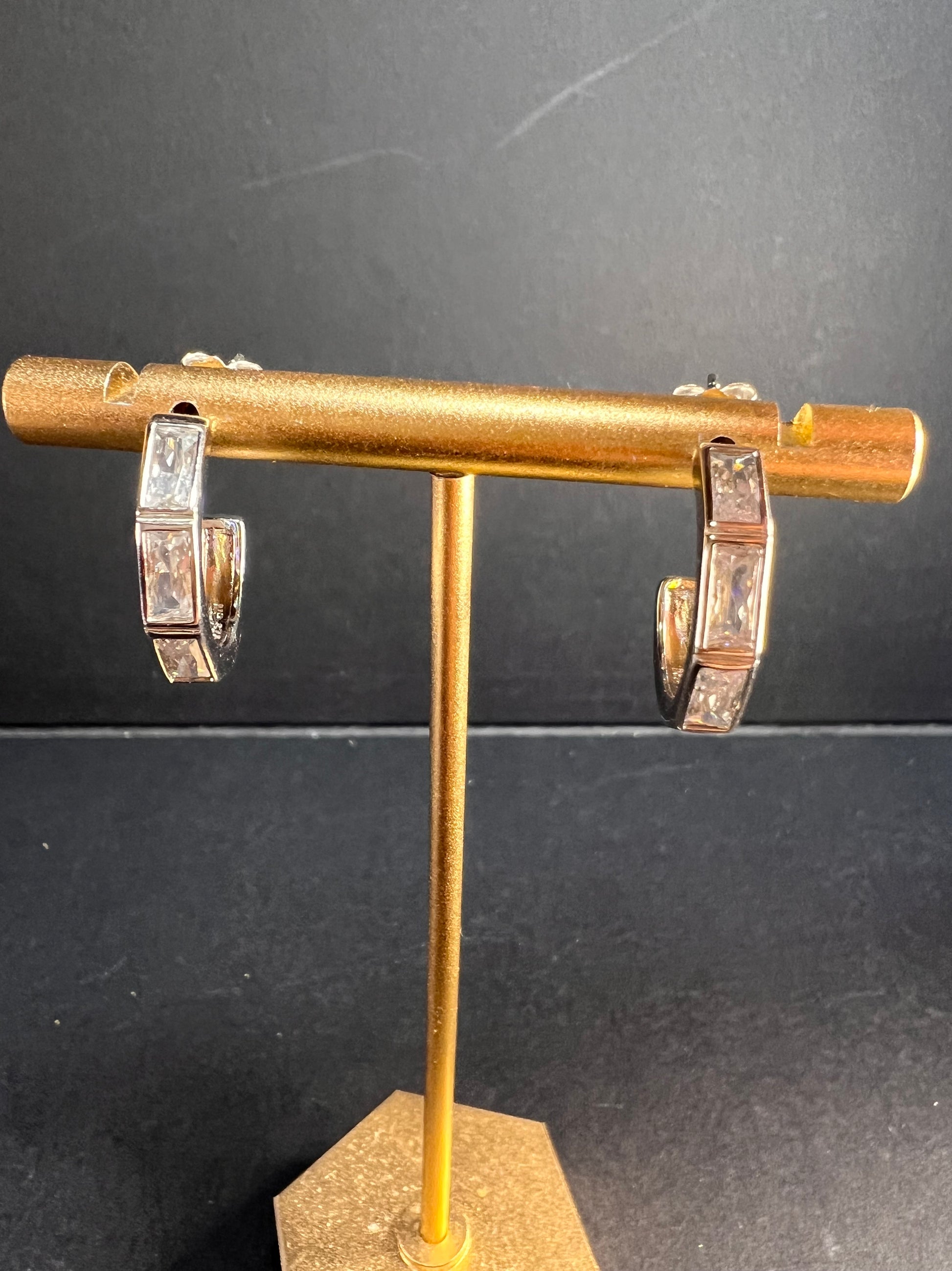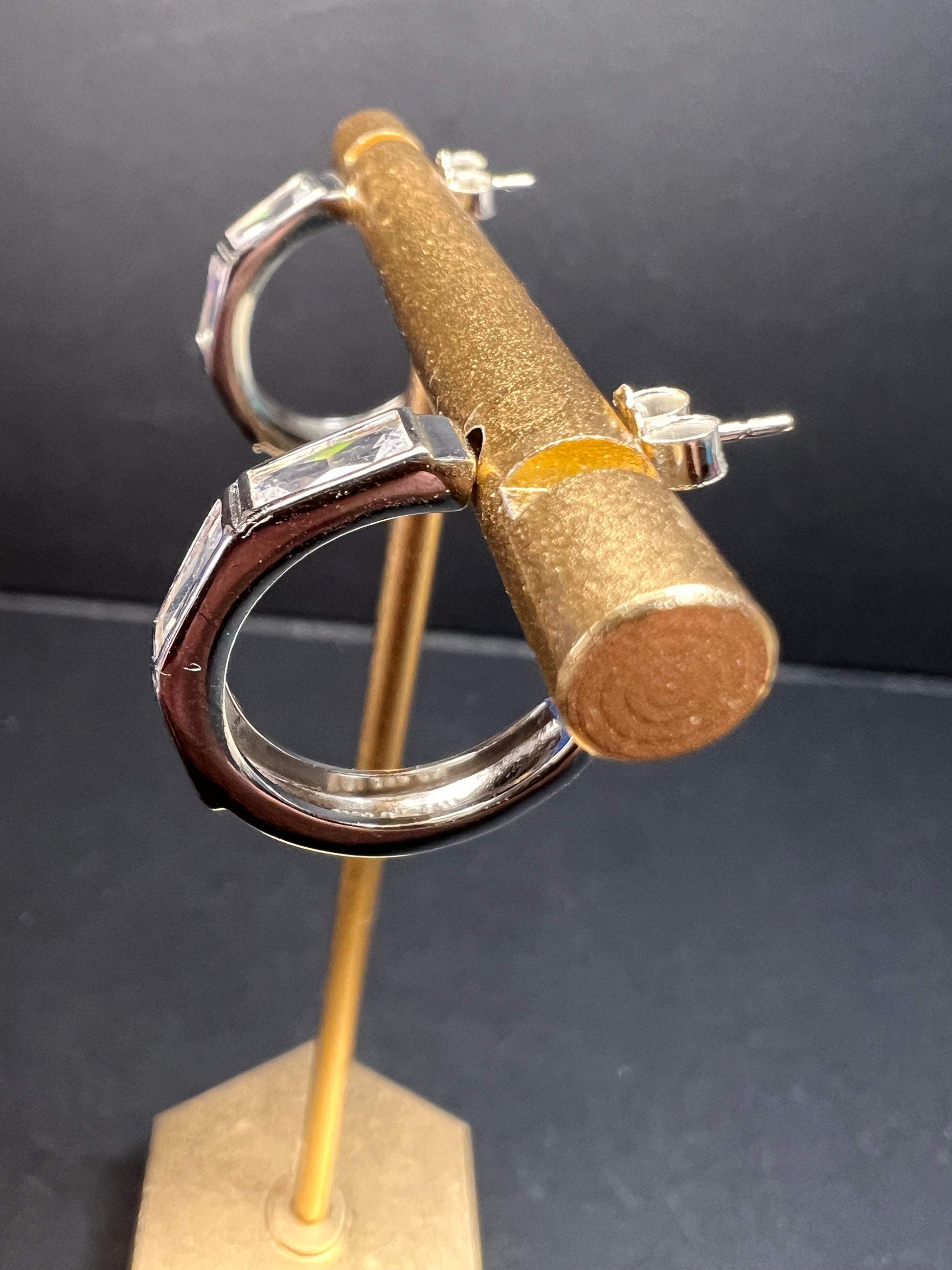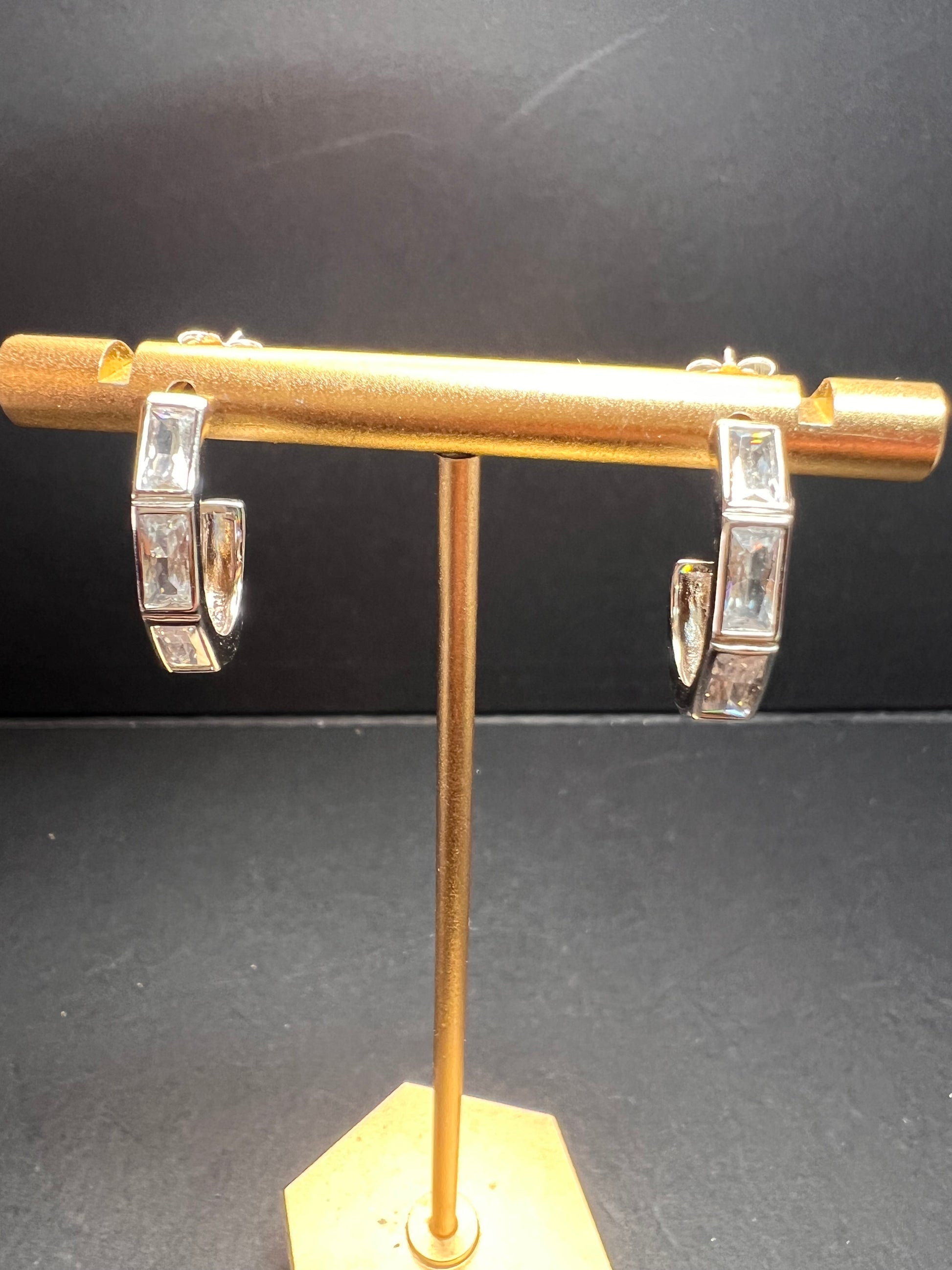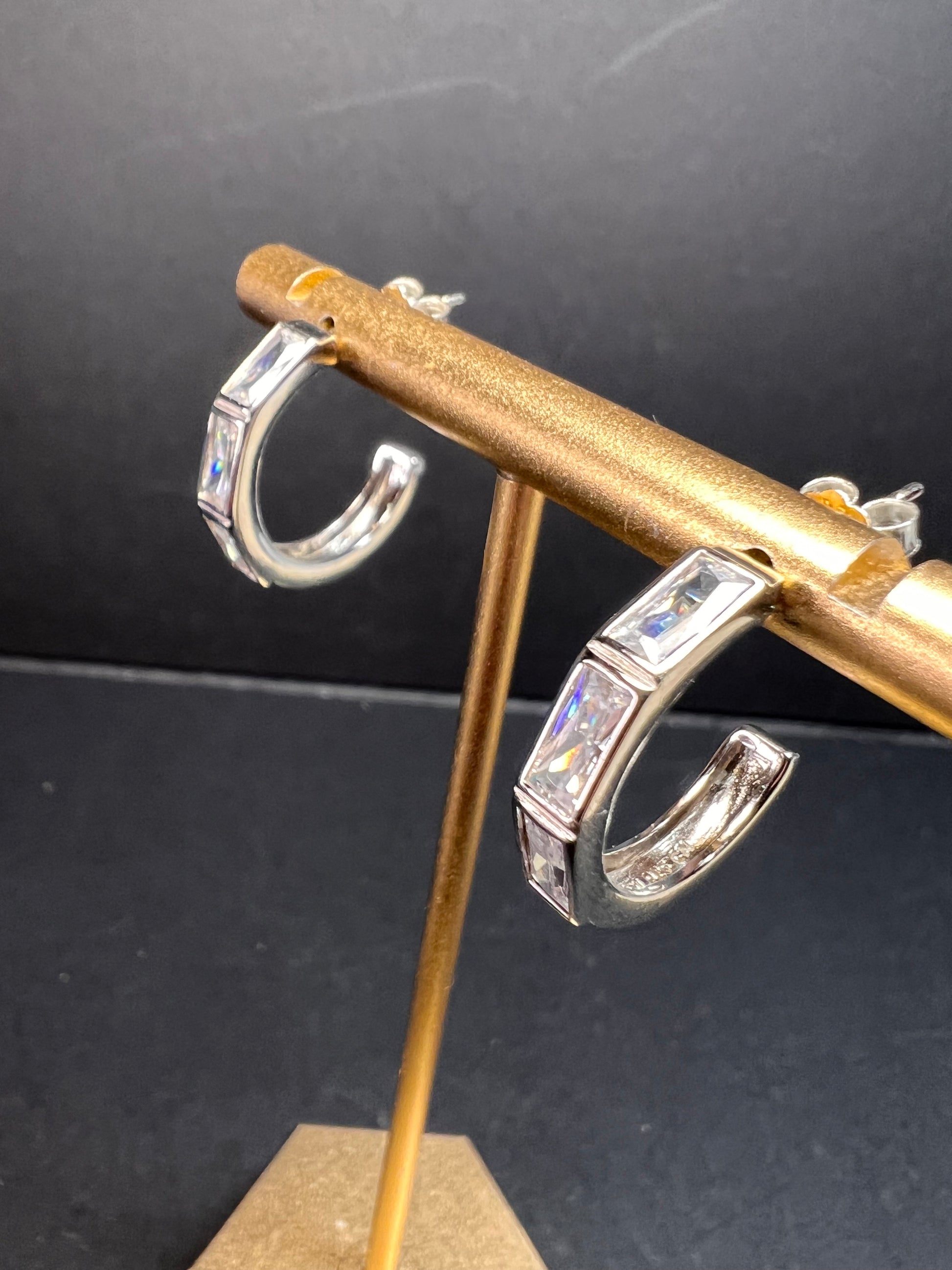 White/ colorless cubic zirconia rectangle cut gemstones x3 in each earring, bezel set. Base metal is 925 sterling silver with plating of either platinum or rhodium. YGI 925 CN