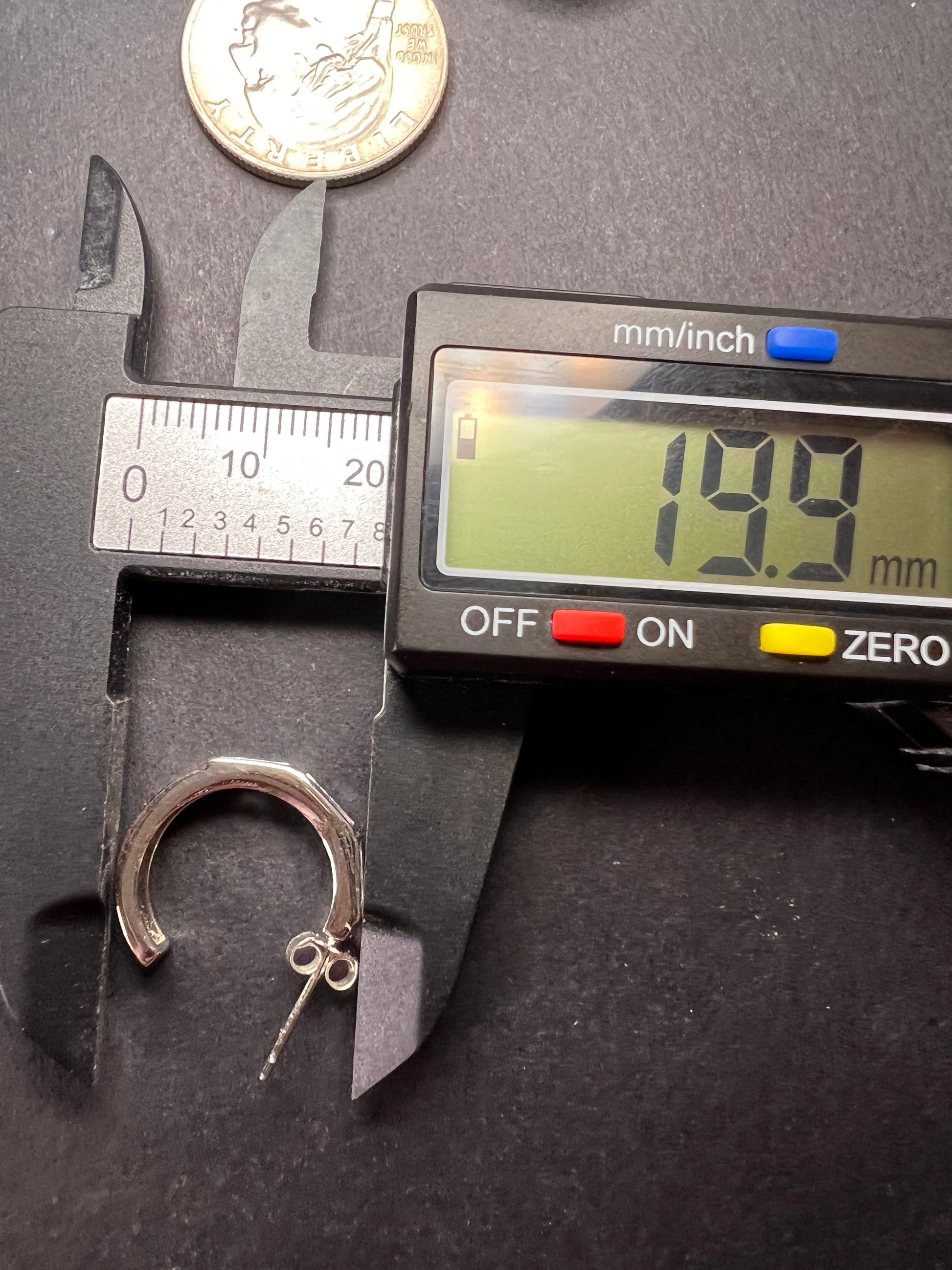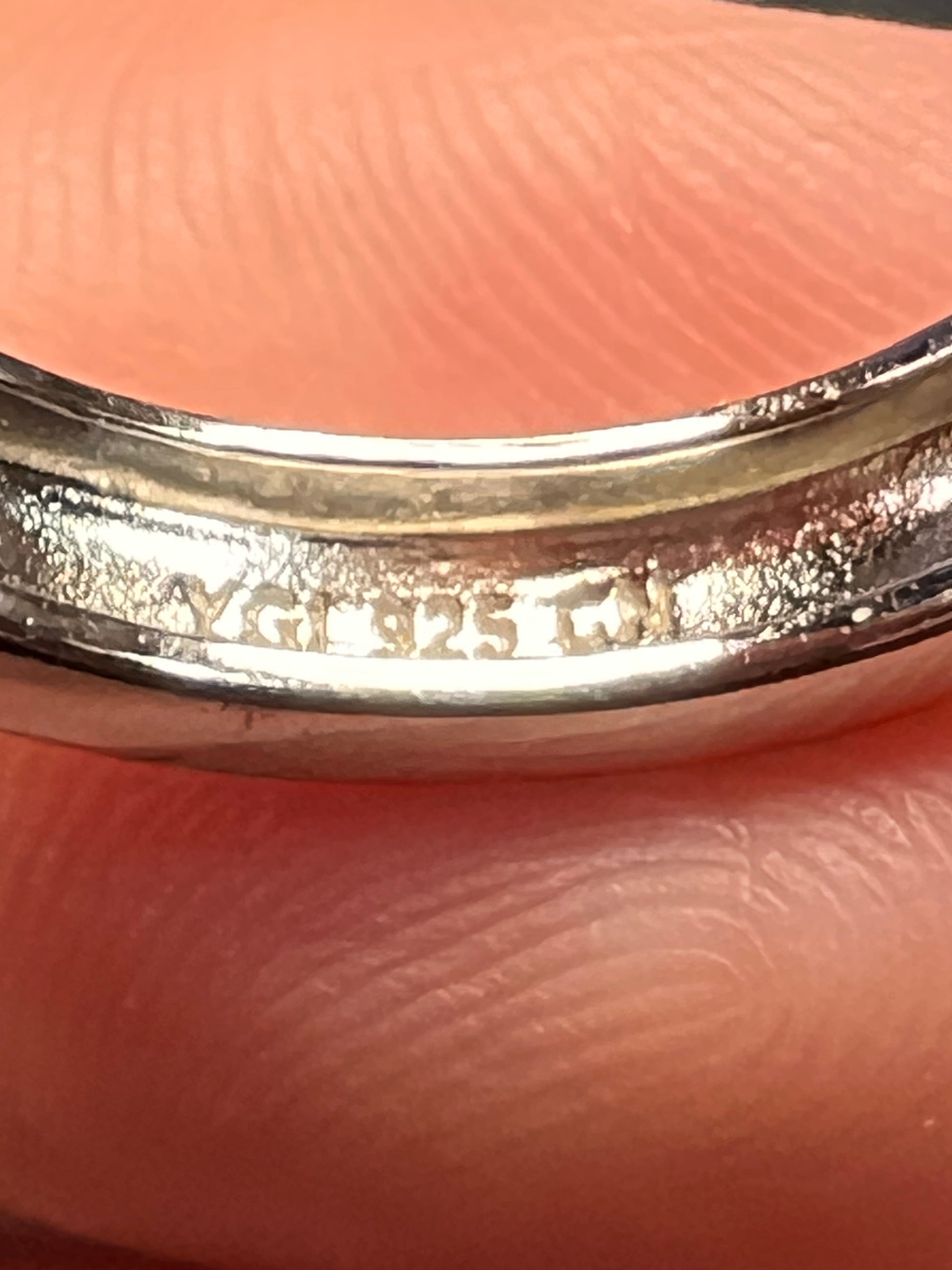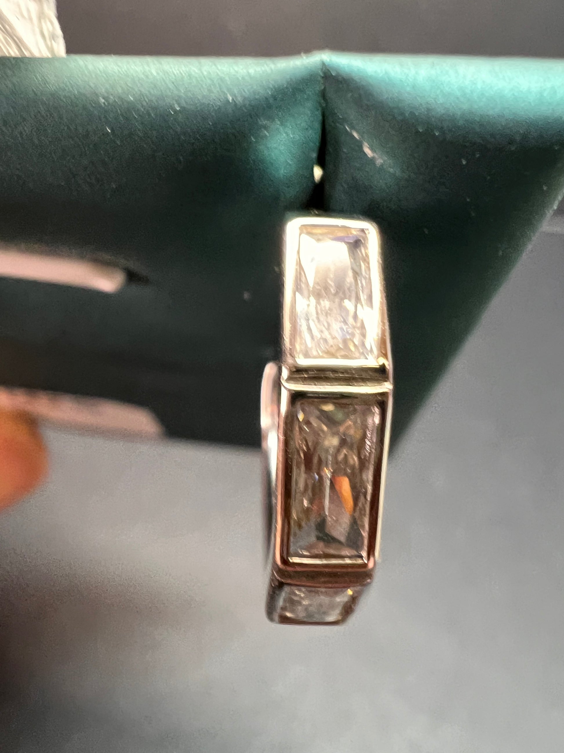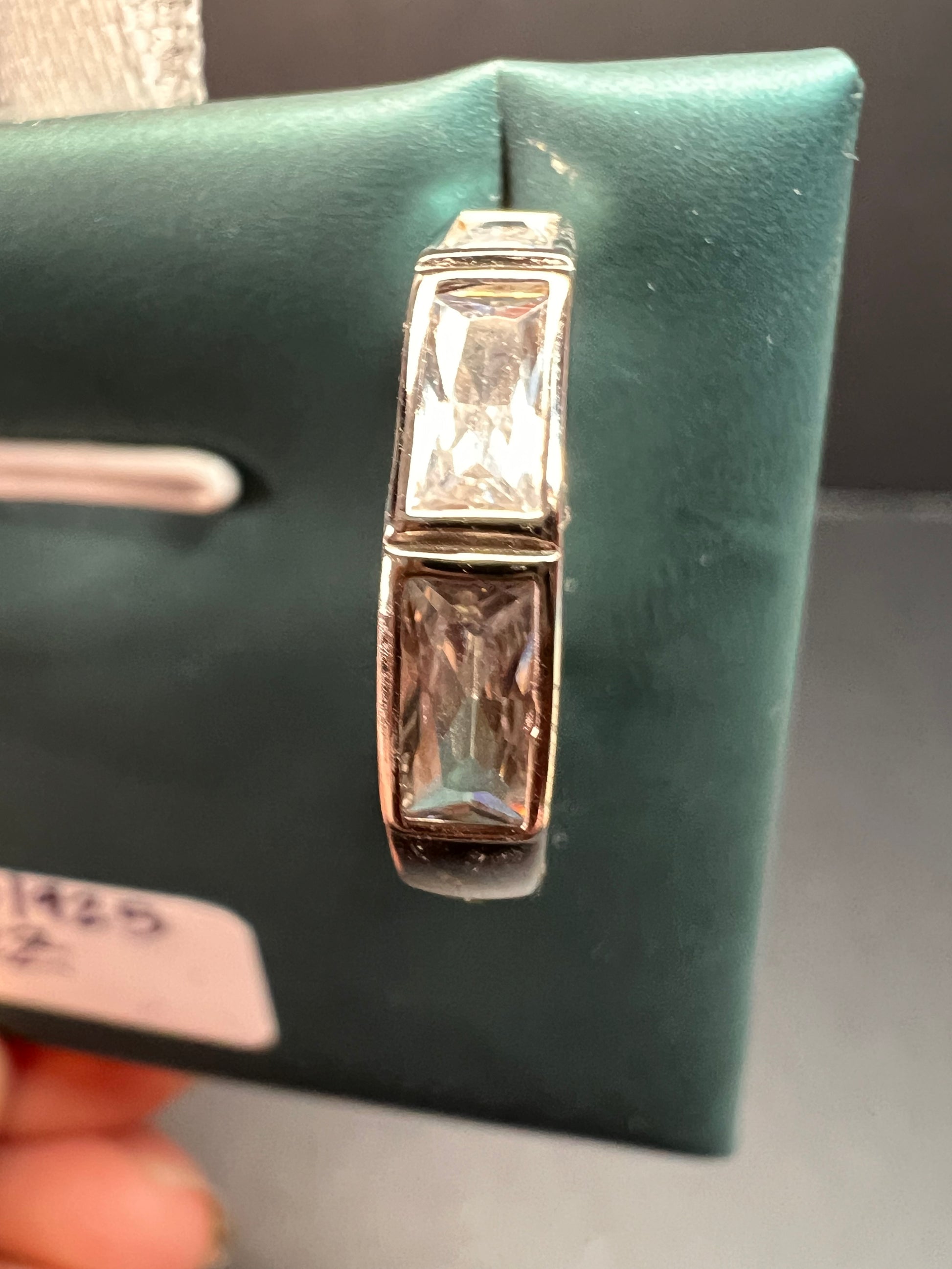 White/ colorless cubic zirconia rectangle cut gemstones x3 in each earring, bezel set. Base metal is 925 sterling silver with plating of either platinum or rhodium. YGI 925 CN