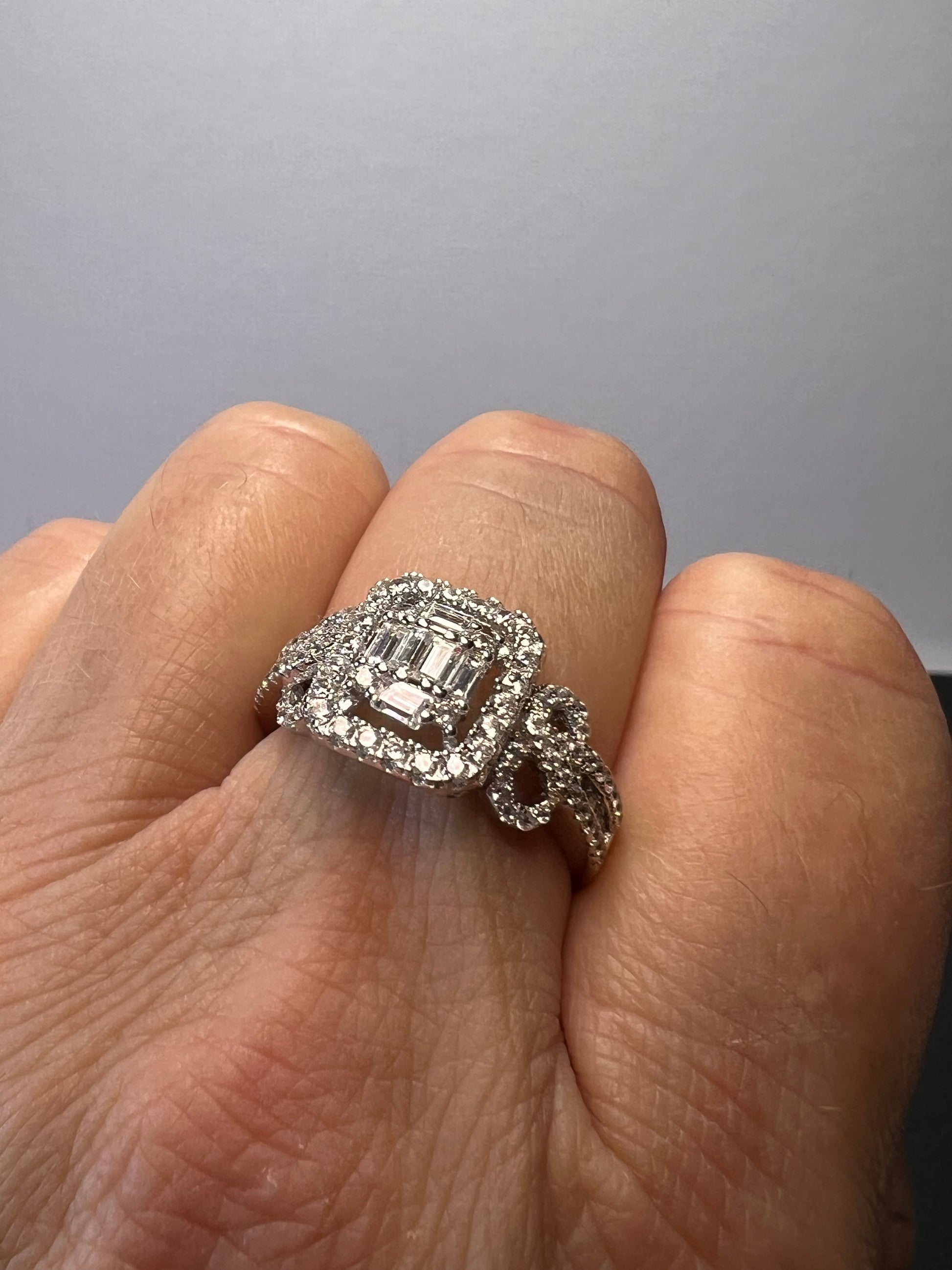 Rhodium plated over sterling silver. White cubic zirconia stones throughout. Very similar to a Vera wang design. Size 9 . 925 GM CN
