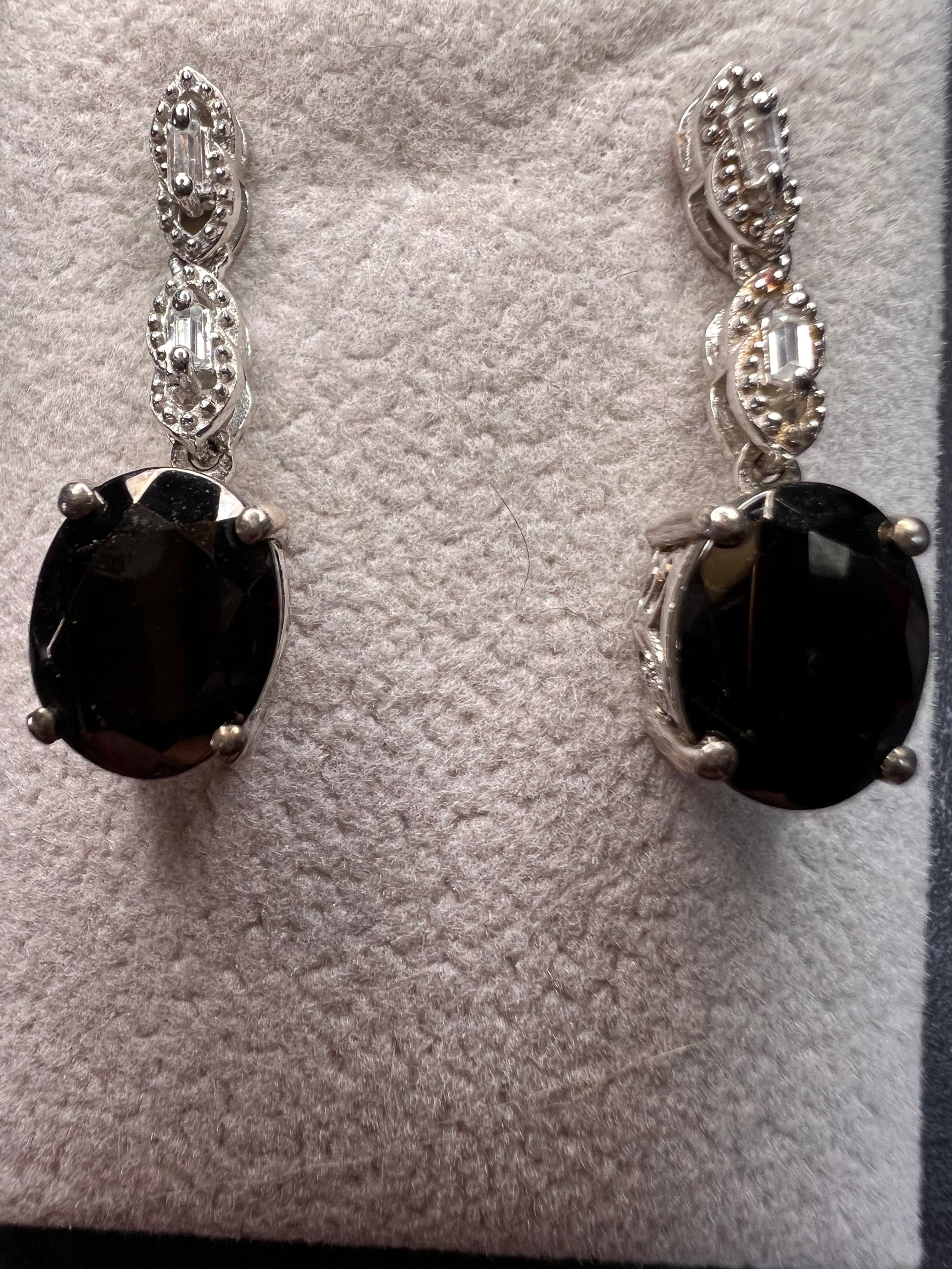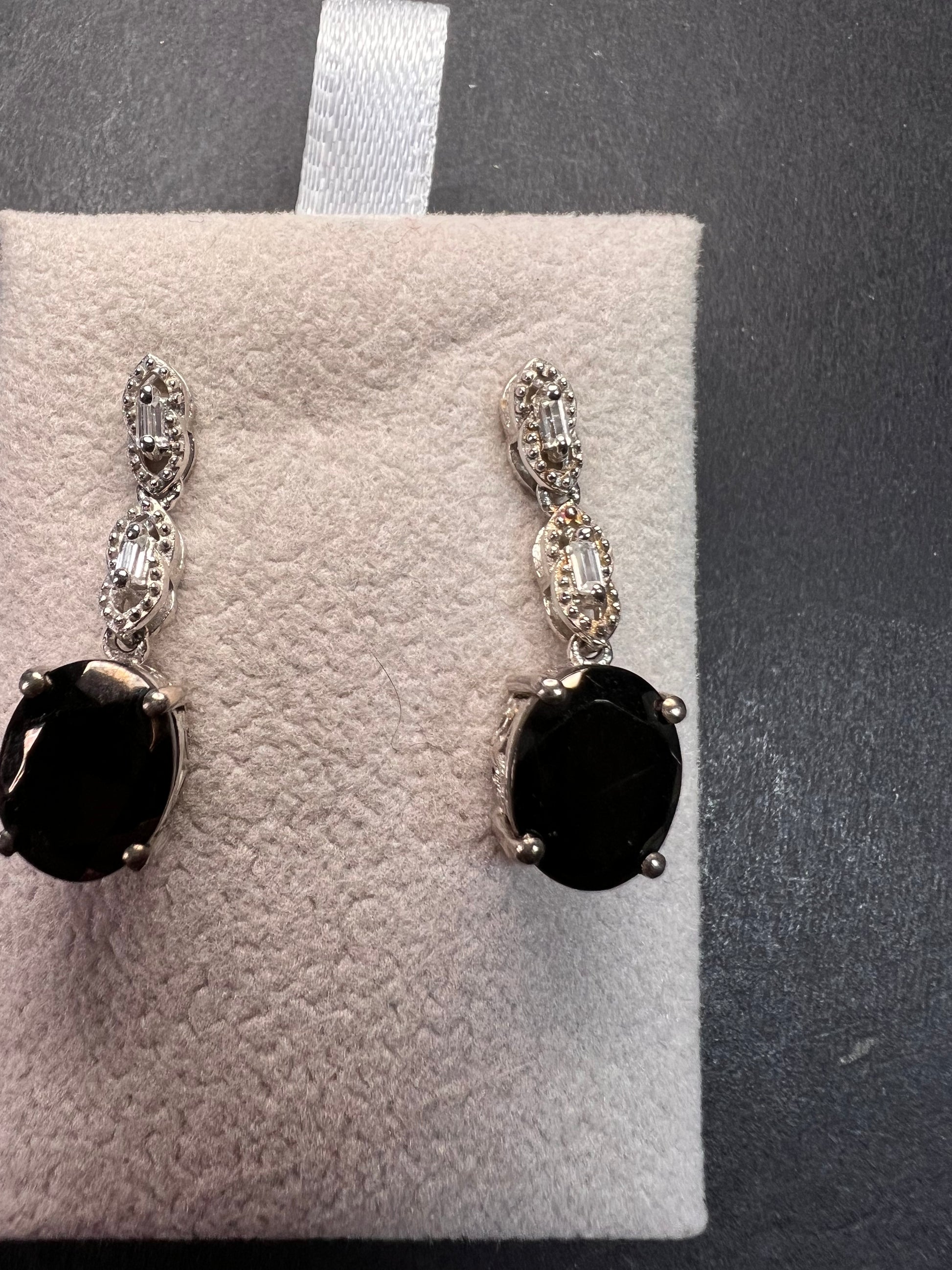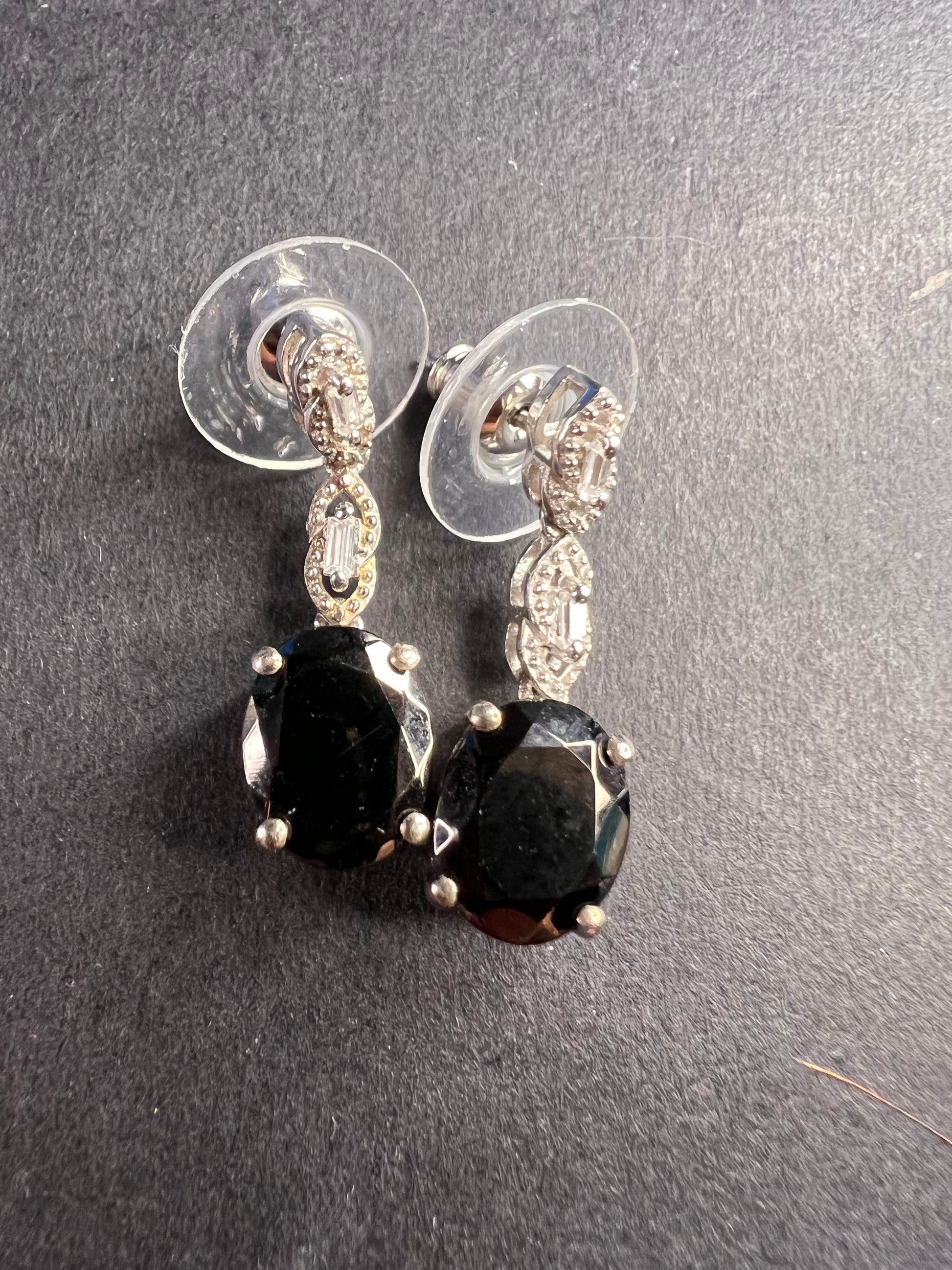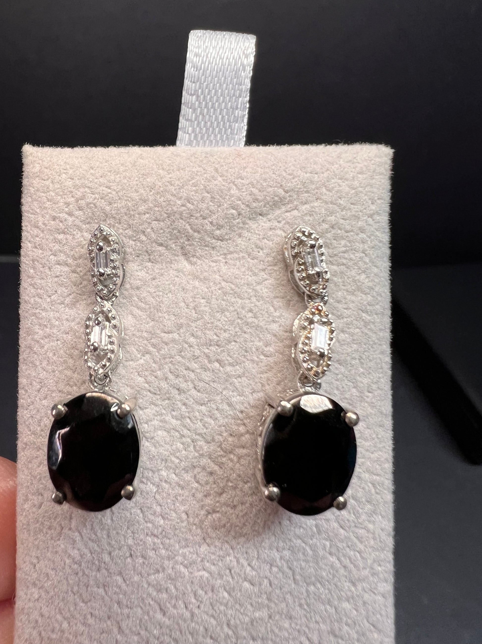 Genuine elite Shungite oval cut gemstones prong set in authentic 925 sterling silver. White / colorless baguette gemstones test as topaz but could also be zircon as well. Sterling silver is plated with platinum I believe but could also be rhodium. Comes with plastic disc backs. Earrings measure roughly about an inch in length. Stamped Djoy 925