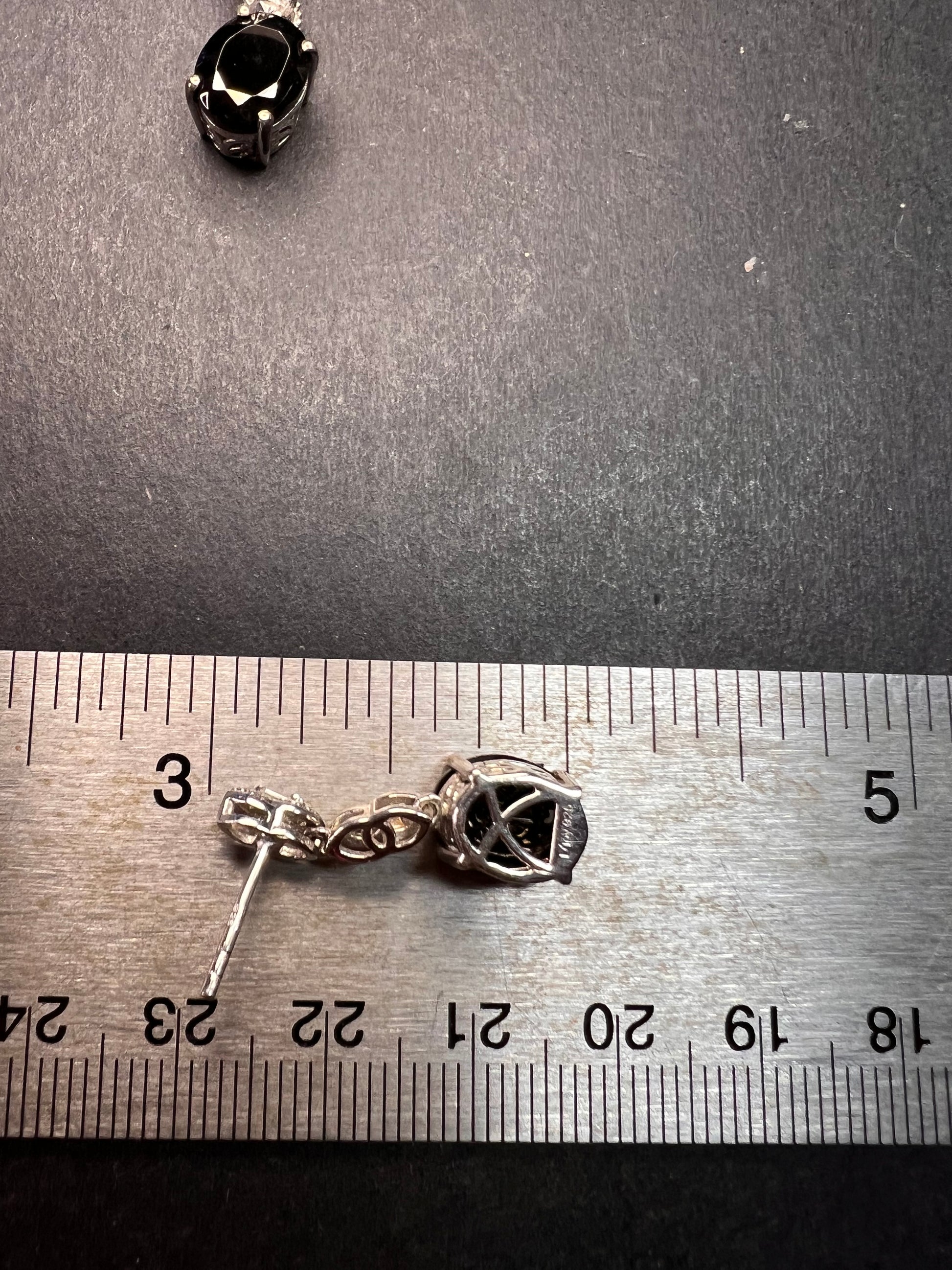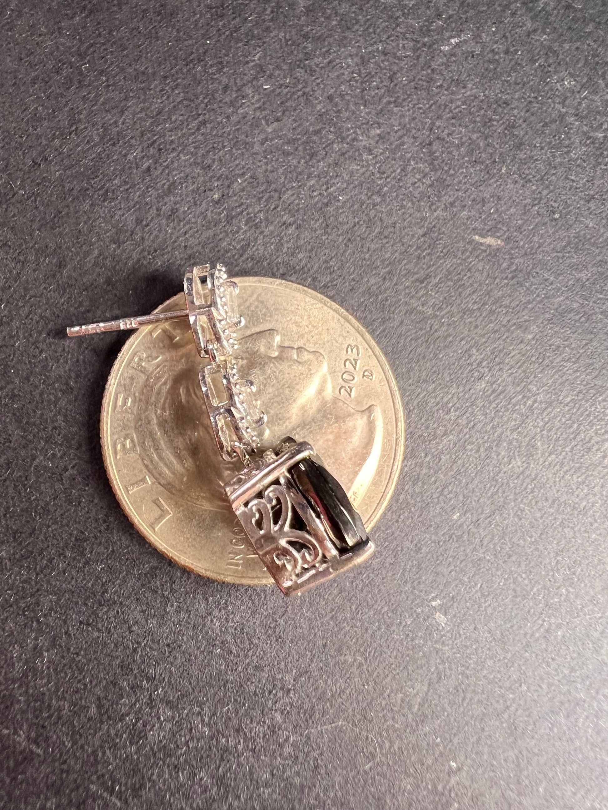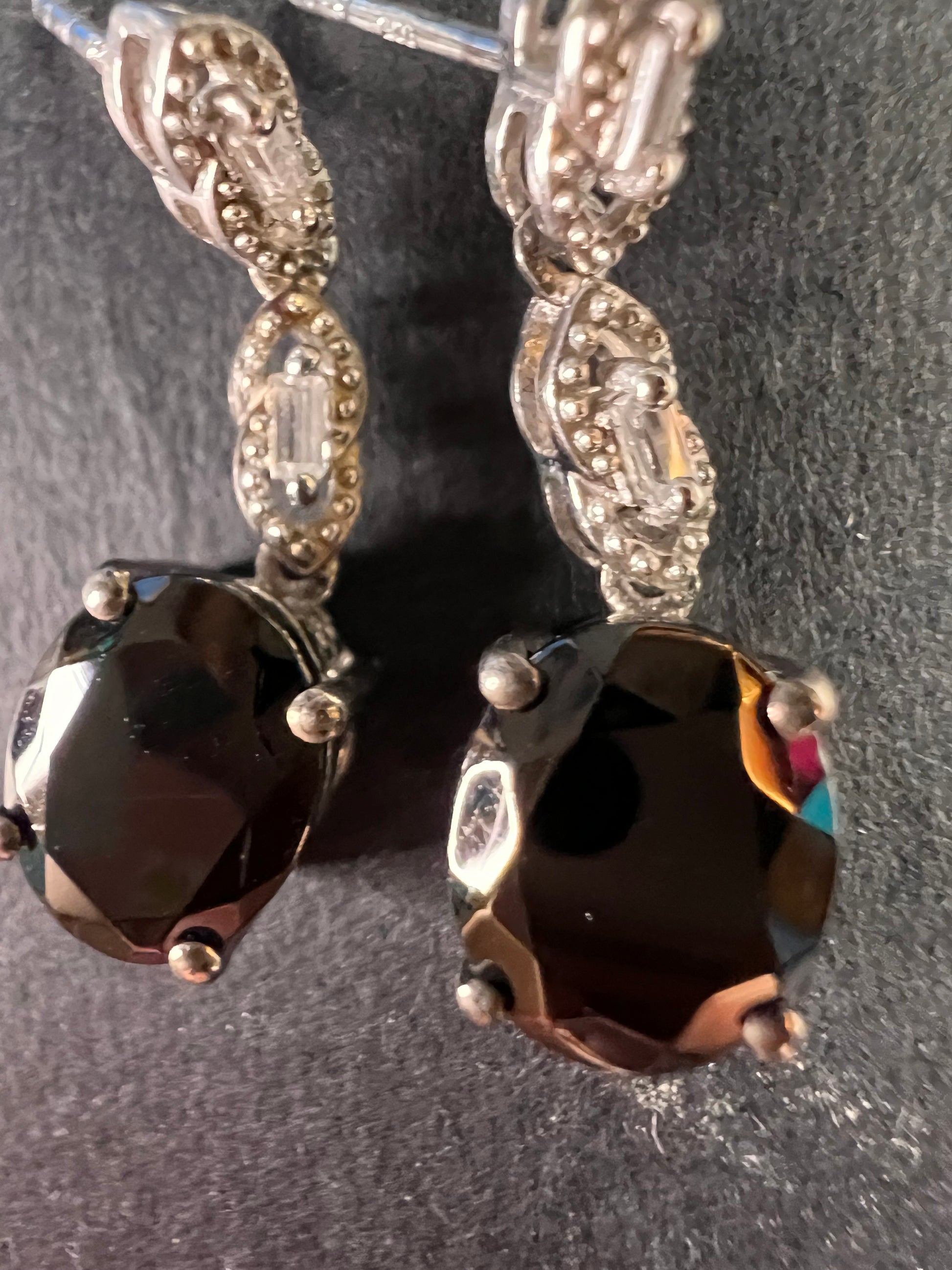 Genuine elite Shungite oval cut gemstones prong set in authentic 925 sterling silver. White / colorless baguette gemstones test as topaz but could also be zircon as well. Sterling silver is plated with platinum I believe but could also be rhodium. Comes with plastic disc backs. Earrings measure roughly about an inch in length. Stamped Djoy 925