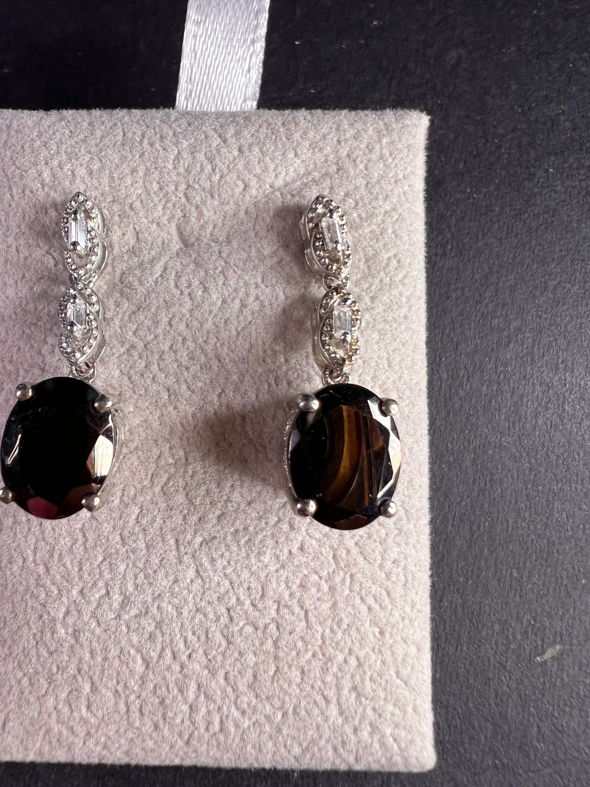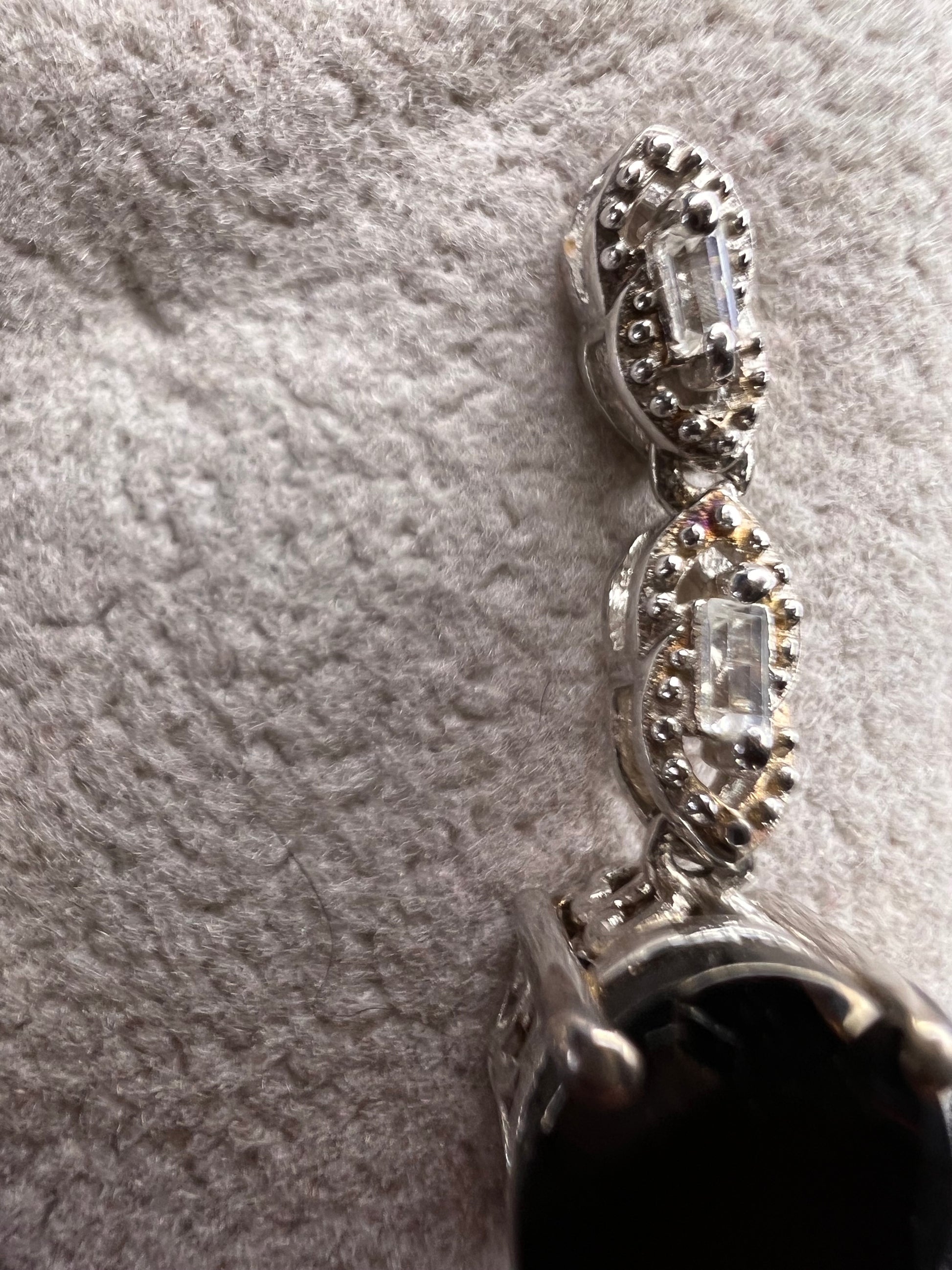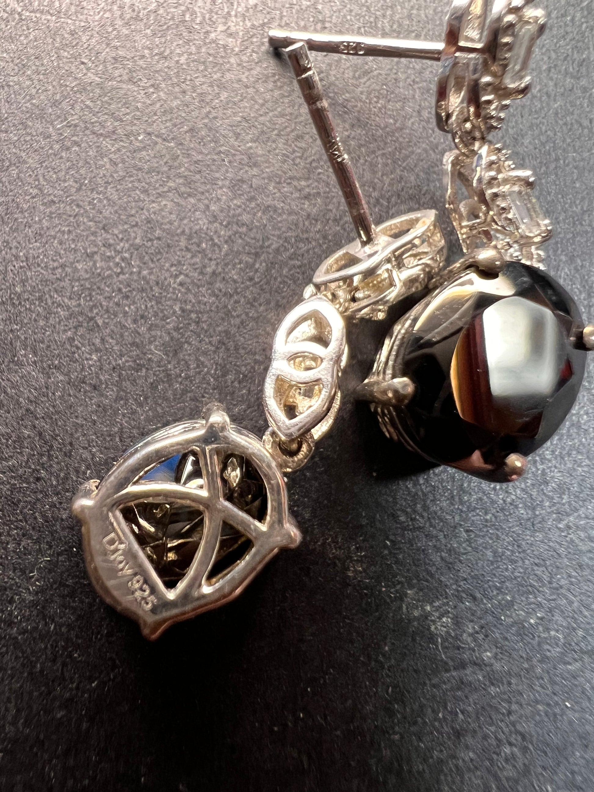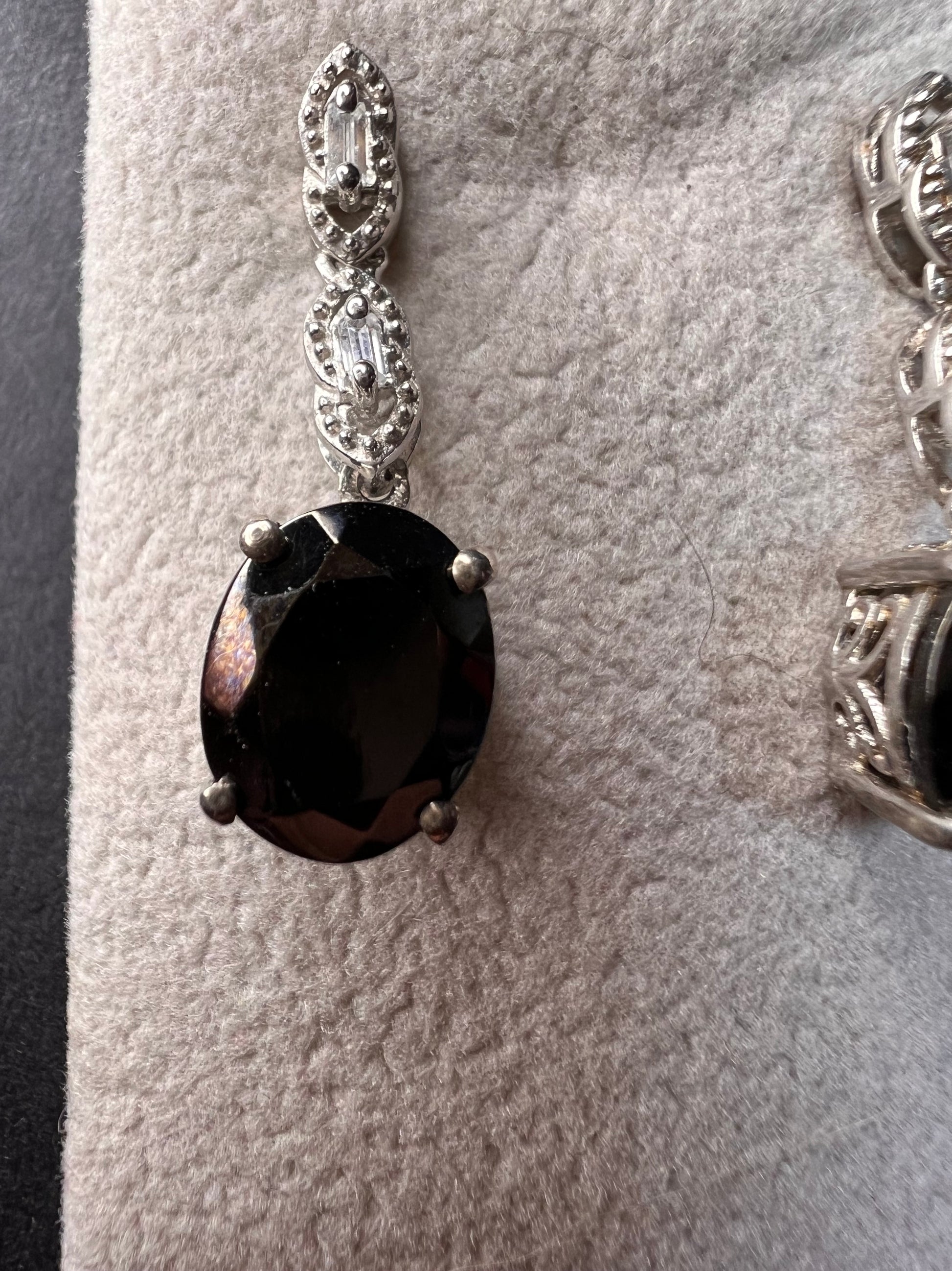 Genuine elite Shungite oval cut gemstones prong set in authentic 925 sterling silver. White / colorless baguette gemstones test as topaz but could also be zircon as well. Sterling silver is plated with platinum I believe but could also be rhodium. Comes with plastic disc backs. Earrings measure roughly about an inch in length. Stamped Djoy 925
