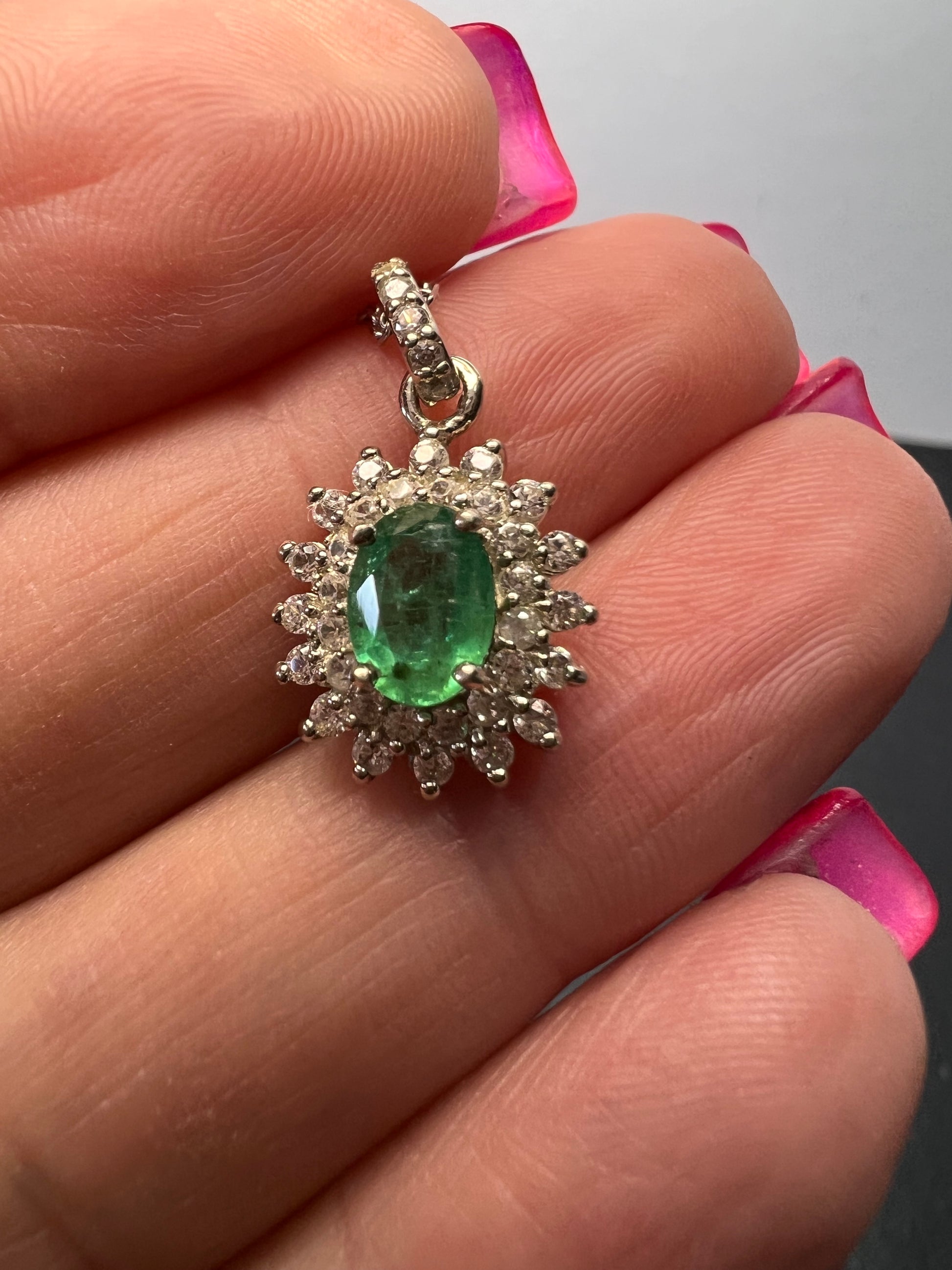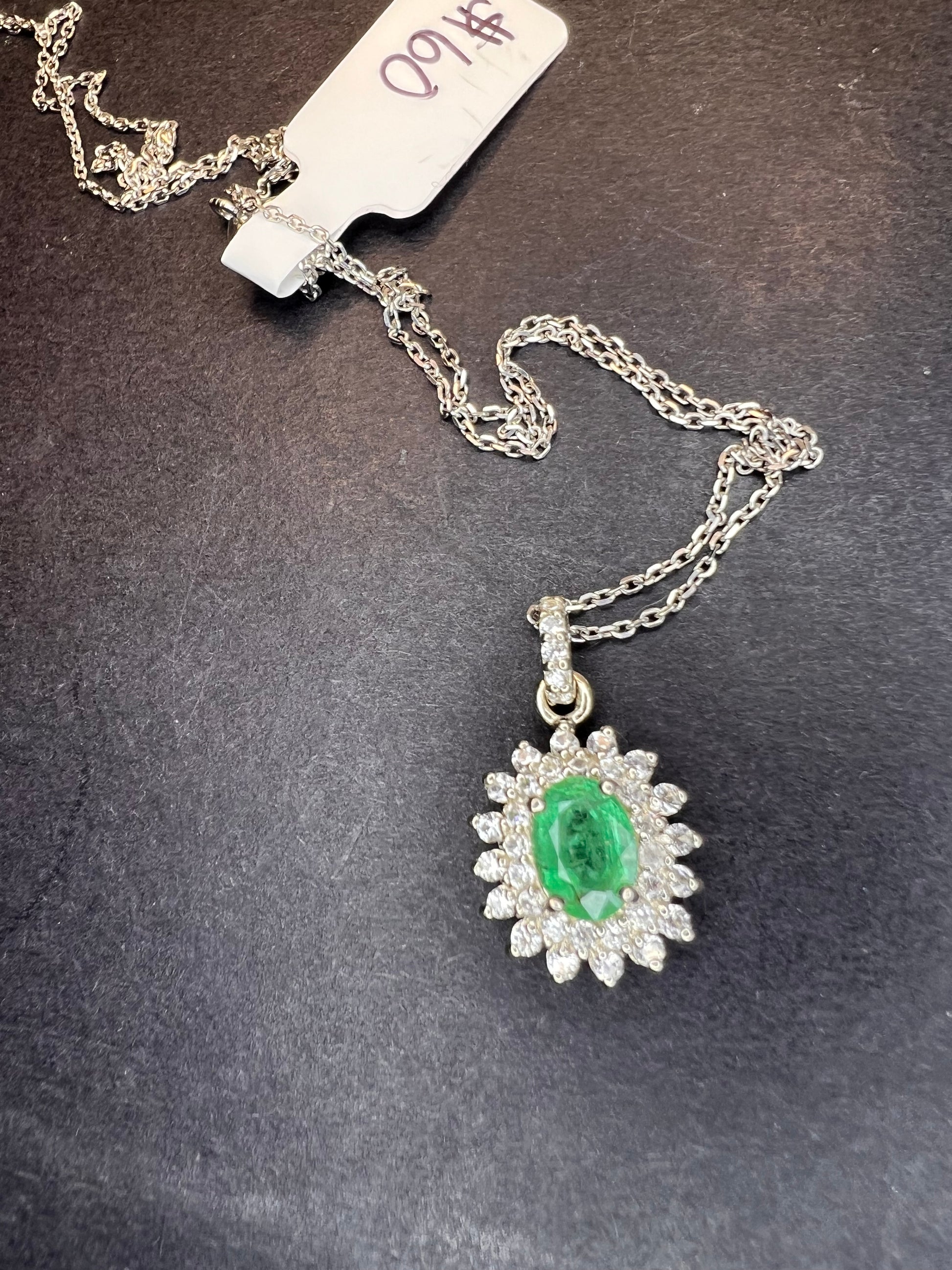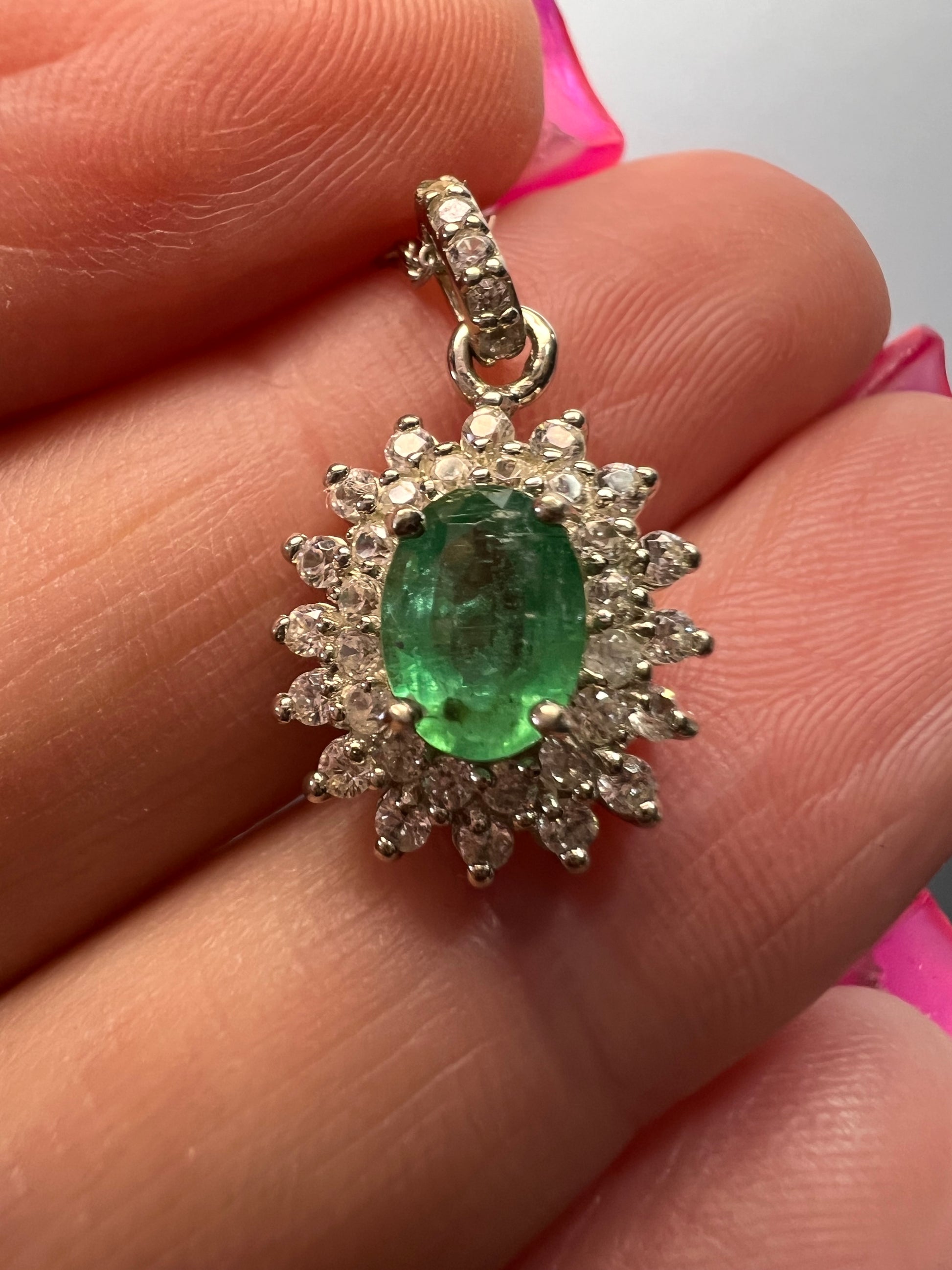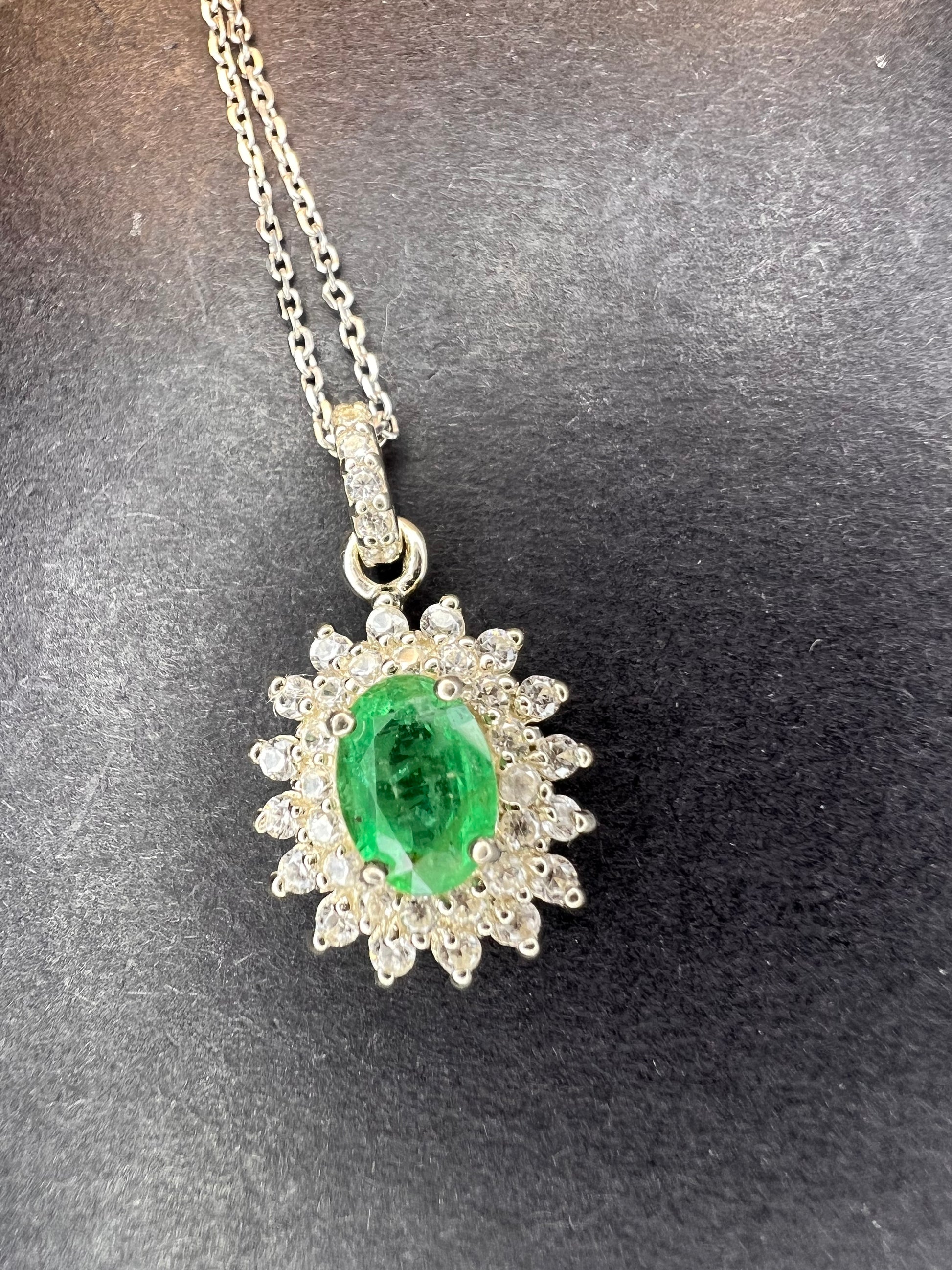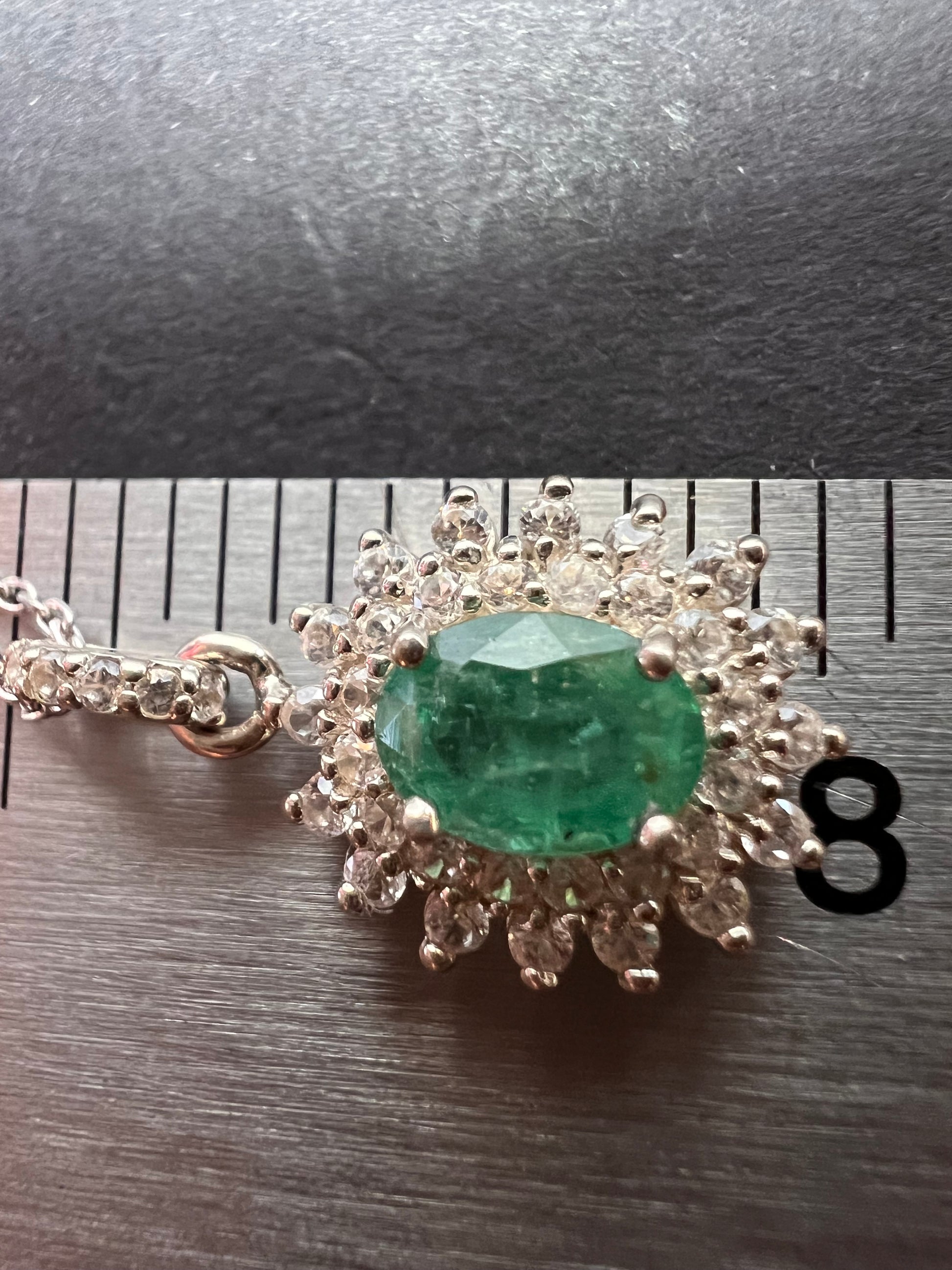 AAA Zambian emerald stone in the center surrounded by white zircon accents around the halo and bale. This is platinum plated over sterling silver. Chain measures 18 inches. Emerald stone has been treated for color. Estimated retail value is over $1,500. This information came from the website the original owner purchased it from. The AAA rating on this emerald comes directly from the website it was originally purchased from, not my own rating or opinion.