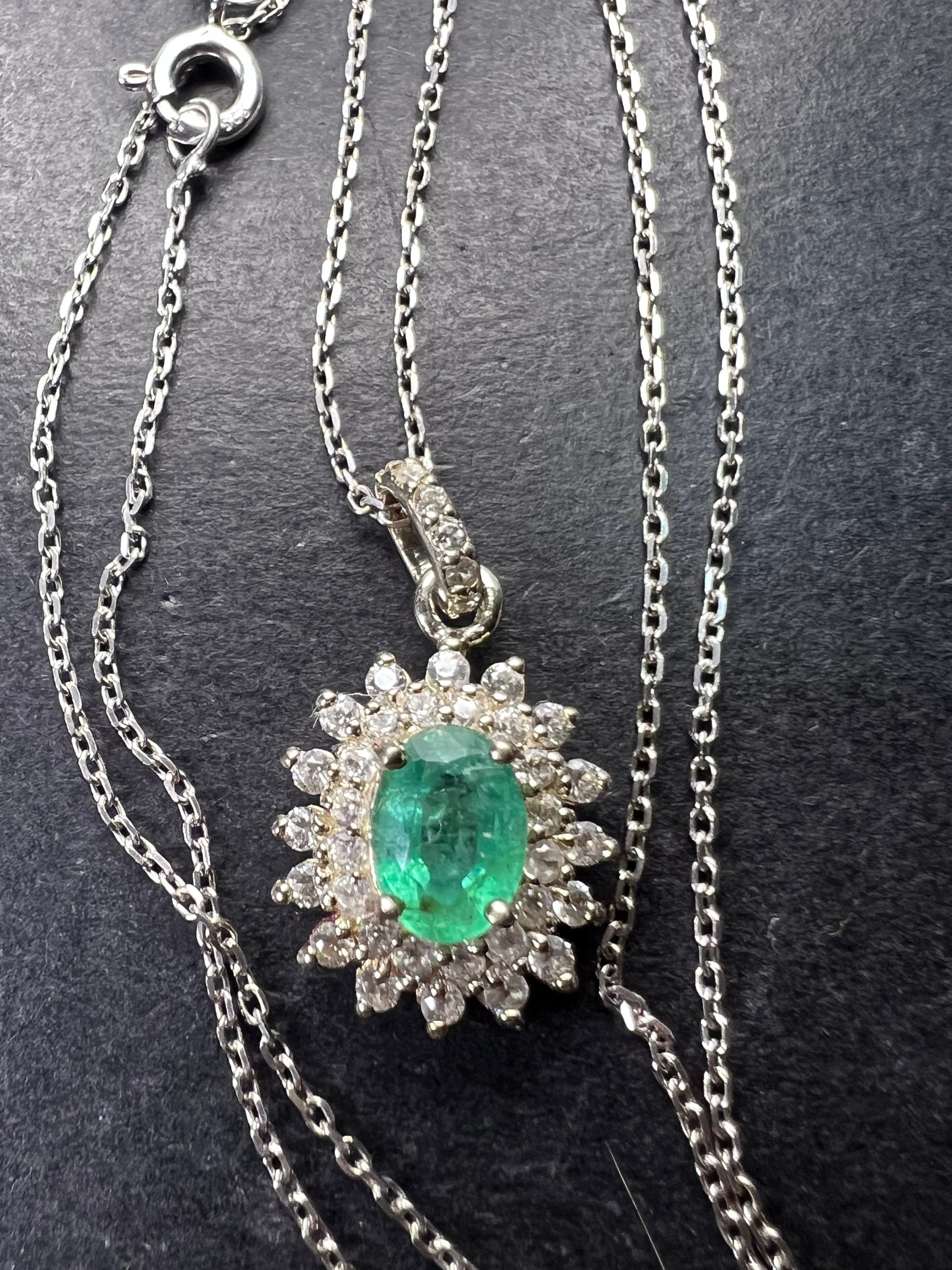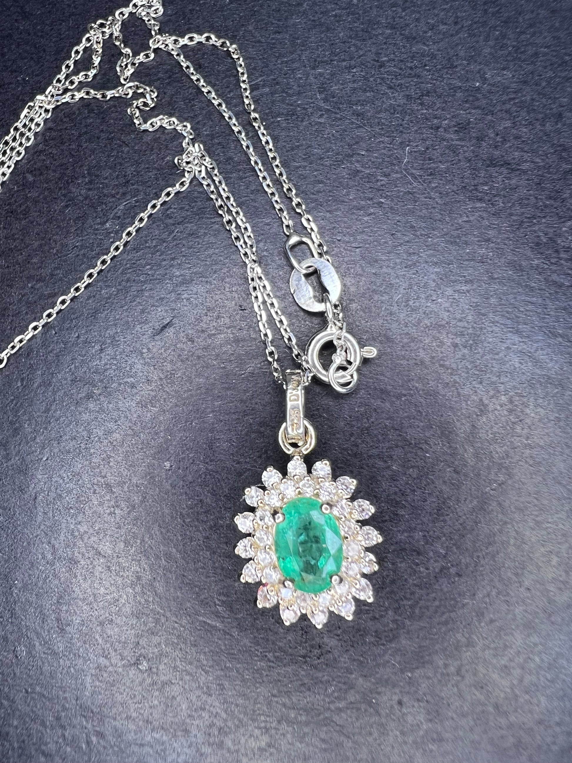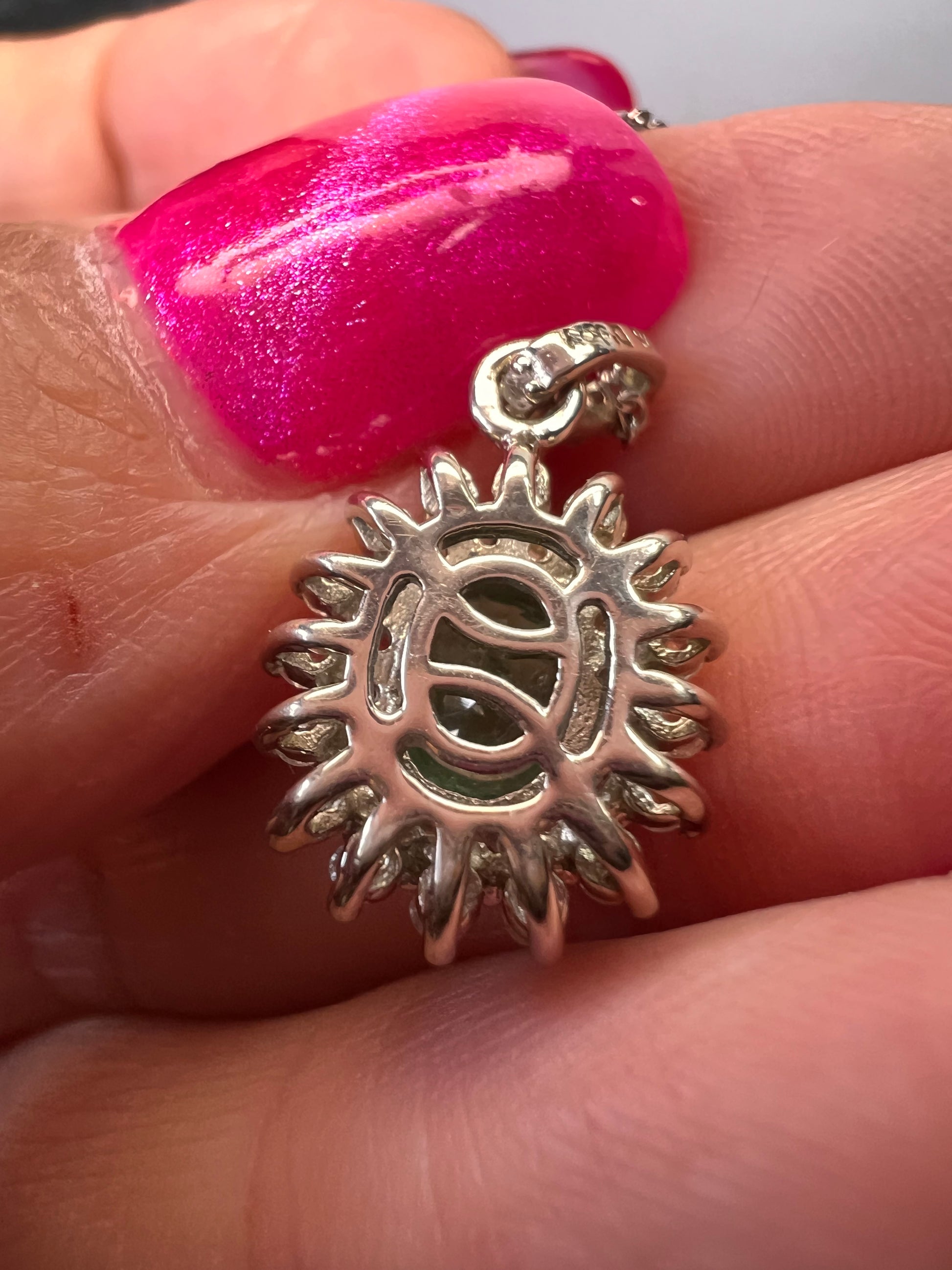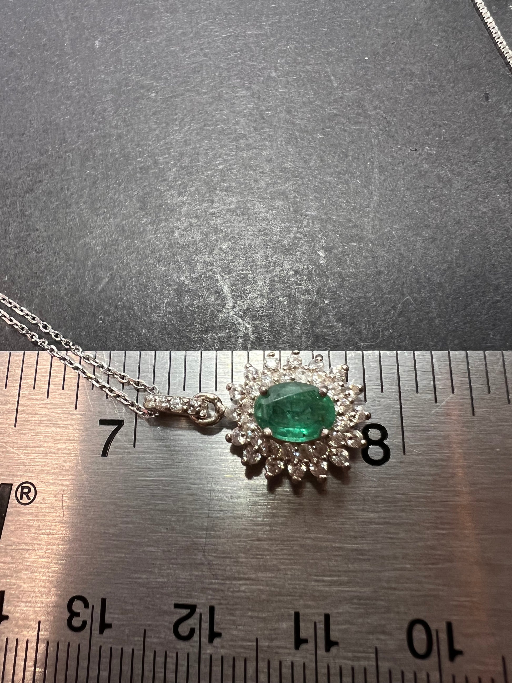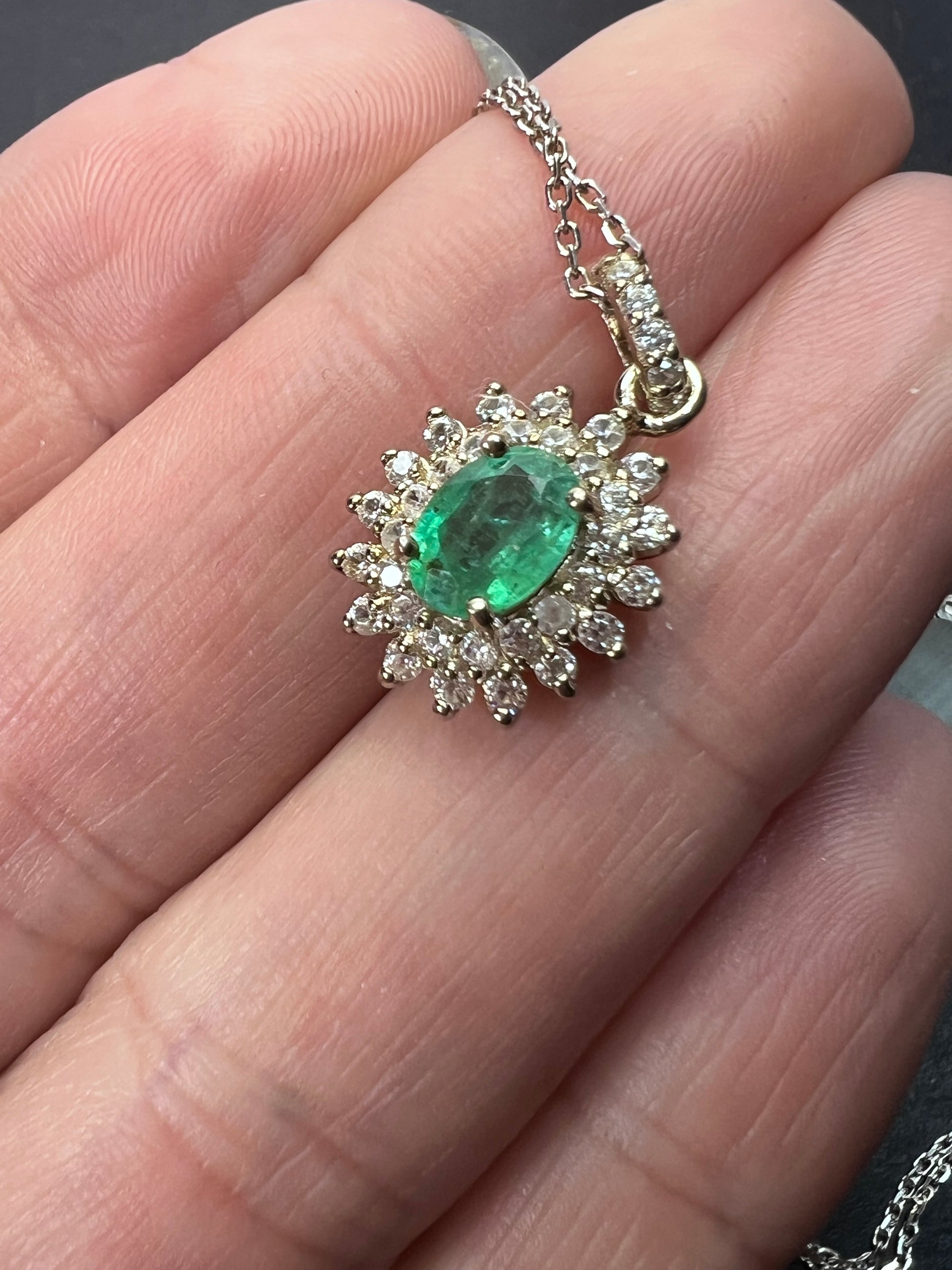 AAA Zambian emerald stone in the center surrounded by white zircon accents around the halo and bale. This is platinum plated over sterling silver. Chain measures 18 inches. Emerald stone has been treated for color. Estimated retail value is over $1,500. This information came from the website the original owner purchased it from. The AAA rating on this emerald comes directly from the website it was originally purchased from, not my own rating or opinion.