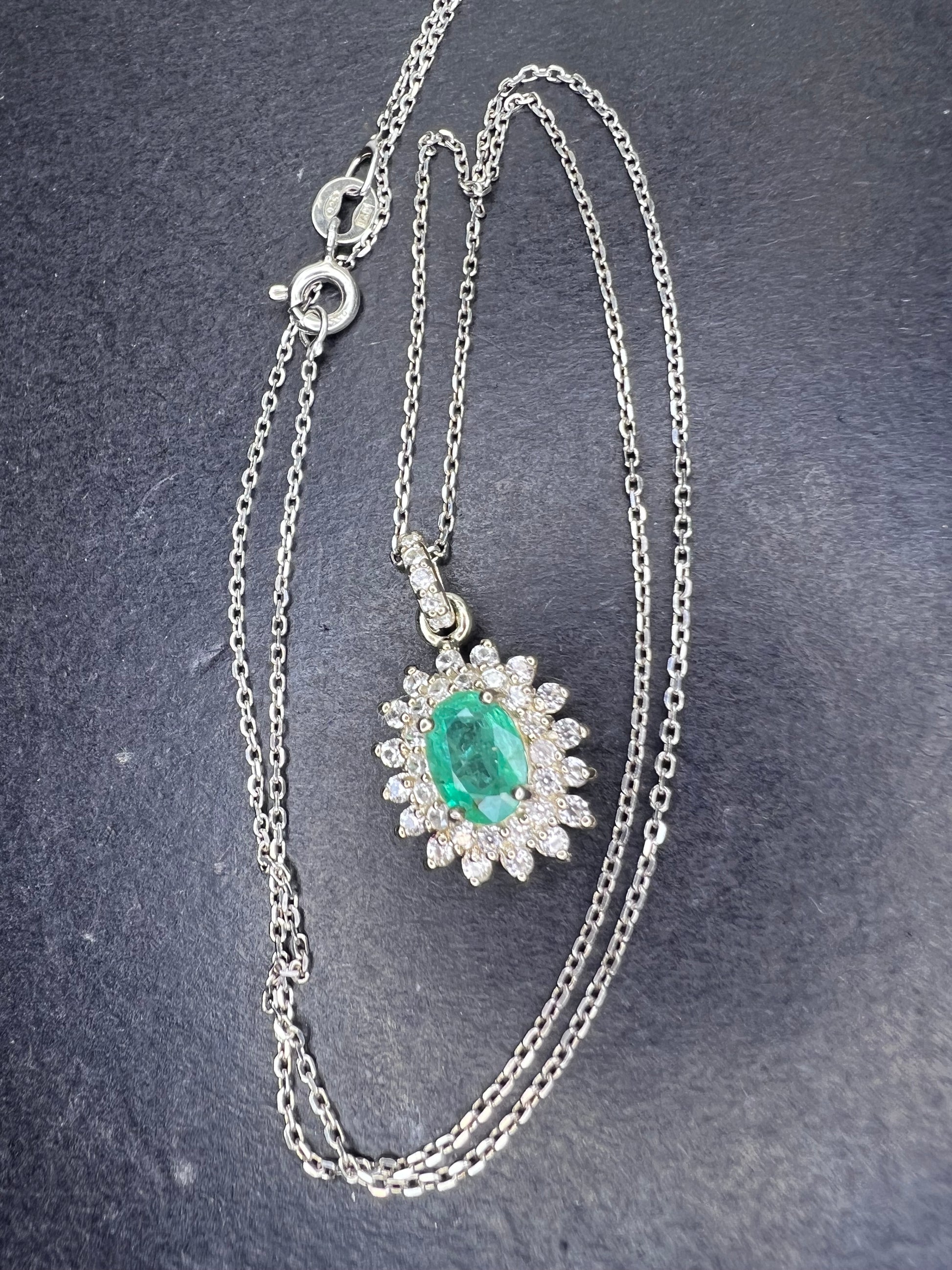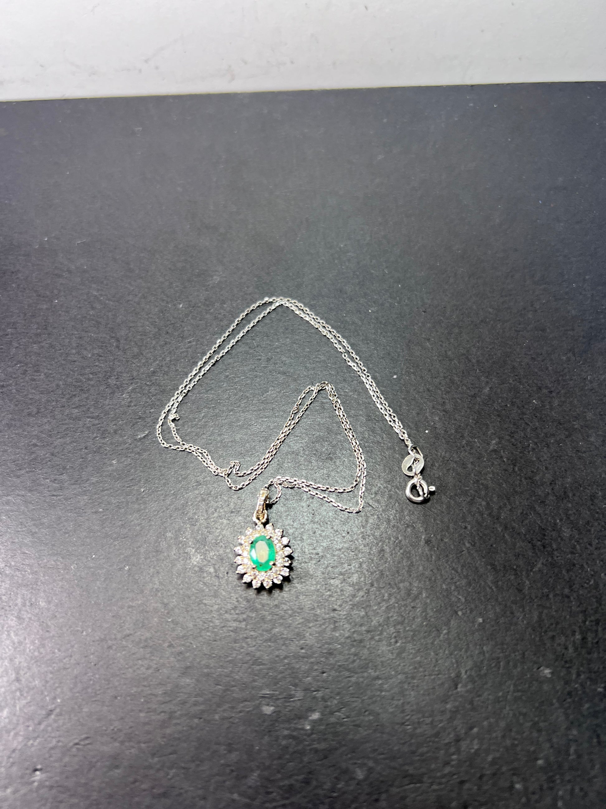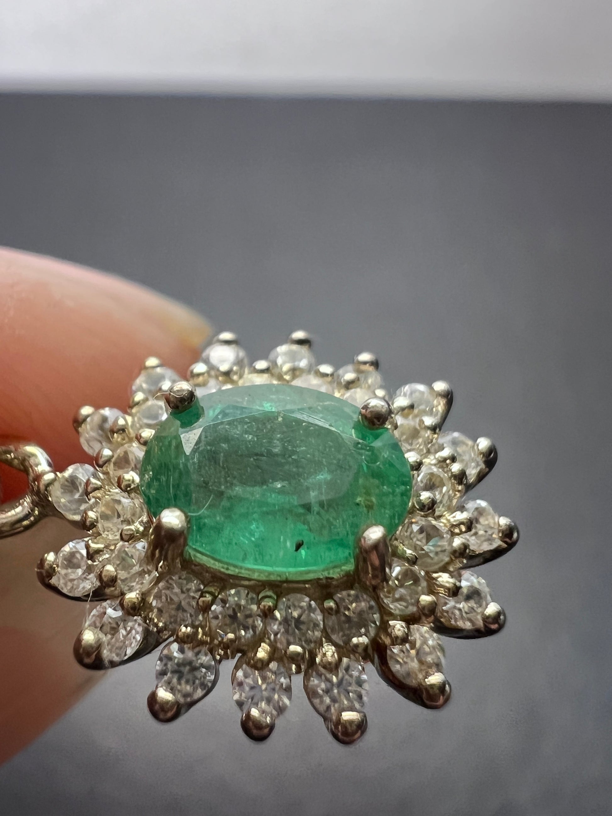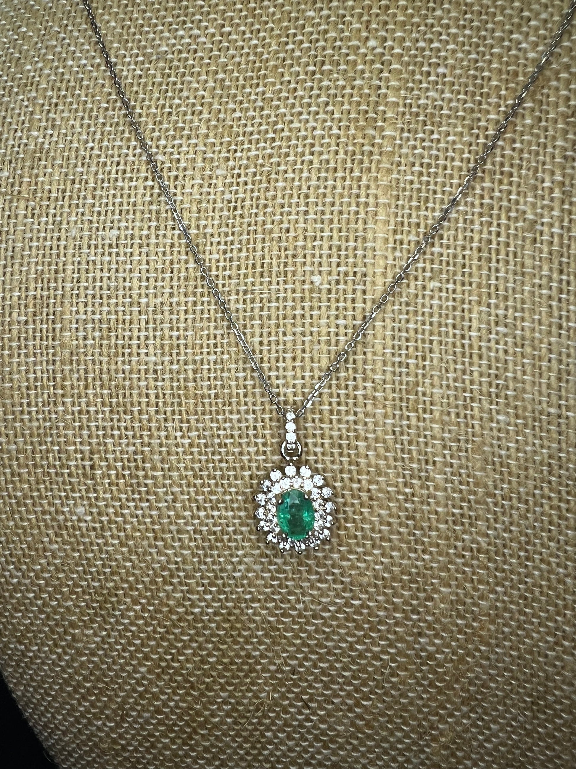 AAA Zambian emerald stone in the center surrounded by white zircon accents around the halo and bale. This is platinum plated over sterling silver. Chain measures 18 inches. Emerald stone has been treated for color. Estimated retail value is over $1,500. This information came from the website the original owner purchased it from. The AAA rating on this emerald comes directly from the website it was originally purchased from, not my own rating or opinion.