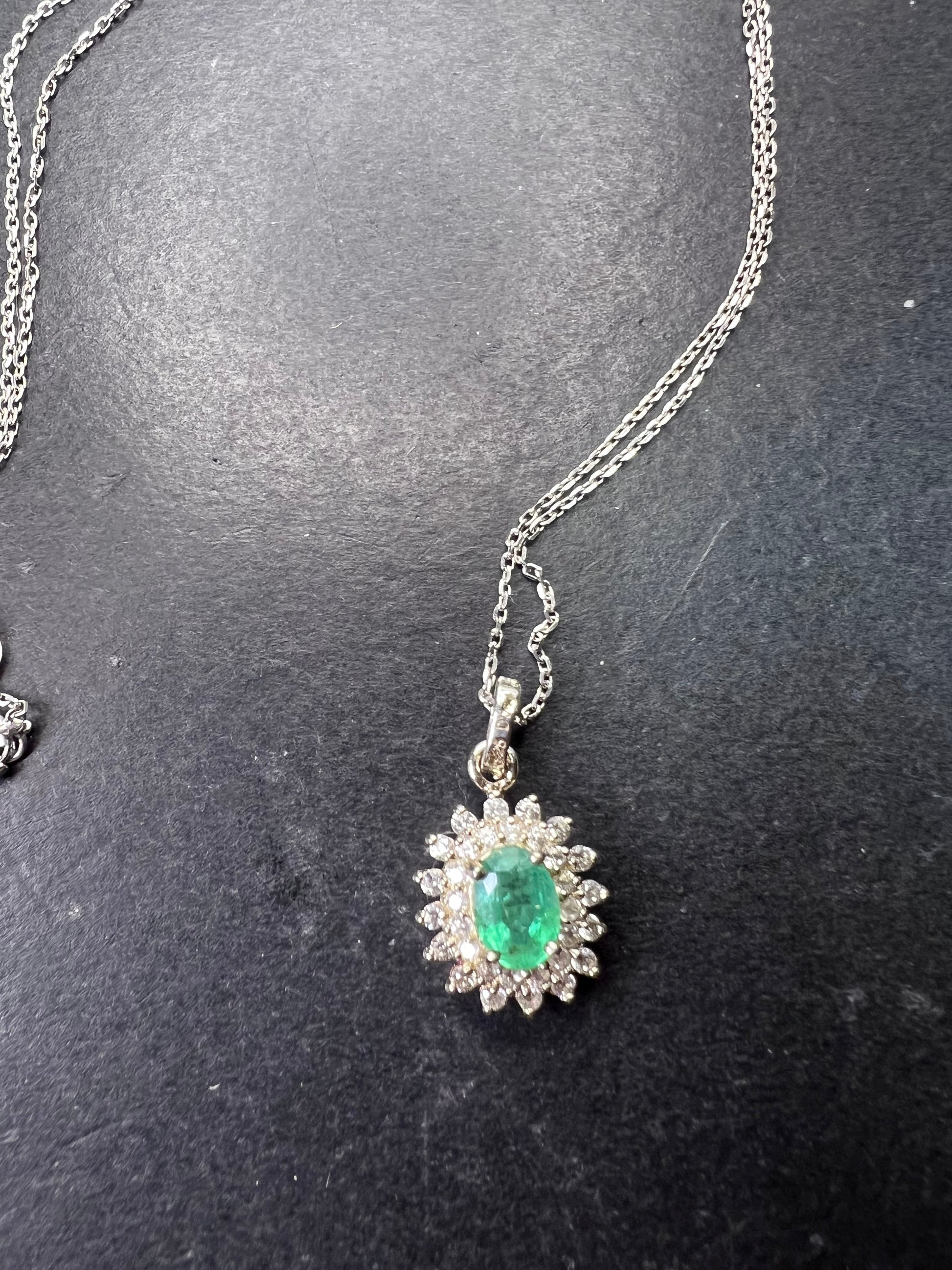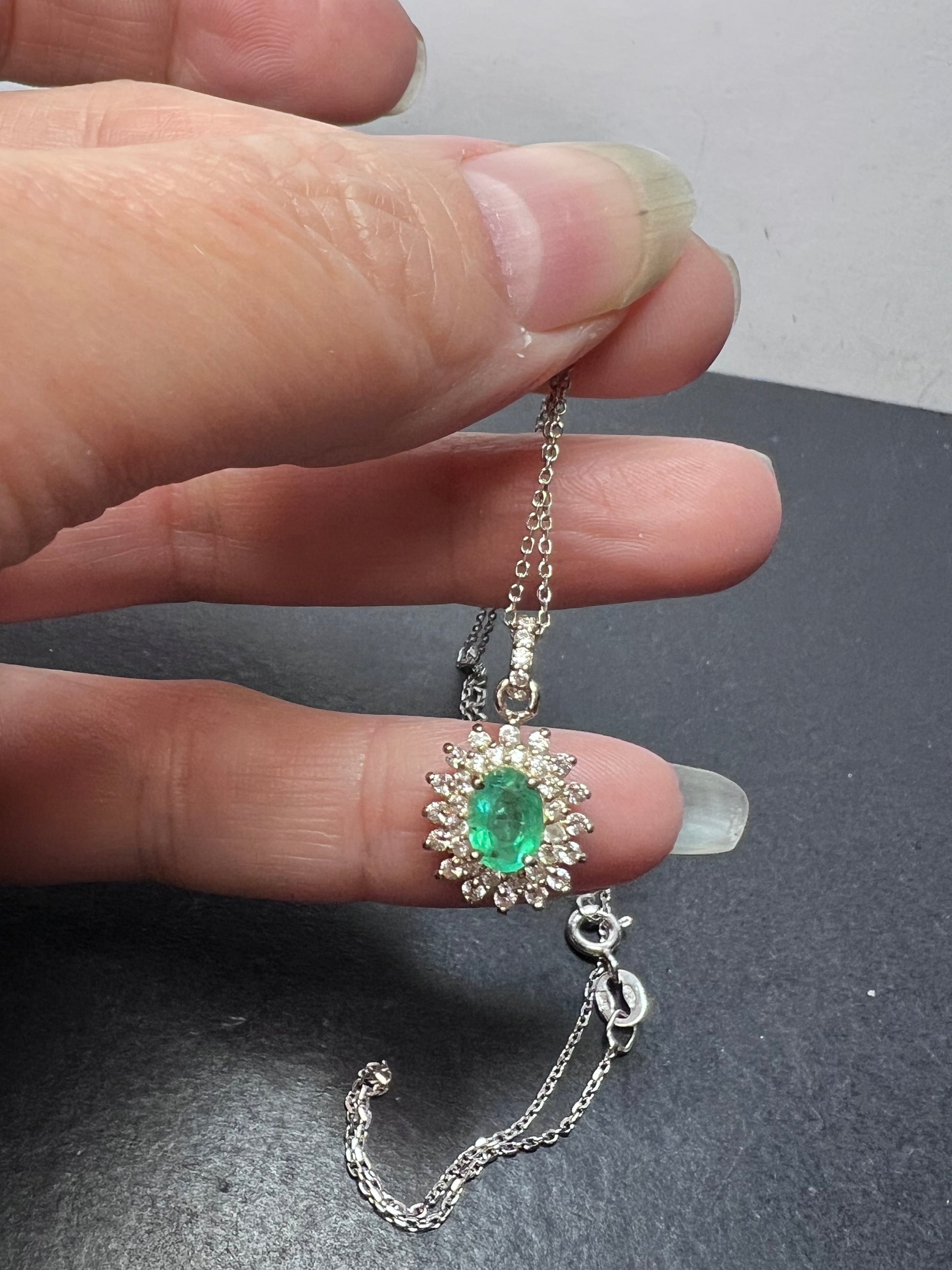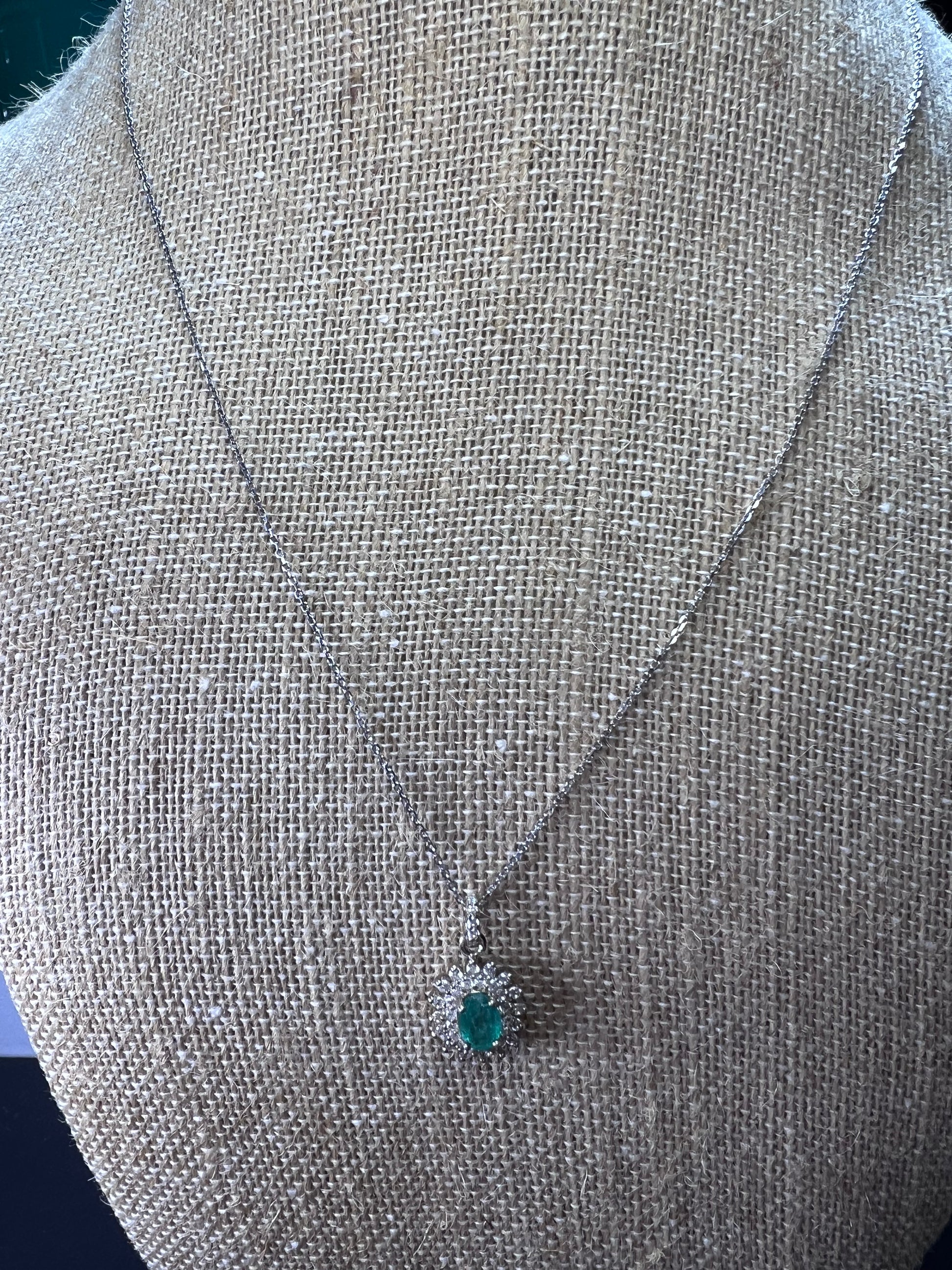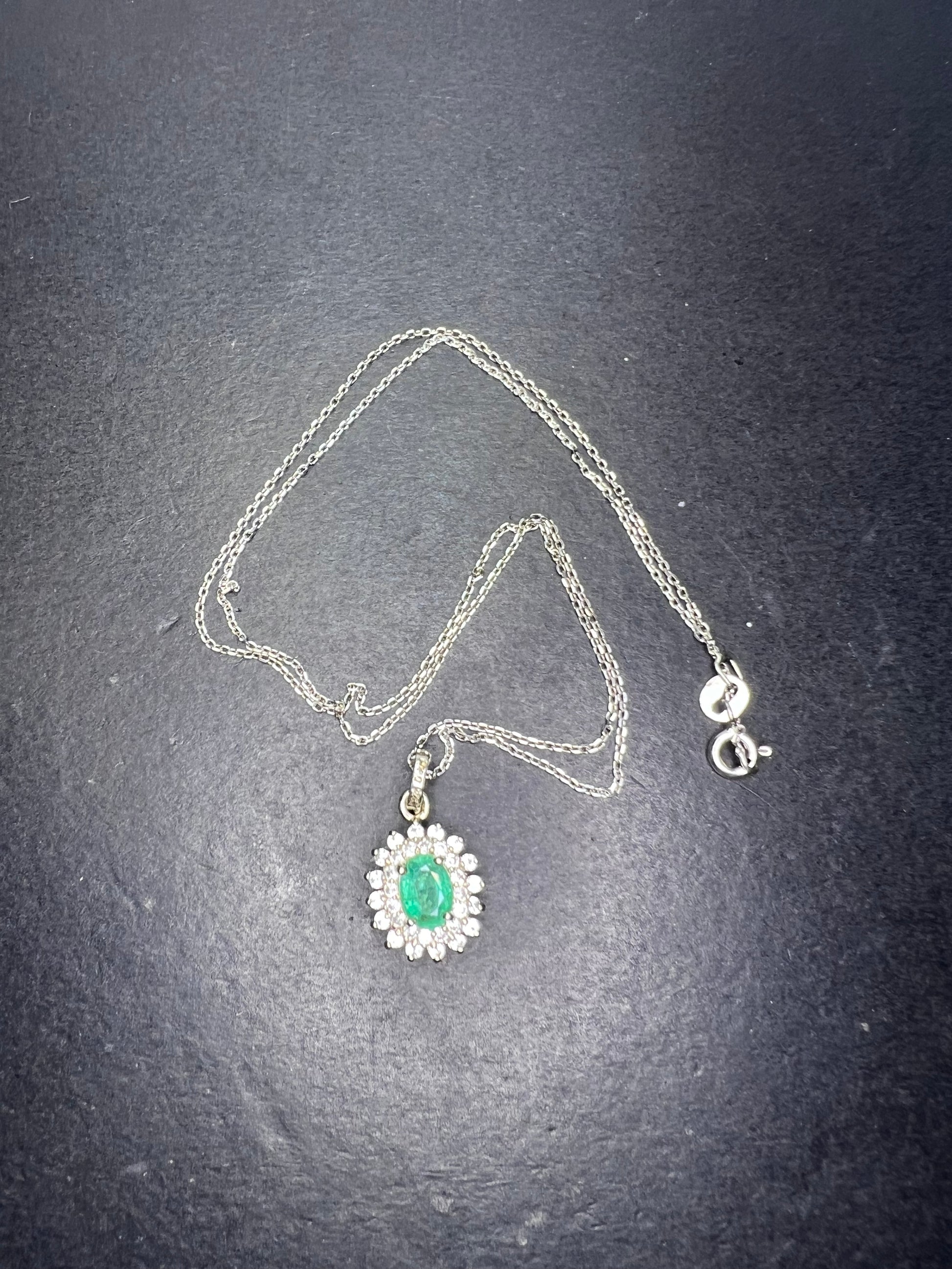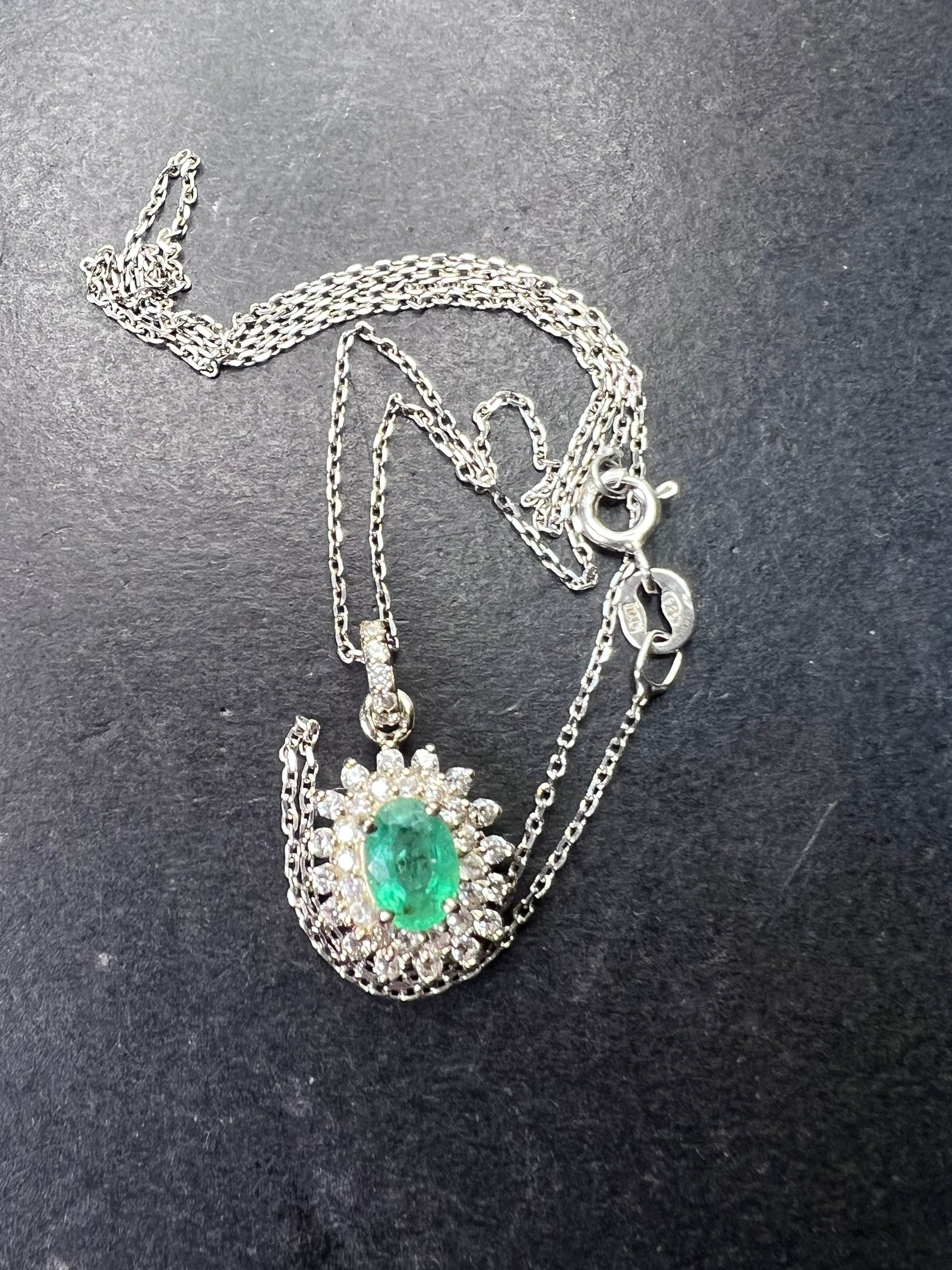 AAA Zambian emerald stone in the center surrounded by white zircon accents around the halo and bale. This is platinum plated over sterling silver. Chain measures 18 inches. Emerald stone has been treated for color. Estimated retail value is over $1,500. This information came from the website the original owner purchased it from. The AAA rating on this emerald comes directly from the website it was originally purchased from, not my own rating or opinion.