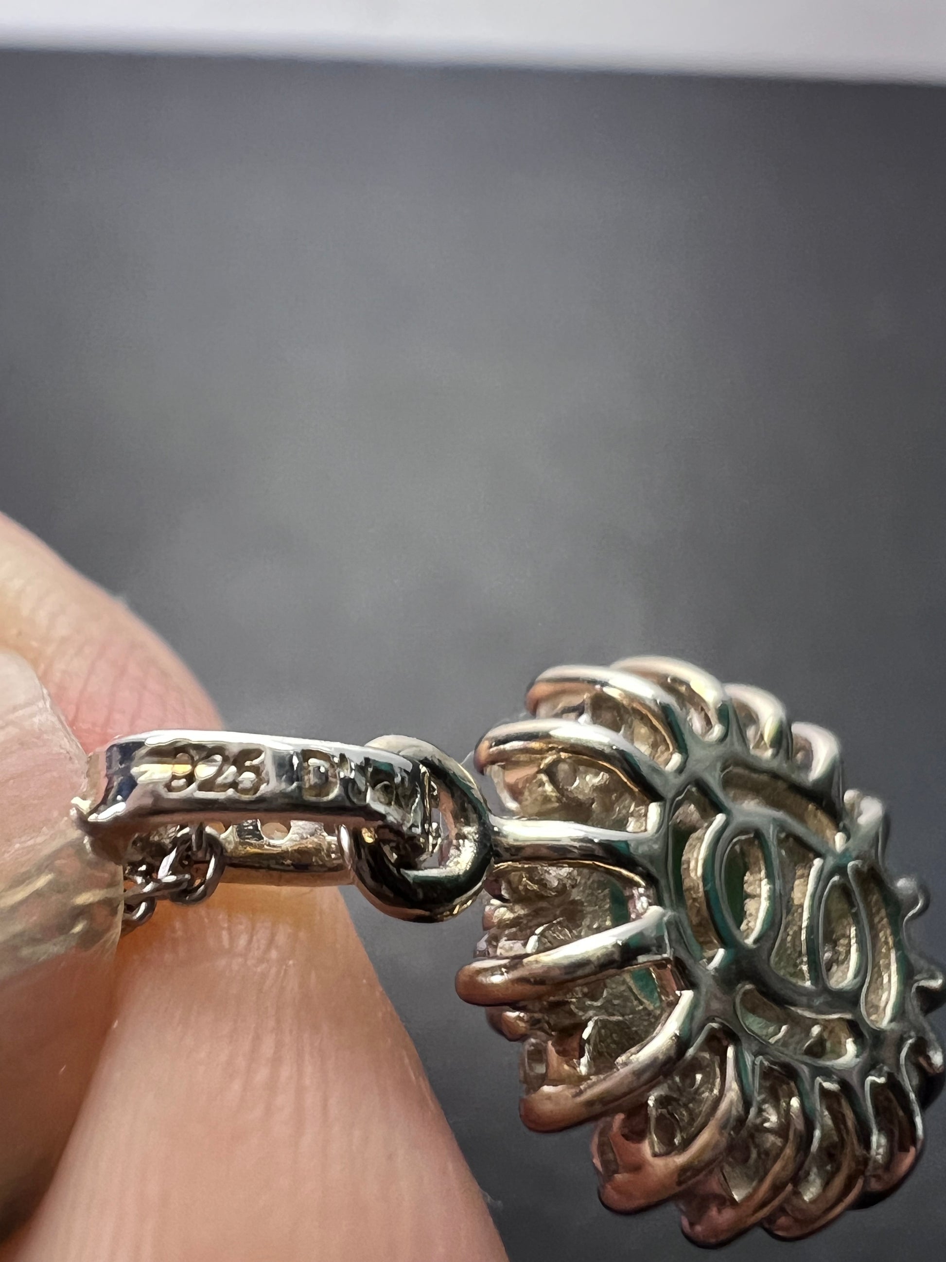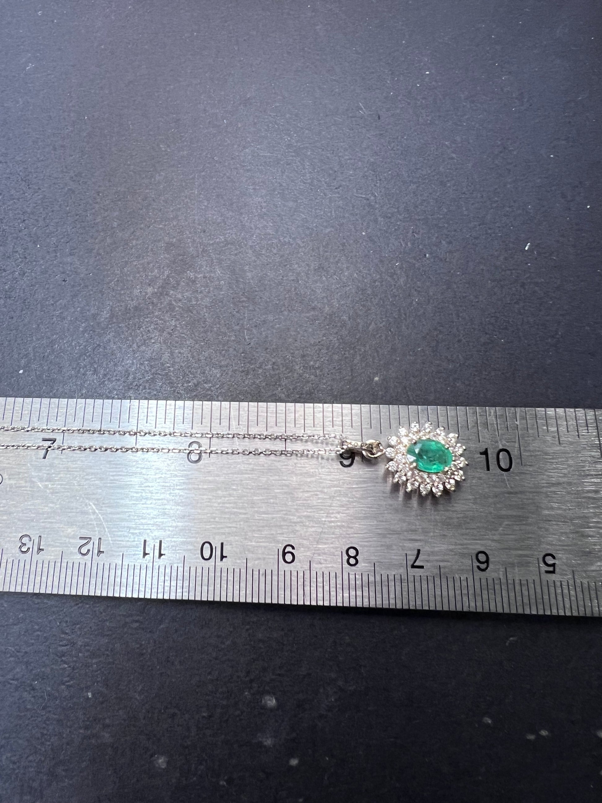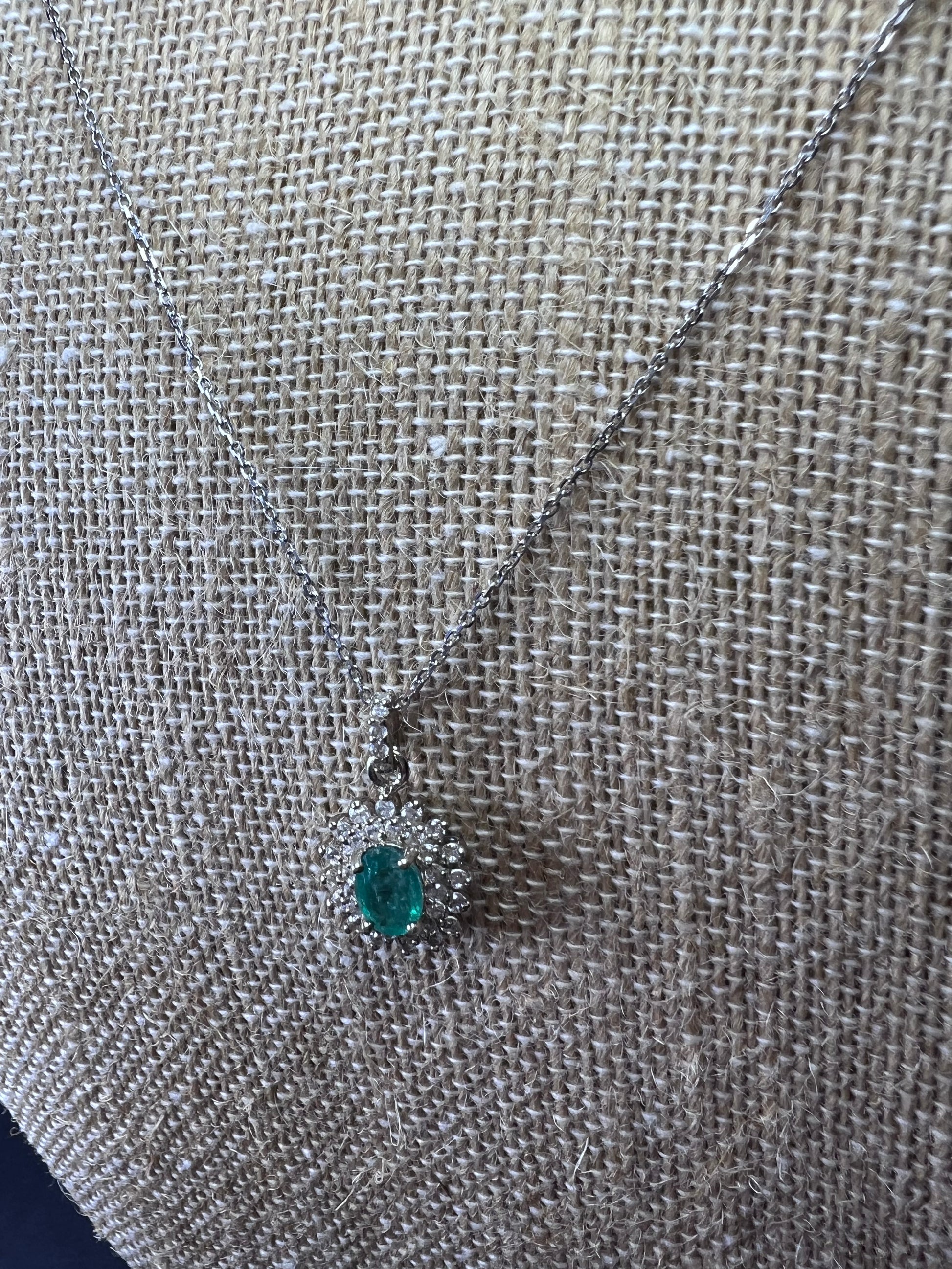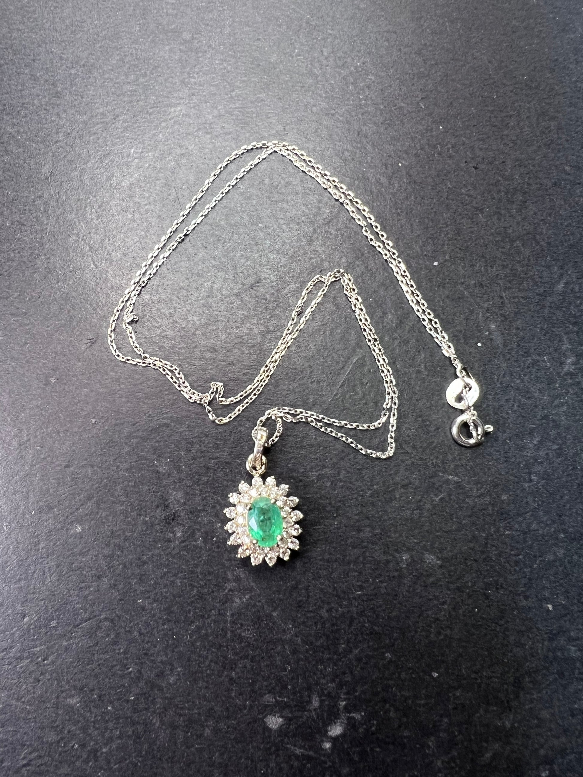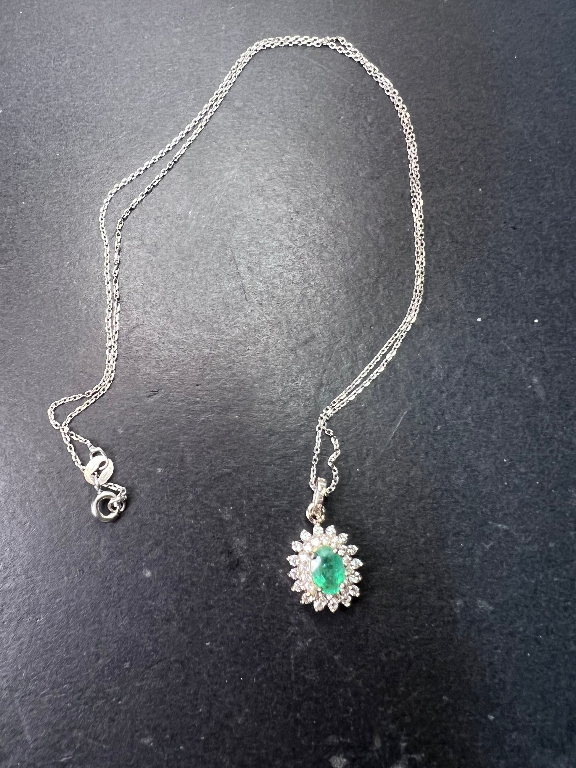 AAA Zambian emerald stone in the center surrounded by white zircon accents around the halo and bale. This is platinum plated over sterling silver. Chain measures 18 inches. Emerald stone has been treated for color. Estimated retail value is over $1,500. This information came from the website the original owner purchased it from. The AAA rating on this emerald comes directly from the website it was originally purchased from, not my own rating or opinion.