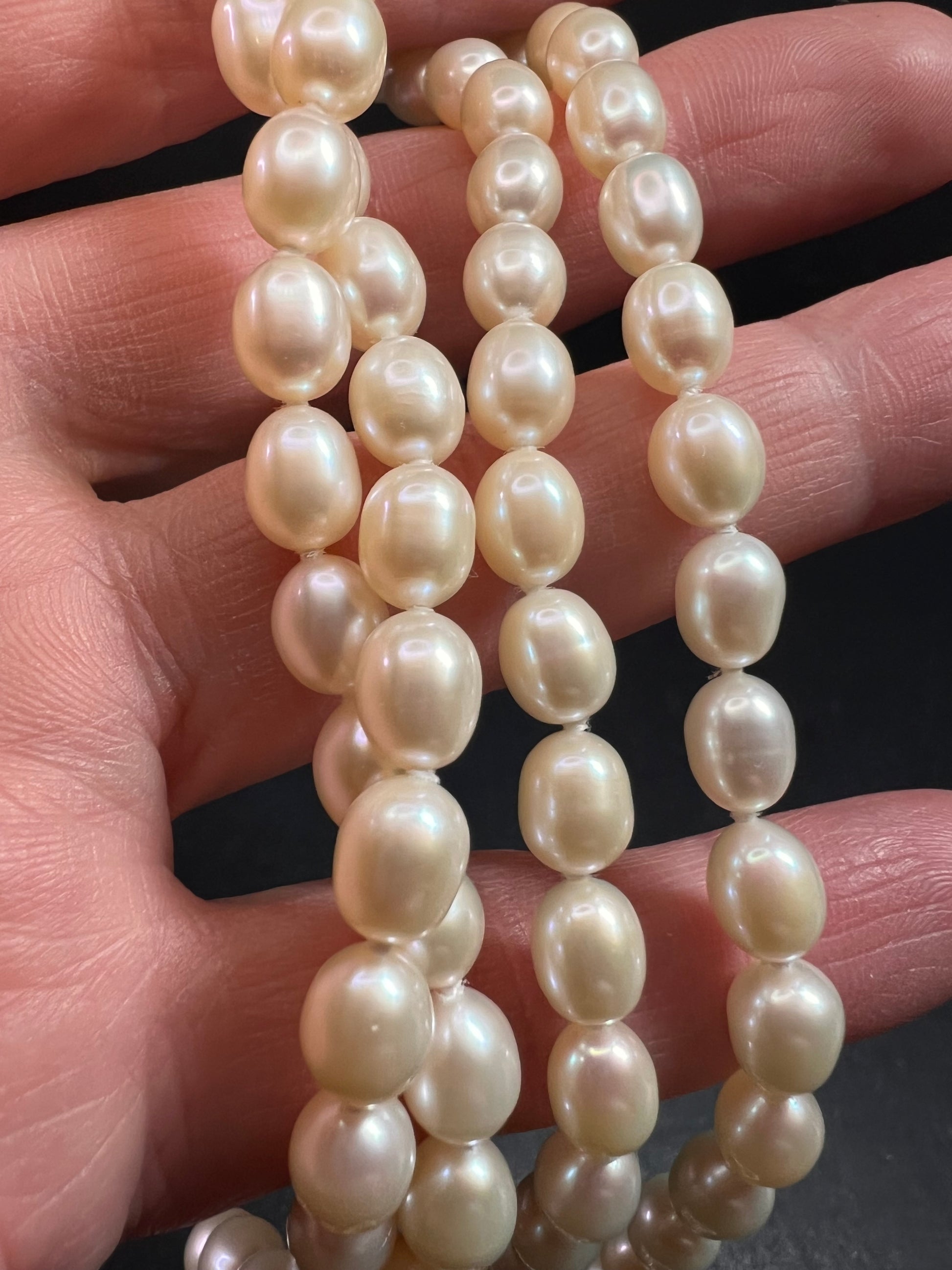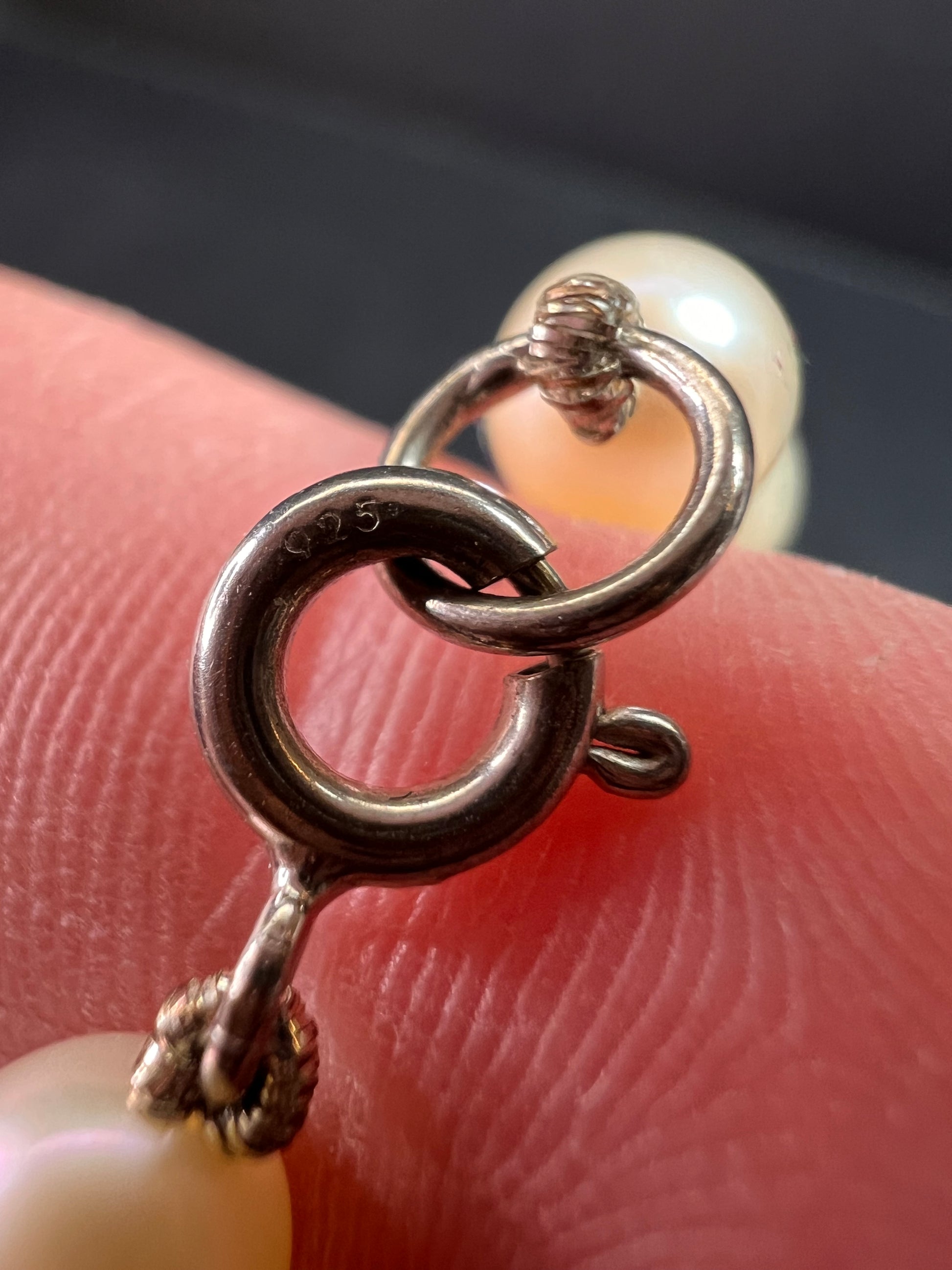 Estate acquired pre-owned pearl necklace in like-new condition. Features genuine white cultured freshwater pearls, each individually knotted for durability and longevity. The strand measures approximately 36 inches in length and can be worn long or doubled. Finished with a genuine .925 sterling silver spring ring clasp (stamped). Pearls display a soft white body color with natural nacre glow and organic oval shapes. Stringing remains clean and tight with no fraying noted. A timeless pearl strand ideal for layering or classic wear.