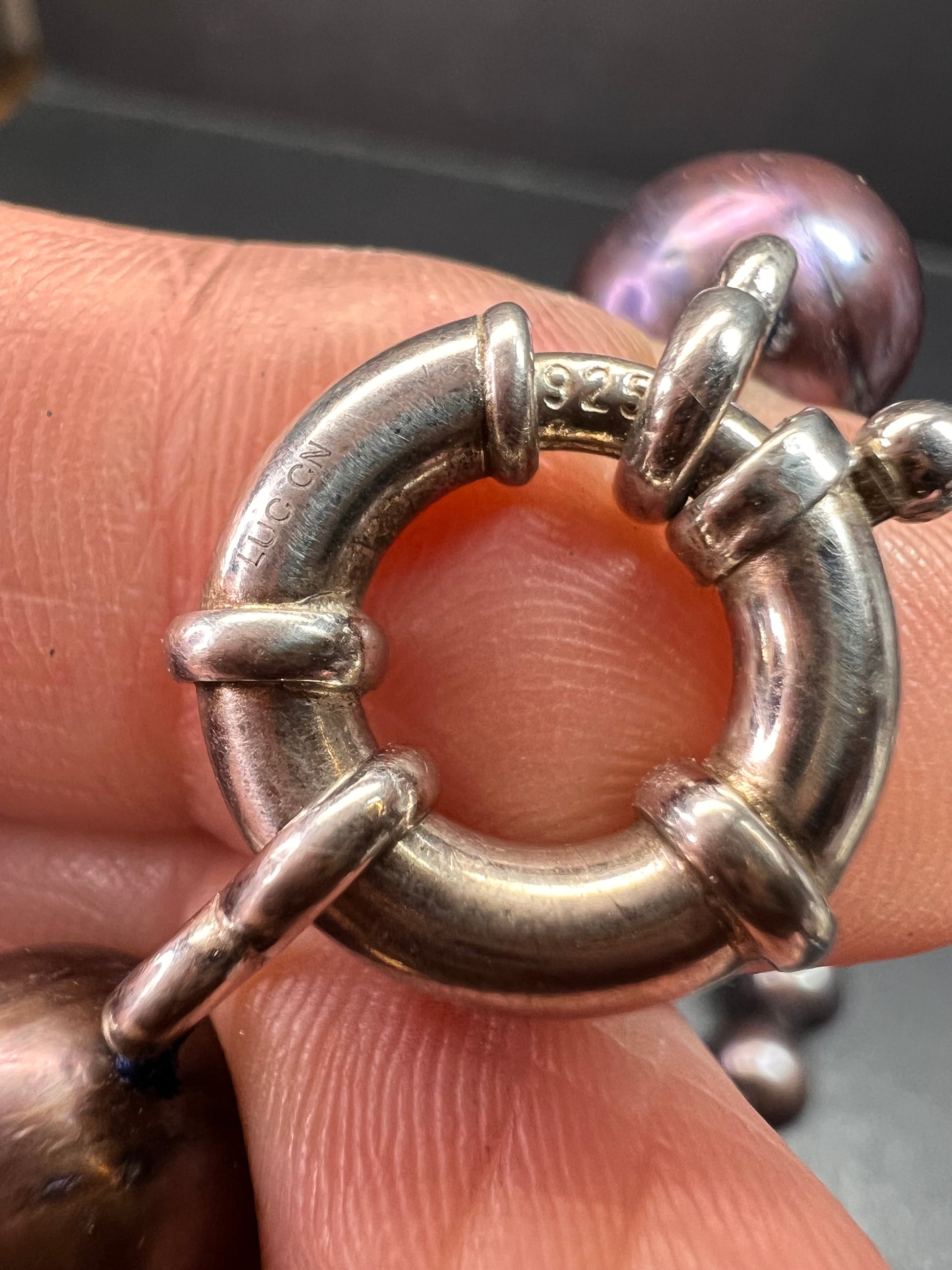 Estate genuine cultured pearl necklace measuring approximately 20 inches in length, featuring large 11.8–11.9 mm black pearls with natural surface texture, visible growth characteristics, and true nacre luster. Pearls display rich iridescent overtones of aubergine, bronze, and violet with organic variations typical of real cultured pearls. Based on visual characteristics and structure, these are most likely cultured freshwater pearls, though no original paperwork is available. Necklace secures with a substantial 925 sterling silver jumbo clasp stamped LUC CN, attributed to Lucas Lameth. Professionally knotted between each pearl. Light, age-appropriate wear consistent with normal estate use. A bold, high-impact strand with striking presence.