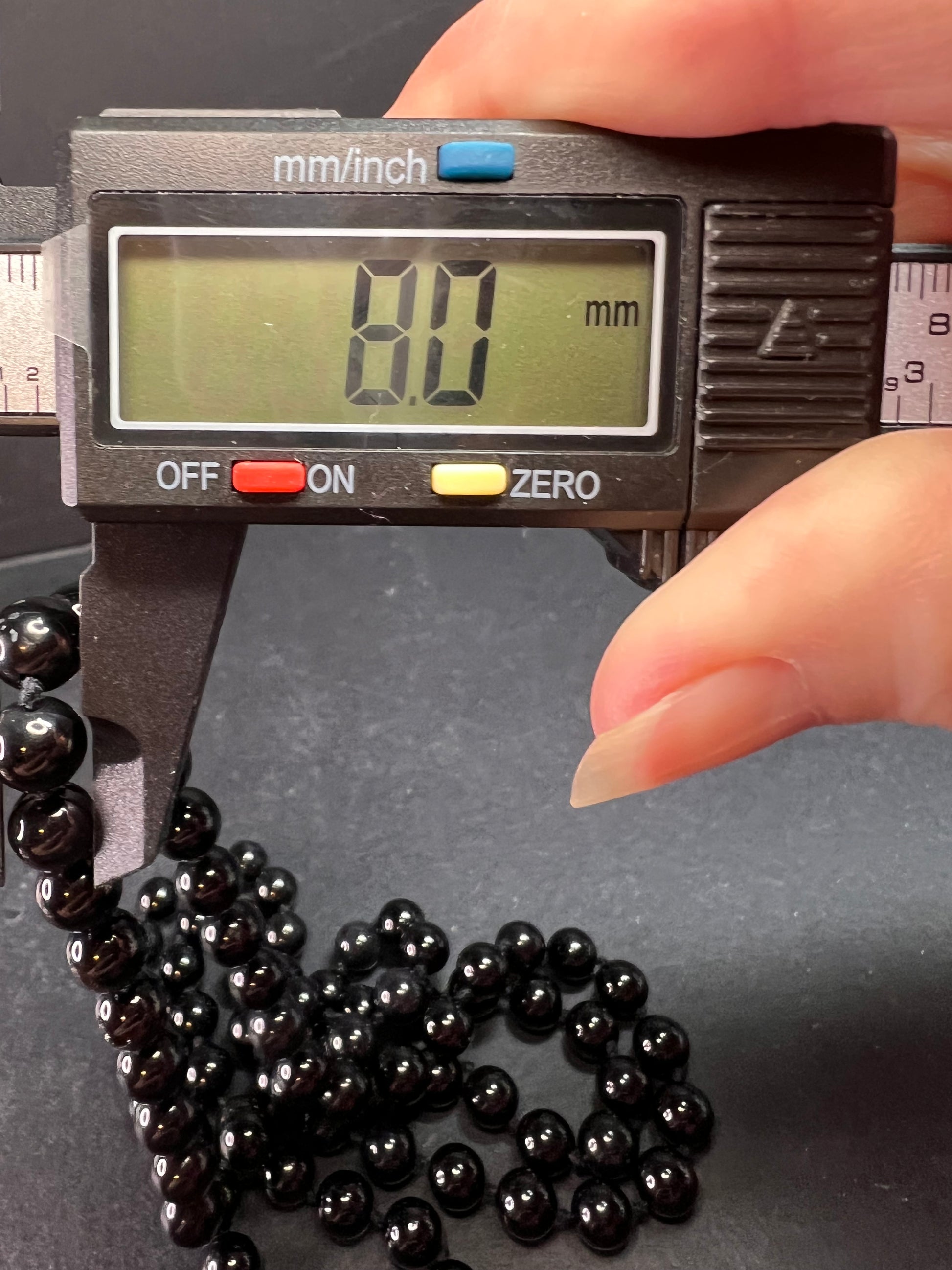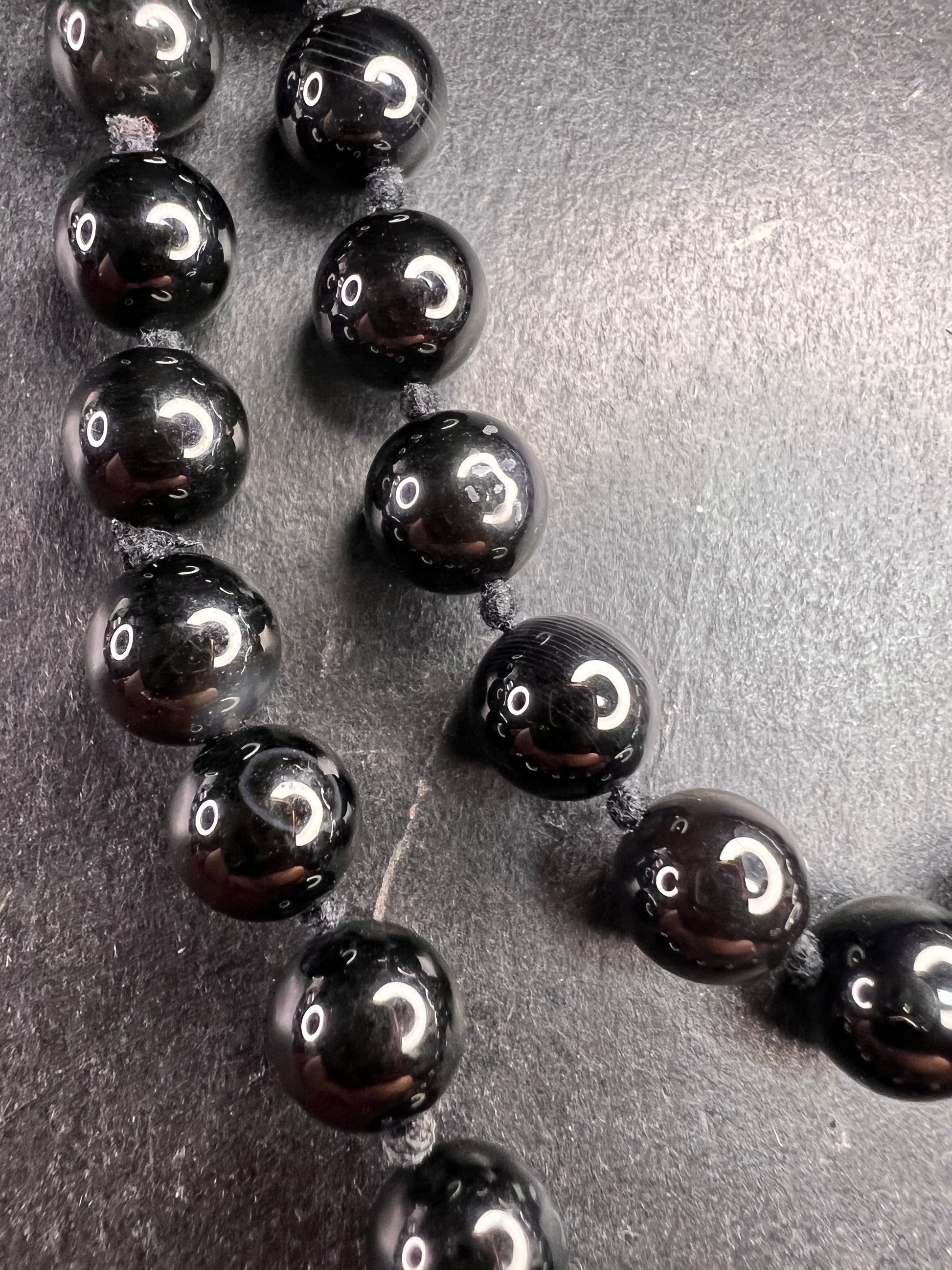 Pre-owned estate-acquired modern black onyx endless necklace featuring high-polish 8mm round beads, individually hand-knotted between each stone. This is a continuous slip-over style with no clasp. Stones display a true jet-black tone with a smooth, glassy luster typical of genuine onyx. Based on construction and cord style, this piece dates to the modern era (circa 2000s–present). Measures approximately 34 inches in total length, perfect for long single-layer wear. Condition is very good with only light normal estate wear to the cord; beads remain glossy with no chips or cracks noted.