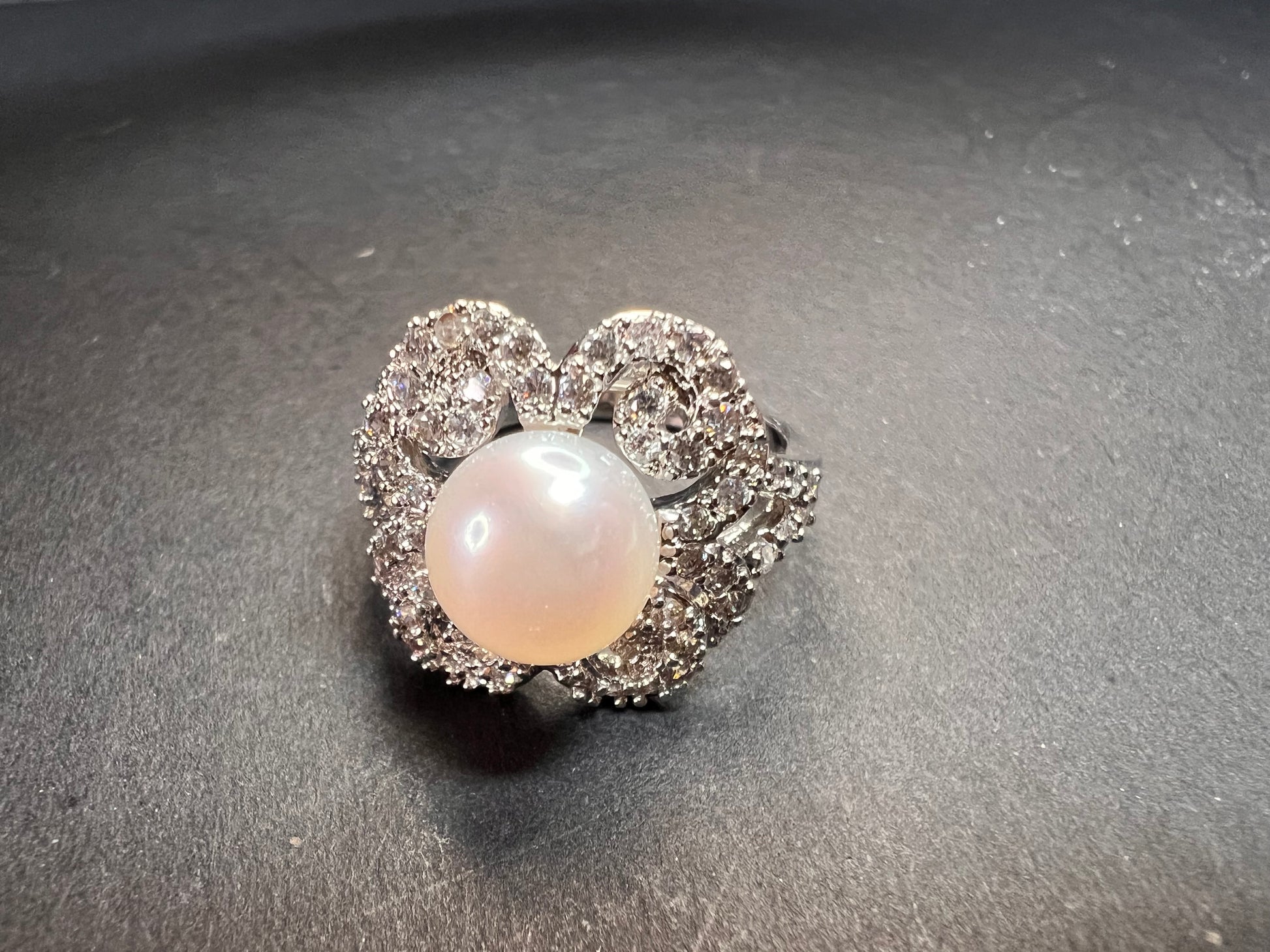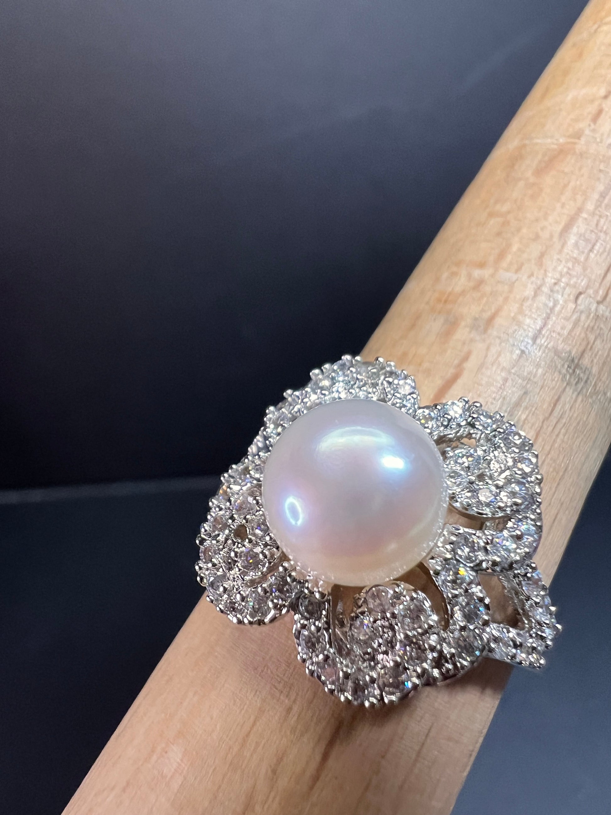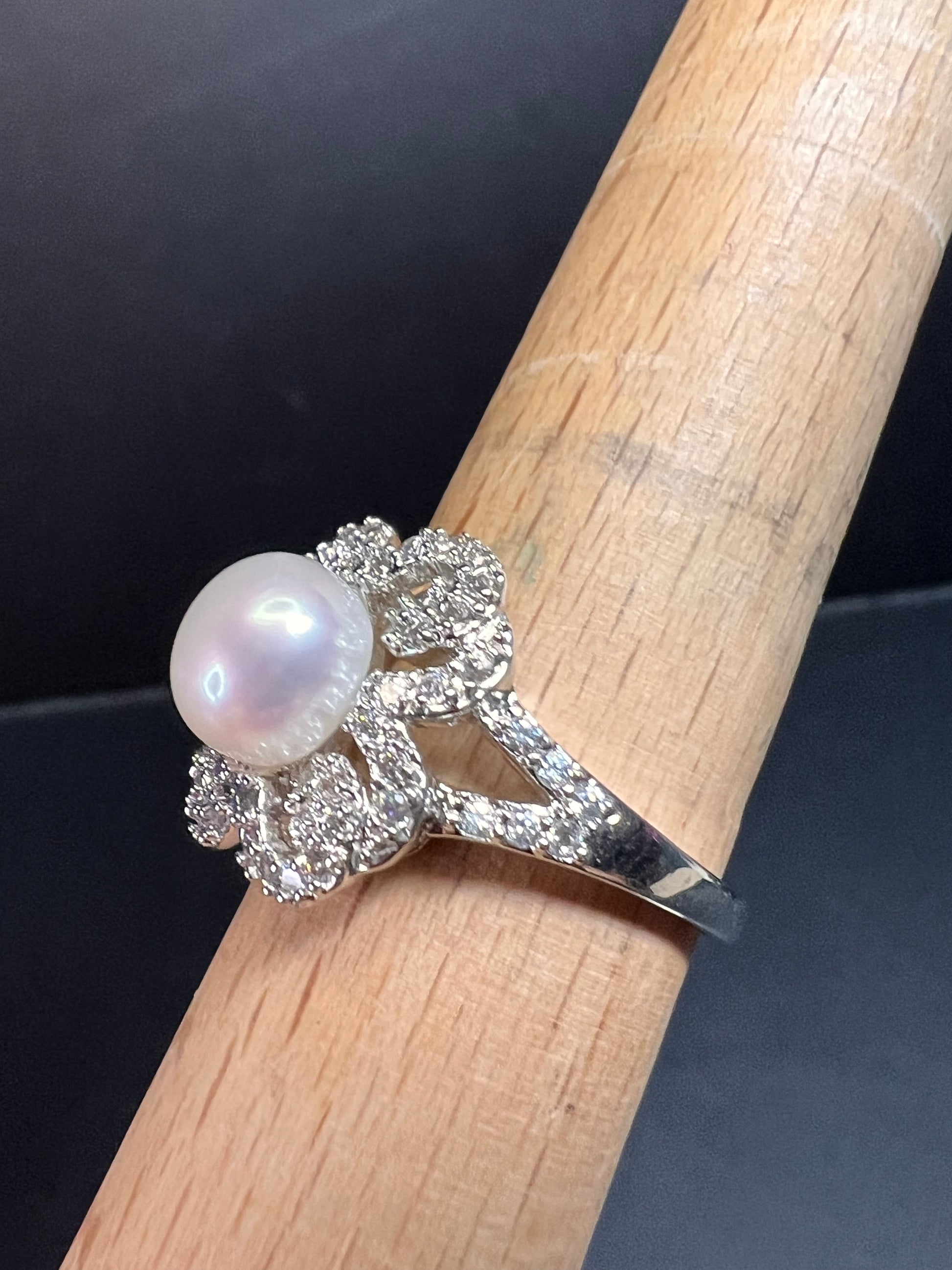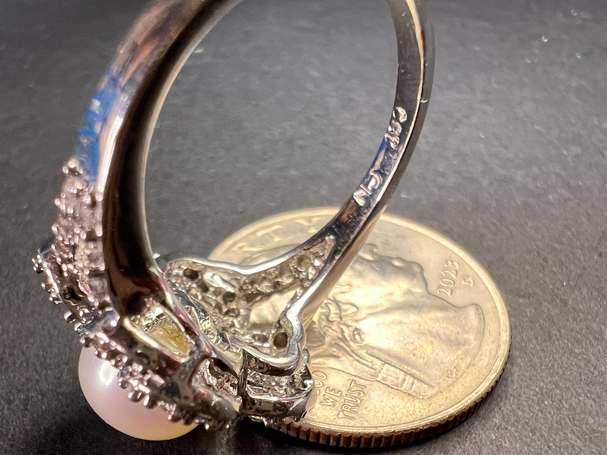 Genuine cultured white freshwater pearl surrounded by tiny white accent cubic zirconia gemstones prong set in metals that I’m not 100% certain on. Definitely not sterling silver , gold or platinum bases. The core base seems to be either copper, brass or bronze based with a plating of either white gold, rhodium, or platinum. I’ve done multiple acid tests as well as testing with a Kee gold tester. Measures a size 9. Markings on the inside of the band are CGT CN. I couldn’t find information on what CGT is for , but CN would mean made in China.