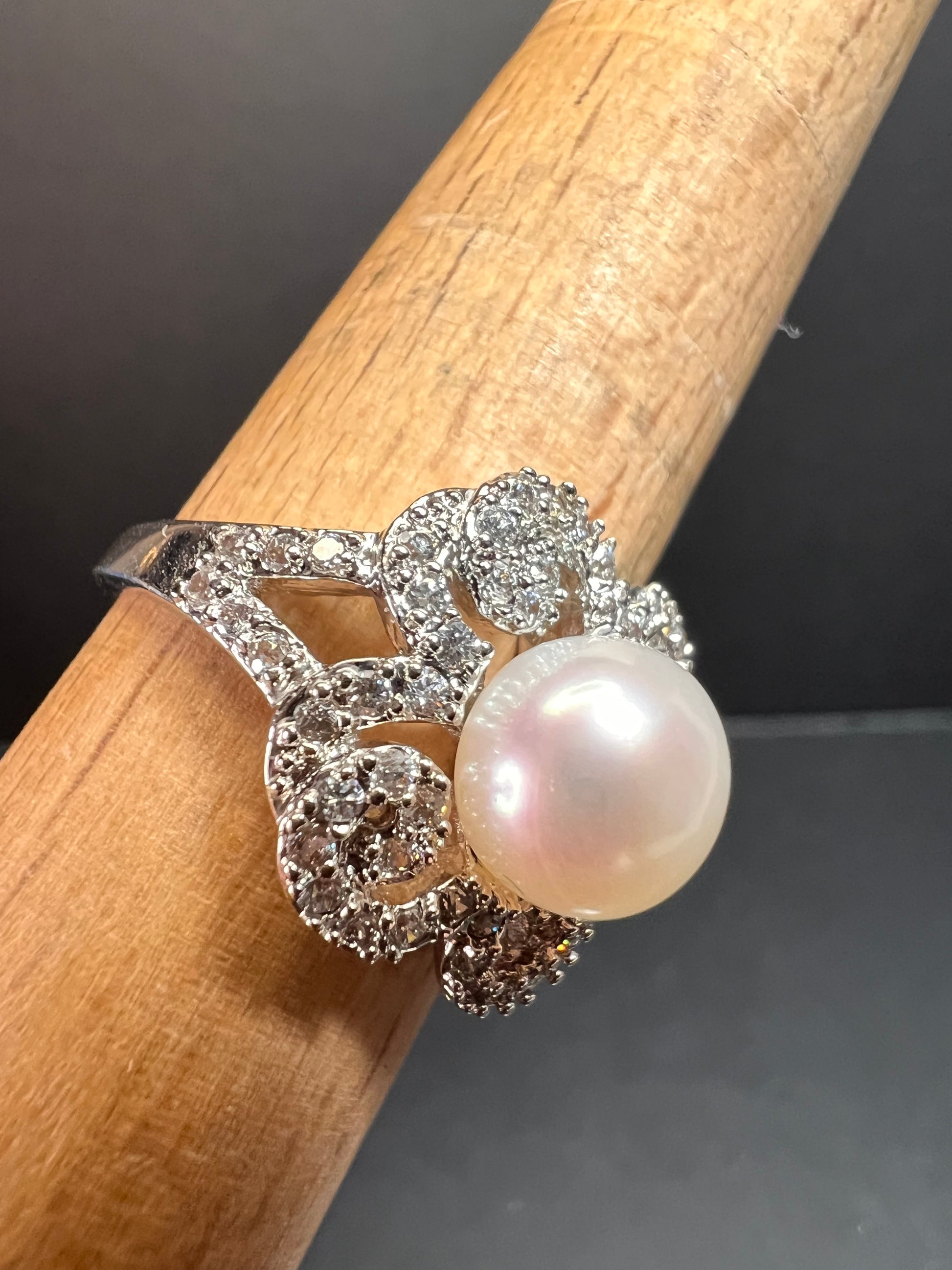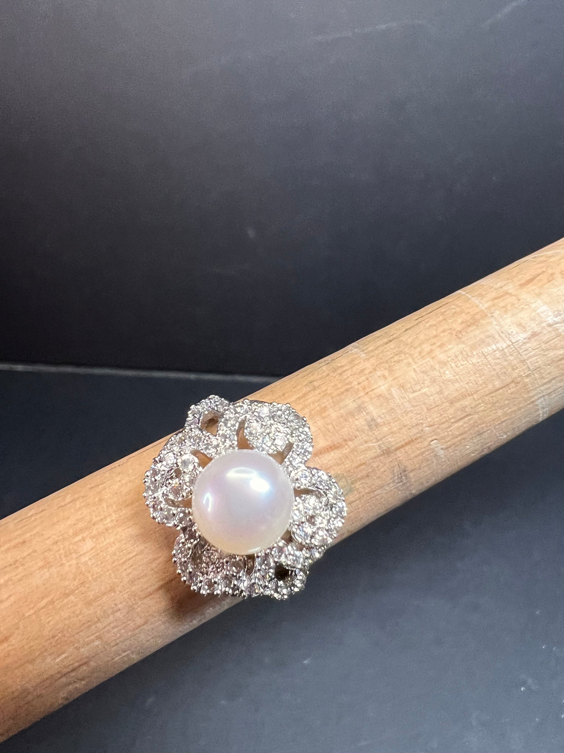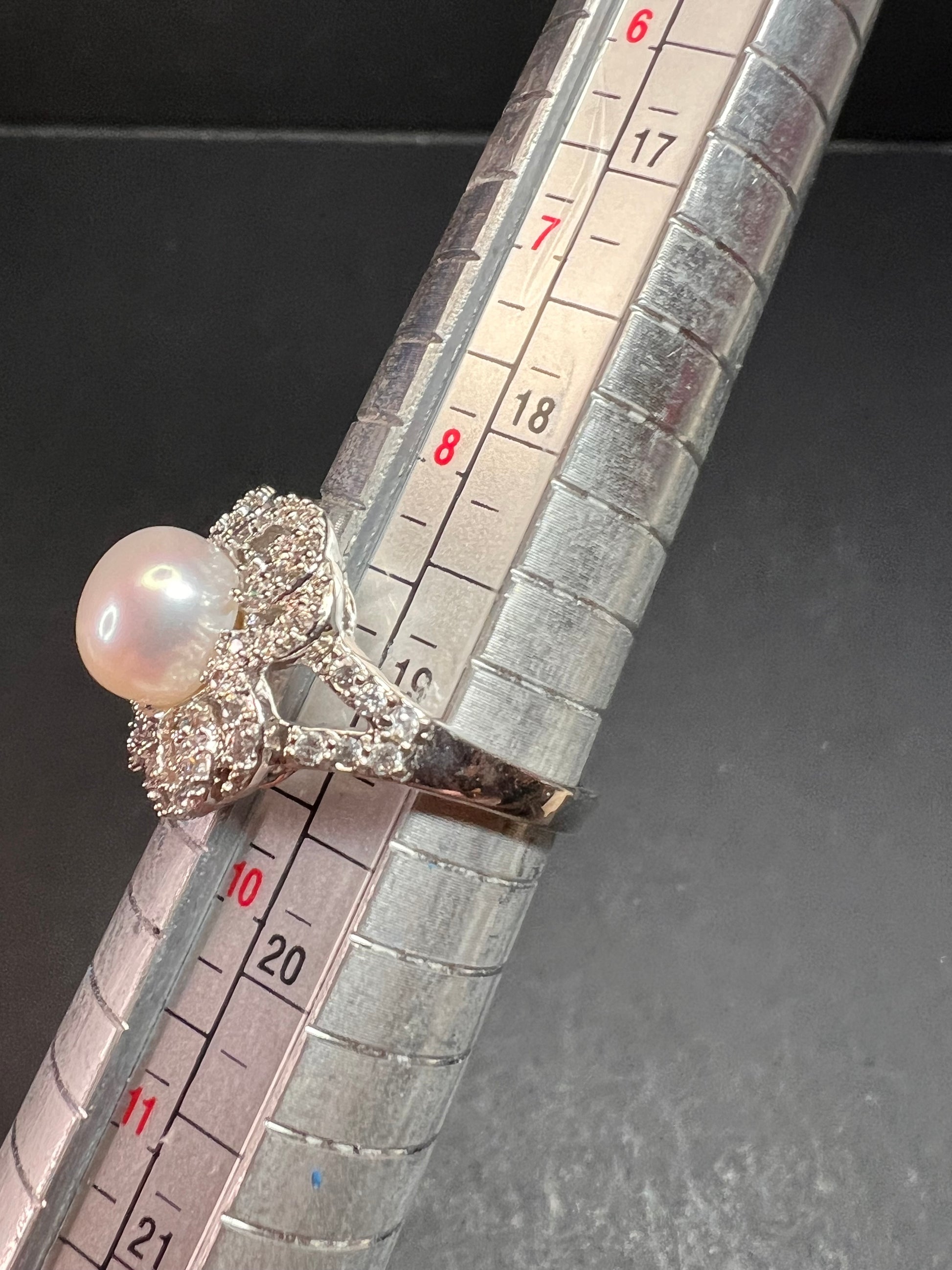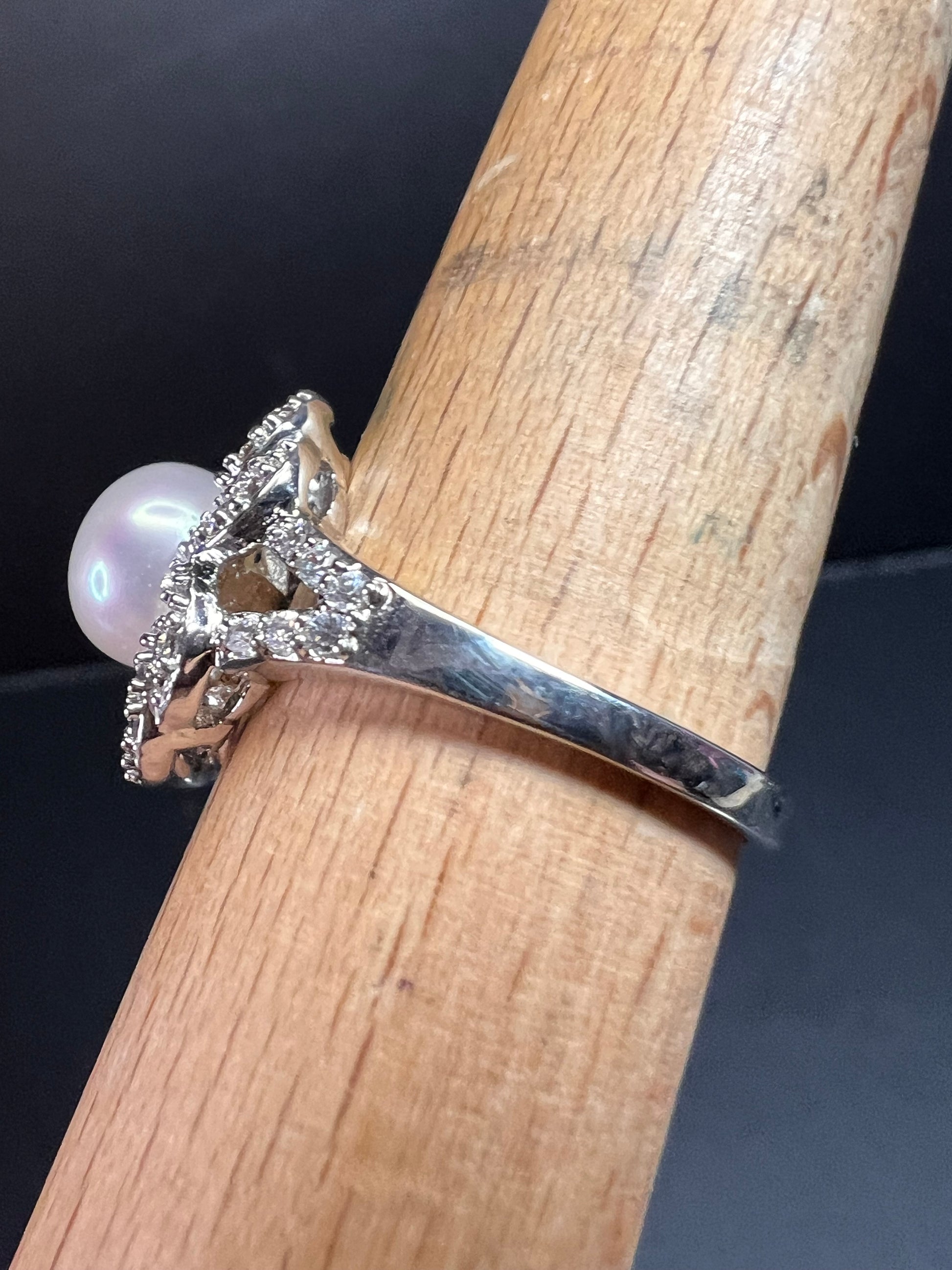 Genuine cultured white freshwater pearl surrounded by tiny white accent cubic zirconia gemstones prong set in metals that I’m not 100% certain on. Definitely not sterling silver , gold or platinum bases. The core base seems to be either copper, brass or bronze based with a plating of either white gold, rhodium, or platinum. I’ve done multiple acid tests as well as testing with a Kee gold tester. Measures a size 9. Markings on the inside of the band are CGT CN. I couldn’t find information on what CGT is for , but CN would mean made in China.