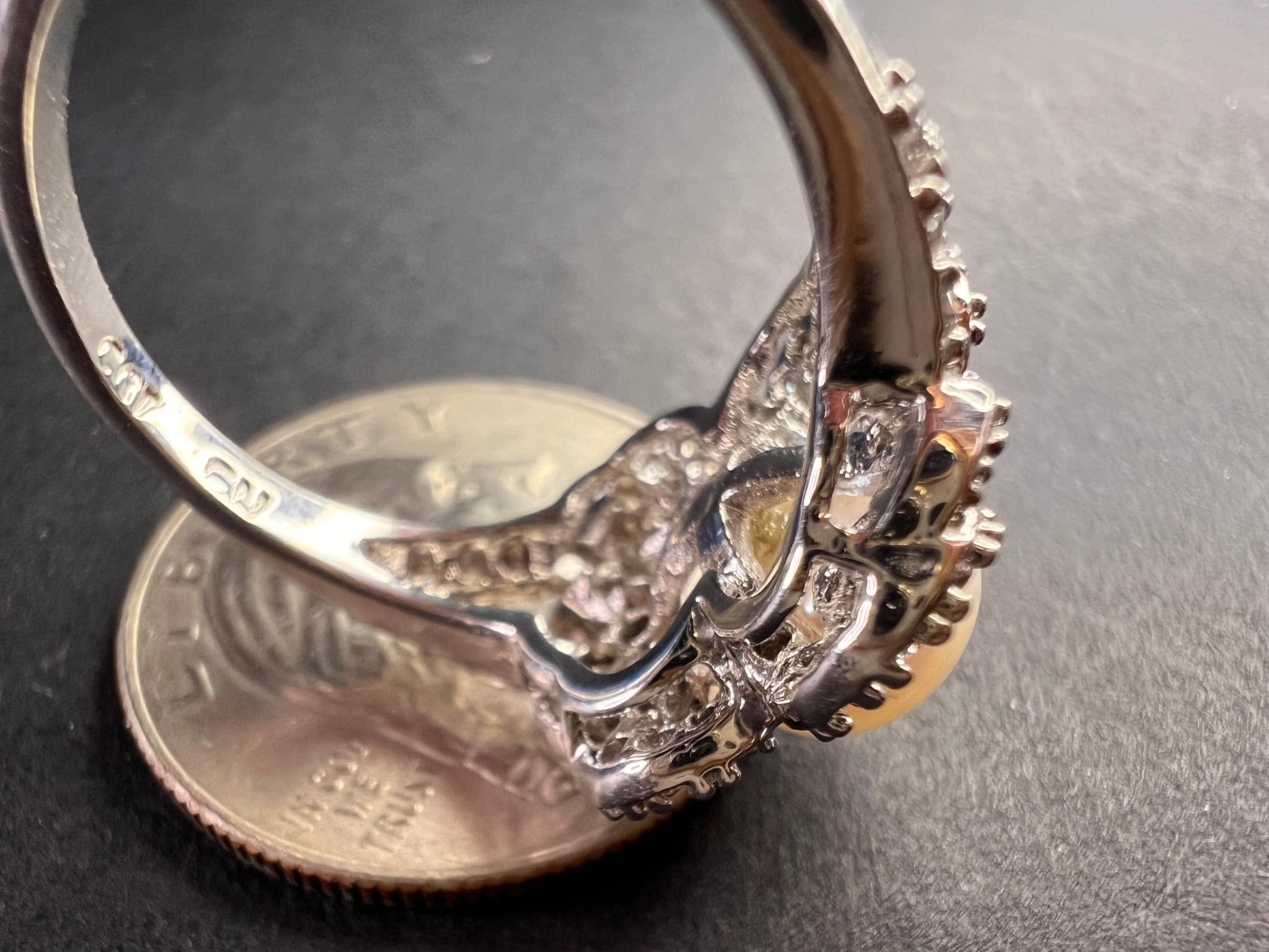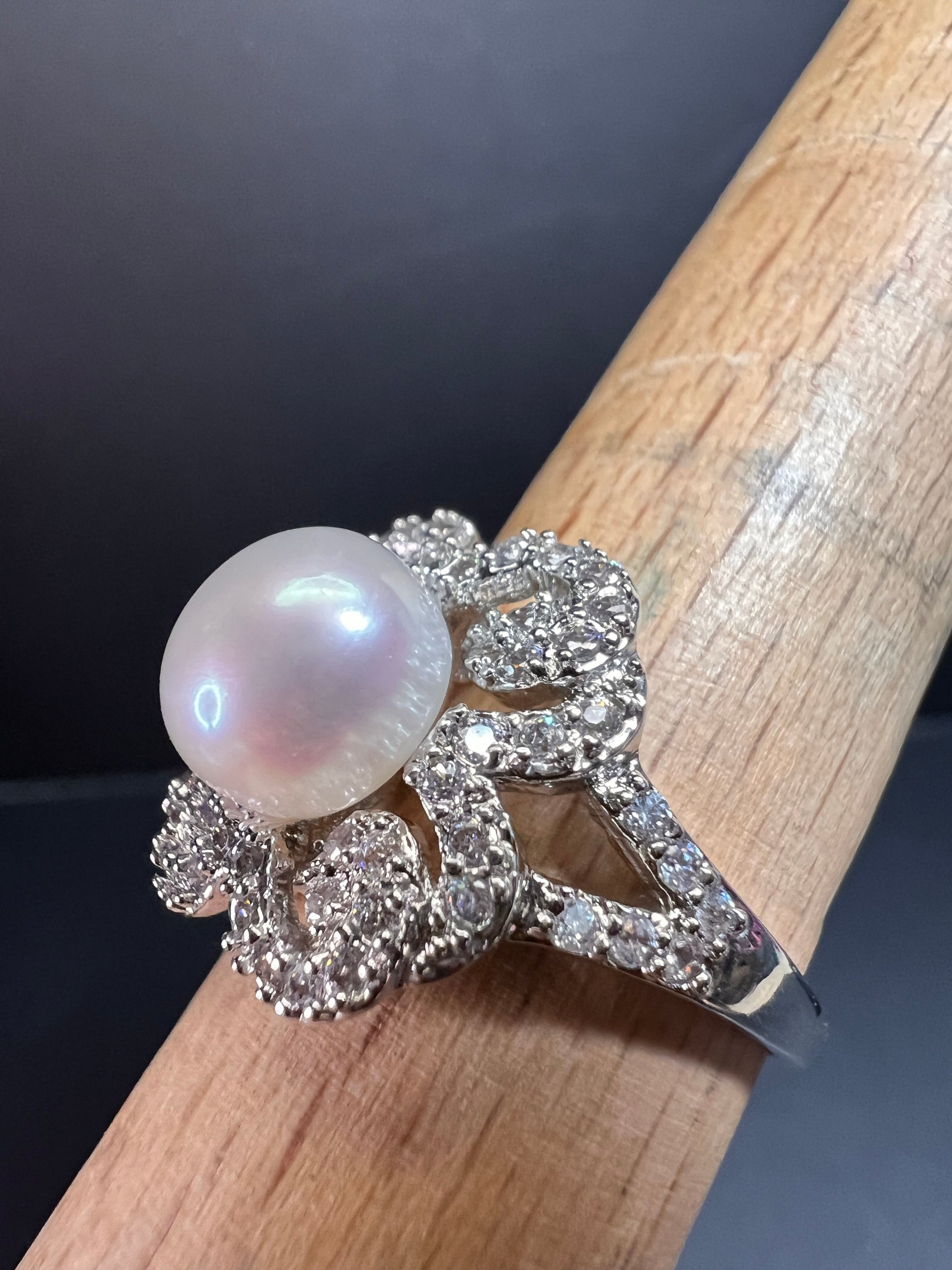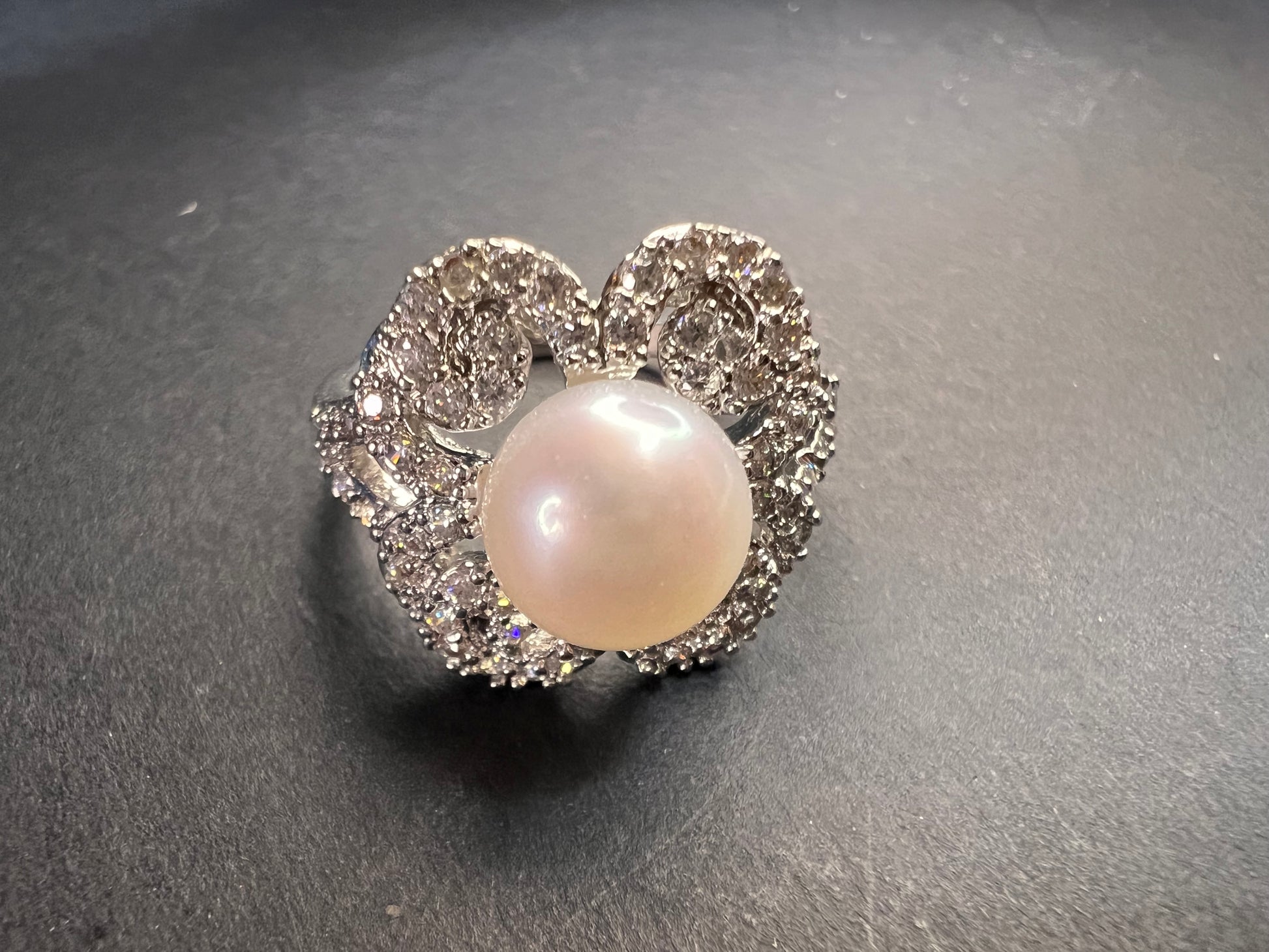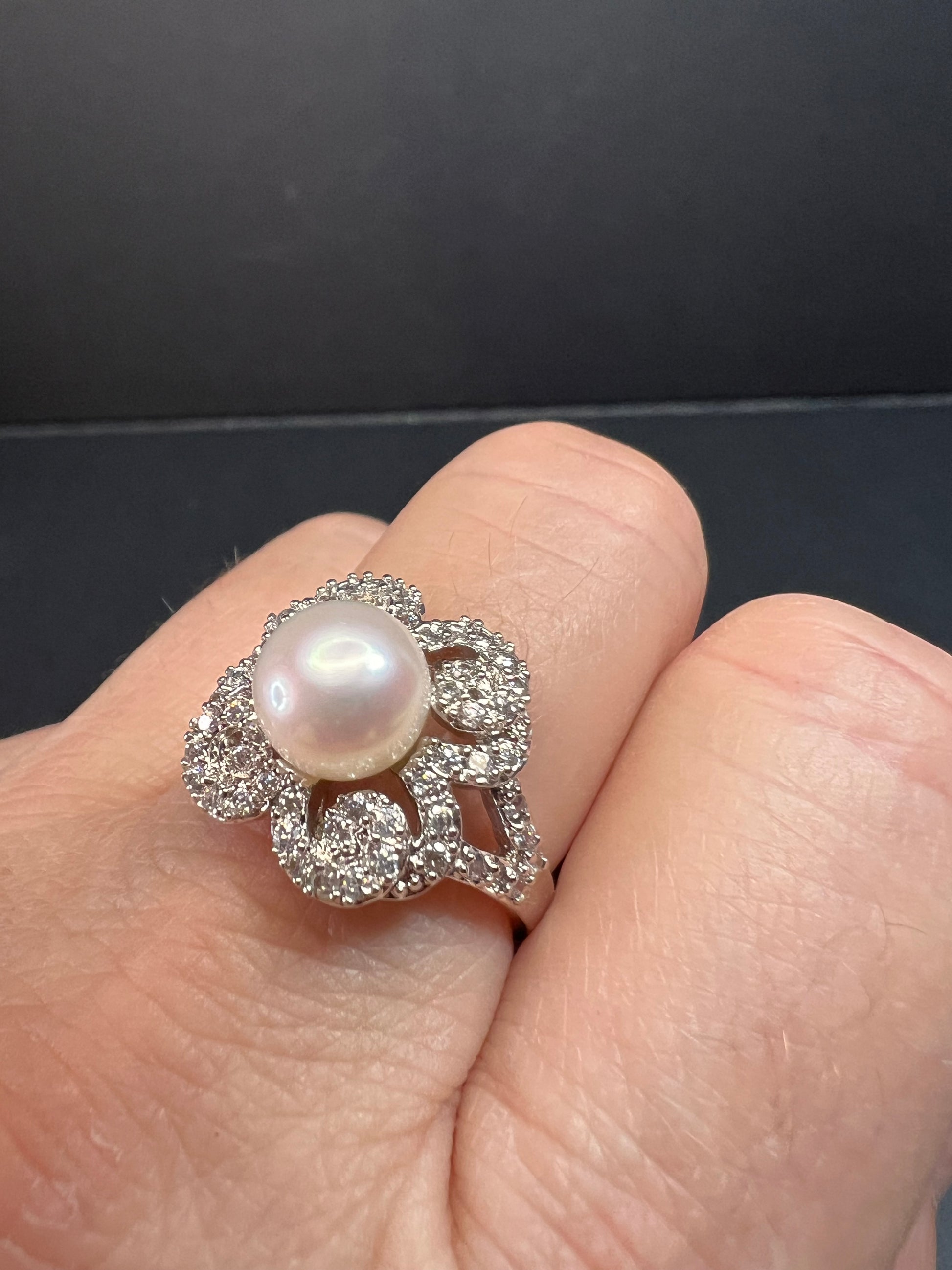 Genuine cultured white freshwater pearl surrounded by tiny white accent cubic zirconia gemstones prong set in metals that I’m not 100% certain on. Definitely not sterling silver , gold or platinum bases. The core base seems to be either copper, brass or bronze based with a plating of either white gold, rhodium, or platinum. I’ve done multiple acid tests as well as testing with a Kee gold tester. Measures a size 9. Markings on the inside of the band are CGT CN. I couldn’t find information on what CGT is for , but CN would mean made in China.