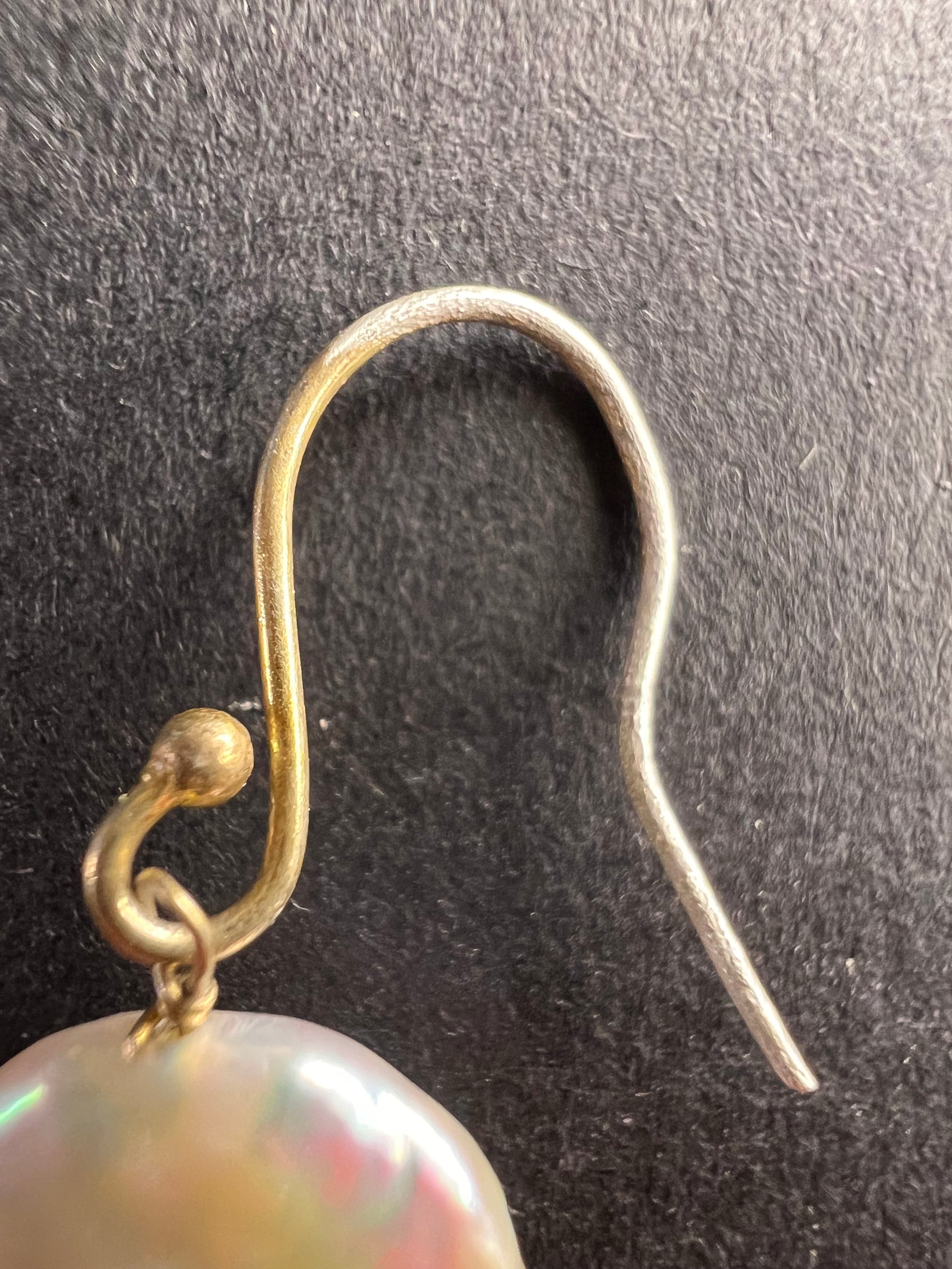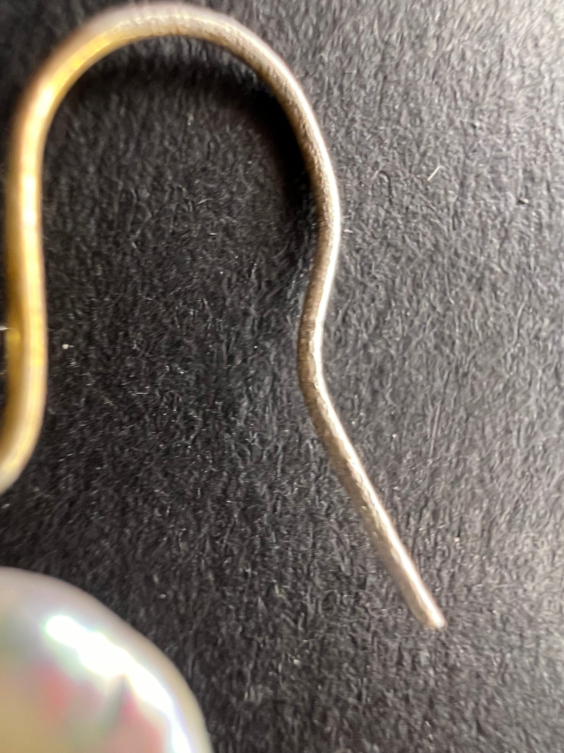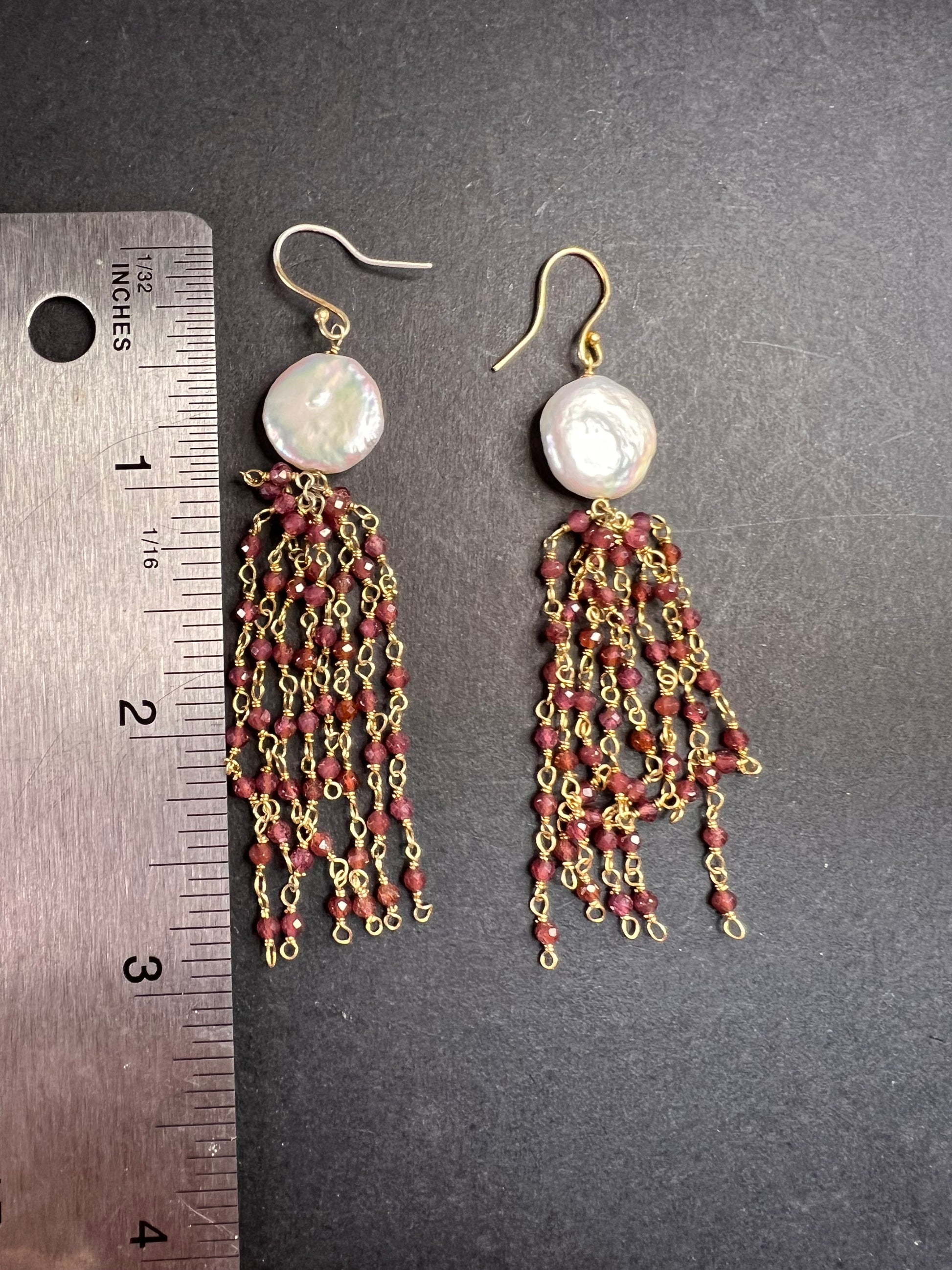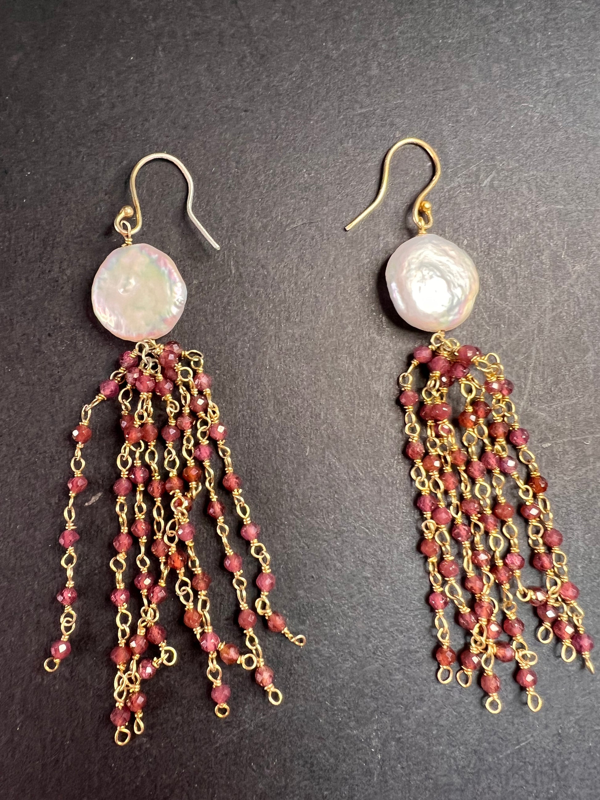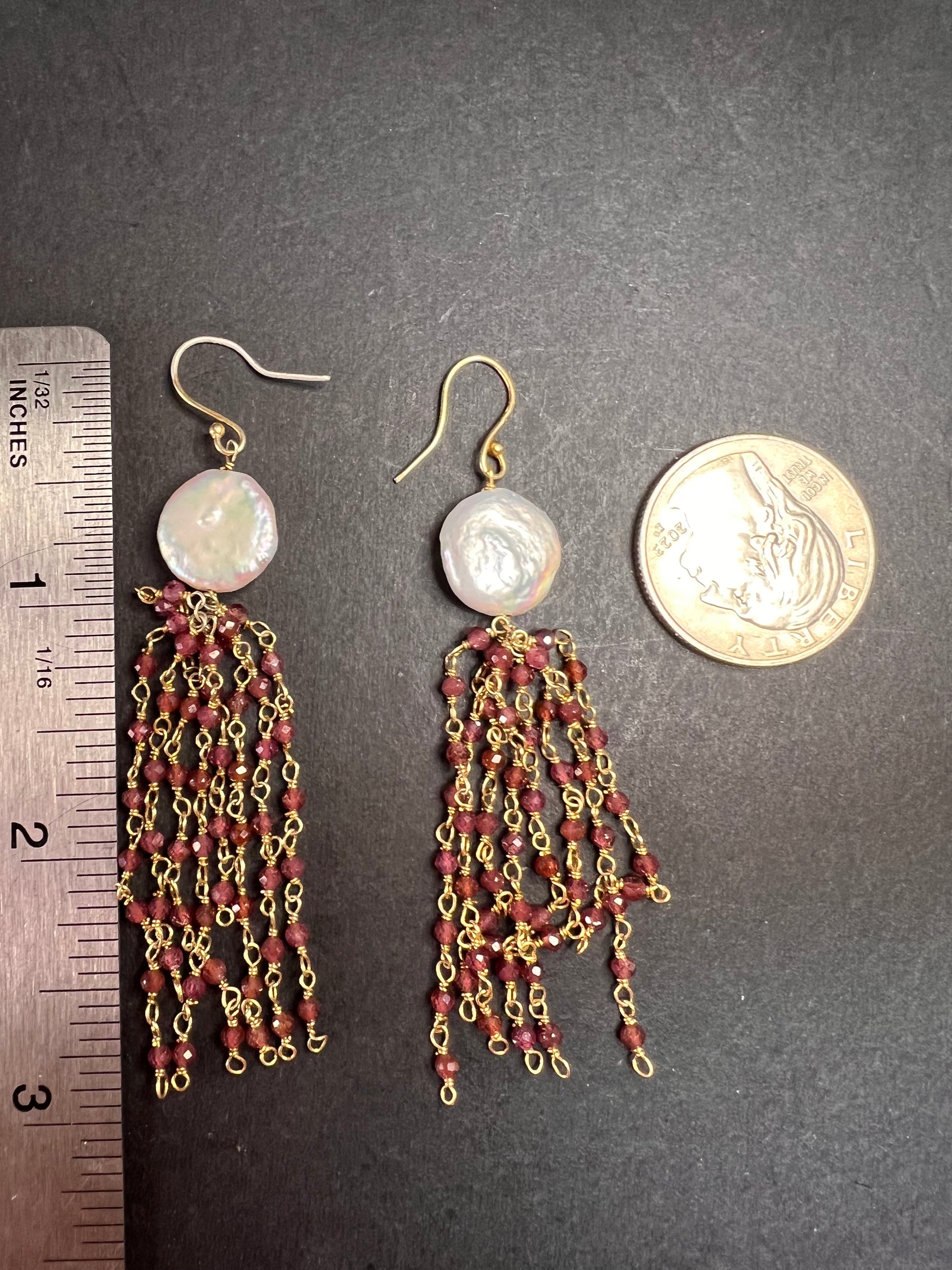 White freshwater cultured coin pearls with 1 mm faceted garnet beads dangling on yellow gold plated over sterling silver wire. I couldn’t make out the stamp on the ear wires so I acid tested. They’re definitely sterling silver as the acid turned bright red immediately but ate the gold plating off where I tested as I mentioned above.